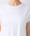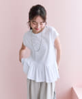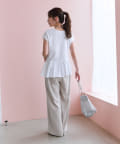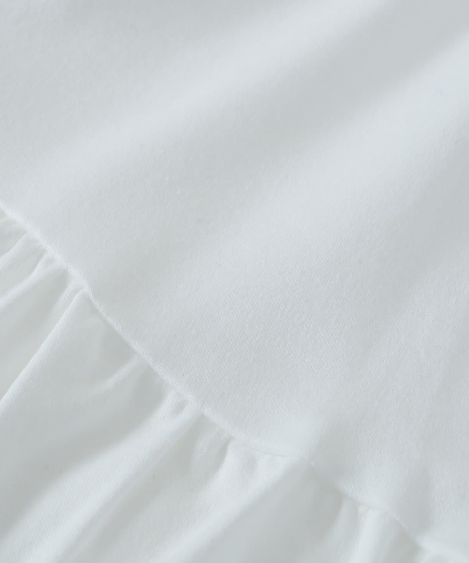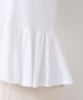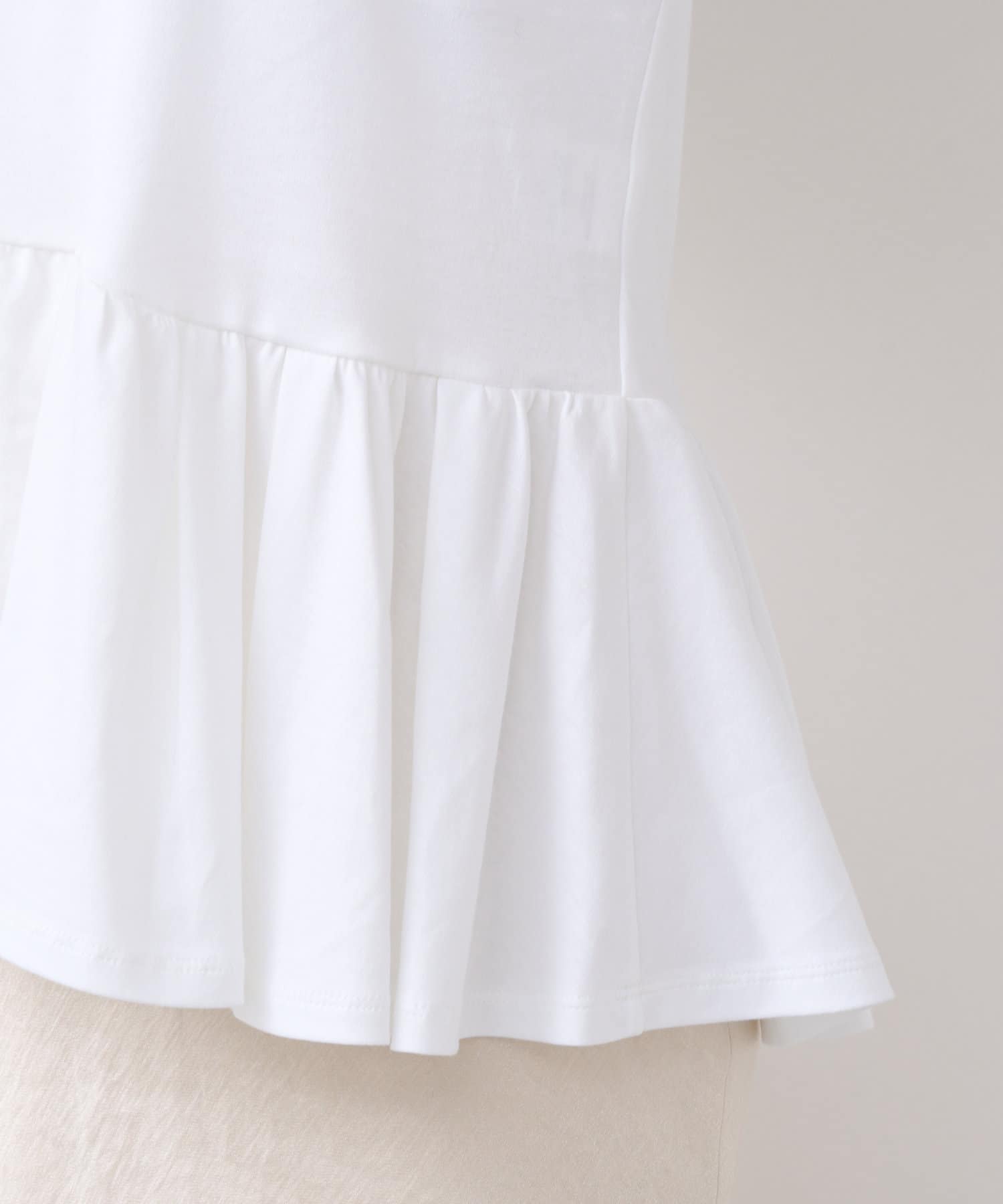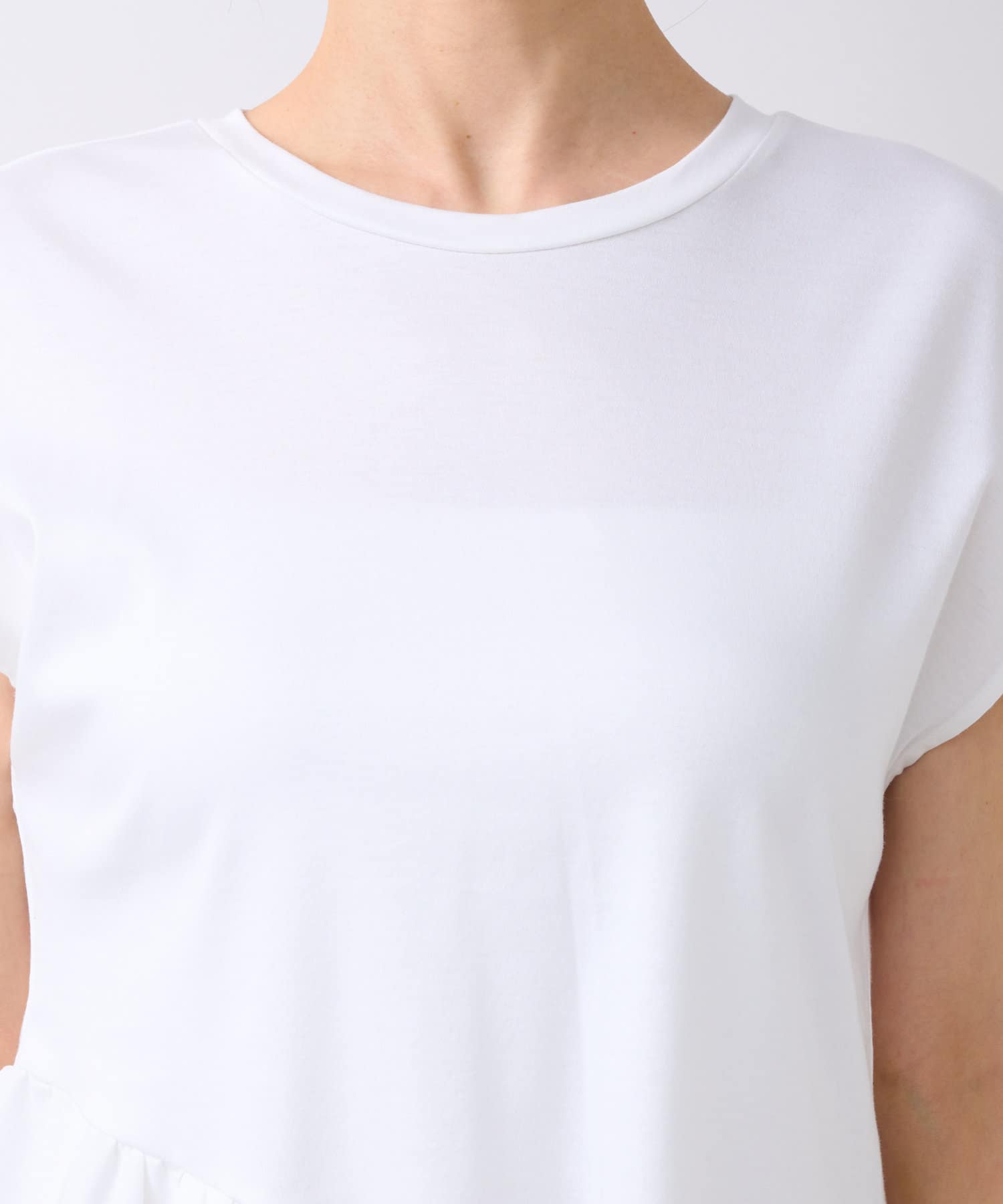シンプルなクルーネックのTシャツに、アシンメトリーなフリルをあしらったデザイン。