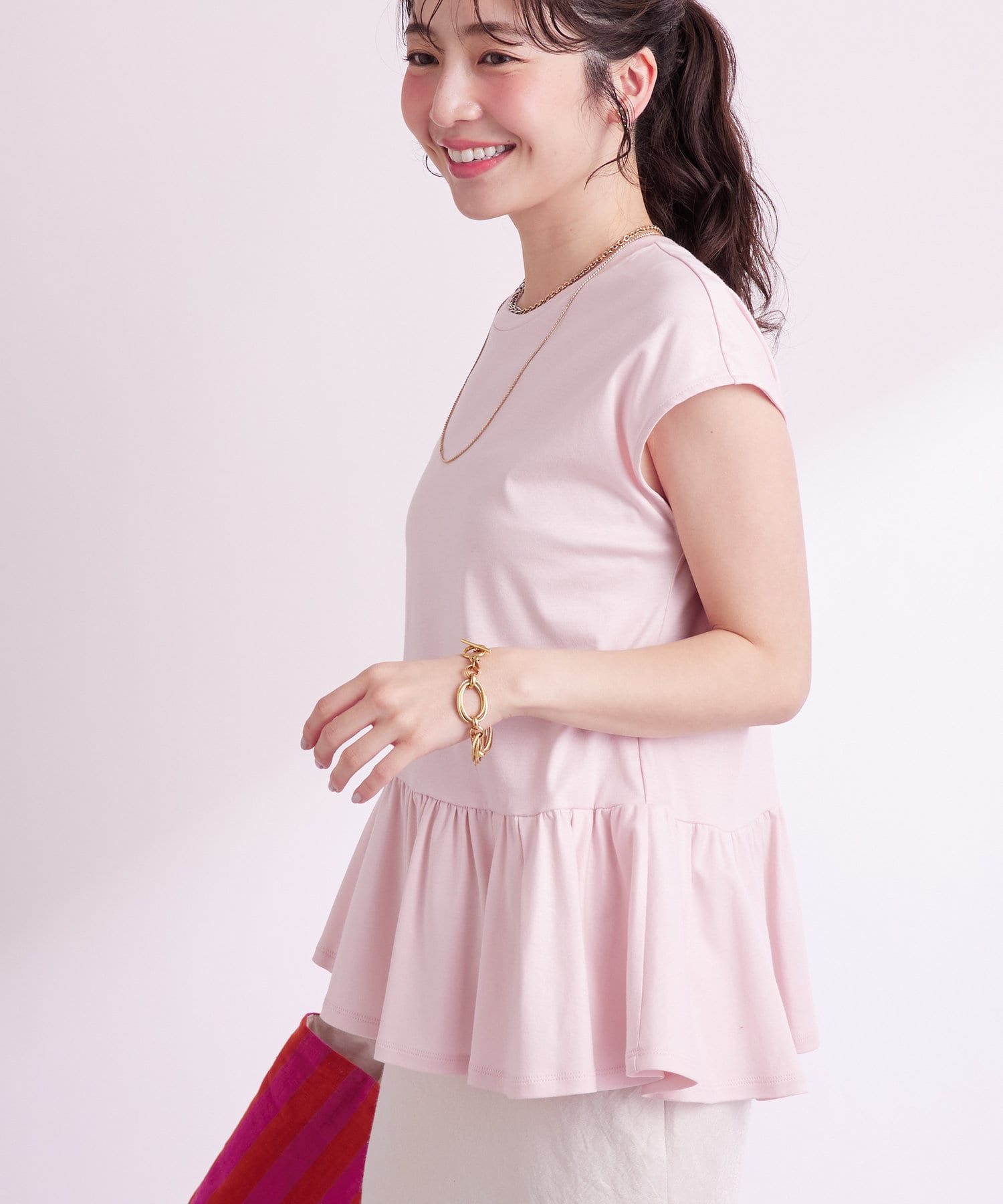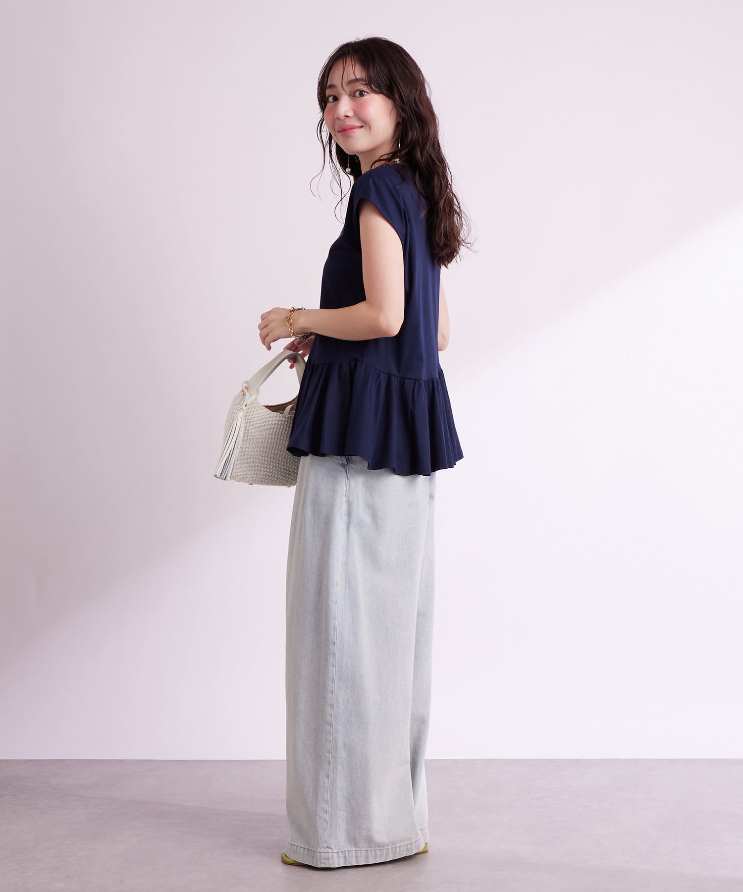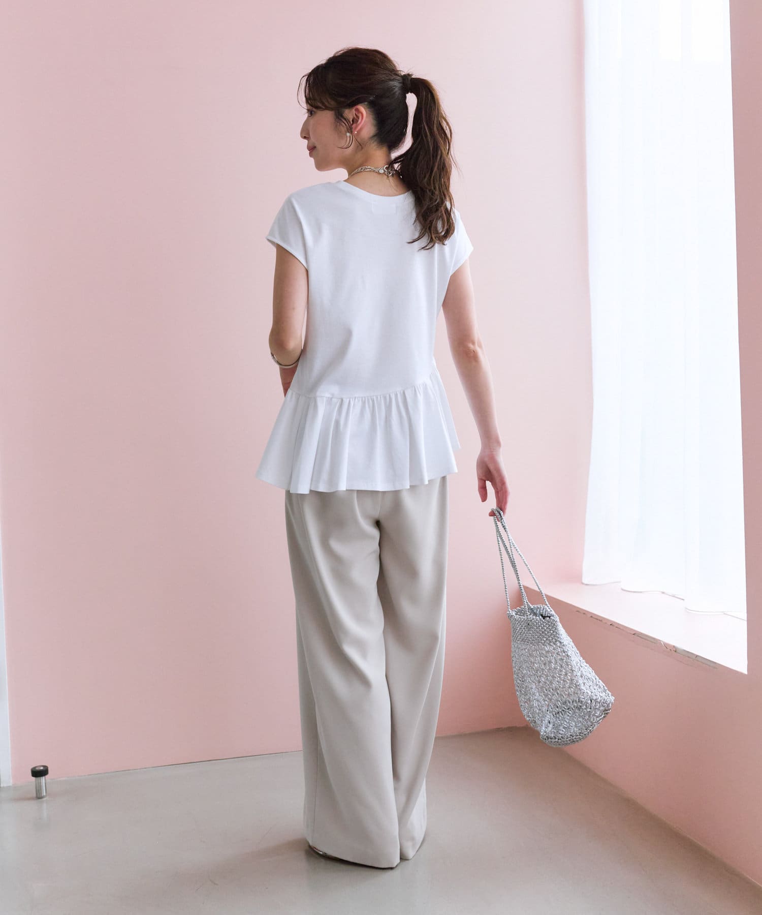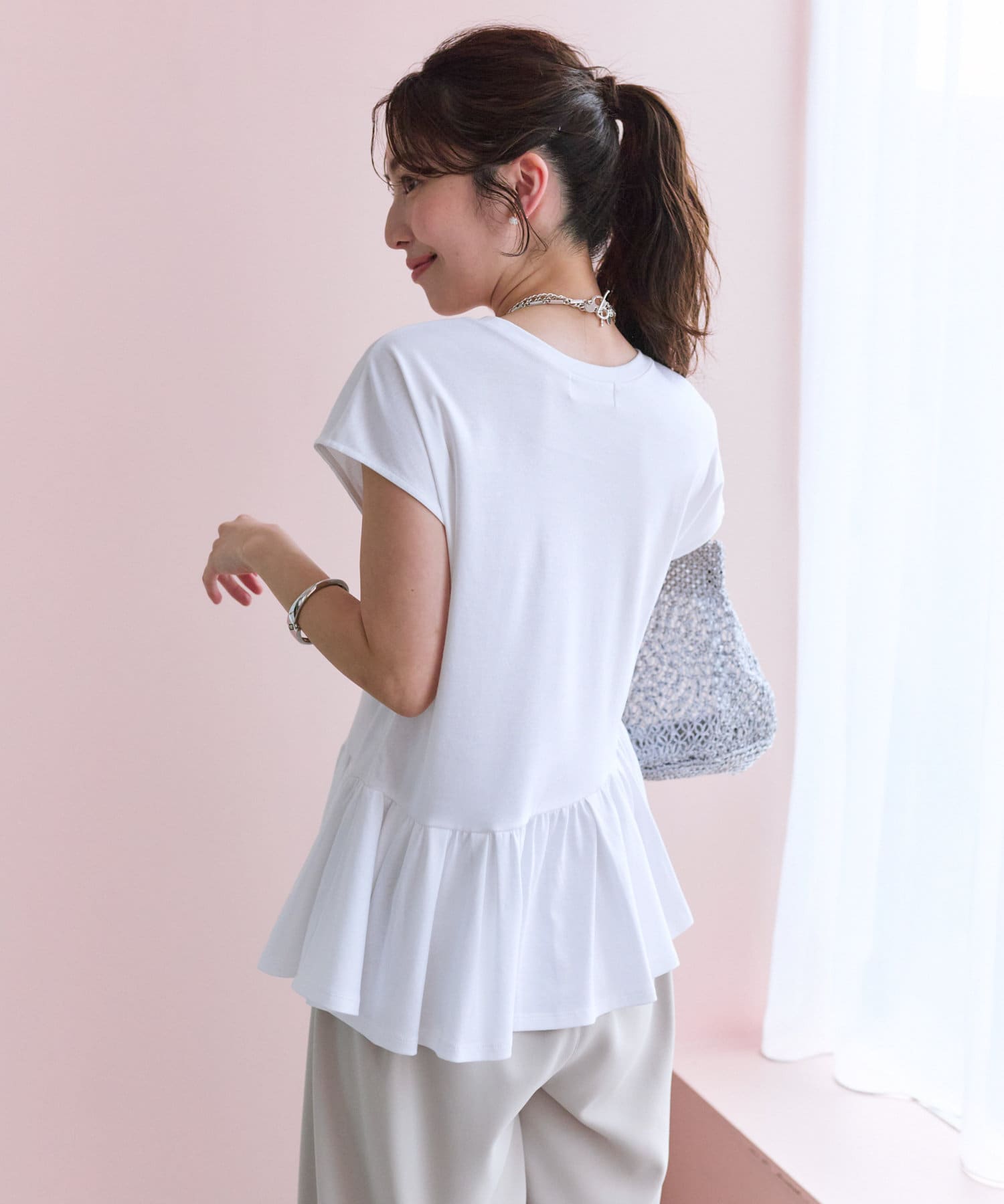 トレンドのペプラムのシルエットも相まってさりげない個性をプラス。