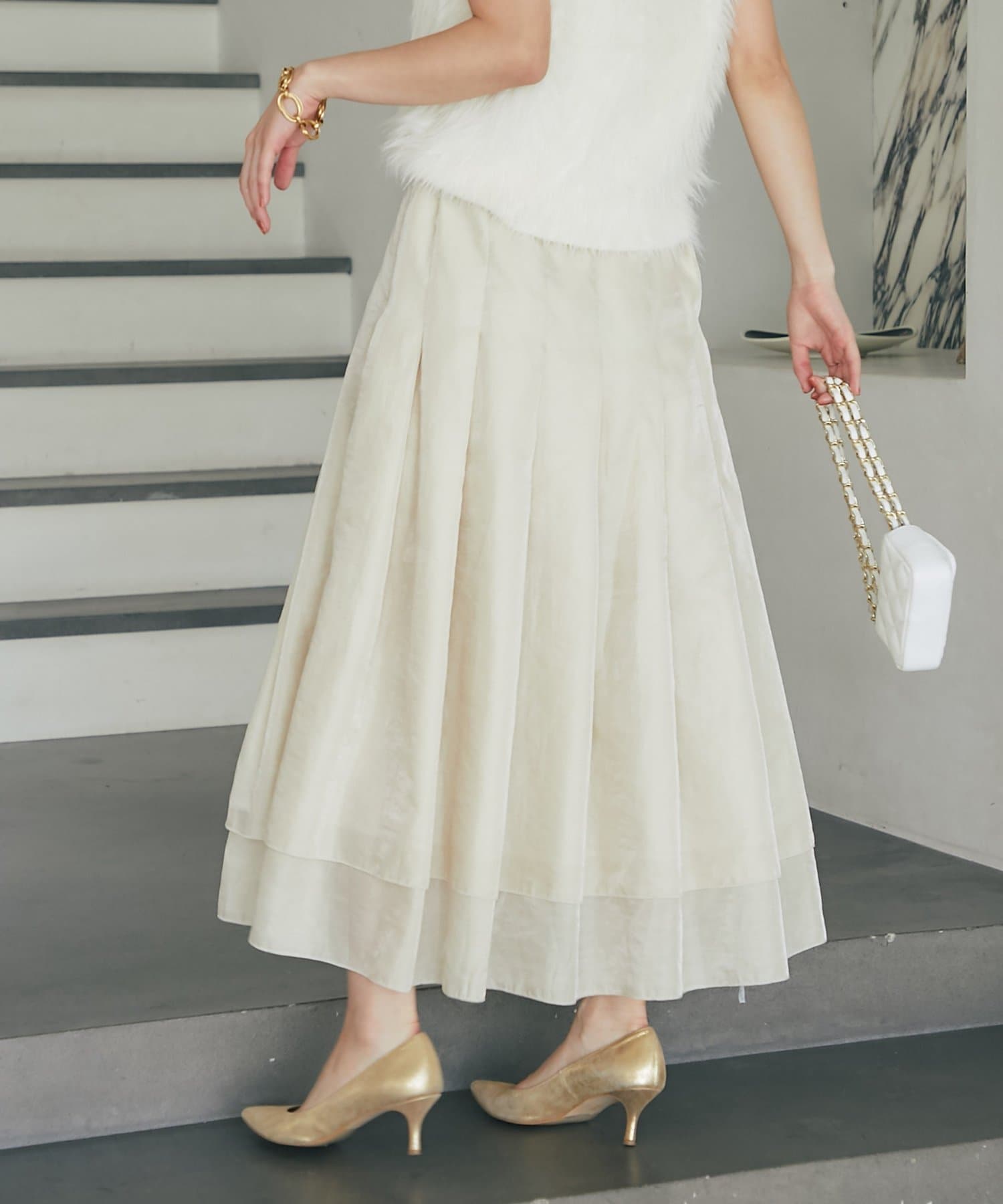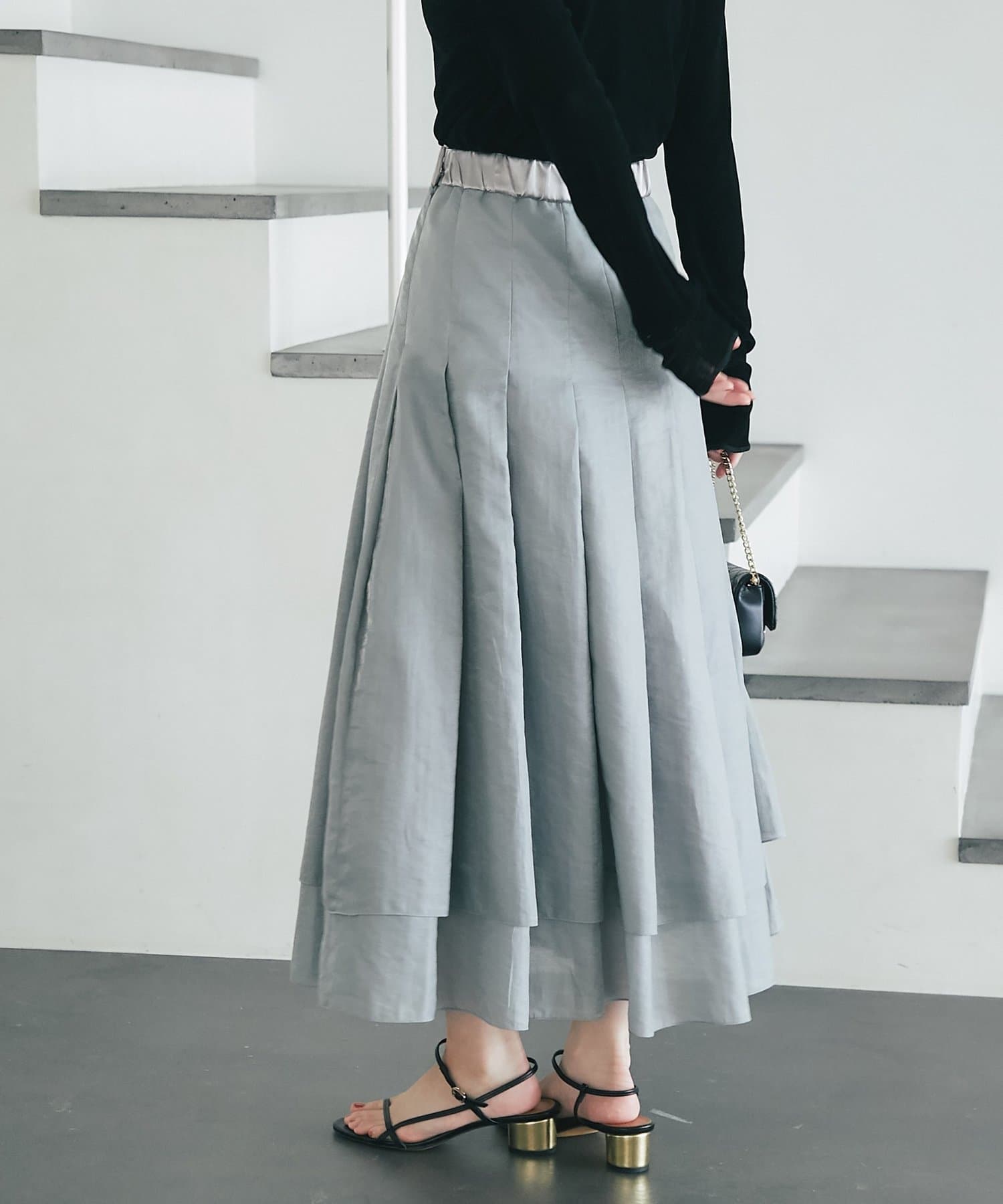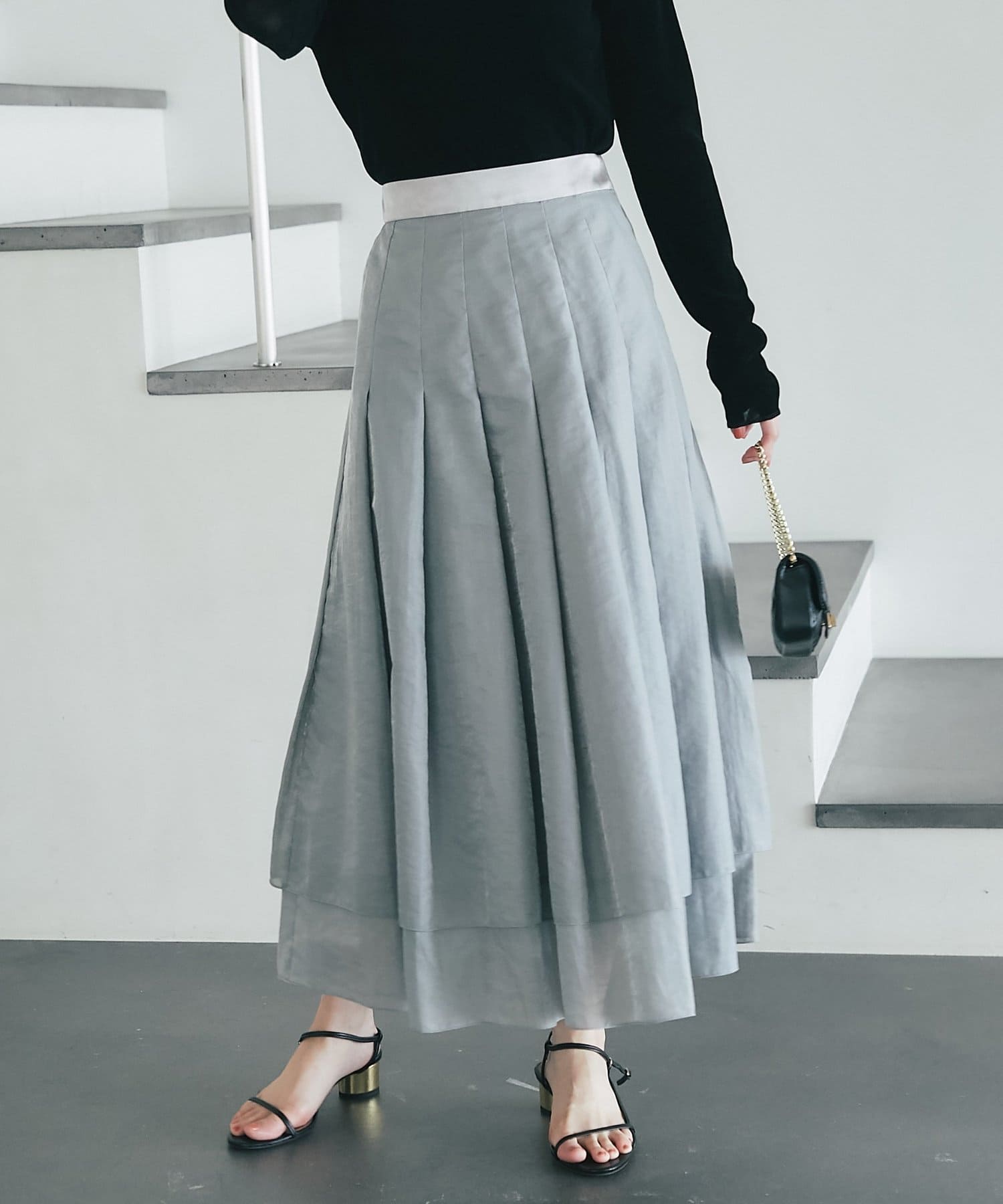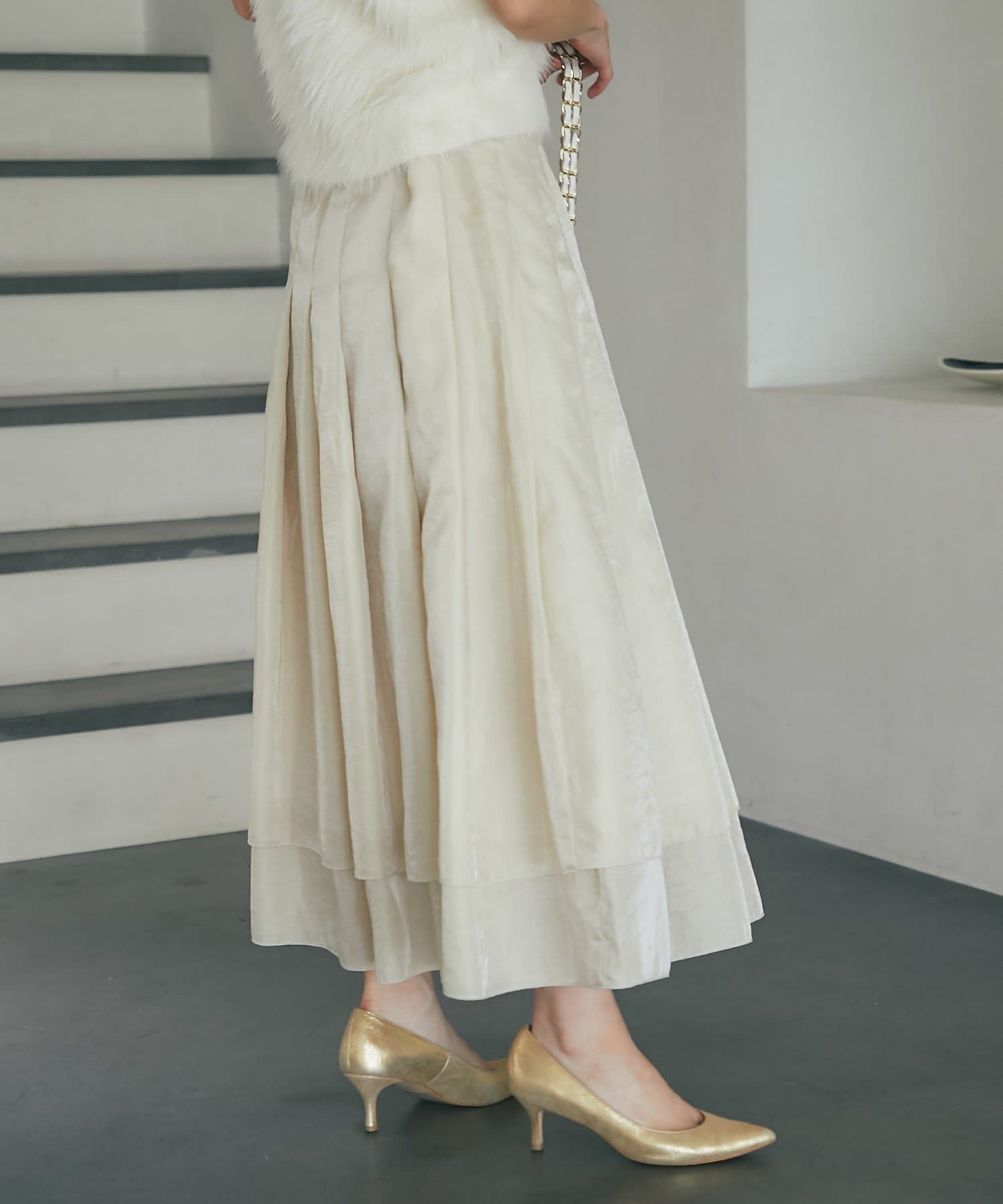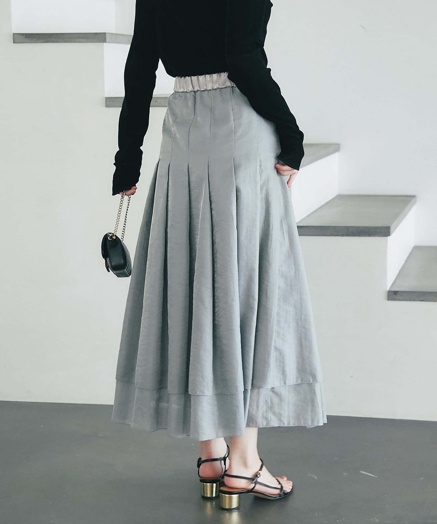 繊細な光沢を放つシアー素材が、フェミニンな印象を際立たせるタックスカート。