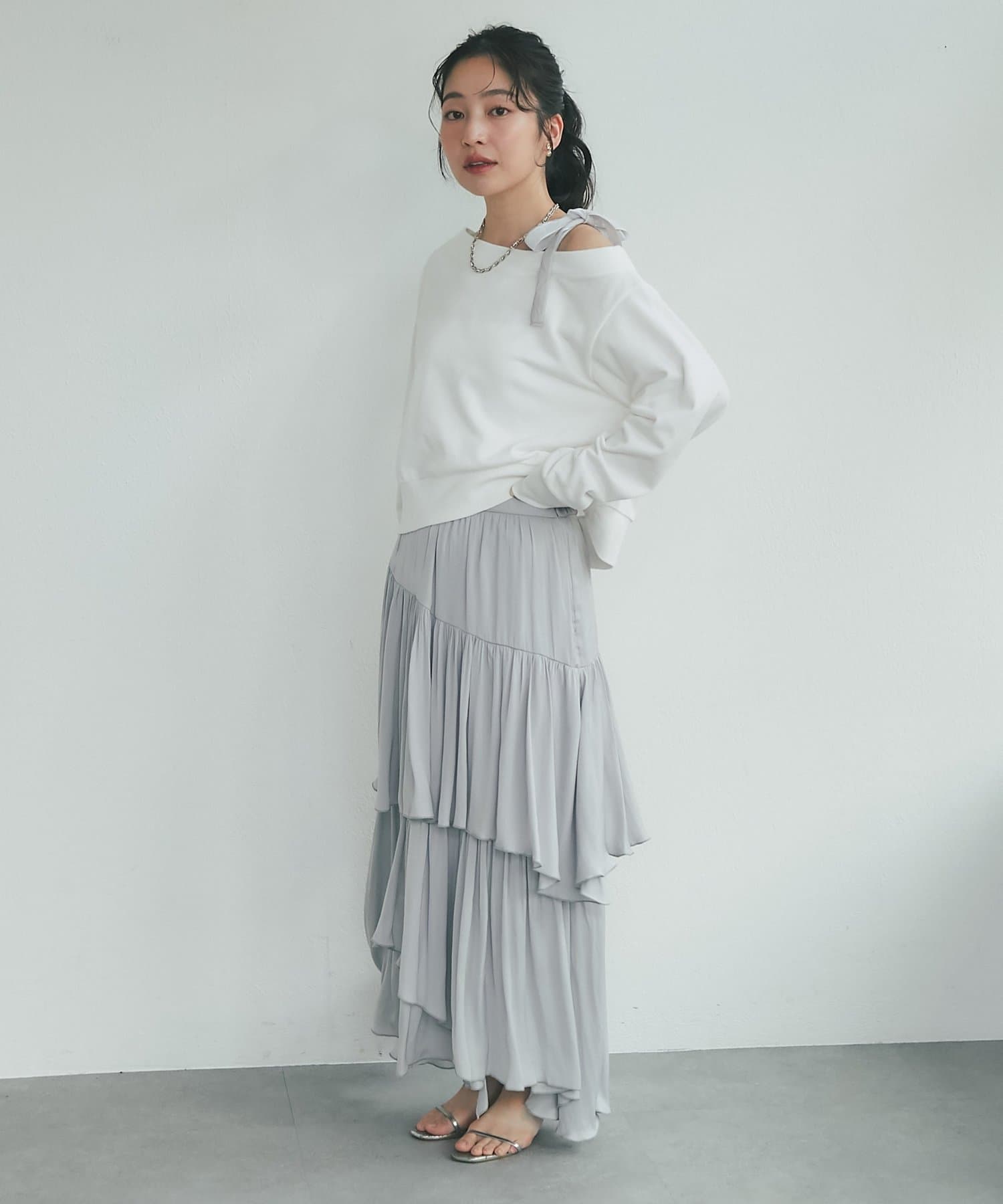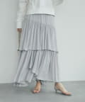 上品な光沢感と華やかなティアードが女性らしさを引き立てるスカート。