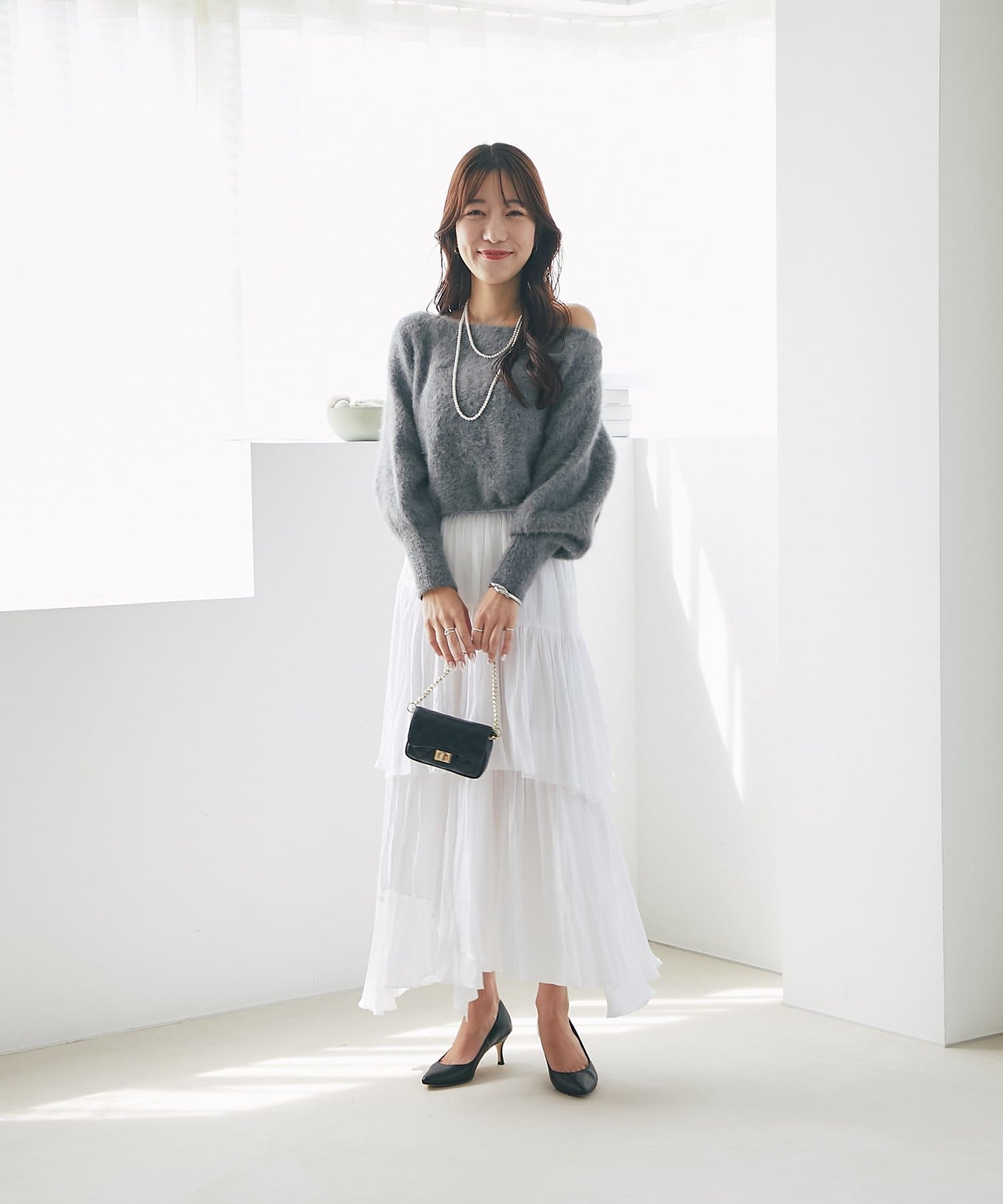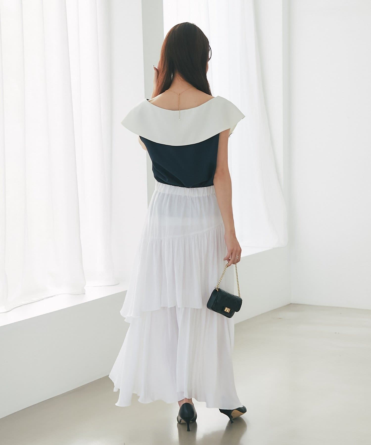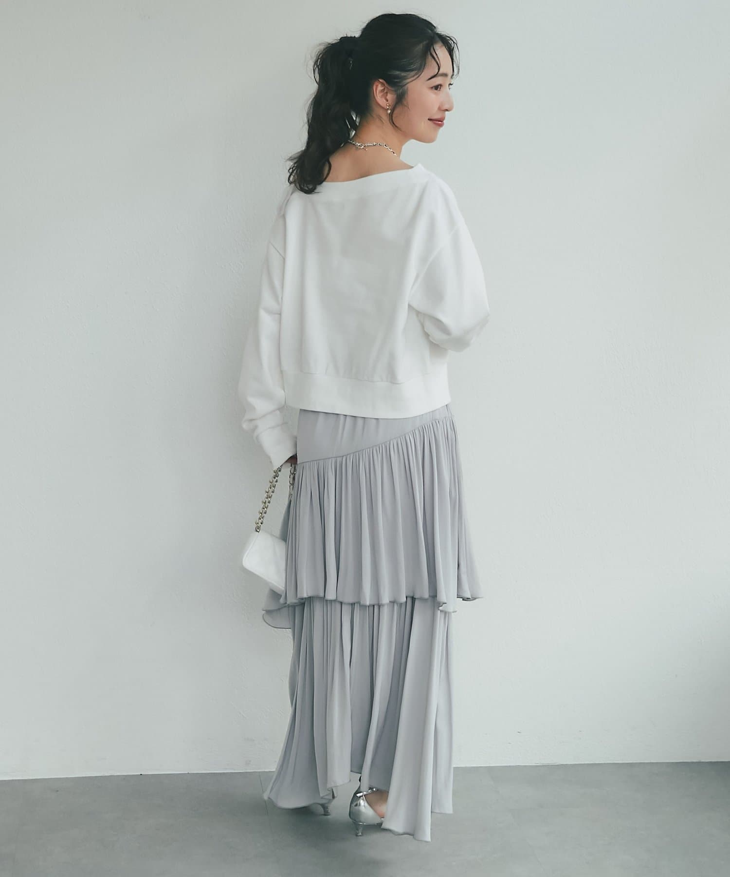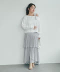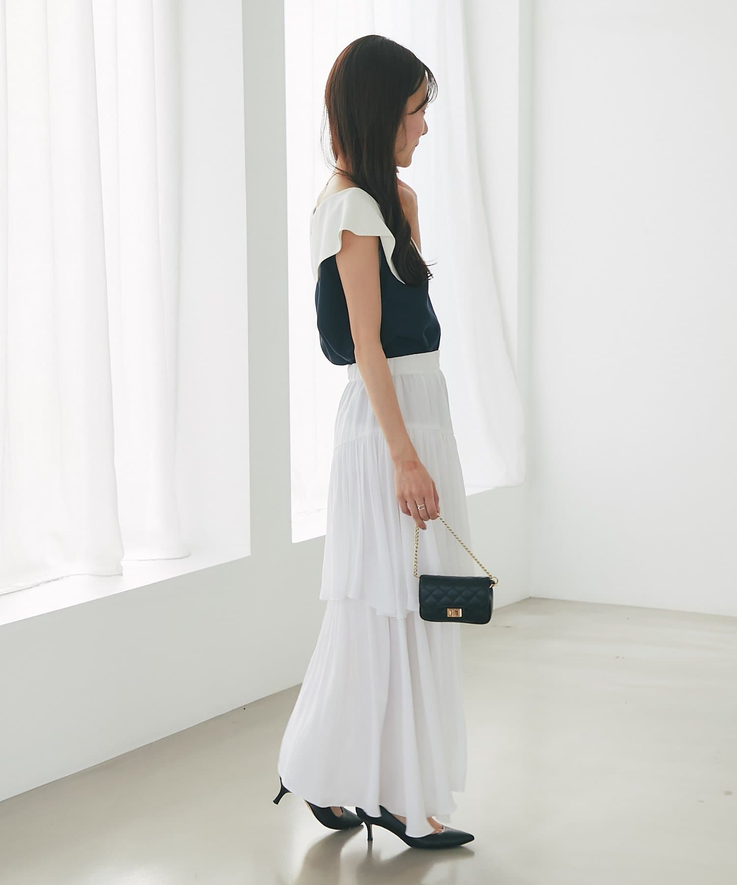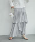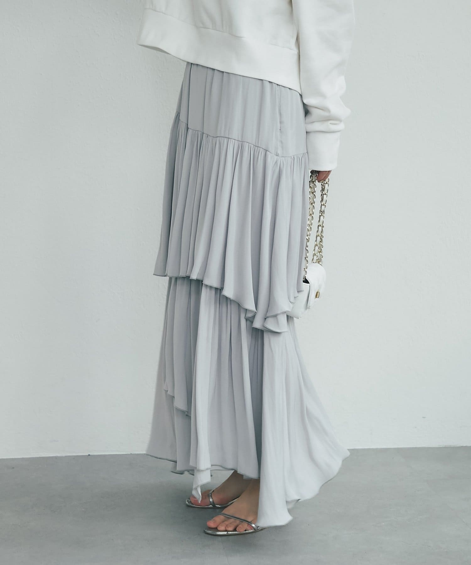 上品な光沢感と華やかなティアードが女性らしさを引き立てるスカート。