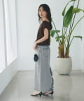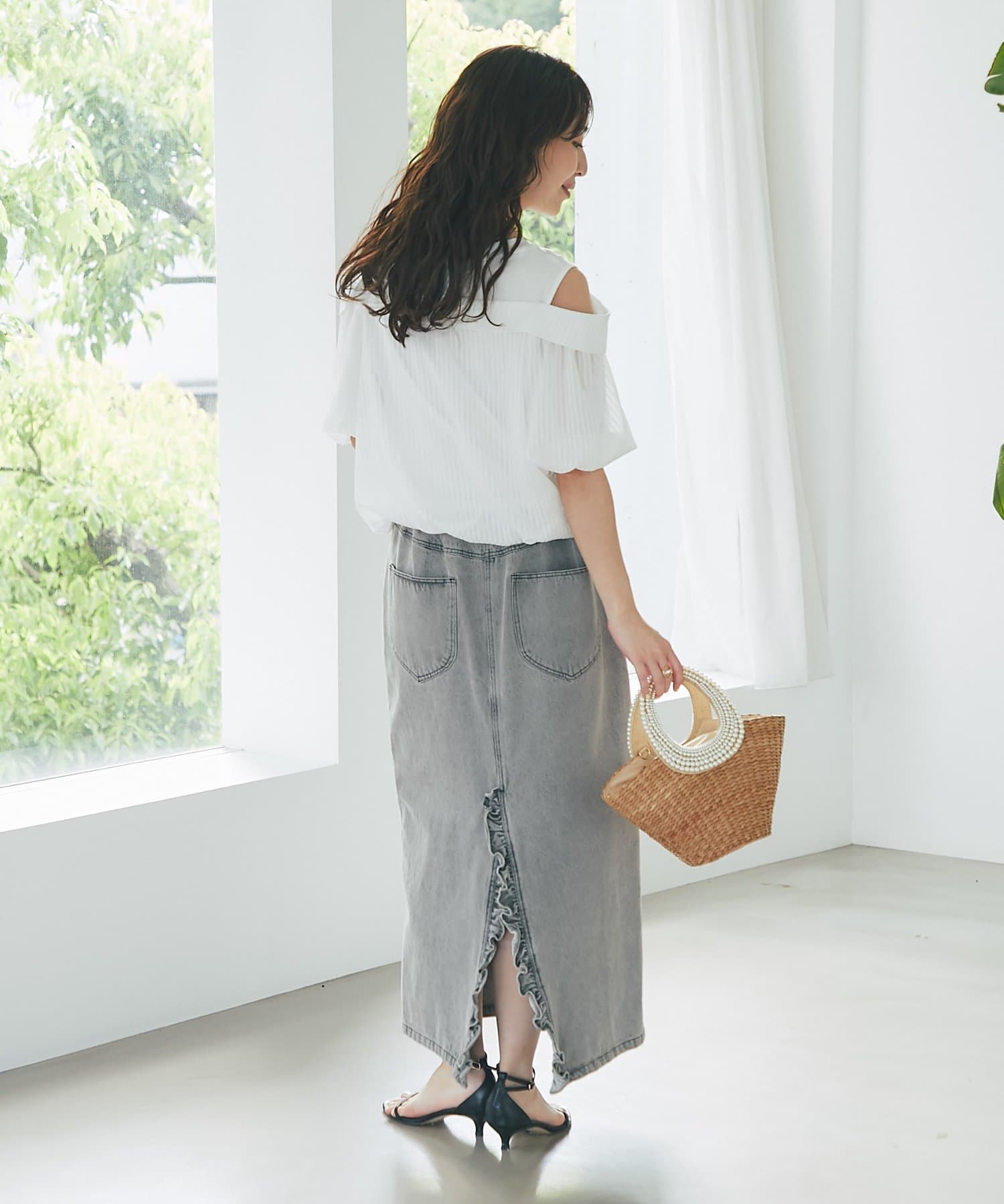 ロングタイトシルエットで、後ろはベンツにフリルをポイントにつけて前後華やかに仕上げました。