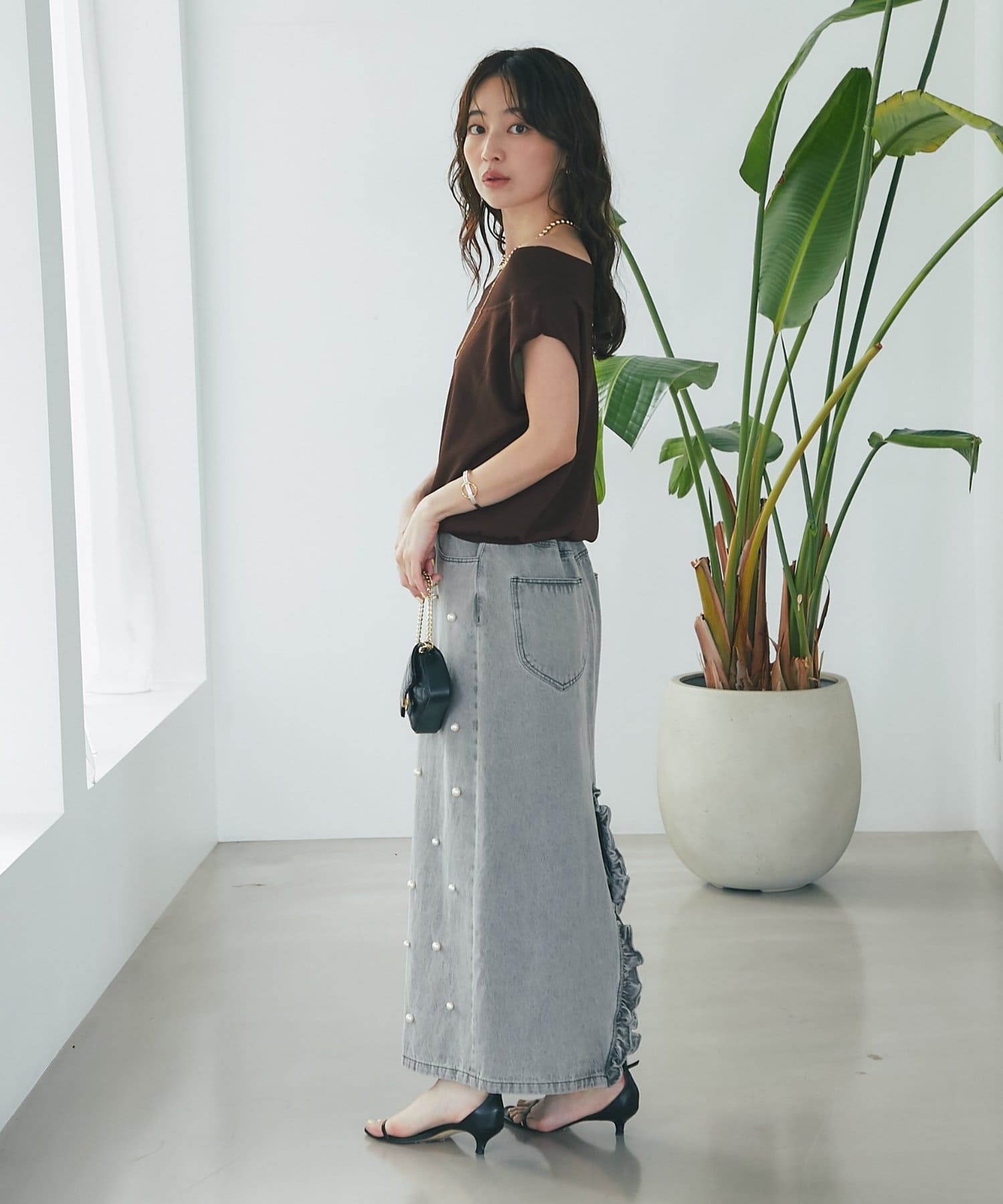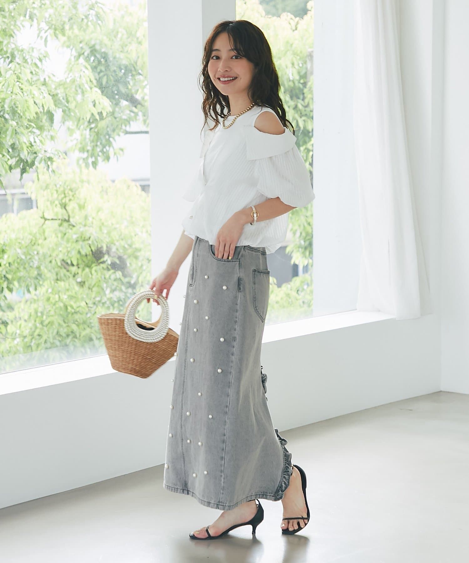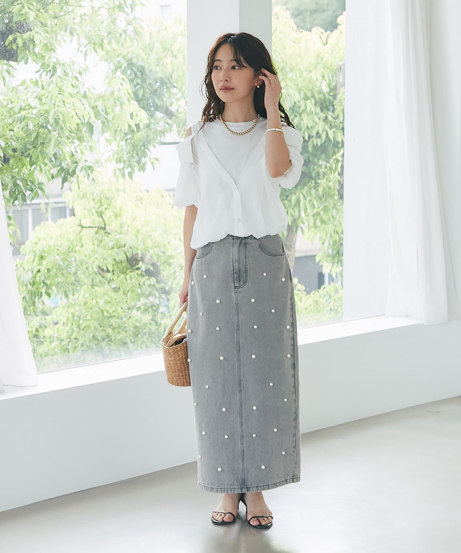 人気アイテム!大人ガーリーなパール付きデニムスカート