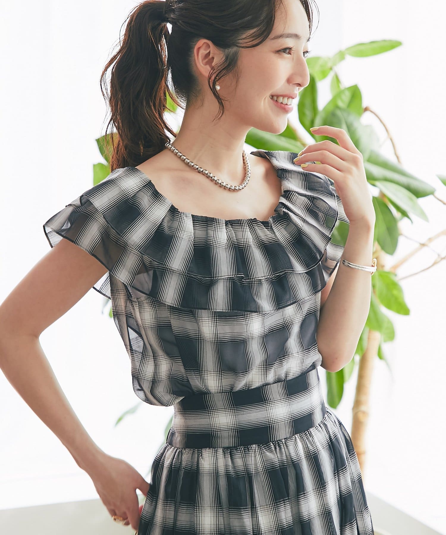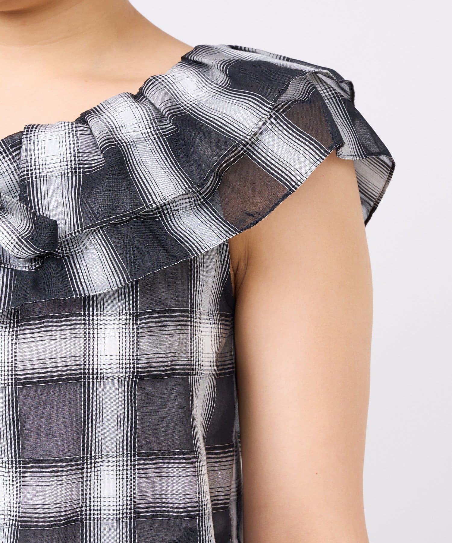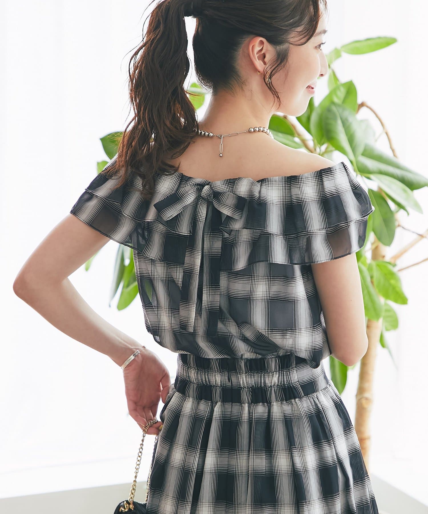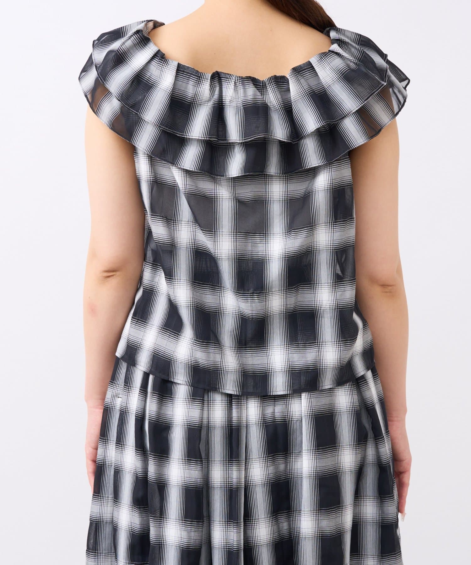 【セットアップ可】シアーオンブレーチェック2WAYフリルオフショルブラウス