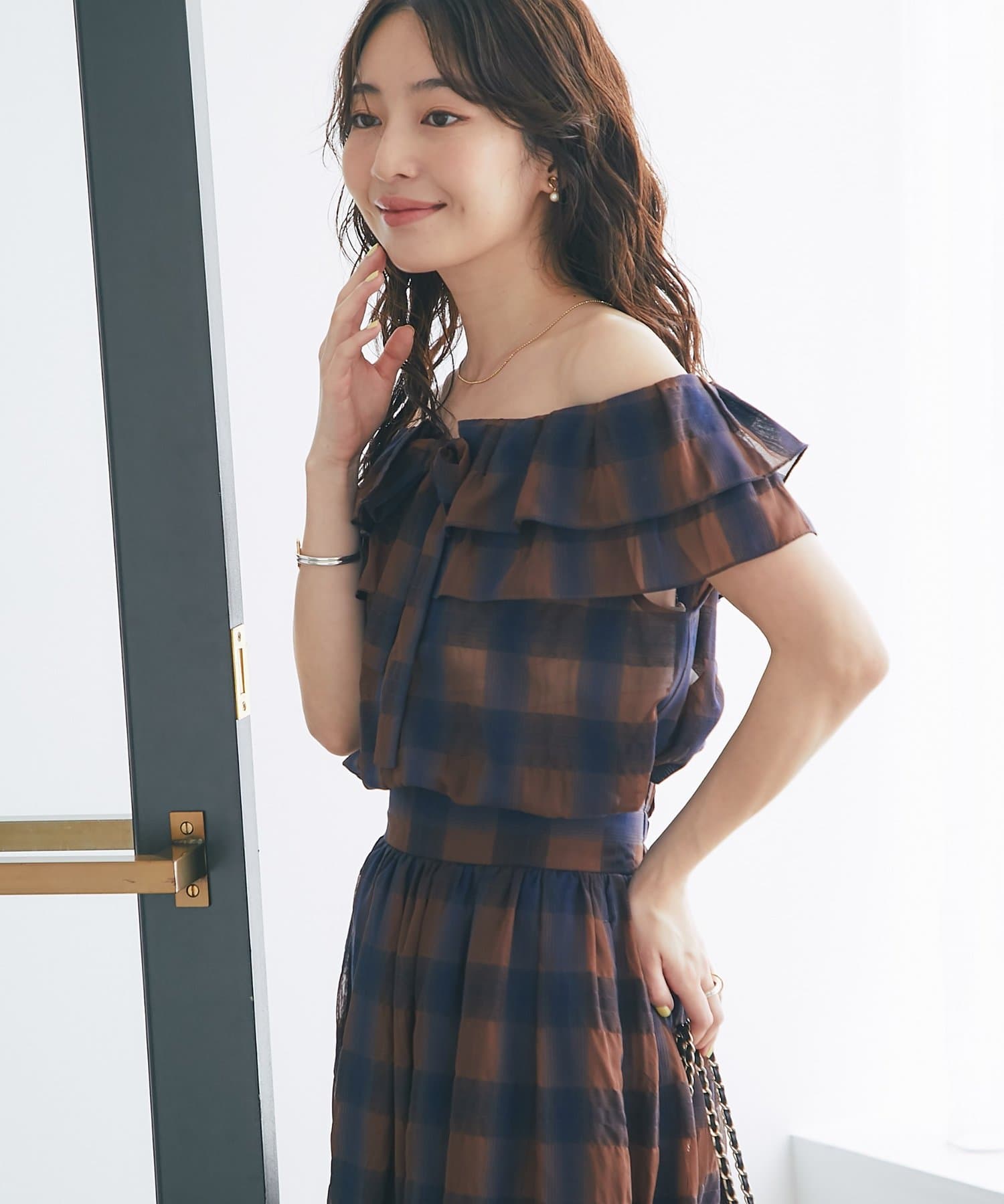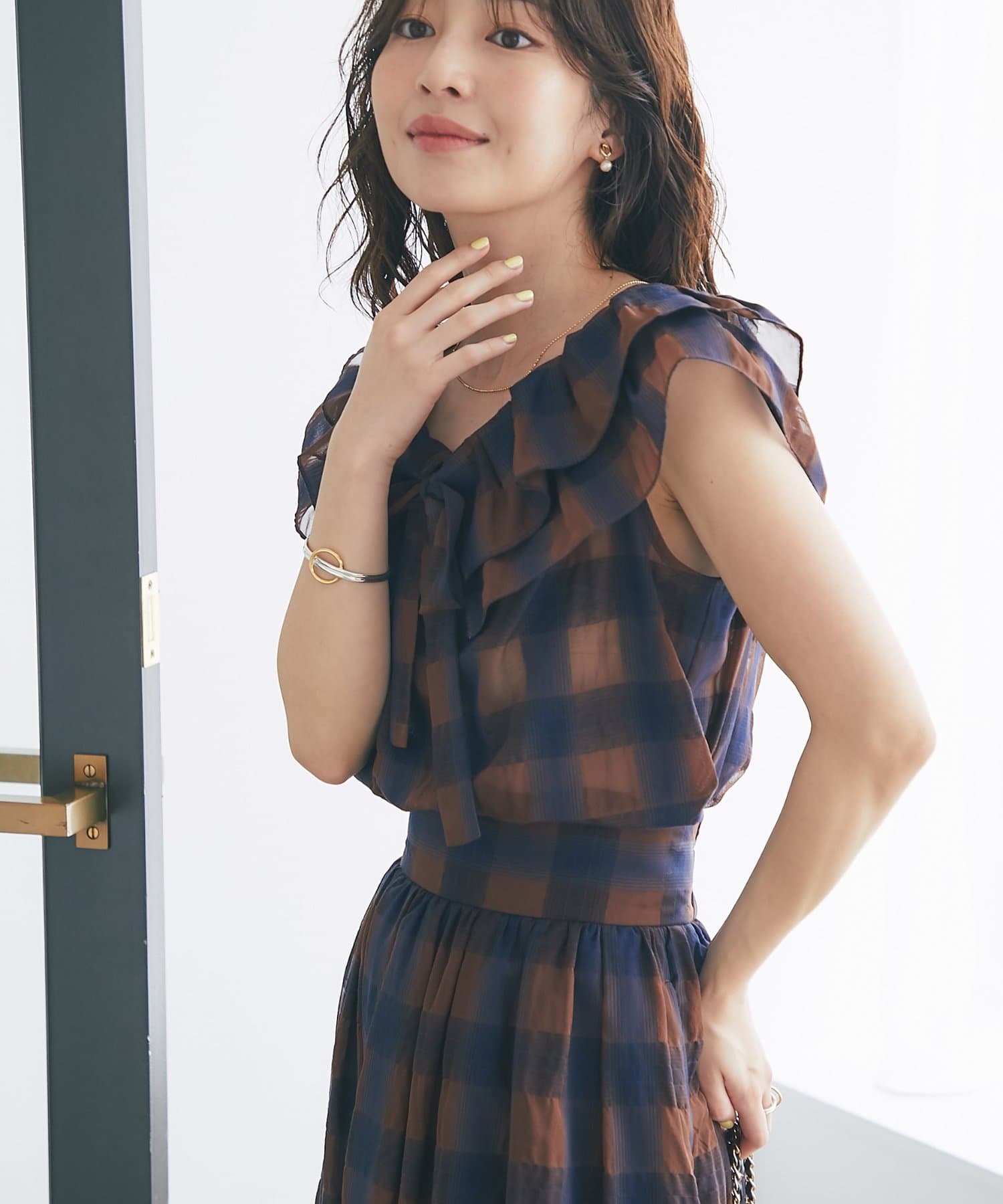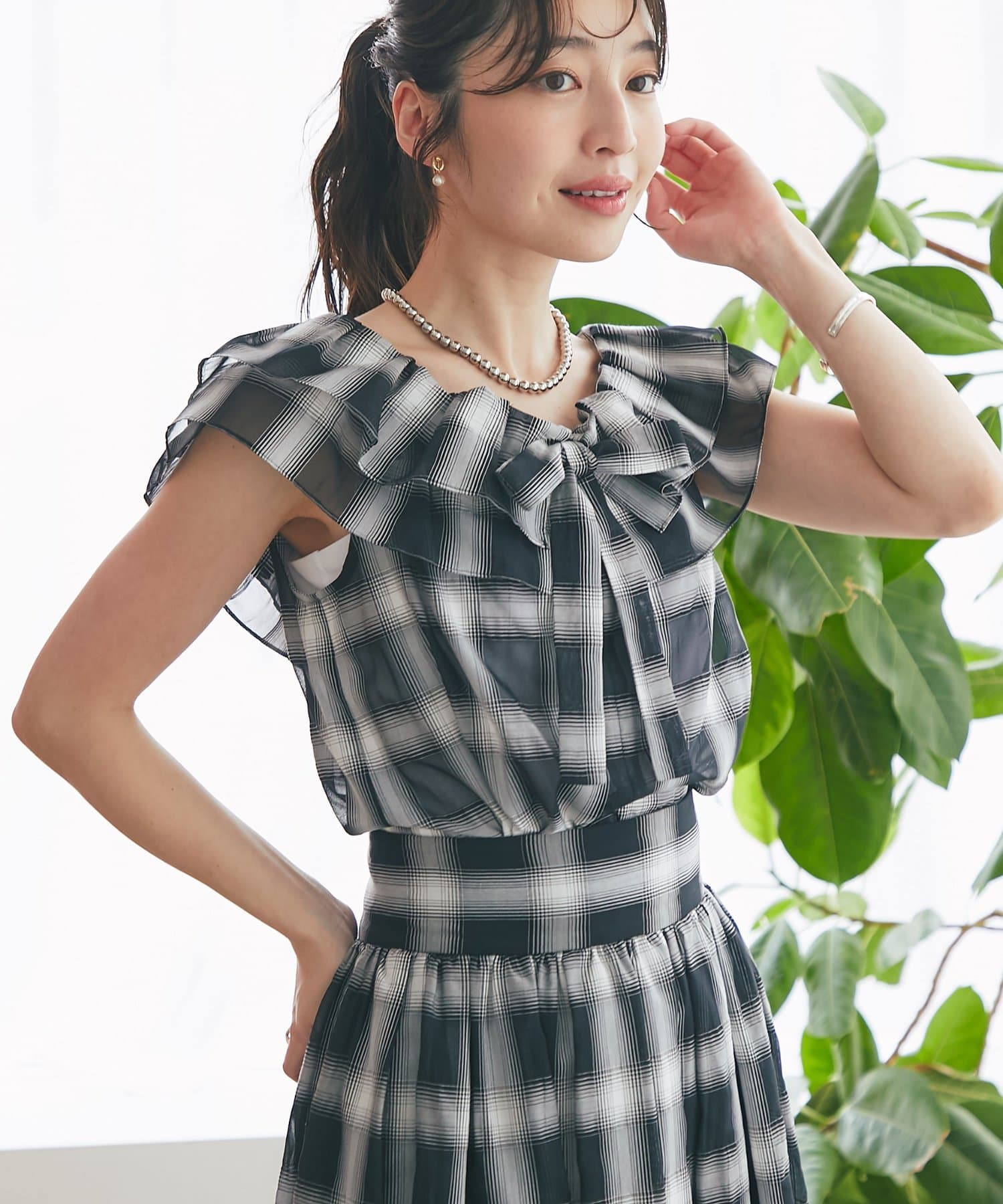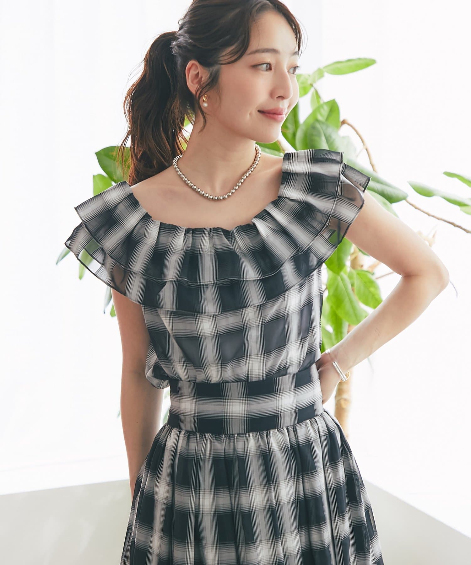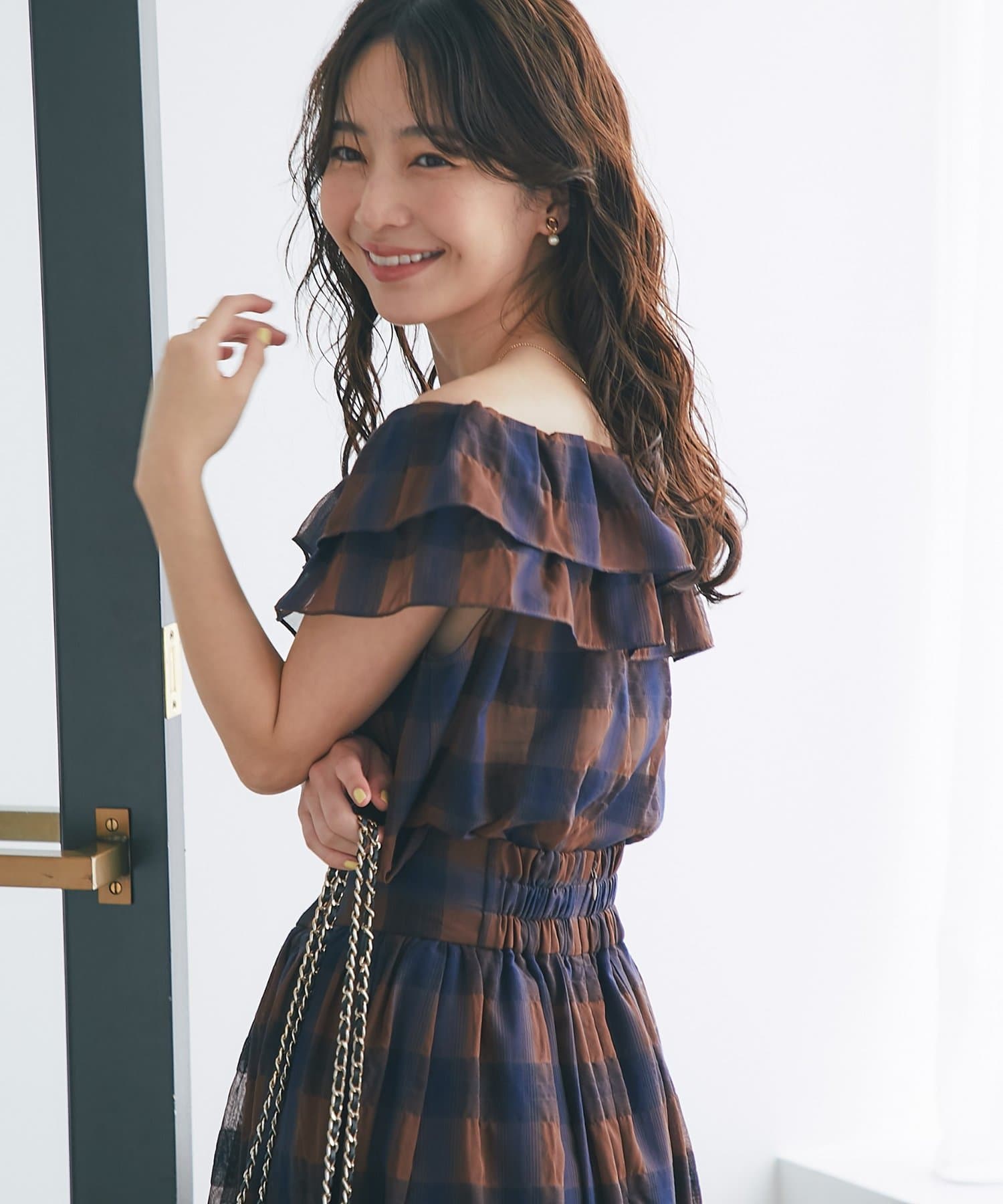 【セットアップ可】シアーオンブレーチェック2WAYフリルオフショルブラウス
