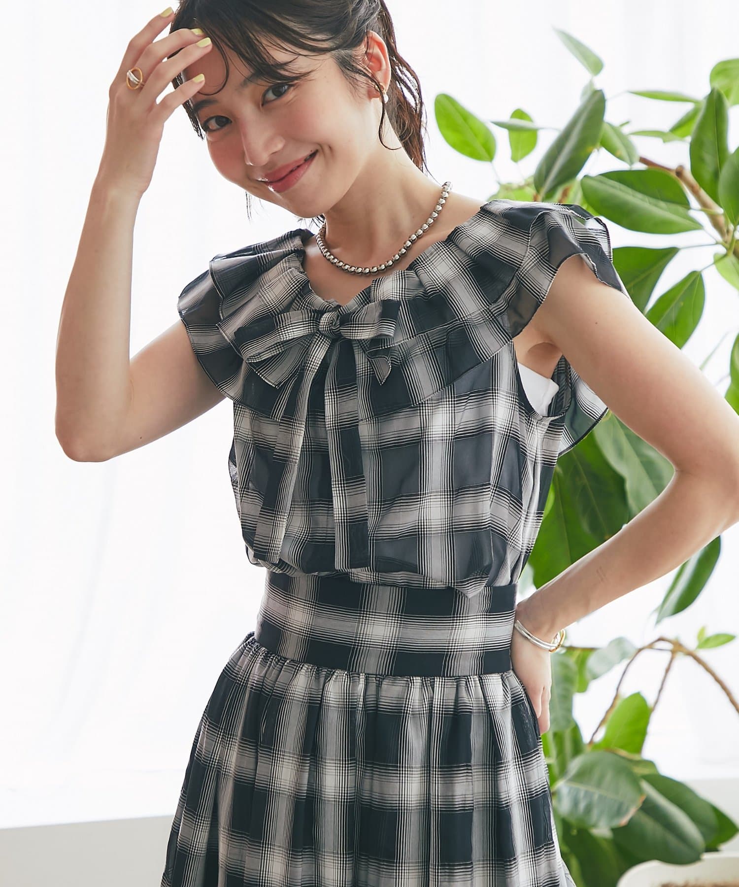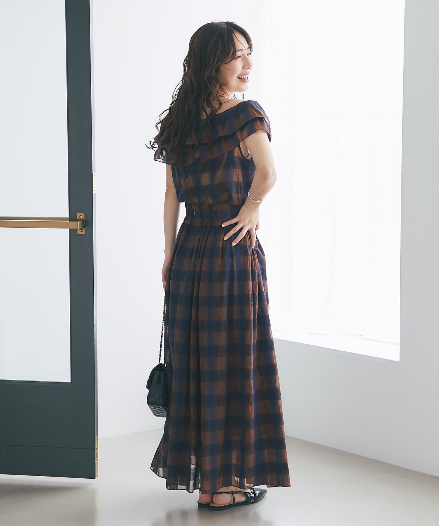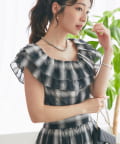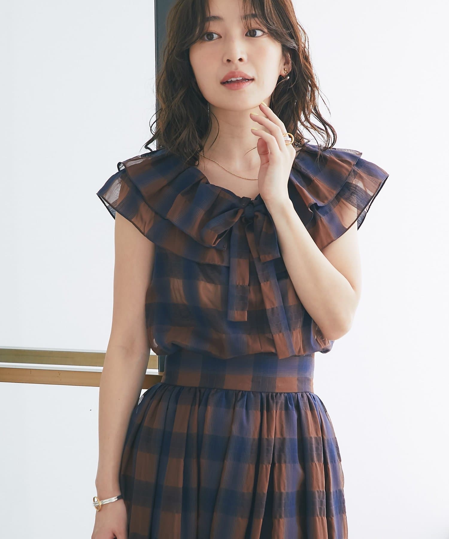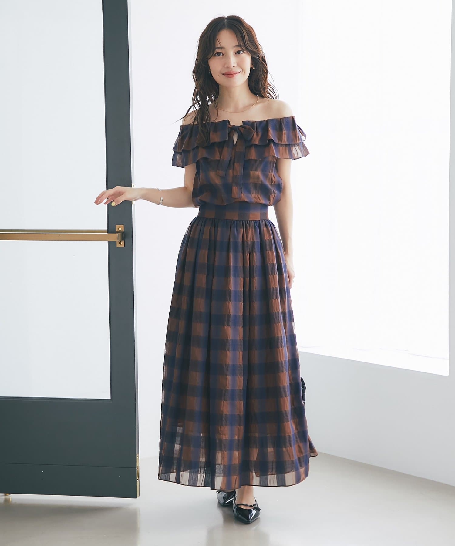 【セットアップ可】シアーオンブレーチェック2WAYフリルオフショルブラウス