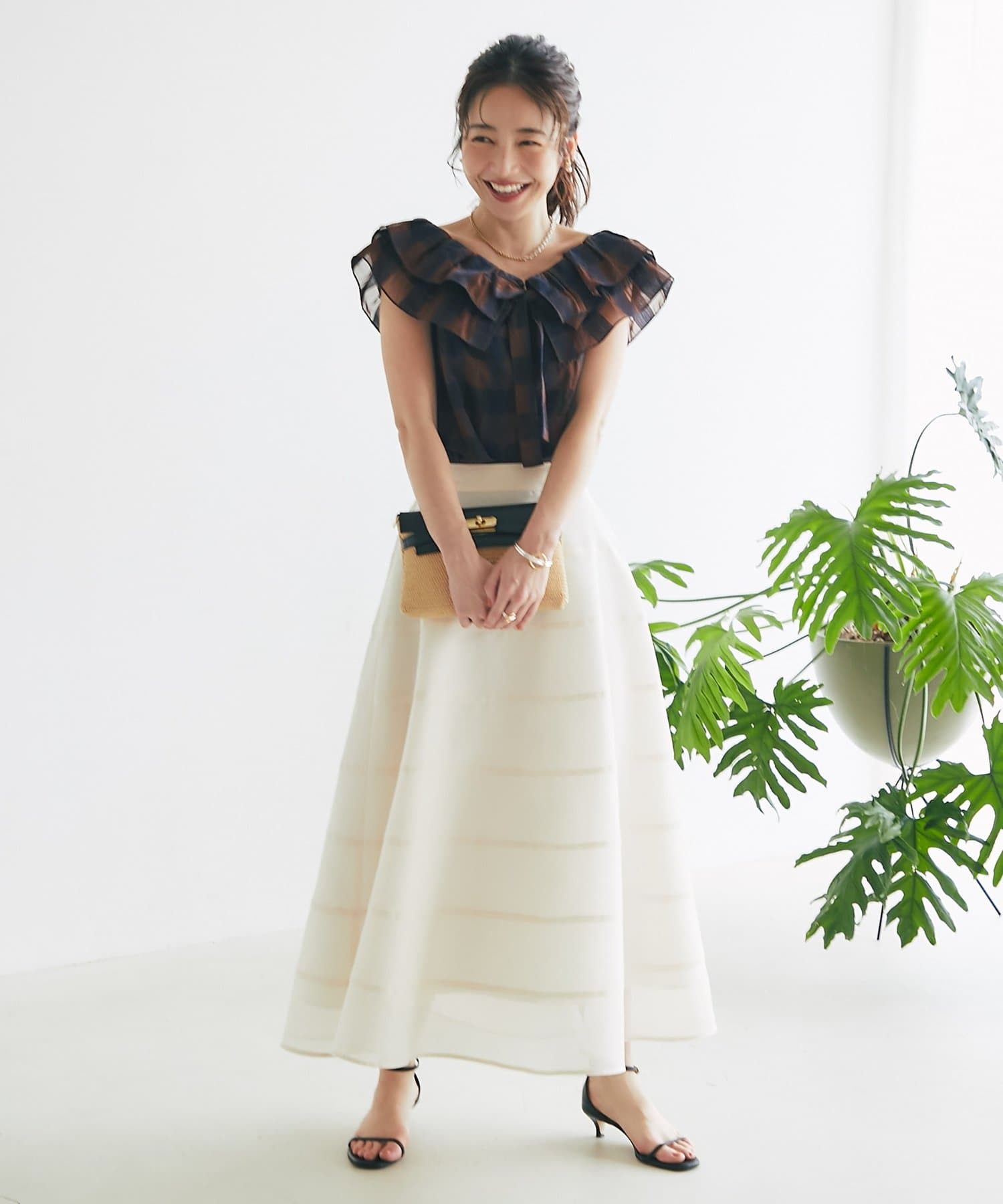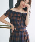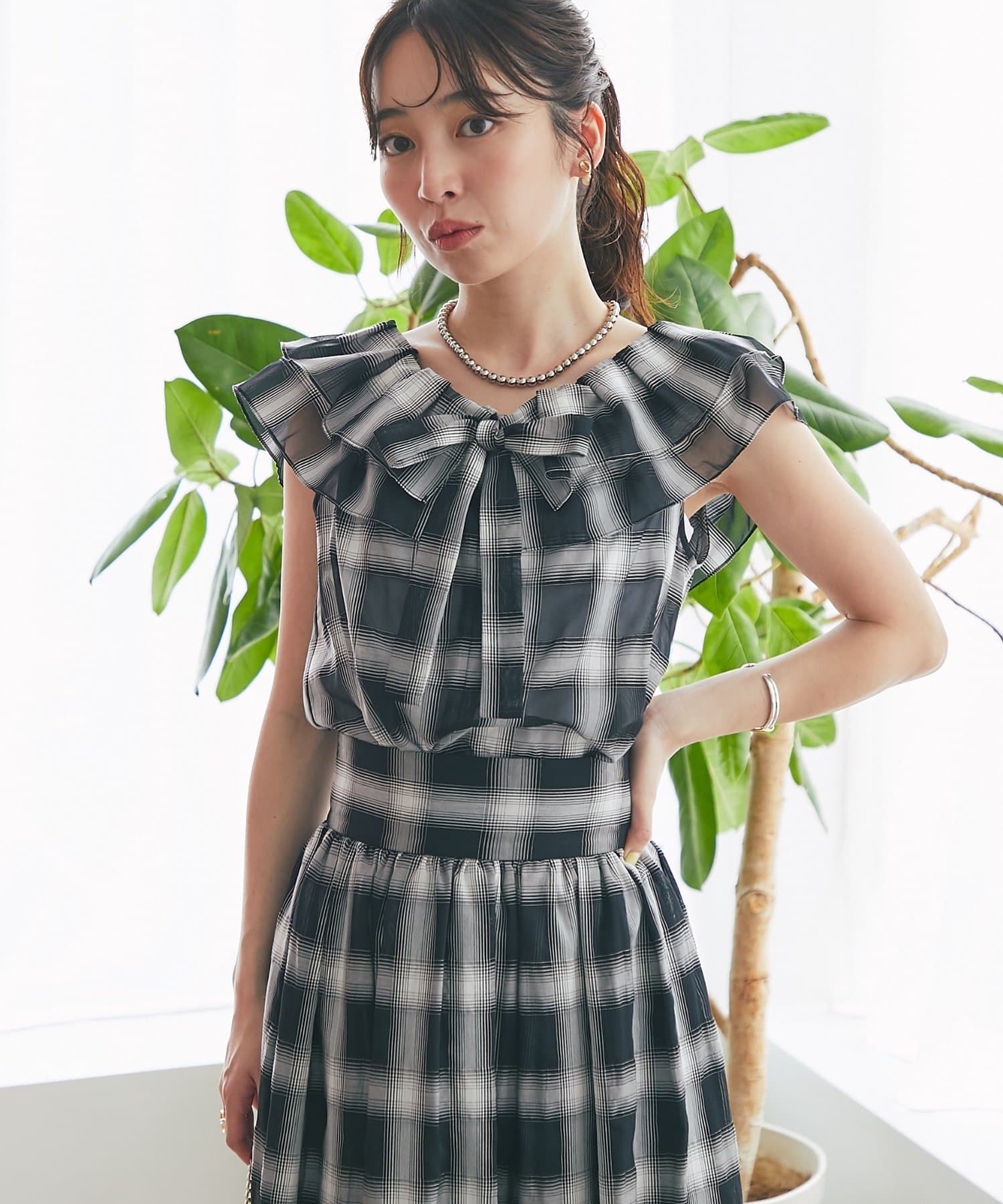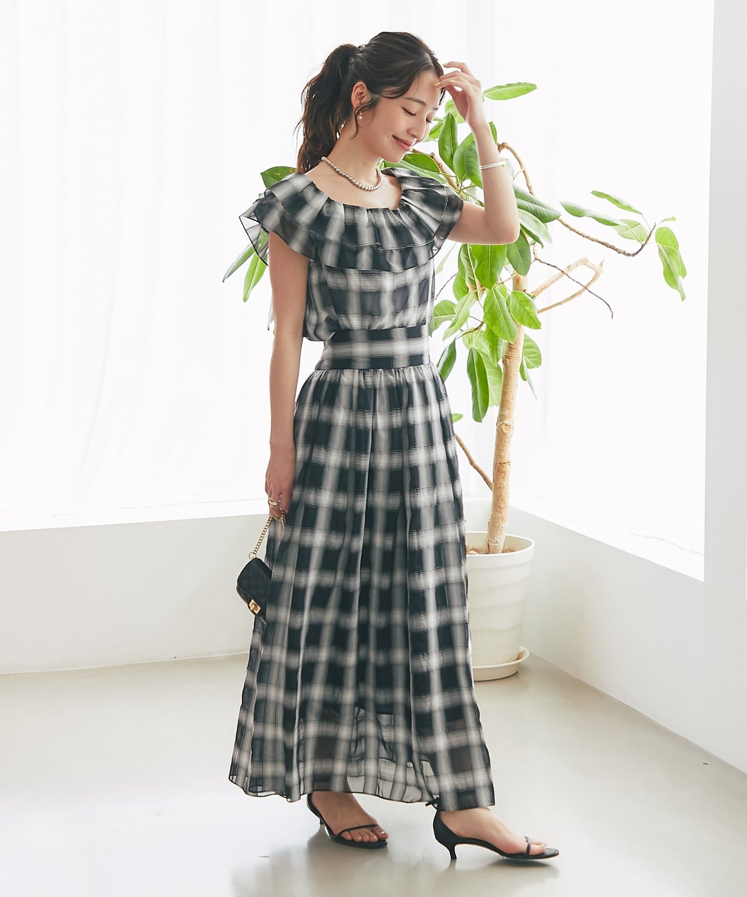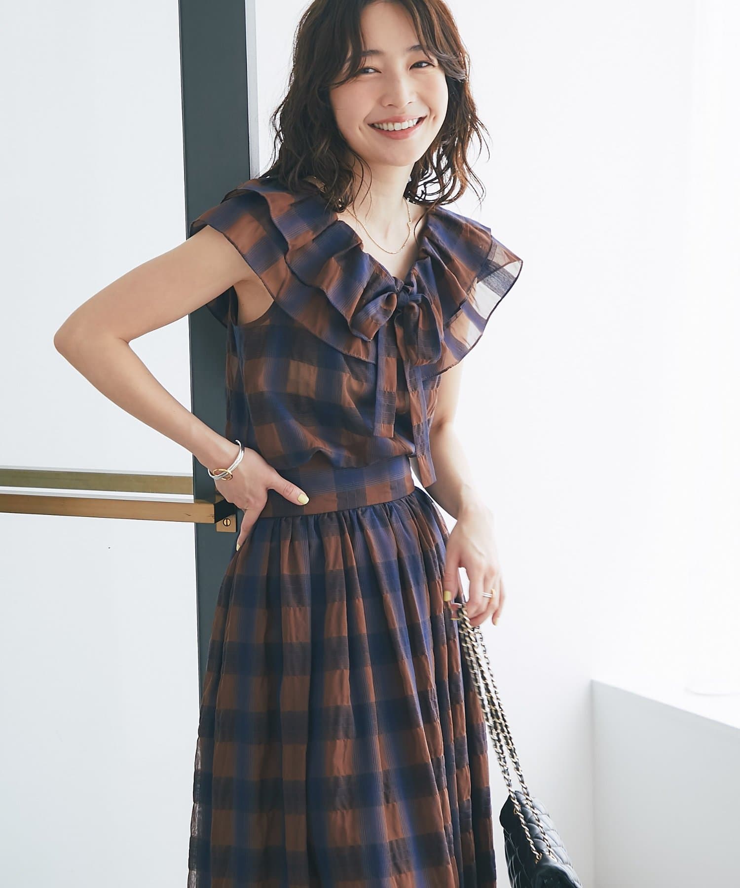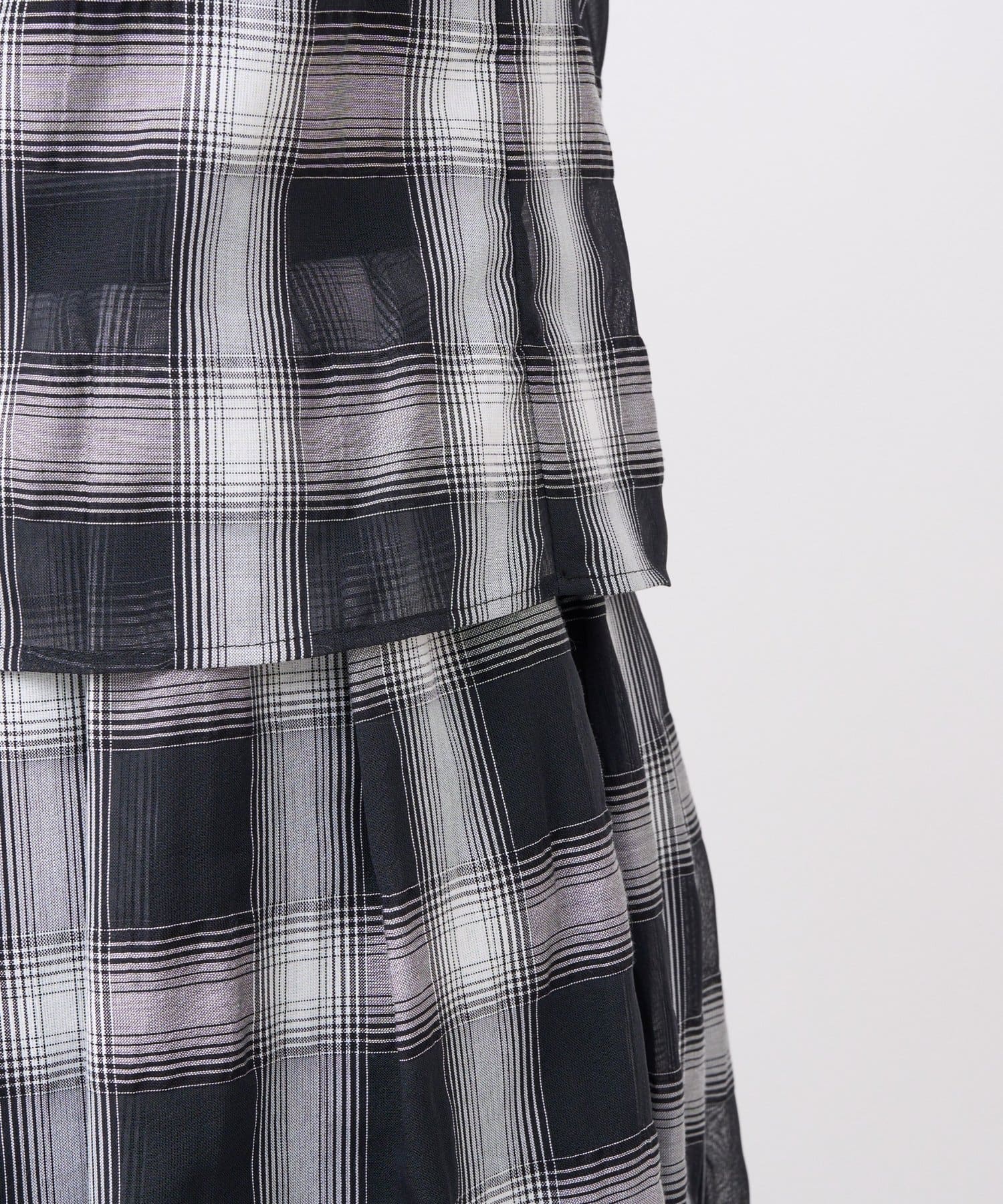【セットアップ可】シアーオンブレーチェック2WAYフリルオフショルブラウス