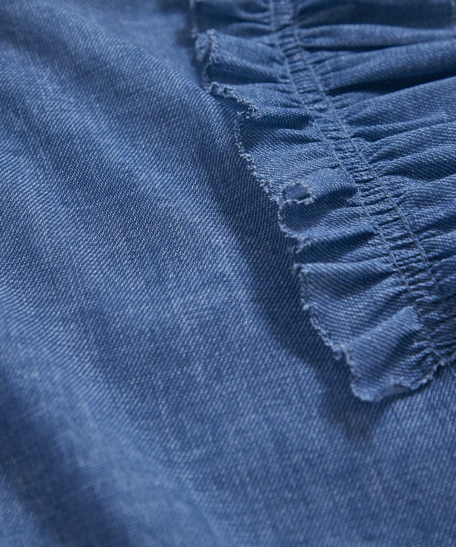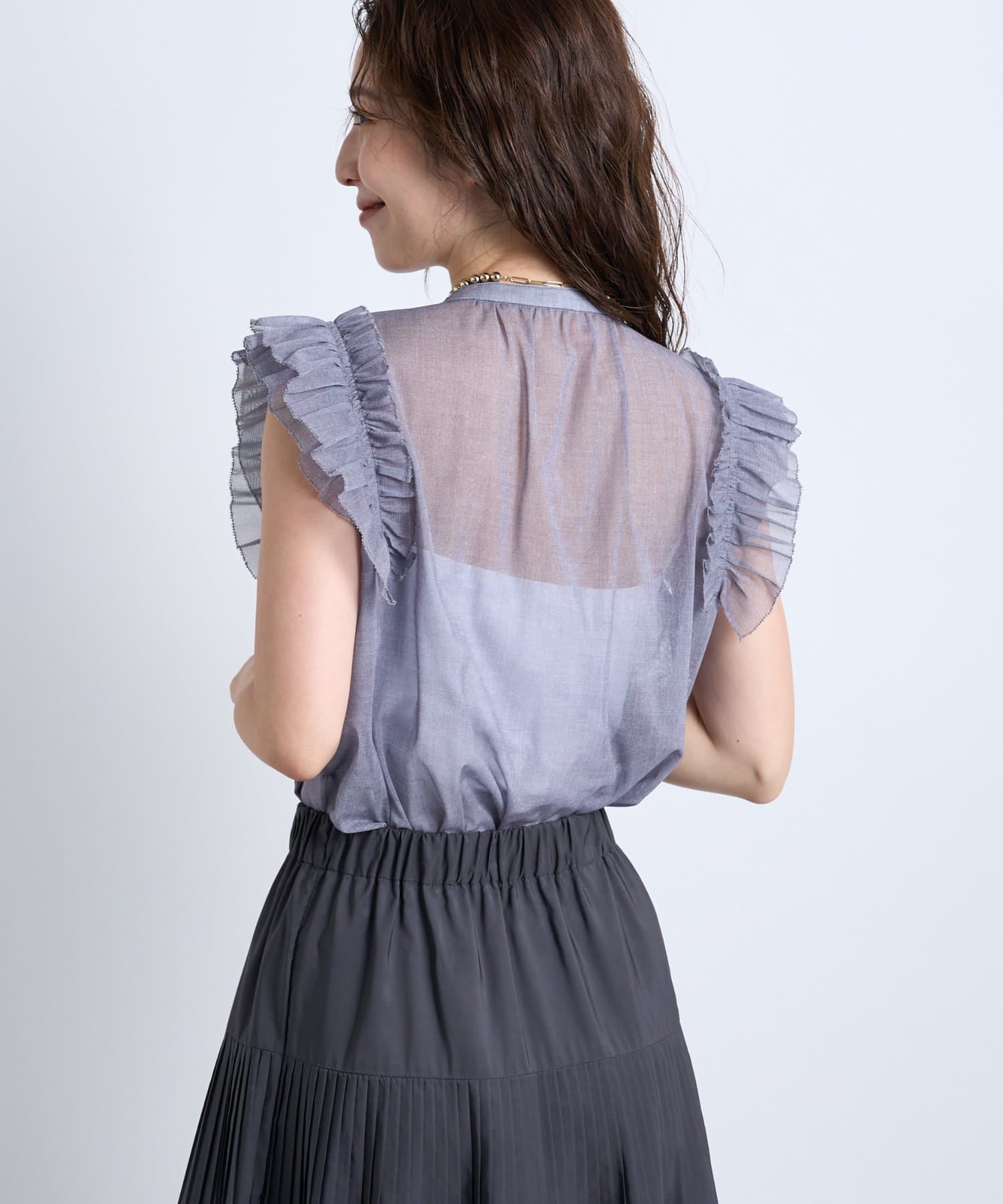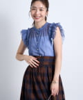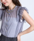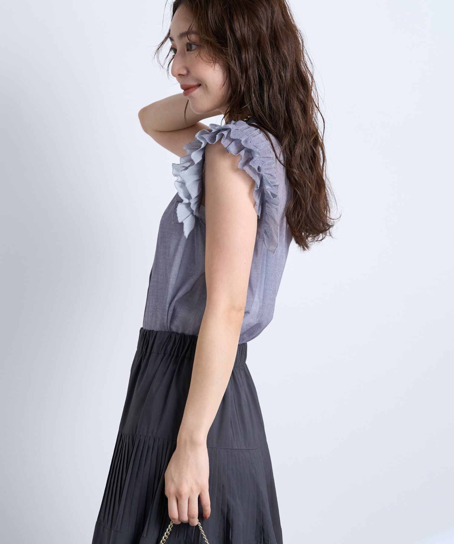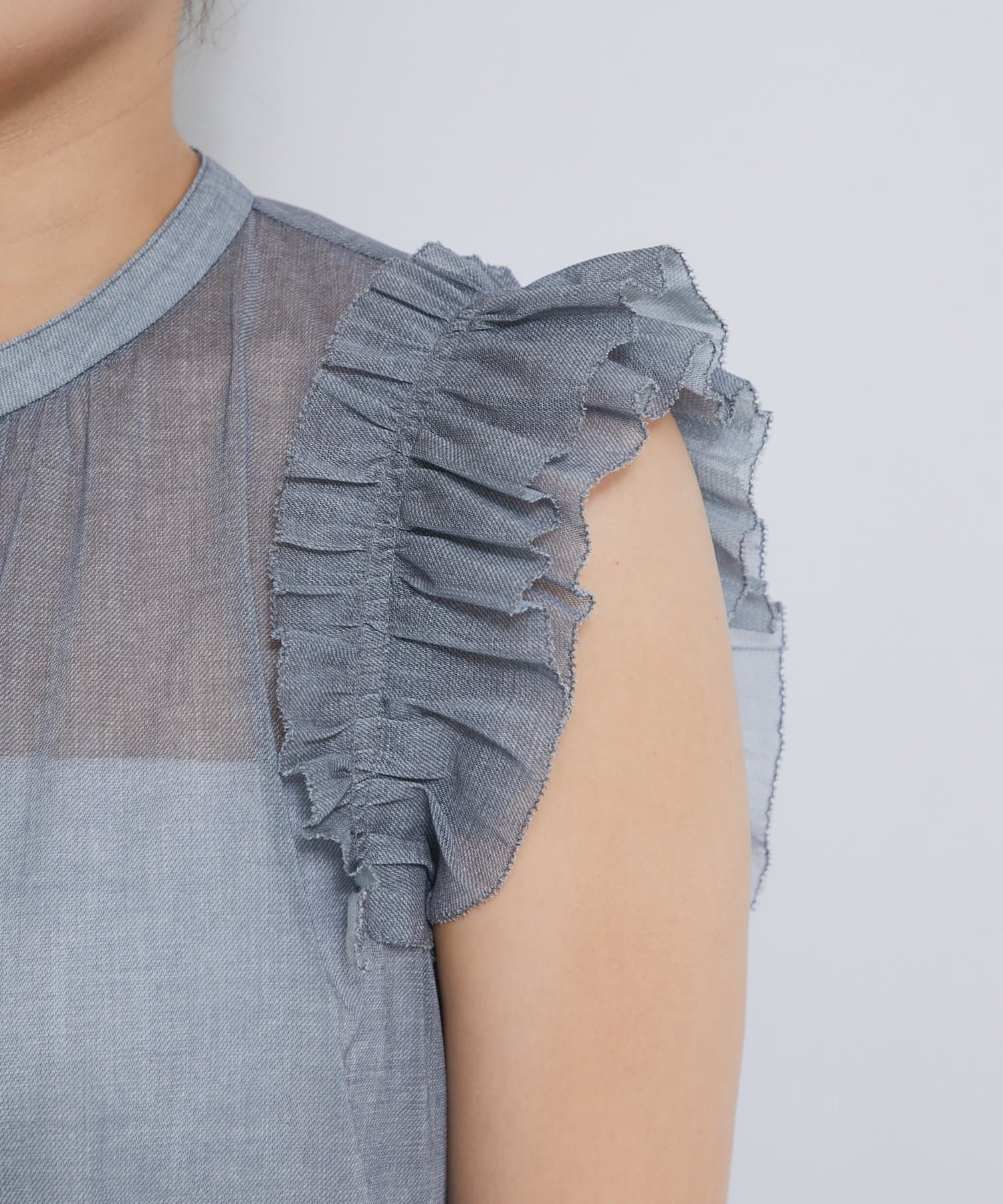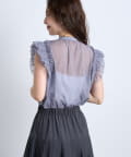 デニムのような色合いが目を引く、華やかなチュール素材のフリルブラウス。