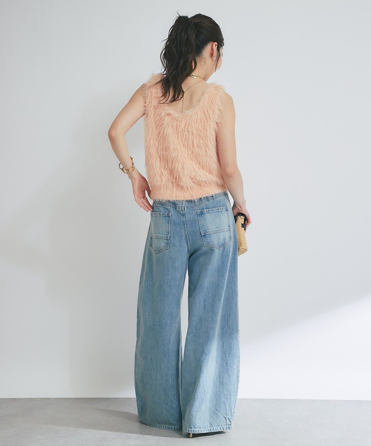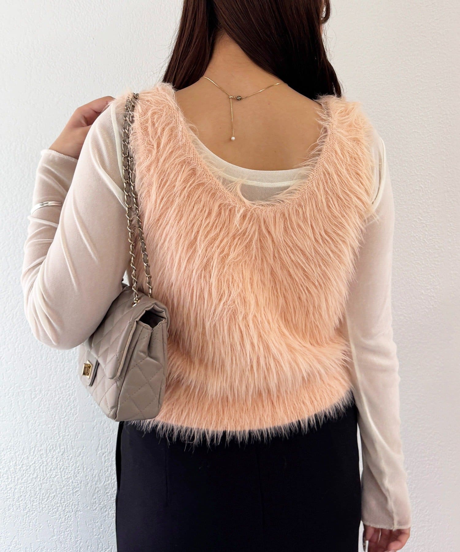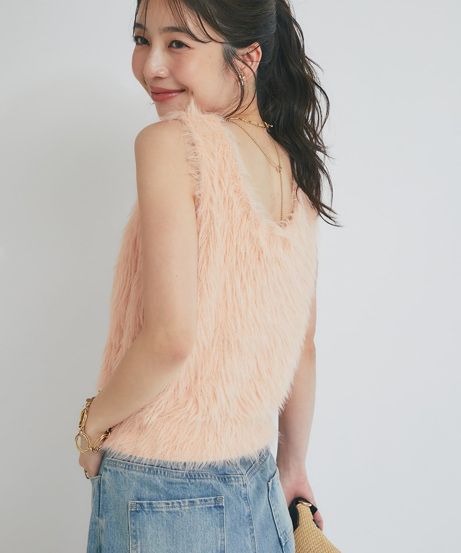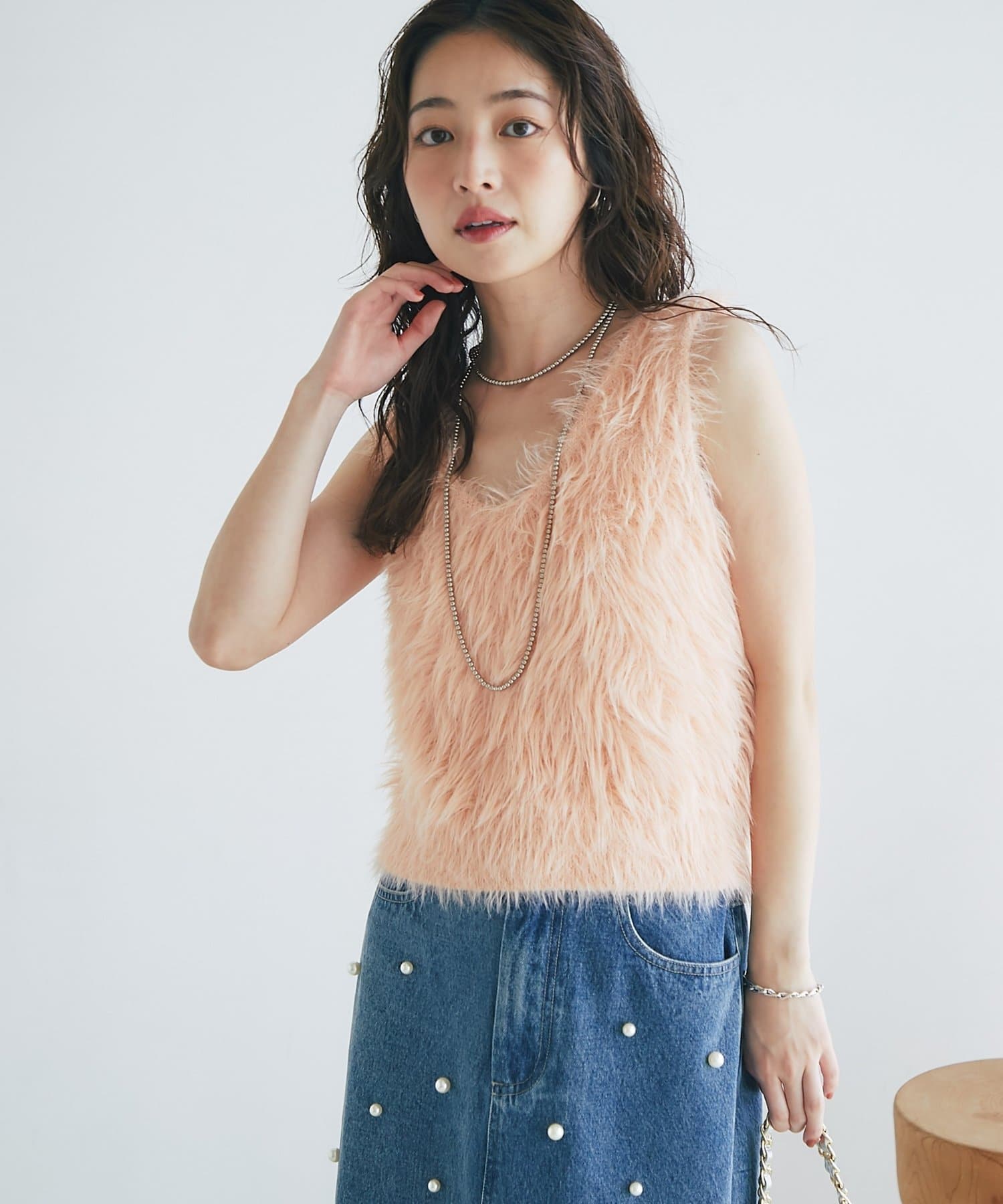 毛足の長いフェザー素材が思わず触れたくなる、ふわふわと柔らかなニットベスト。