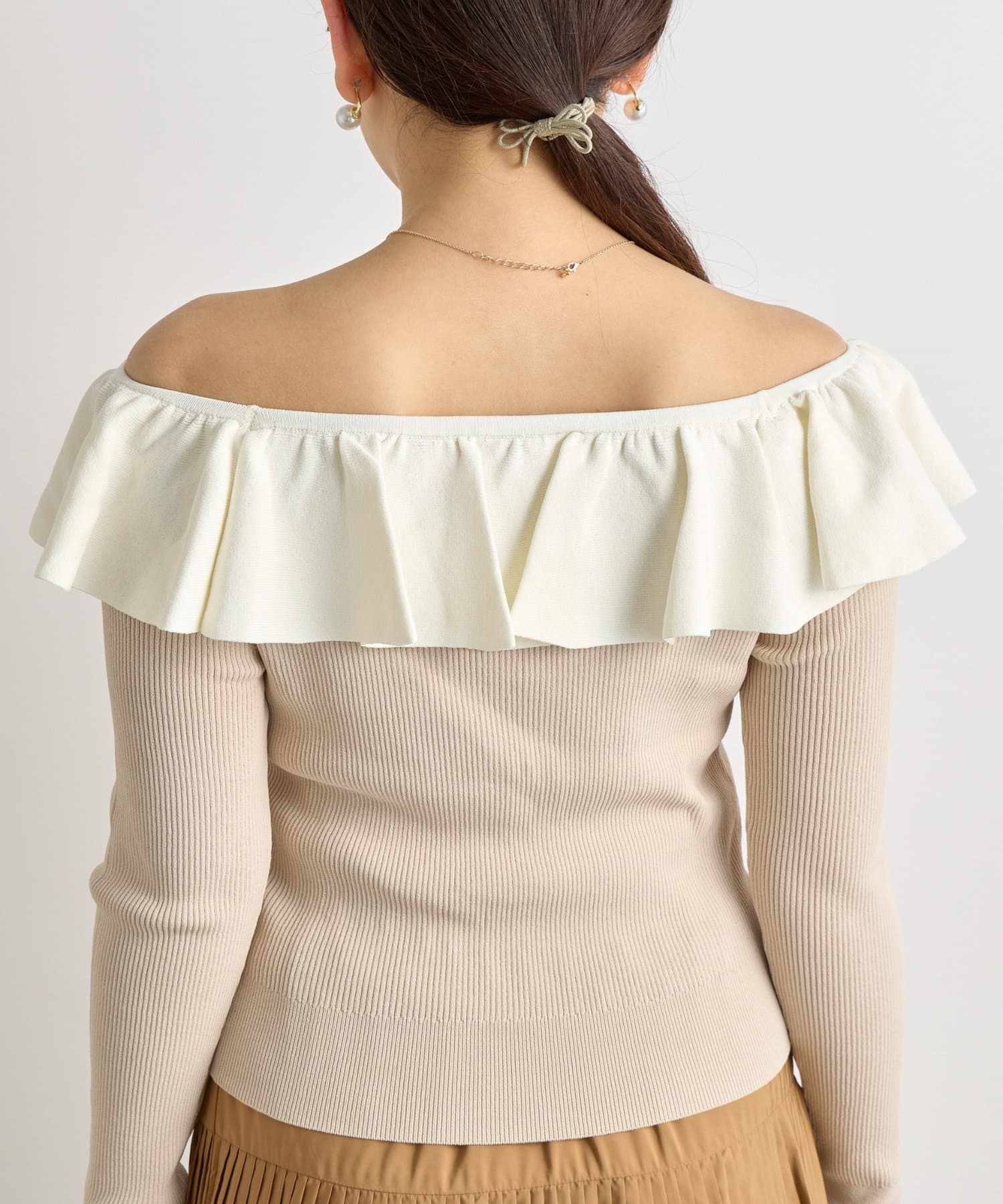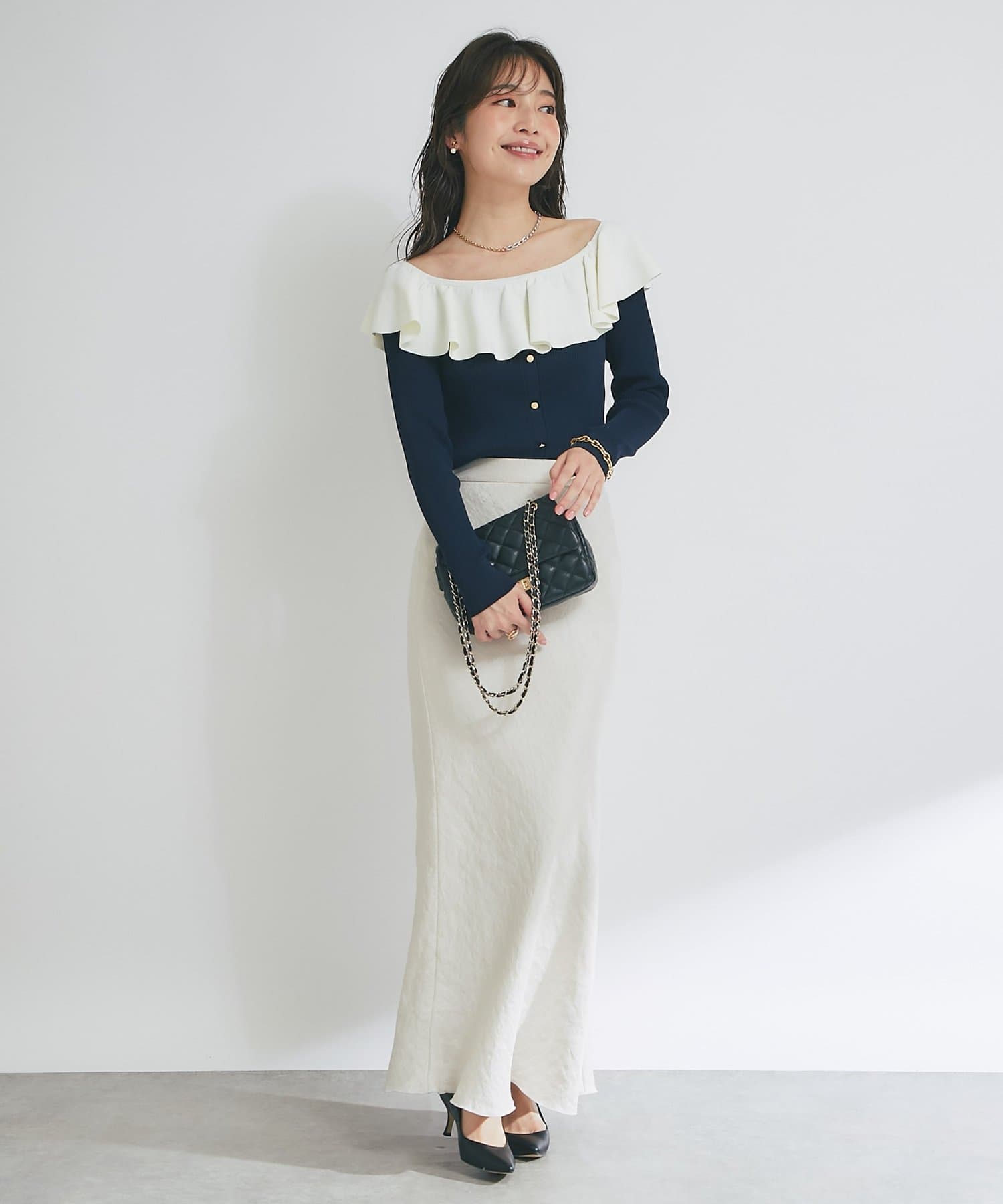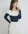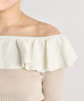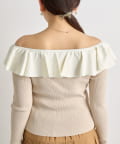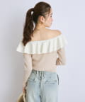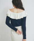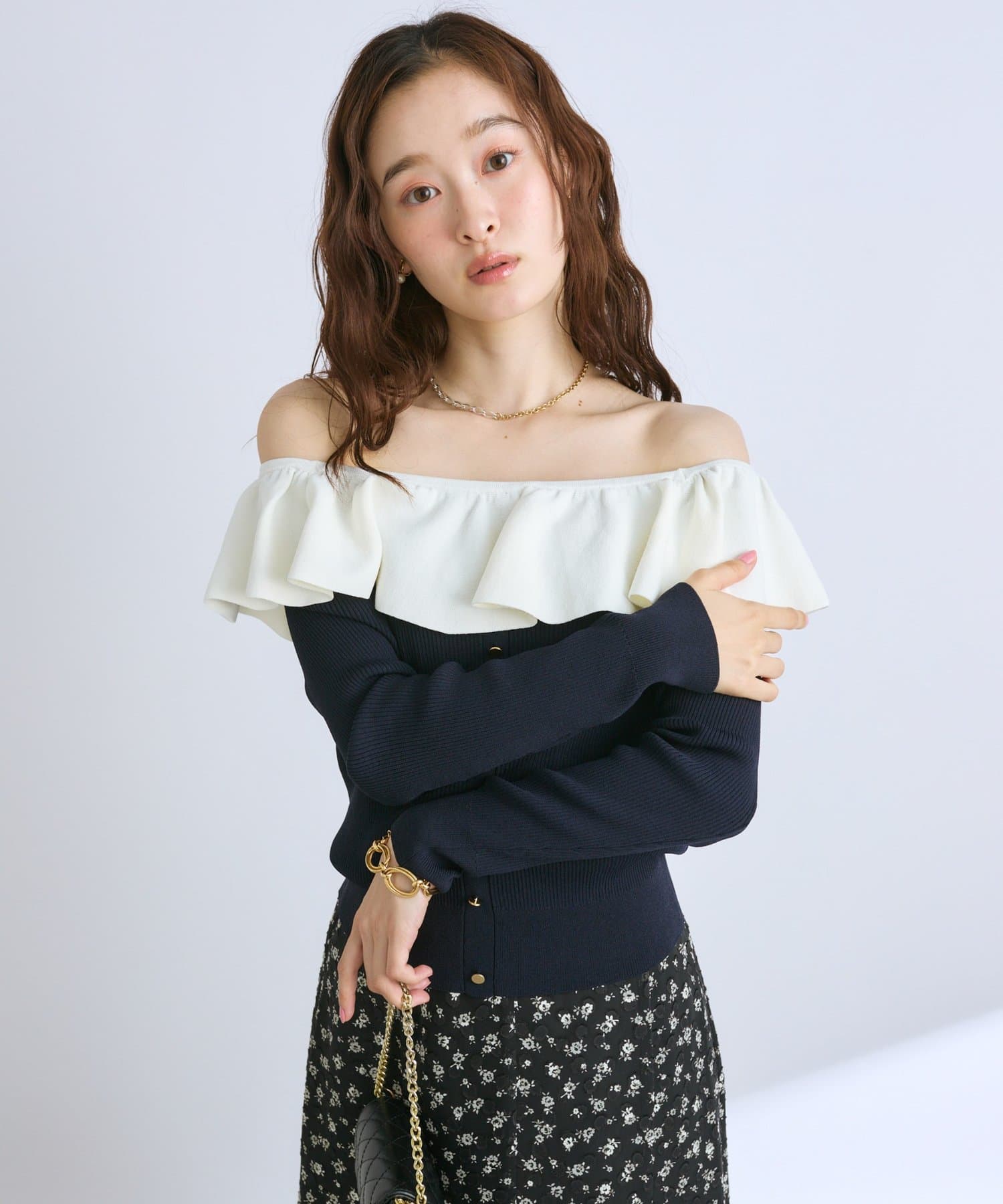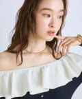目を惹くオフショルダーデザインは、女性らしさを際立たせるポイント。