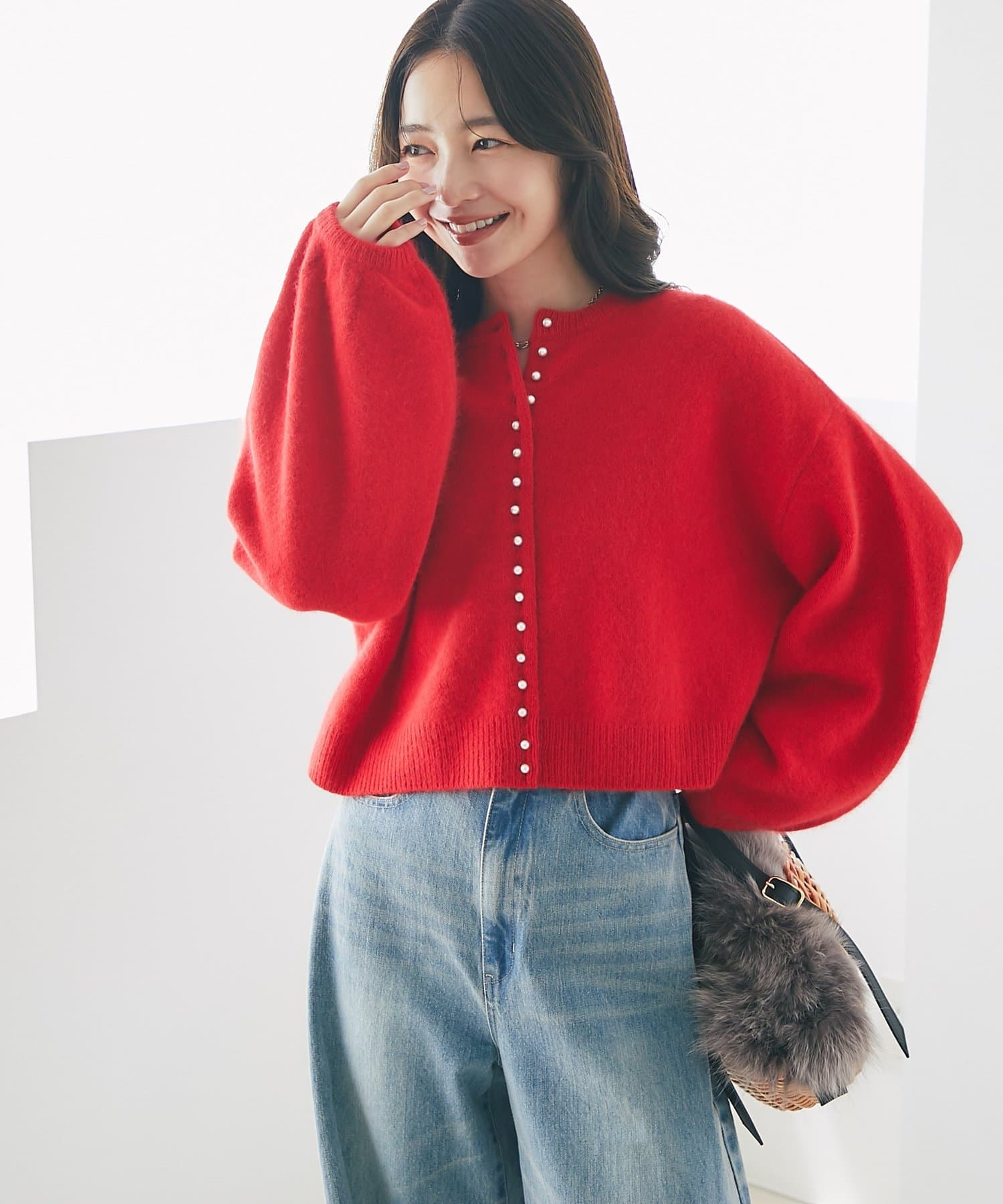 バッグの間口部分のファーはスナップボタンにより取り外しが可能な仕様で、付けているときはファーフラップが華やかな雰囲気をプラスしてくれます。
