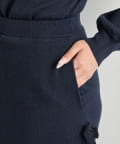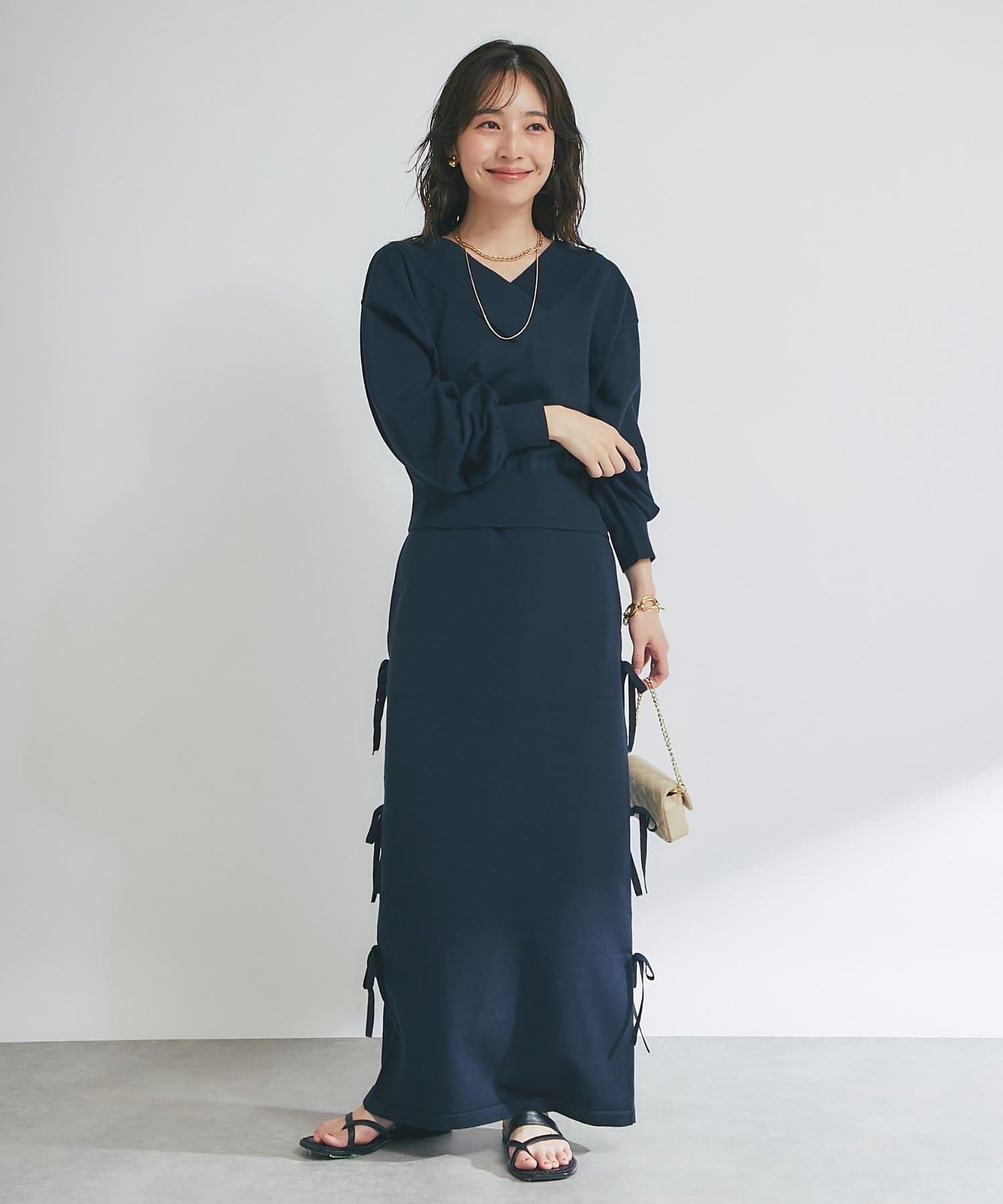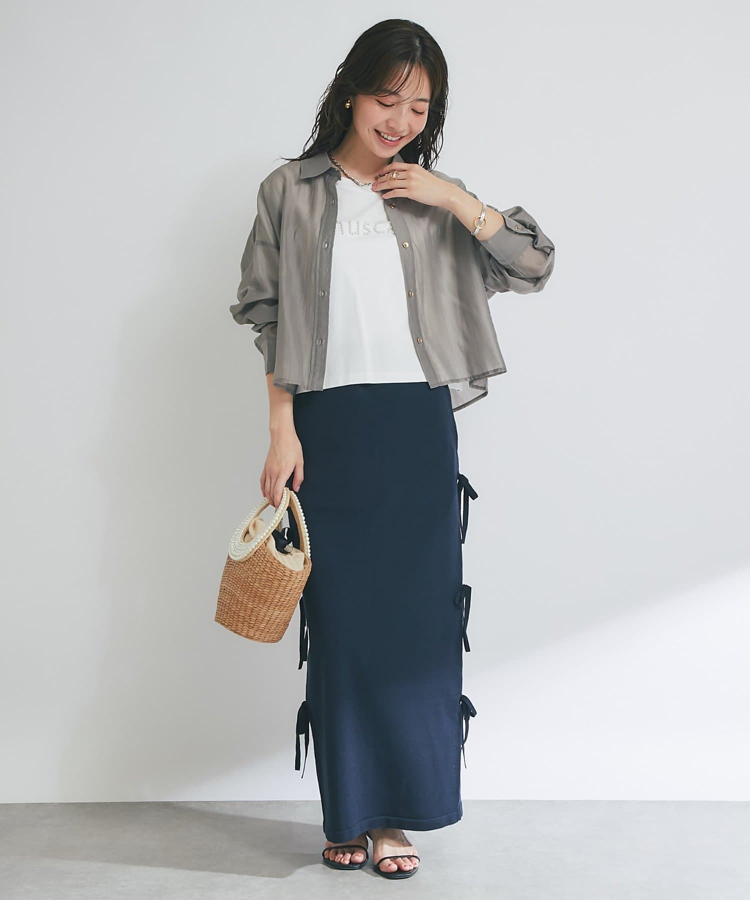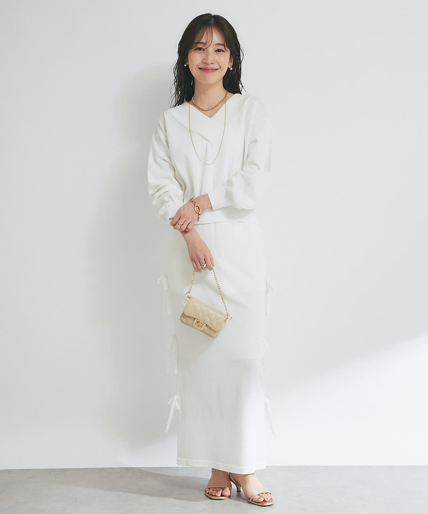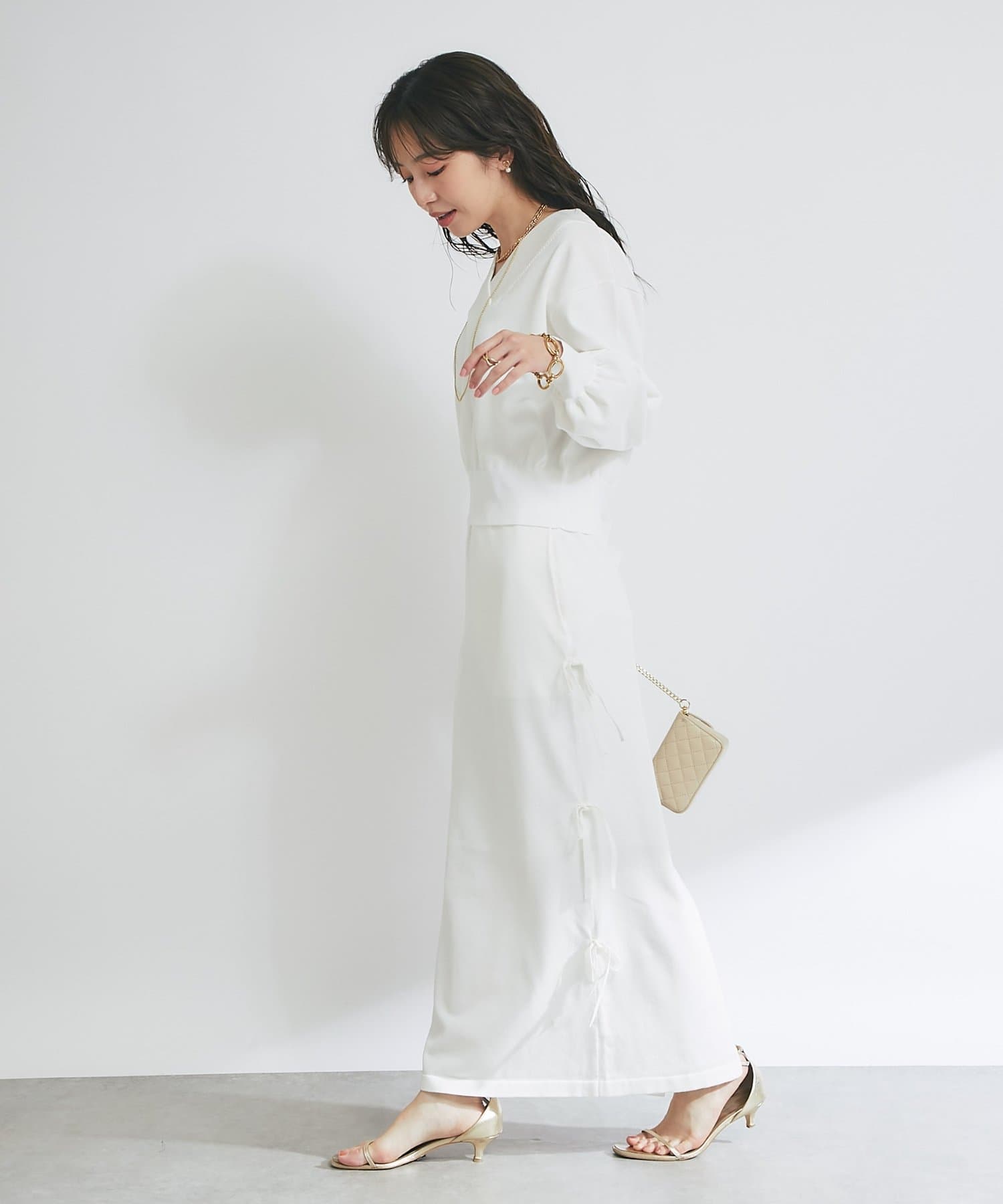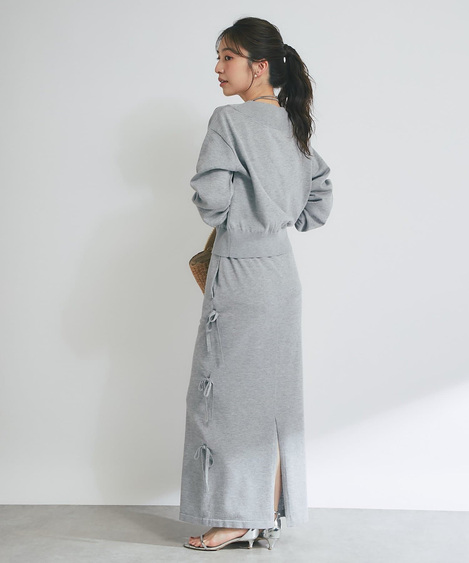 バックにはスリットを施し、ロング丈でも足さばきが良く、軽やかな抜け感をプラスします。