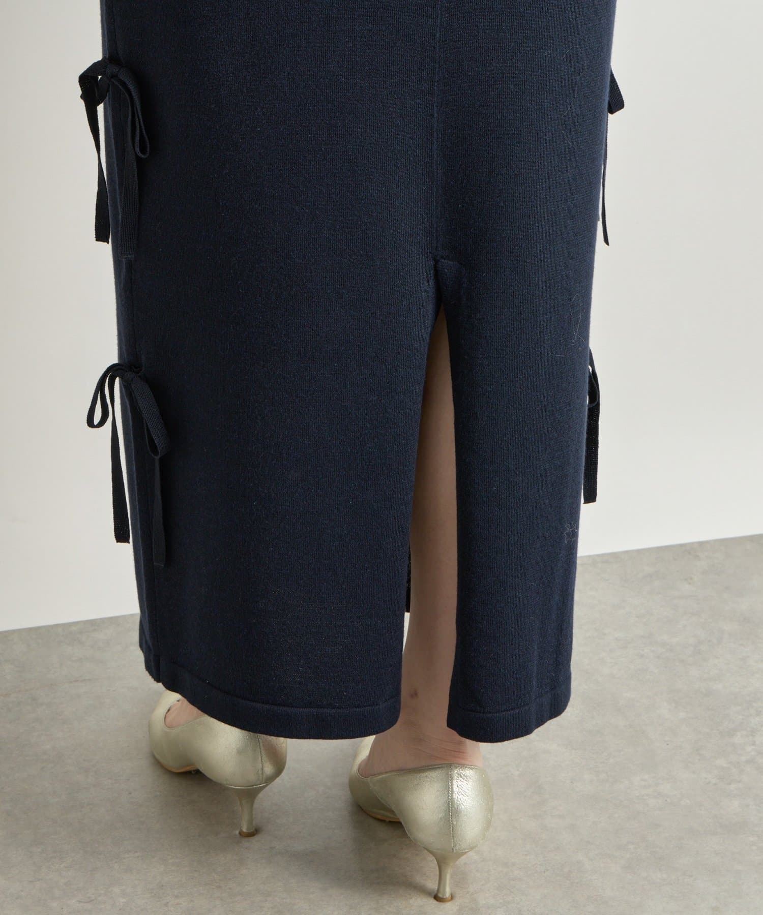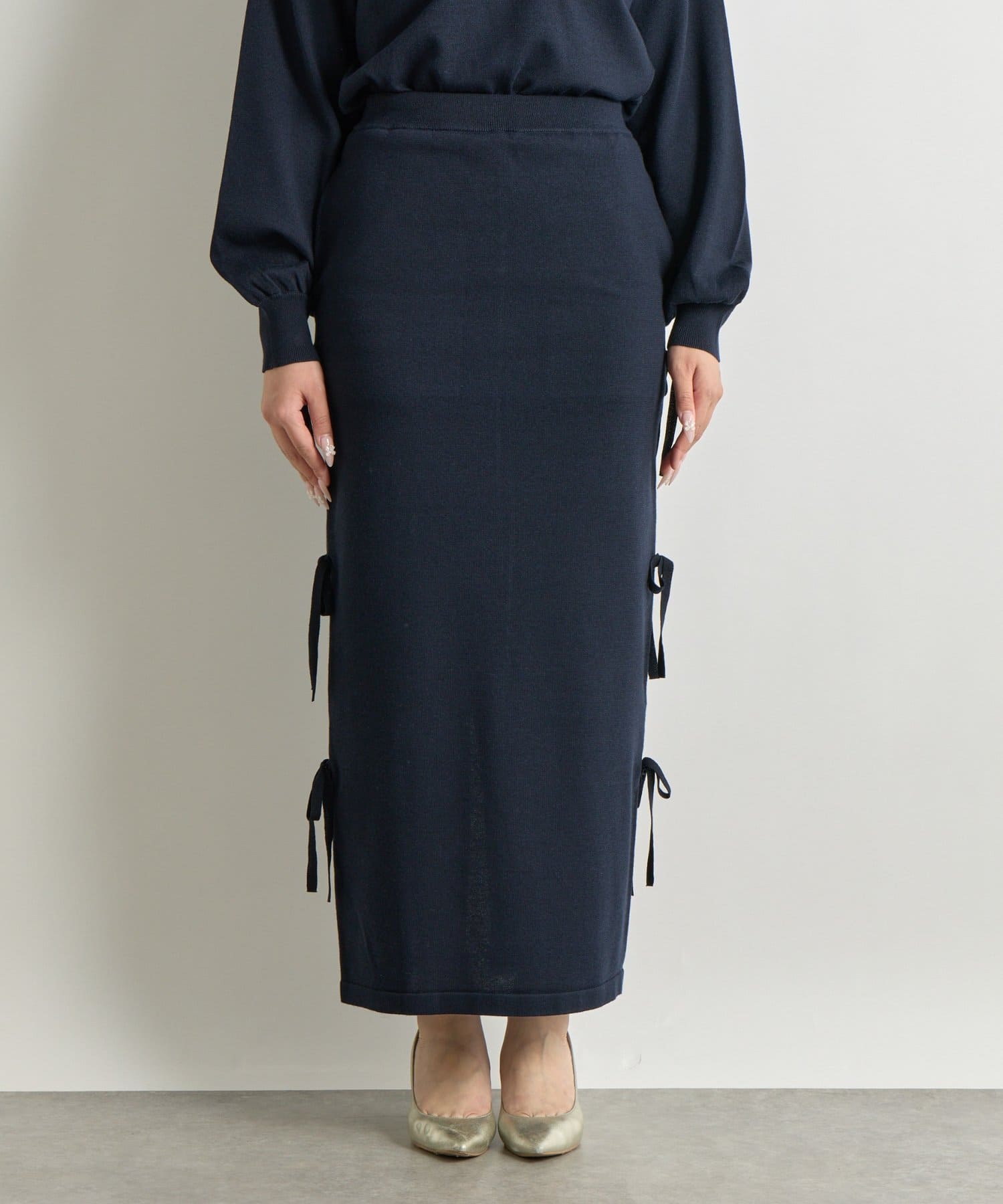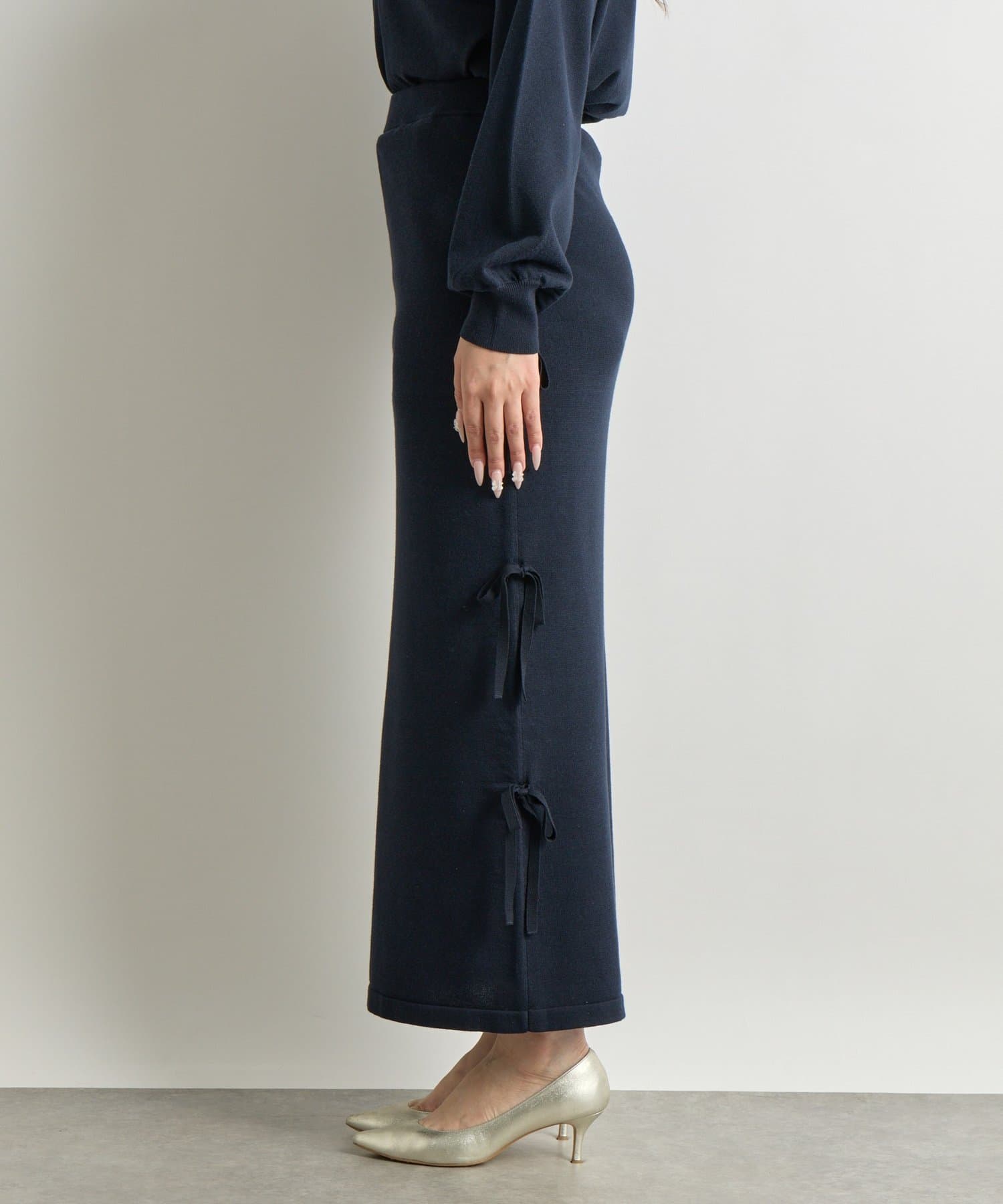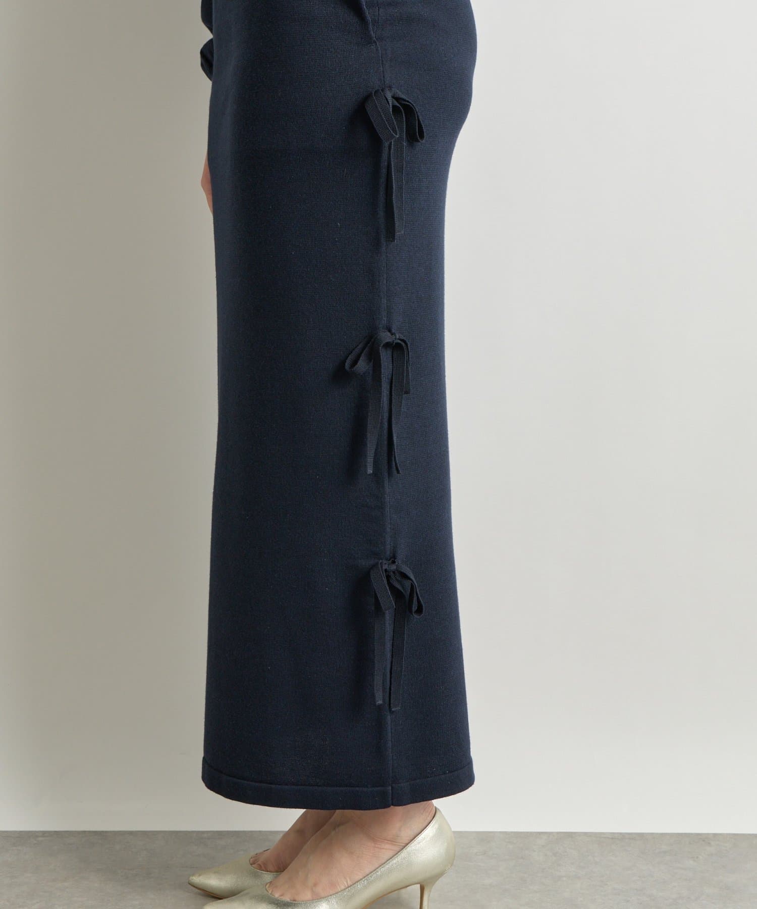シンプルなデザインに、サイドリボンがアクセントを添えるラメニットロングスカート。