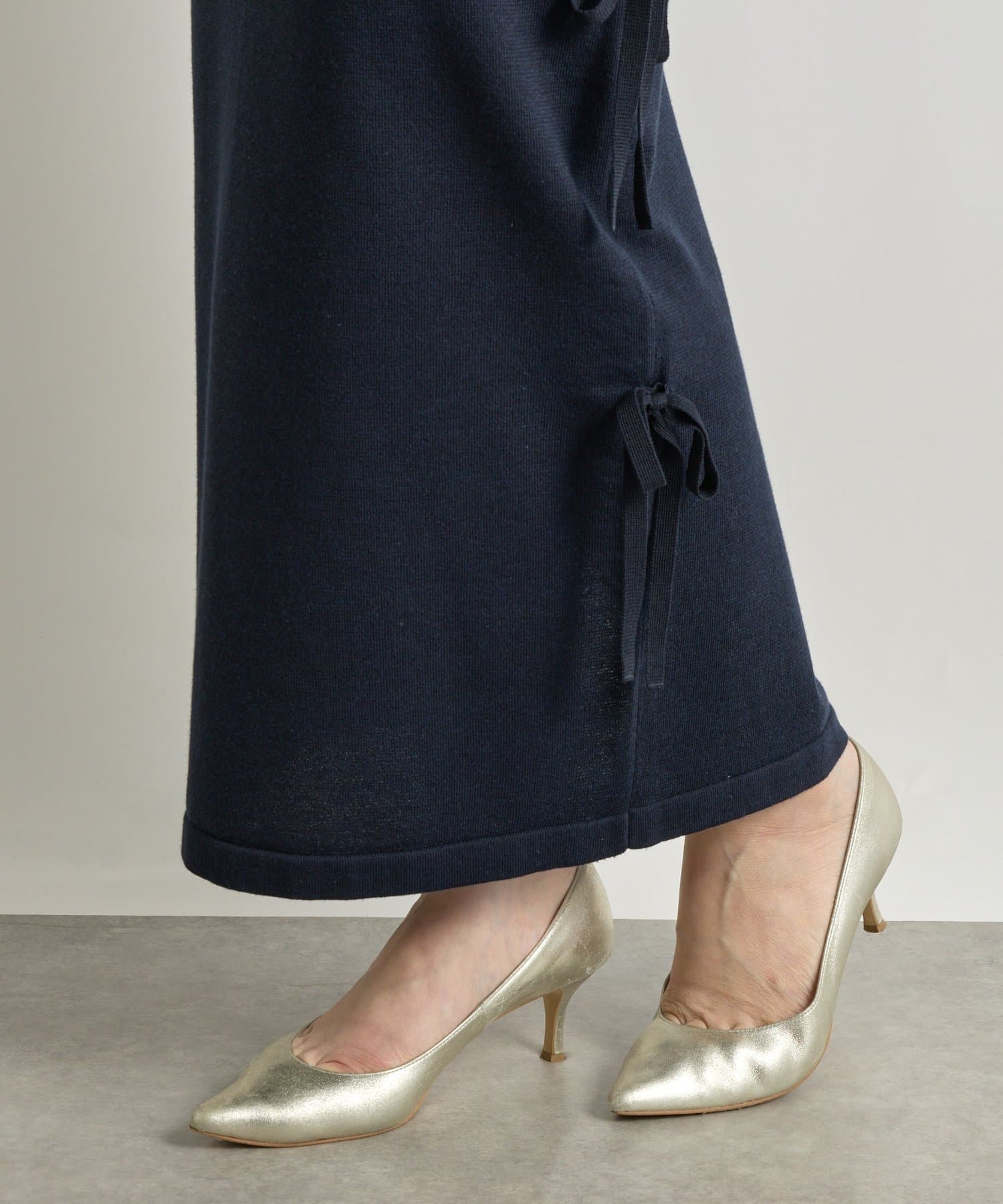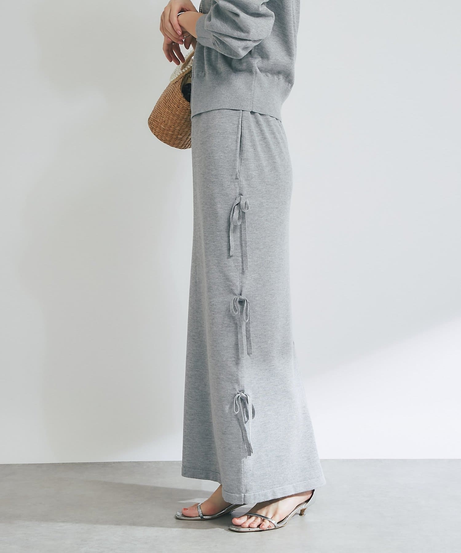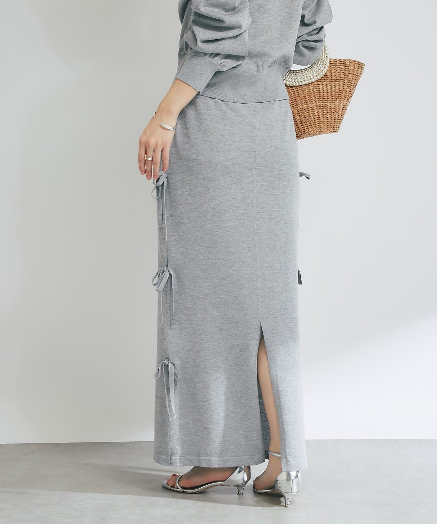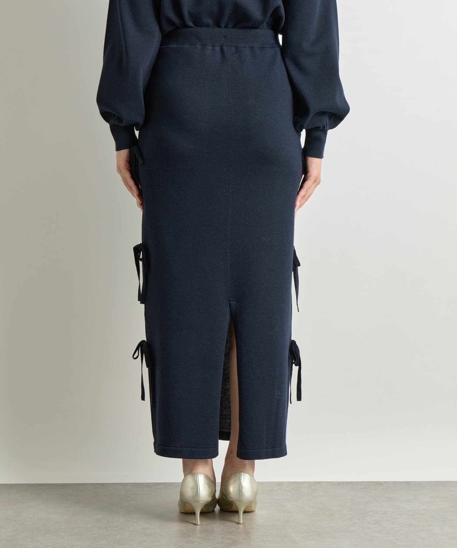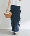 シンプルなデザインに、サイドリボンがアクセントを添えるラメニットロングスカート。