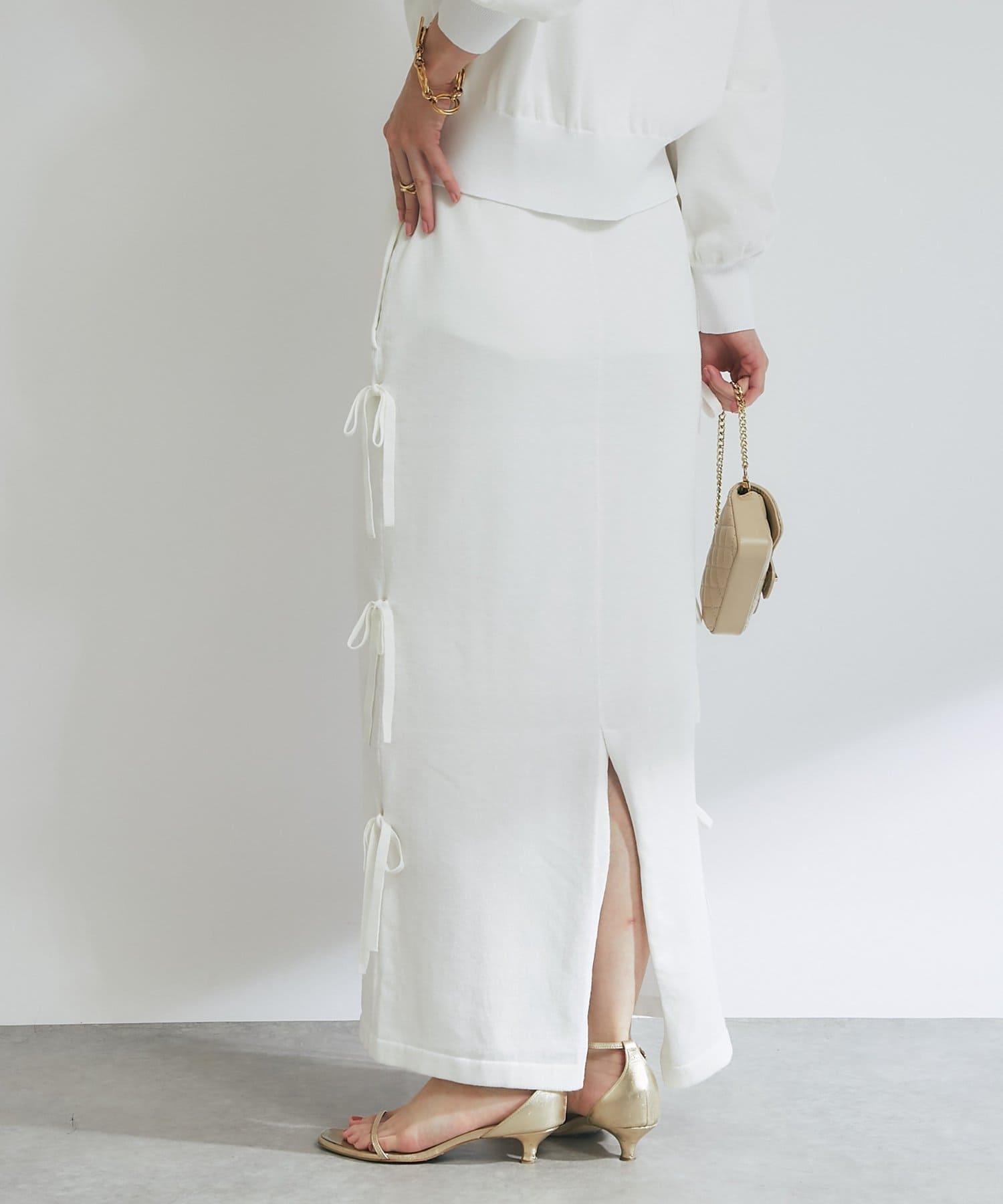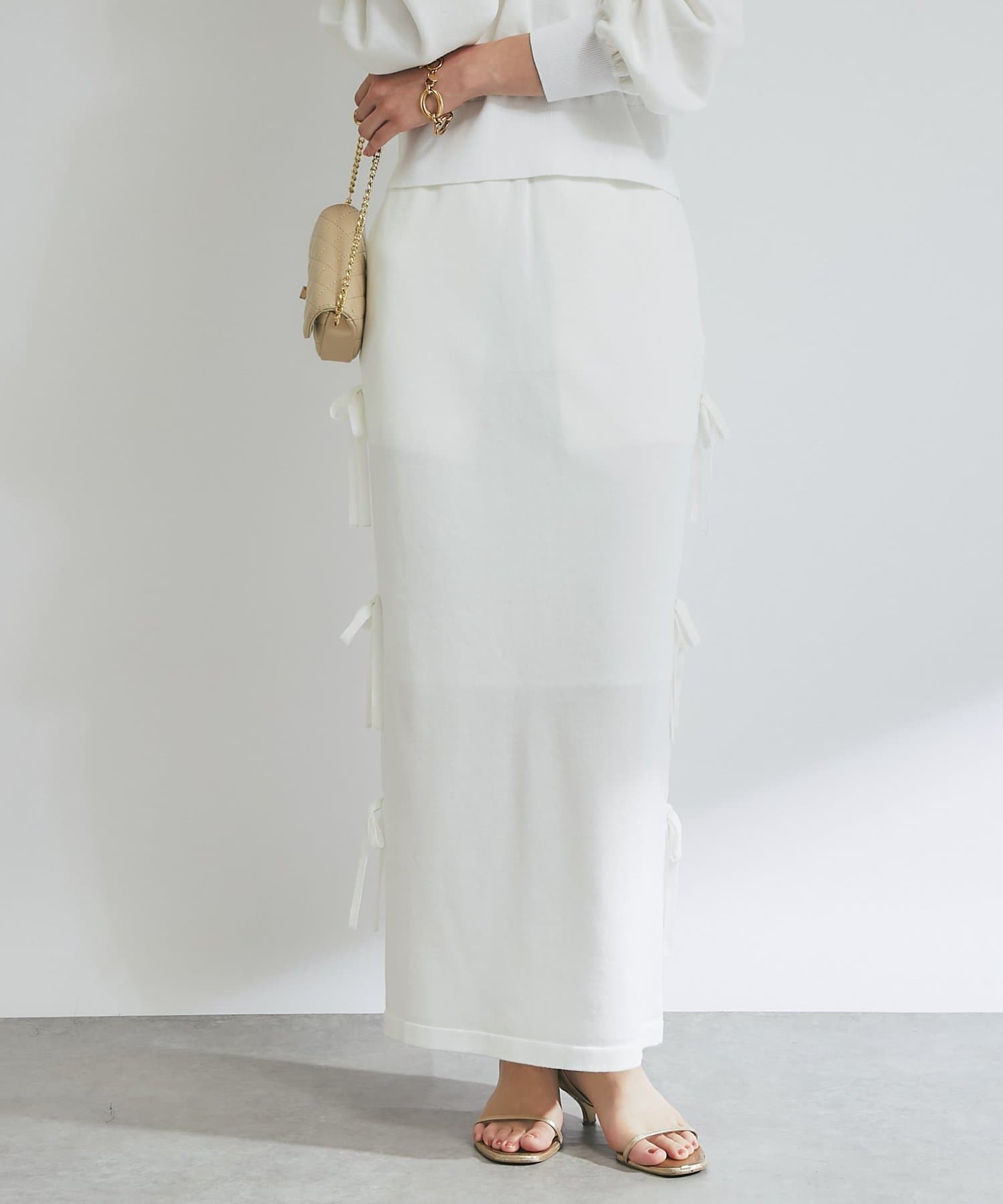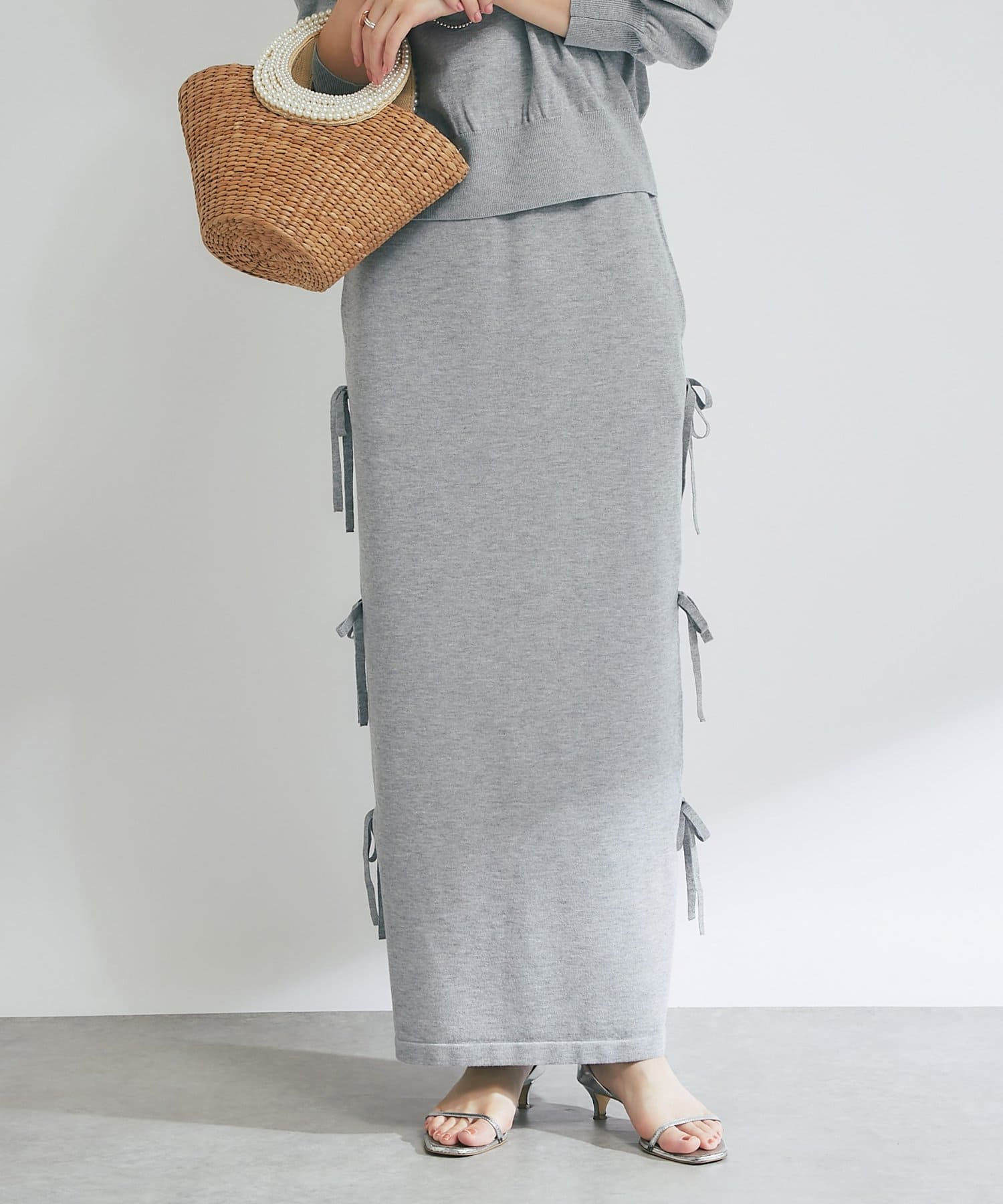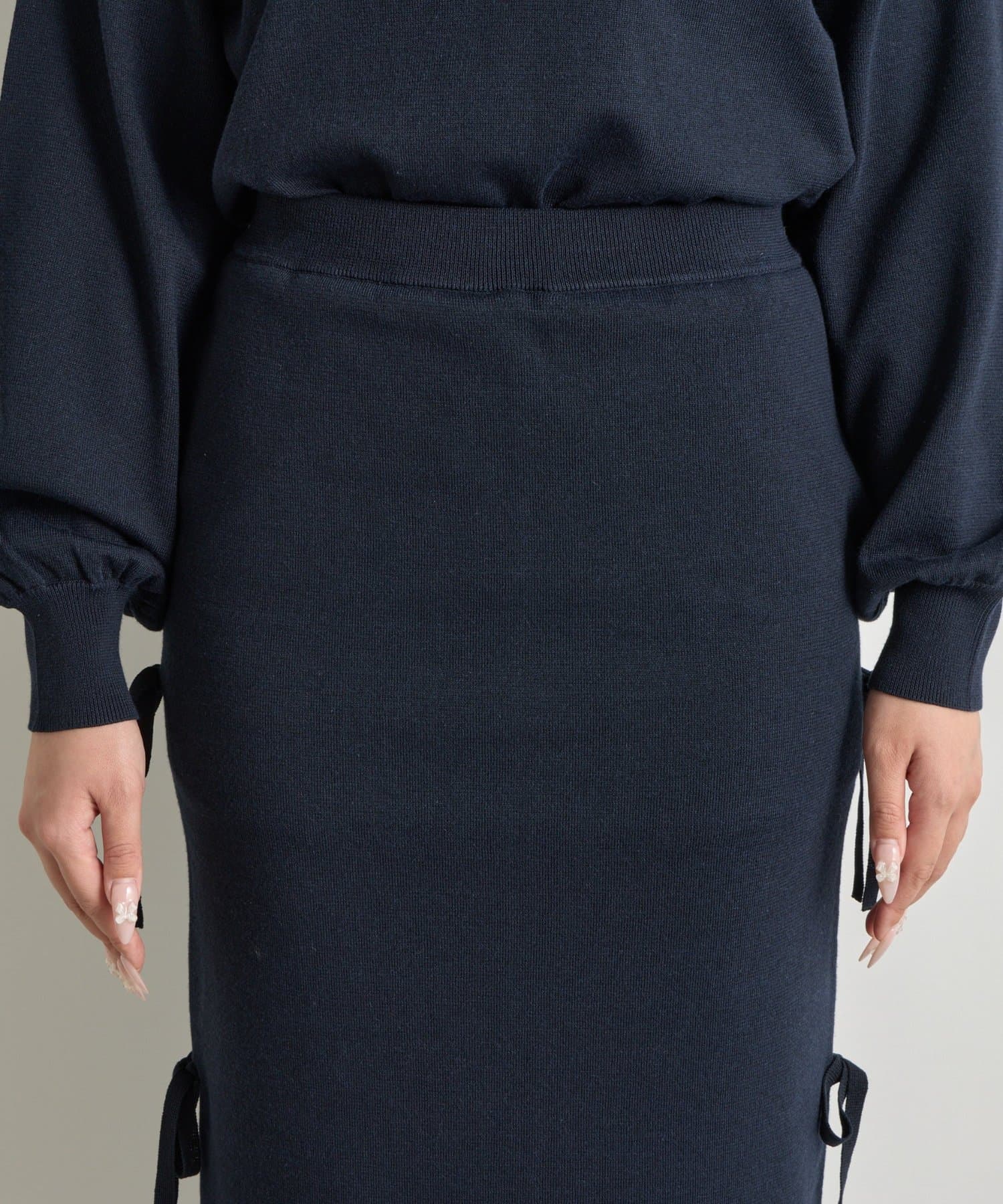 シンプルなデザインに、サイドリボンがアクセントを添えるラメニットロングスカート。
