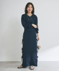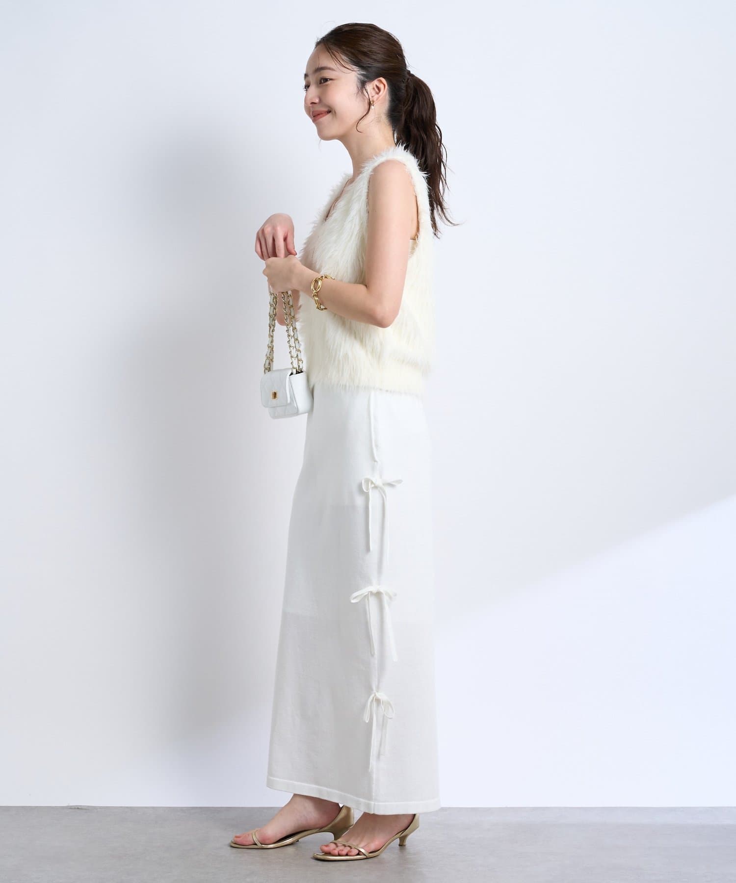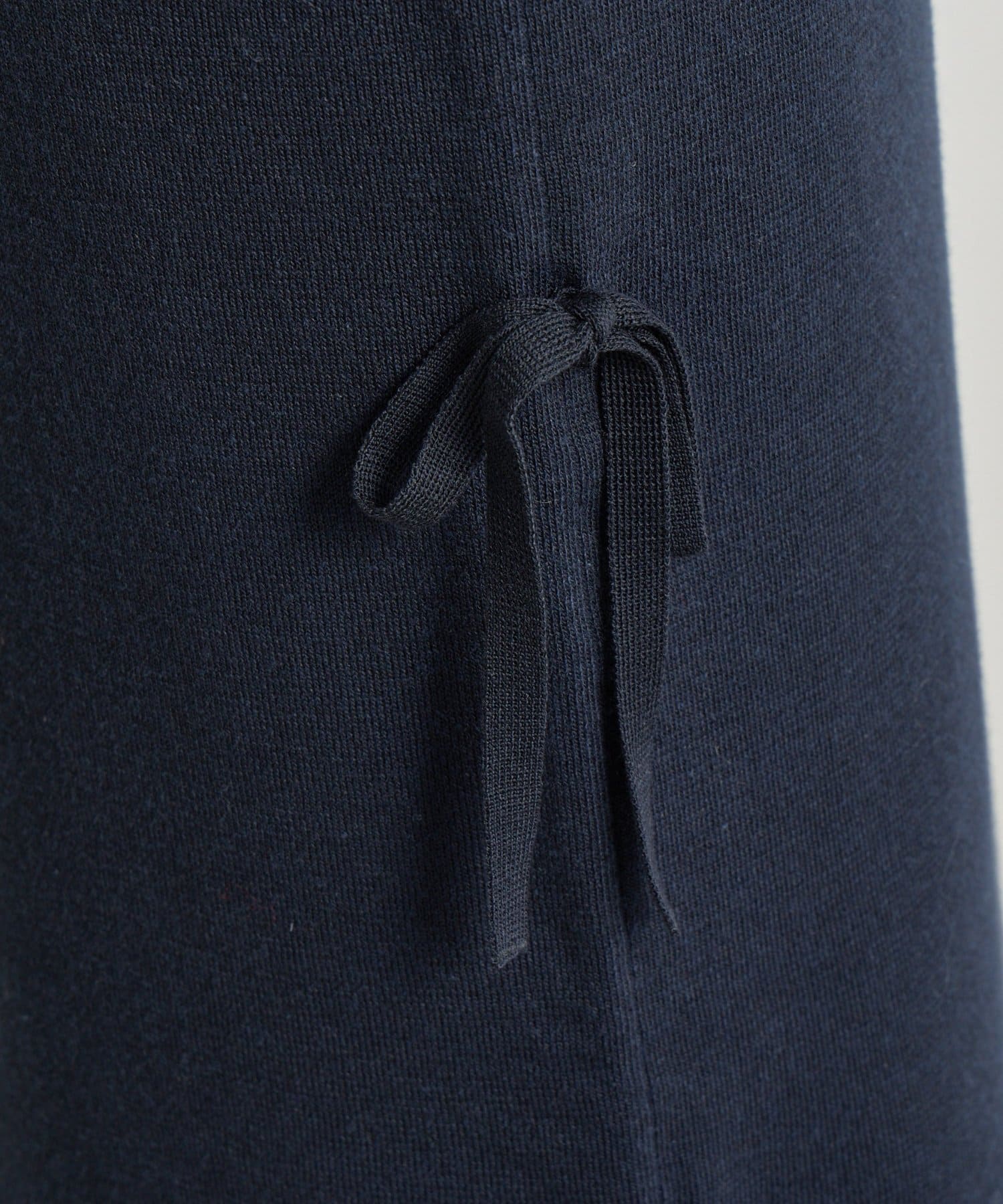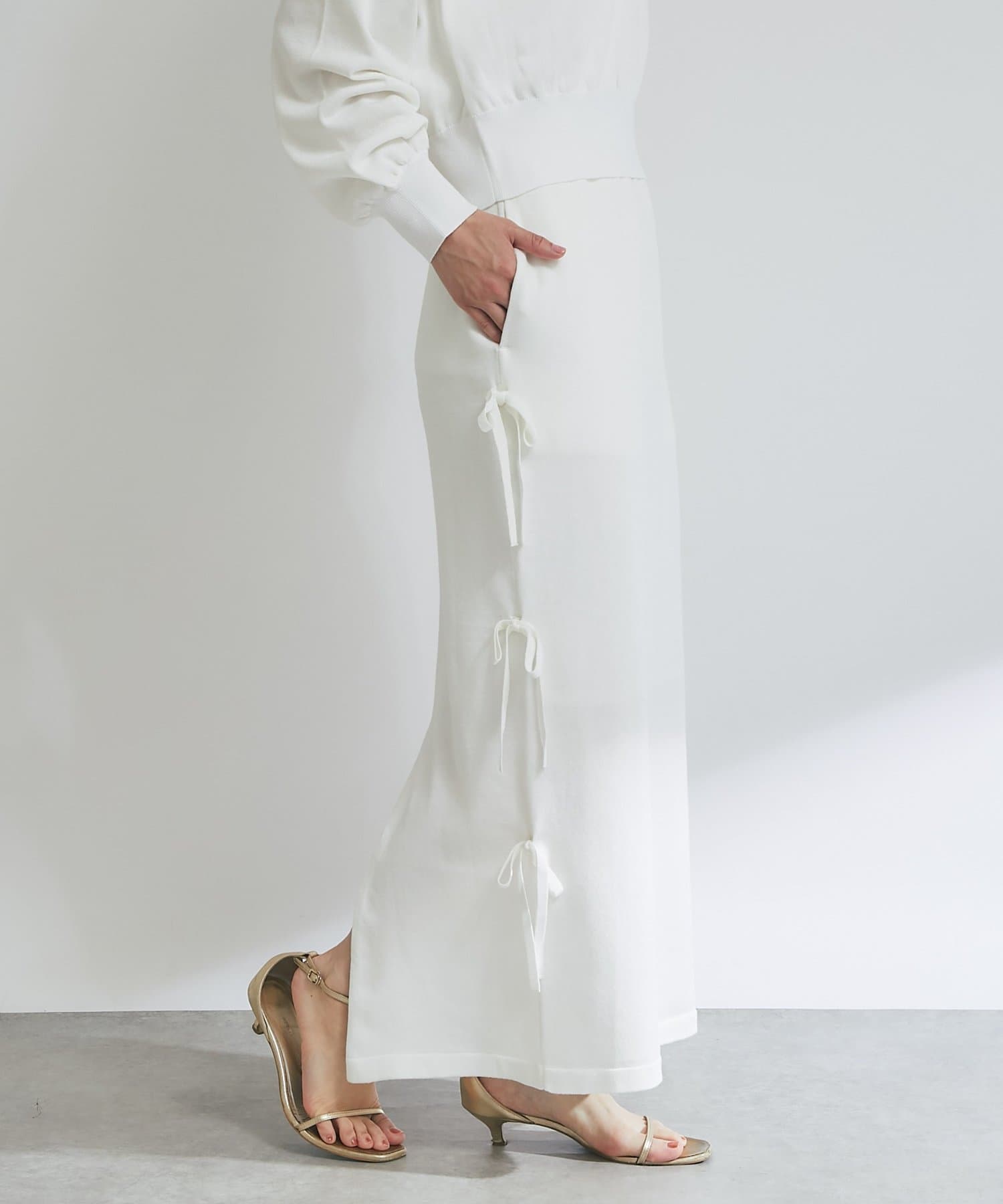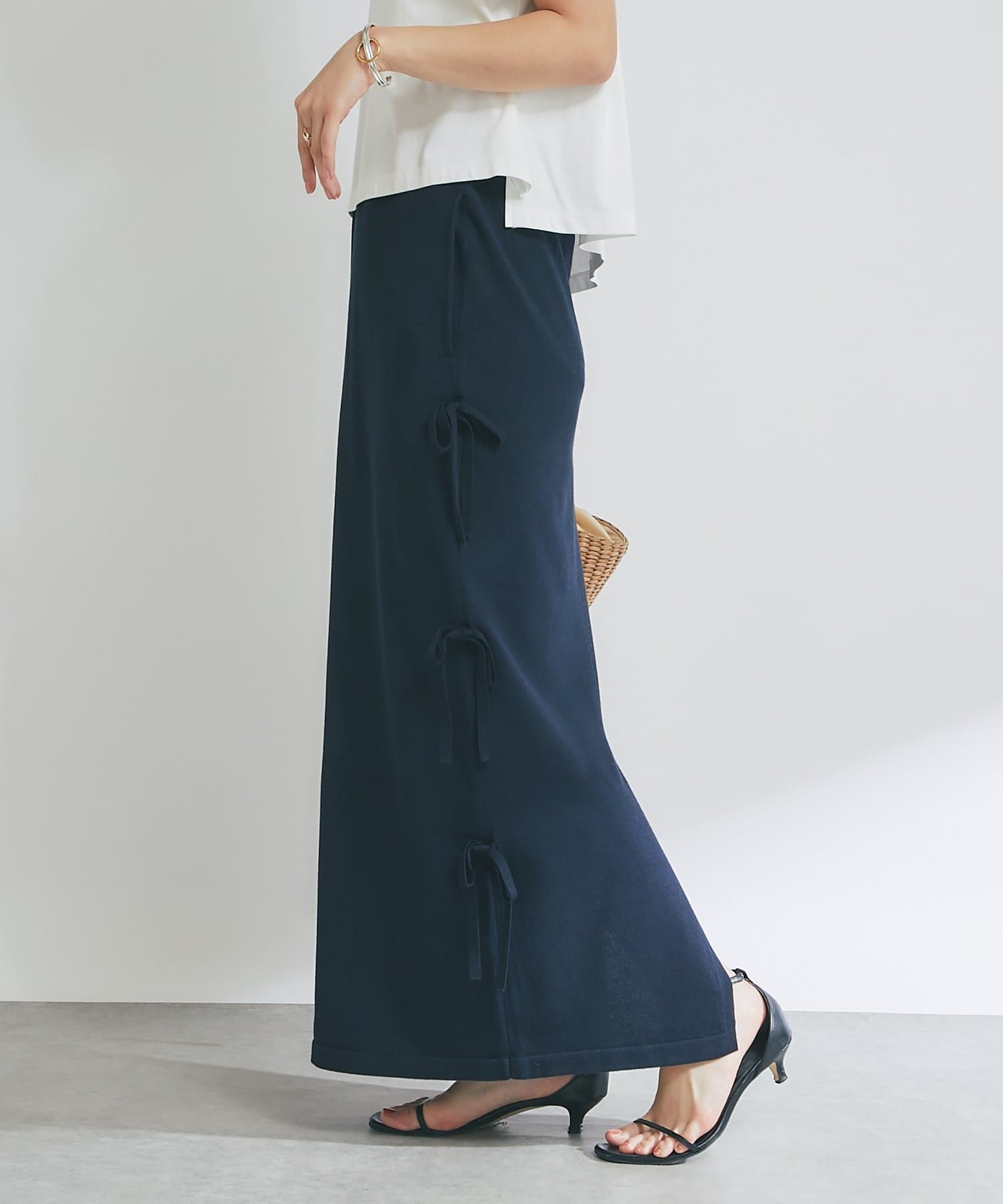 シンプルなデザインに、サイドリボンがアクセントを添えるラメニットロングスカート。