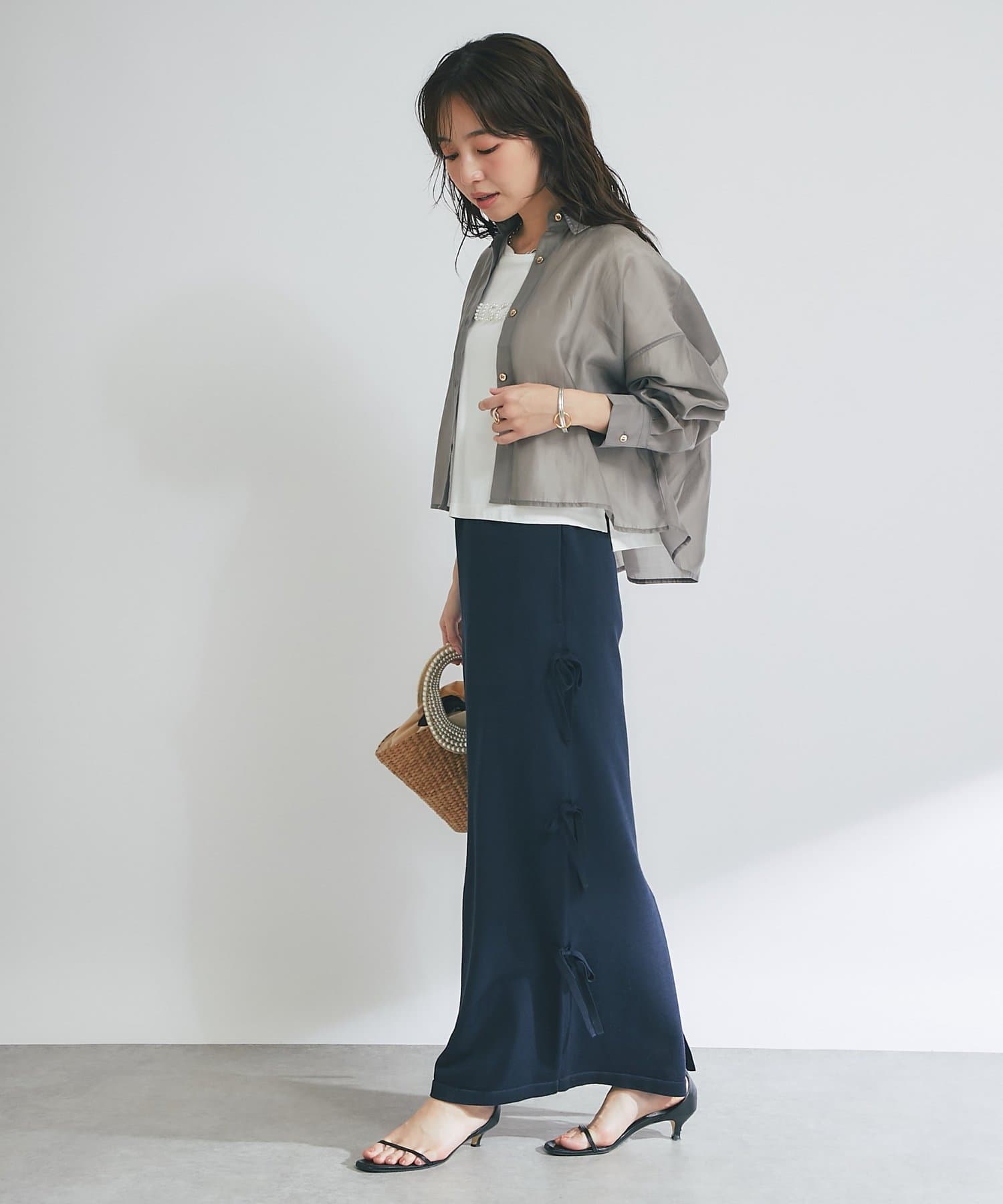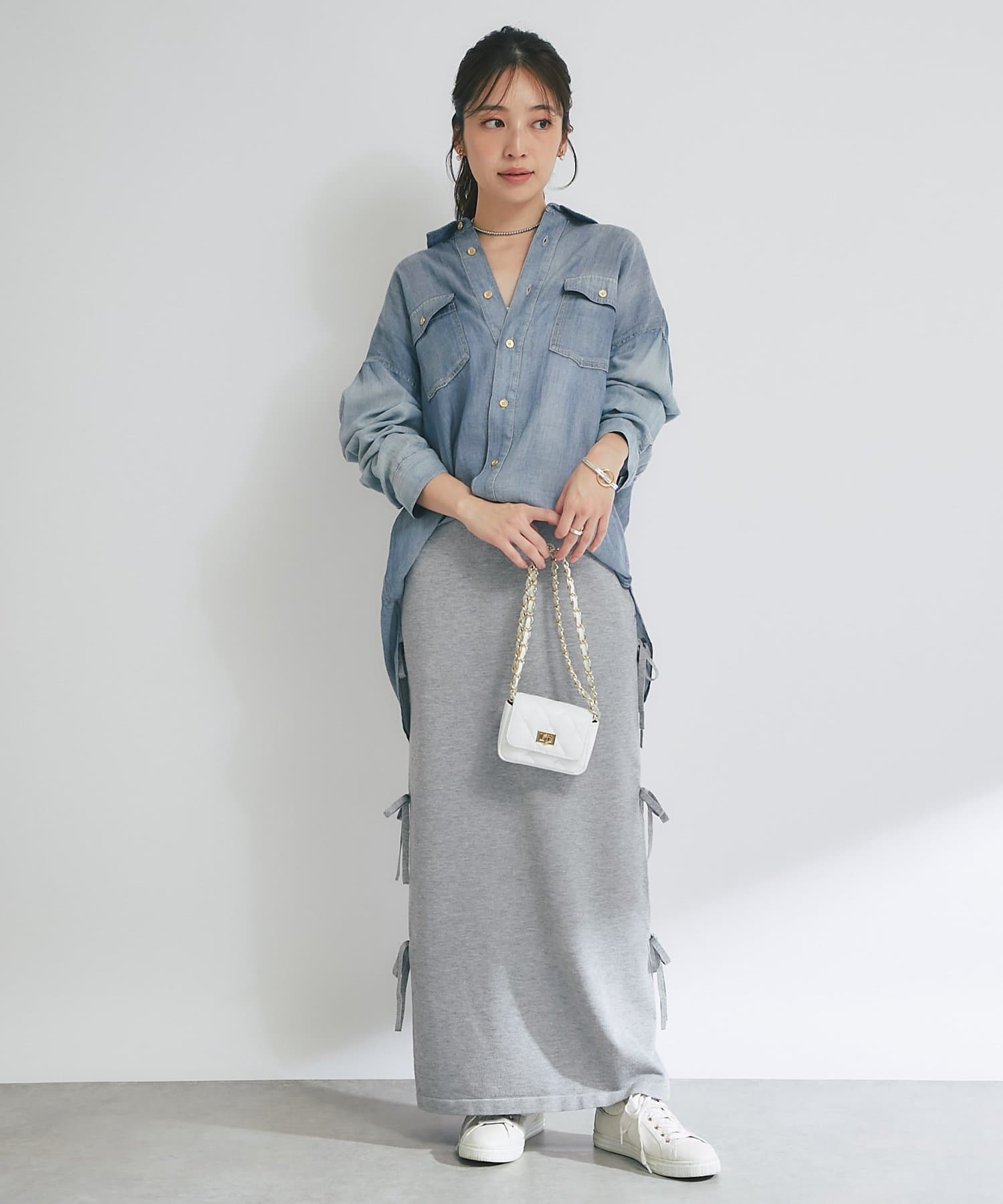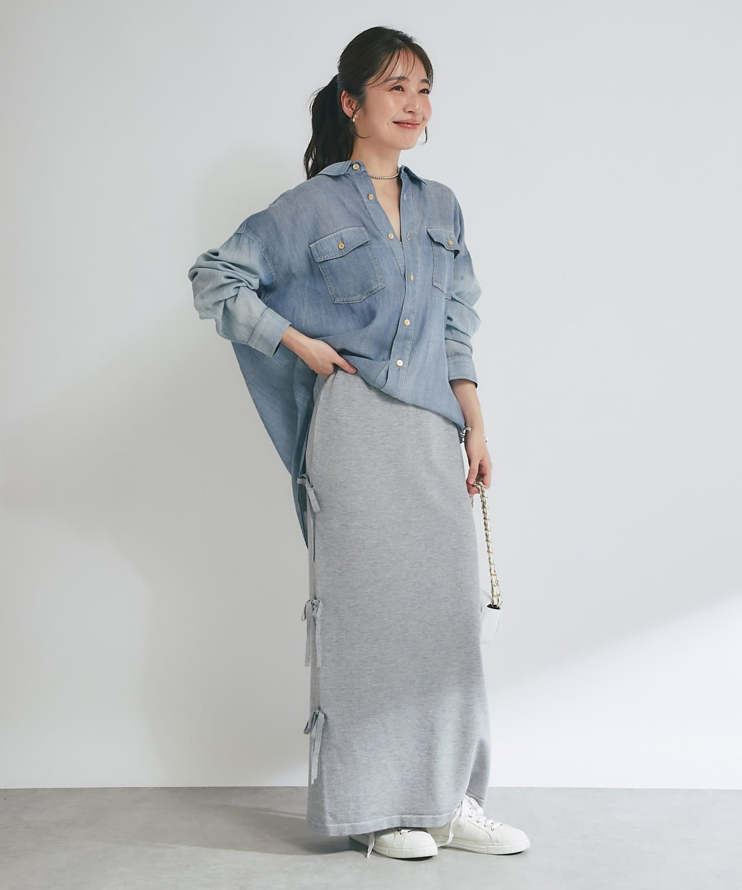 ブラウスやシャツと合わせて、きれいめなスタイリングも楽しめます。