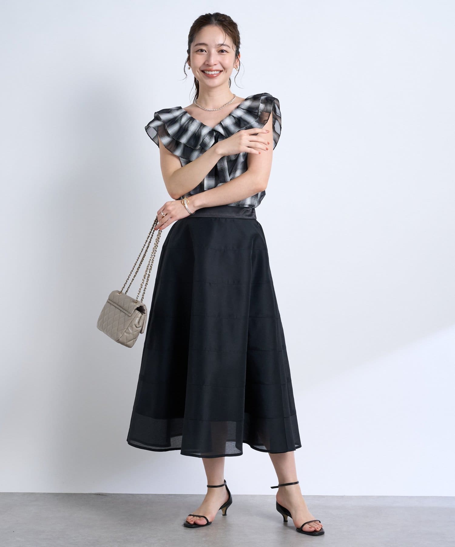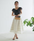 ティアードのような横切り替えの入ったデザインが立体感をプラスし、華やかに仕上げます。