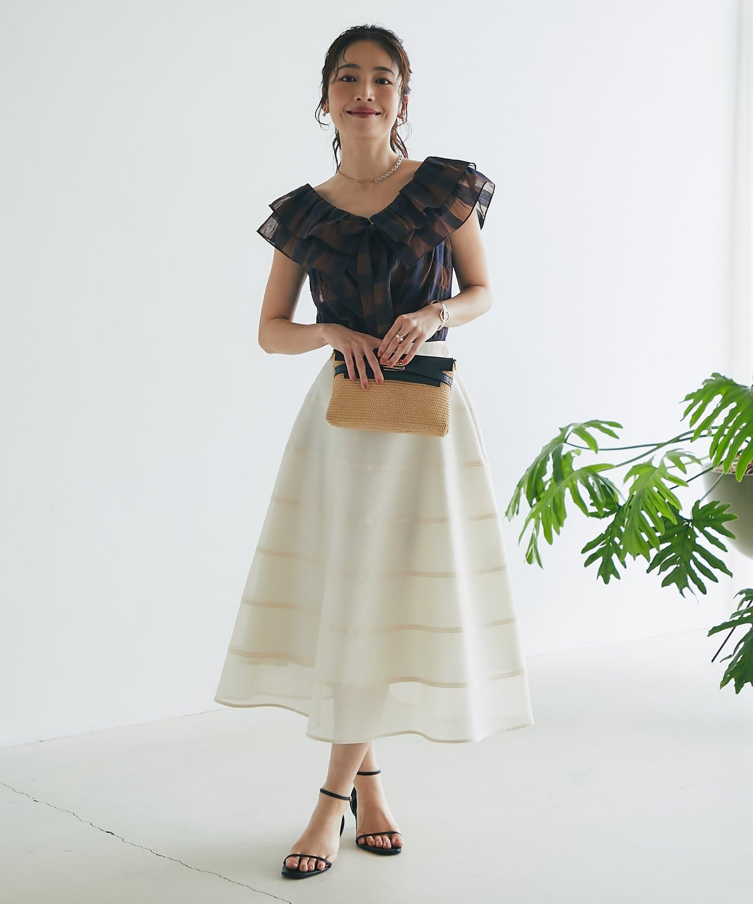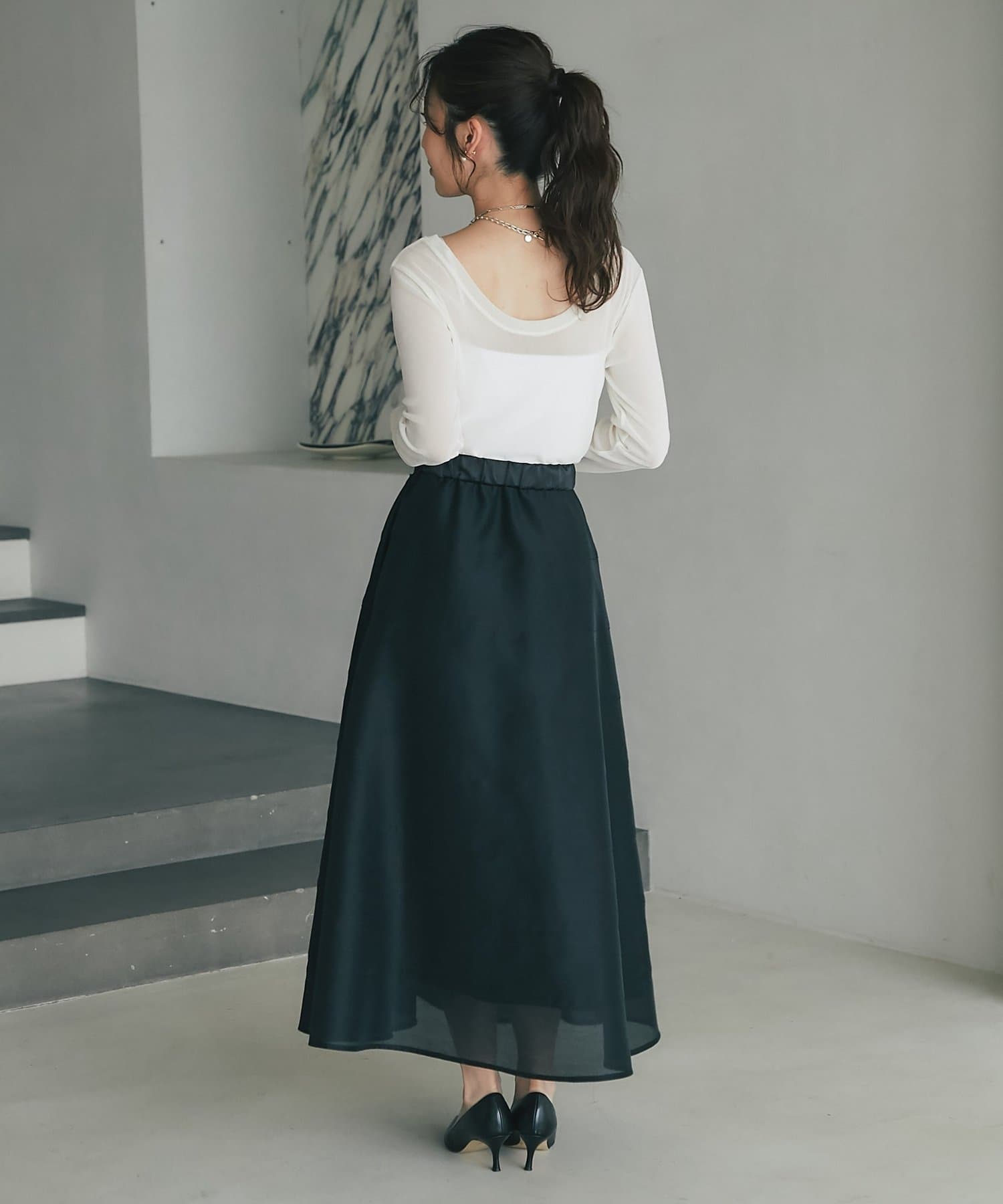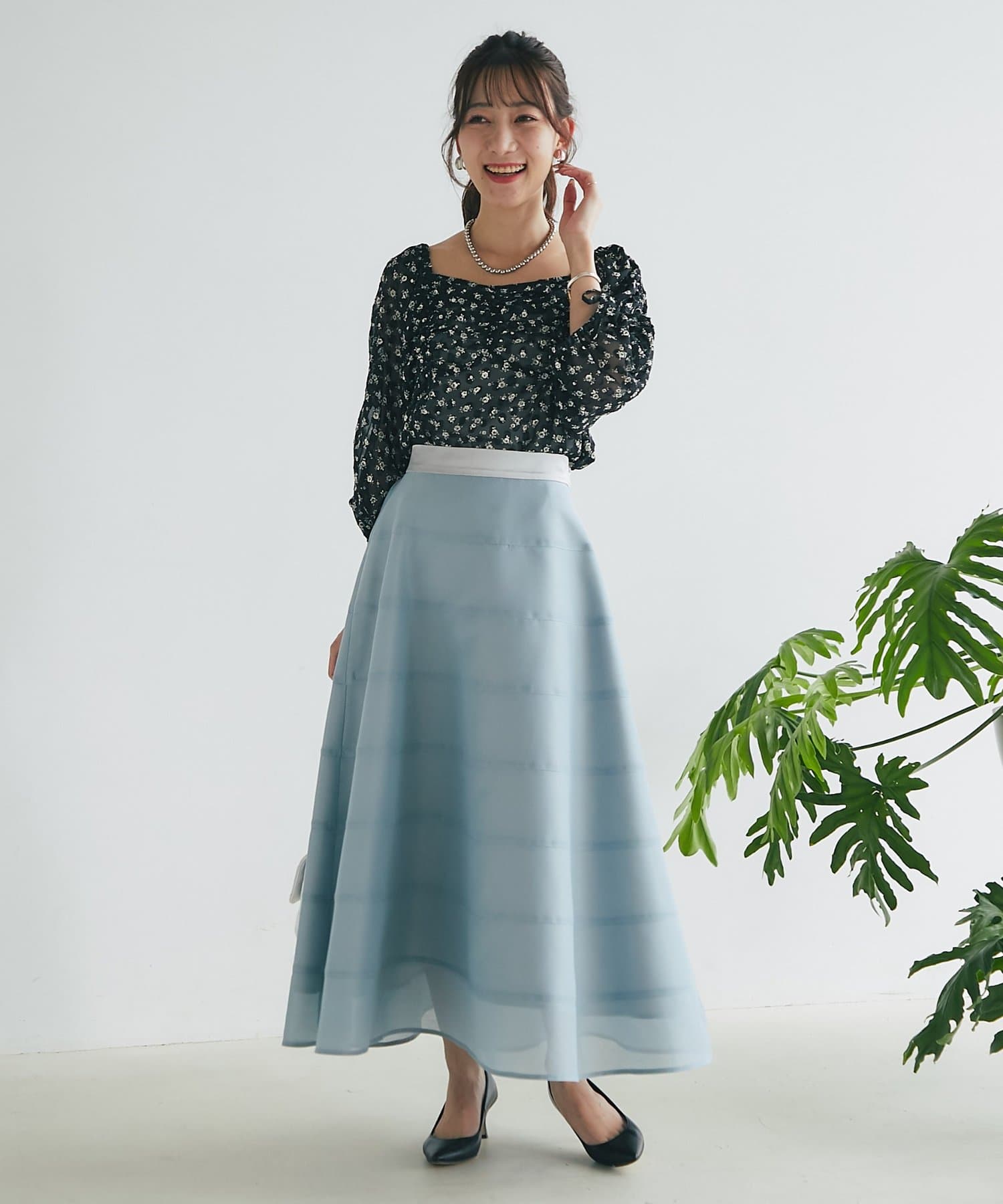 タイトなトップスと合わせて、スカートのふんわり感を引き立てる着こなしがおすすめ◎