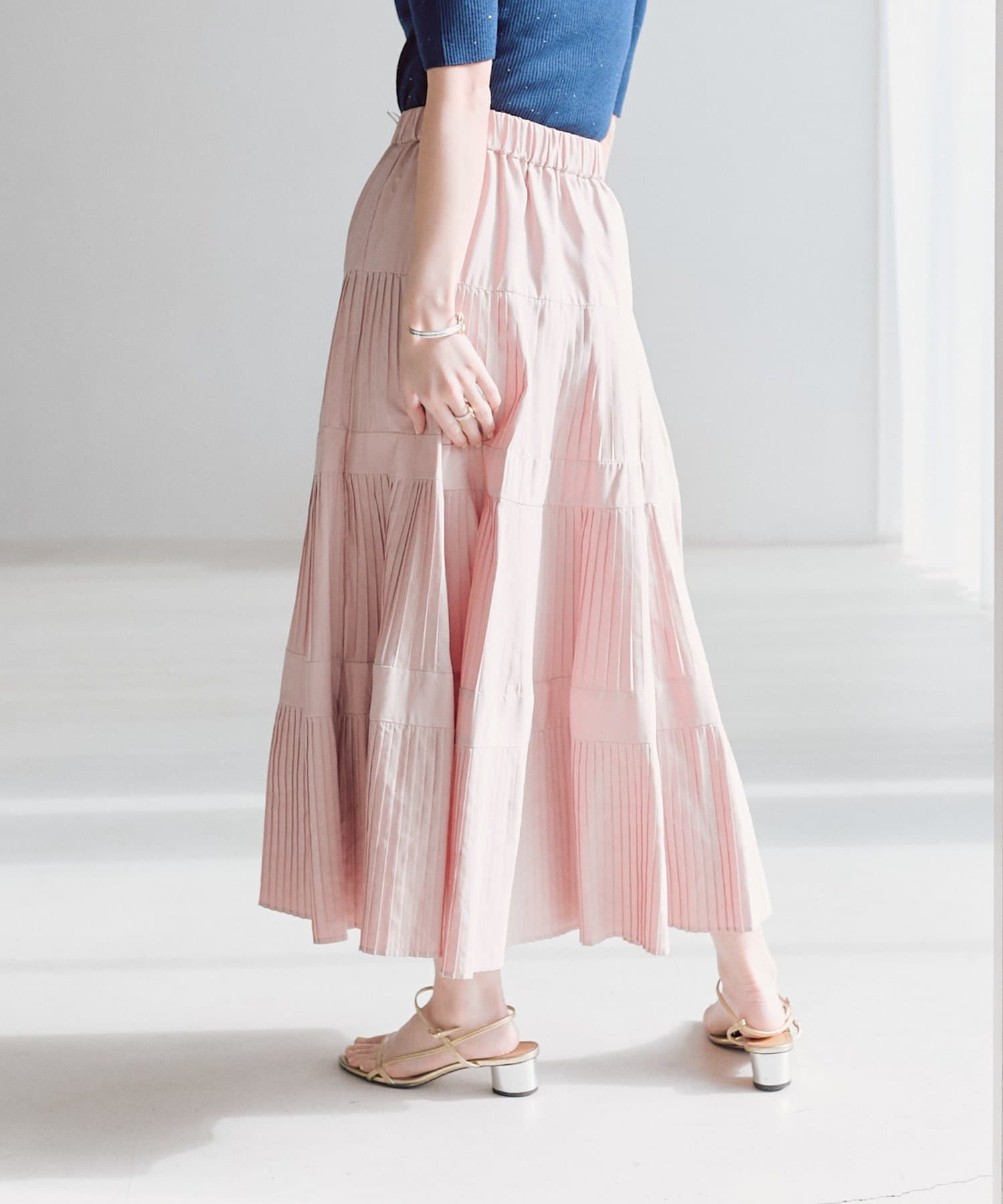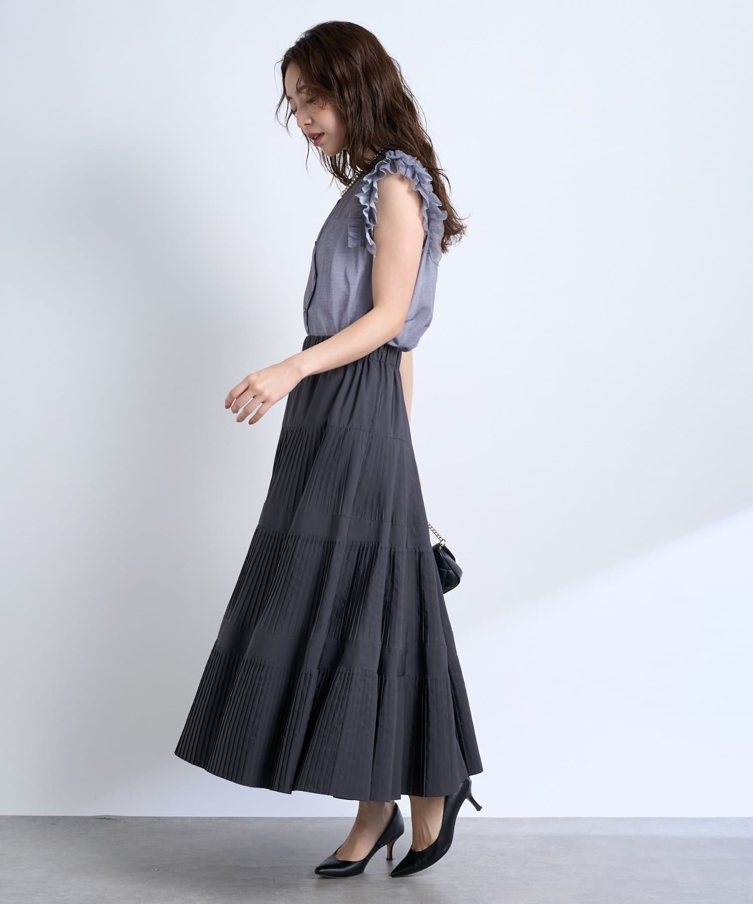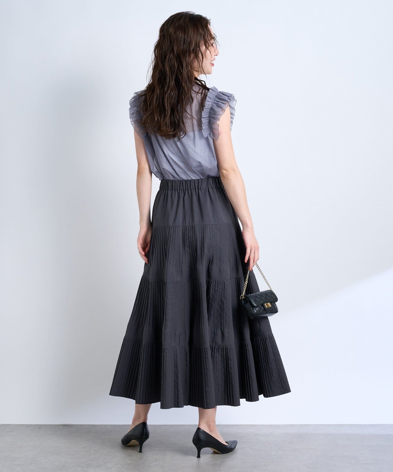 品とフェミニンさを併せ持つプリーツ×ティアードデザインのスカート。