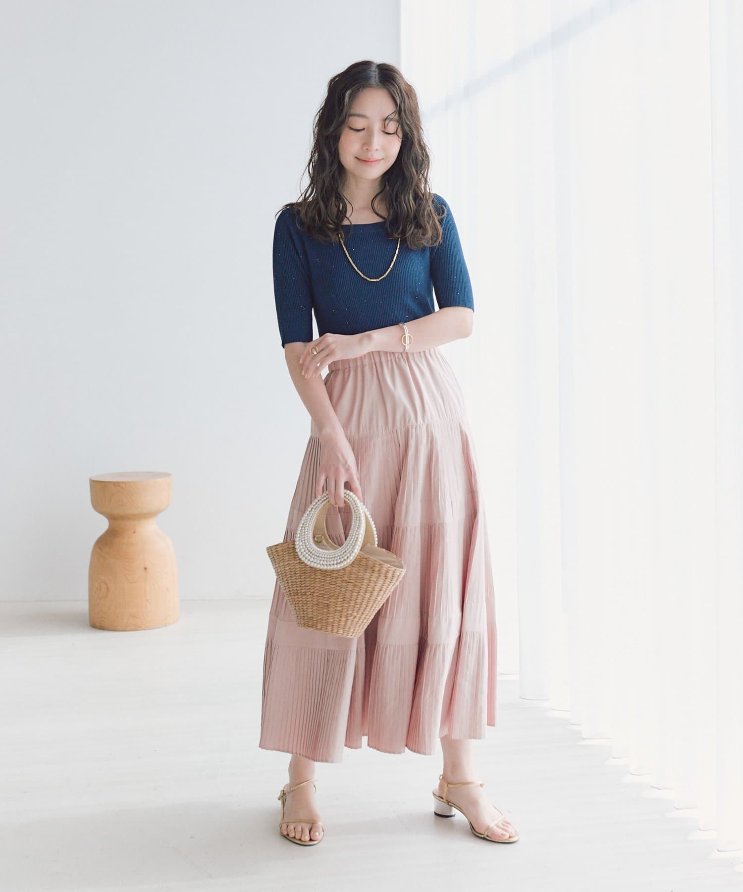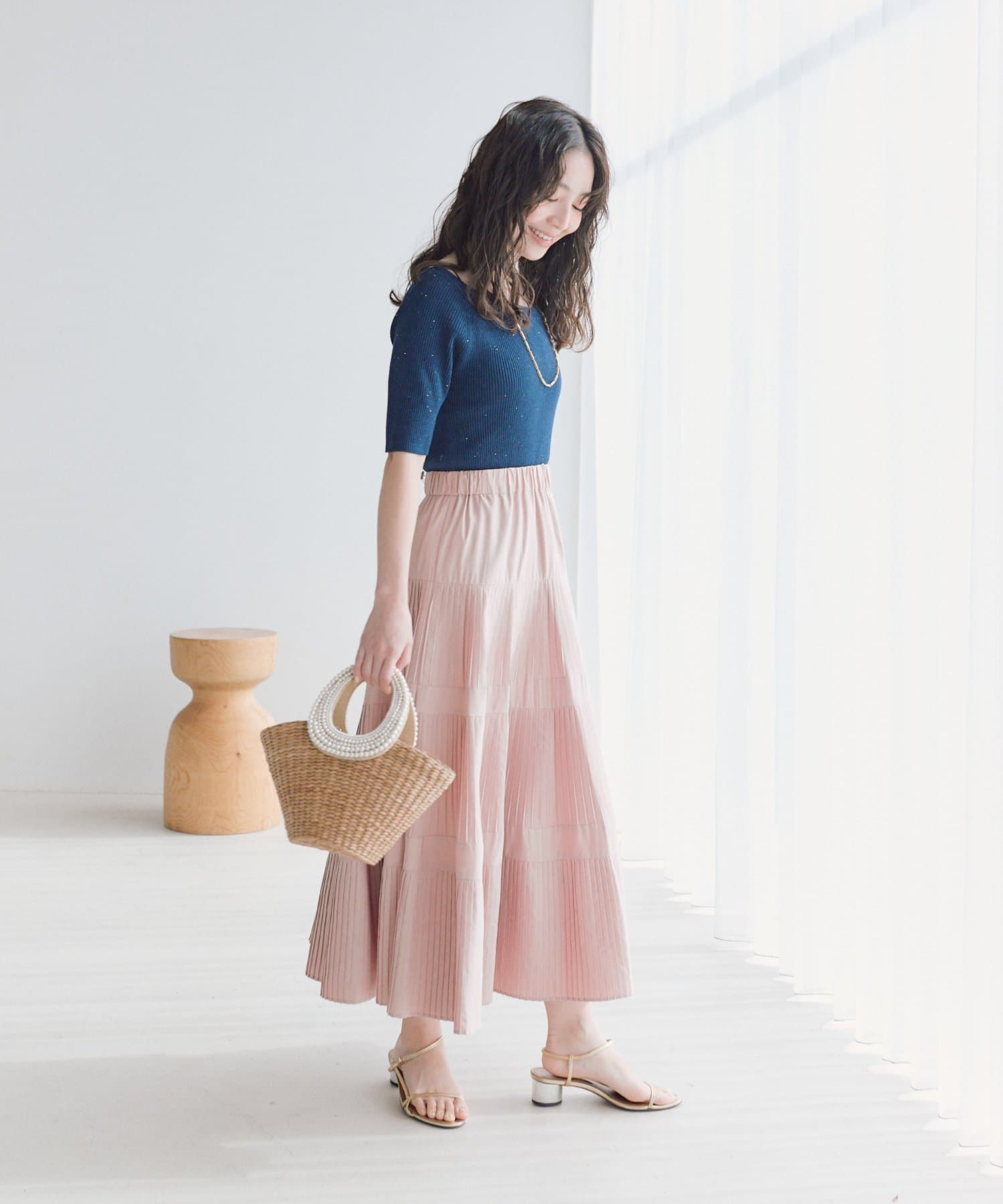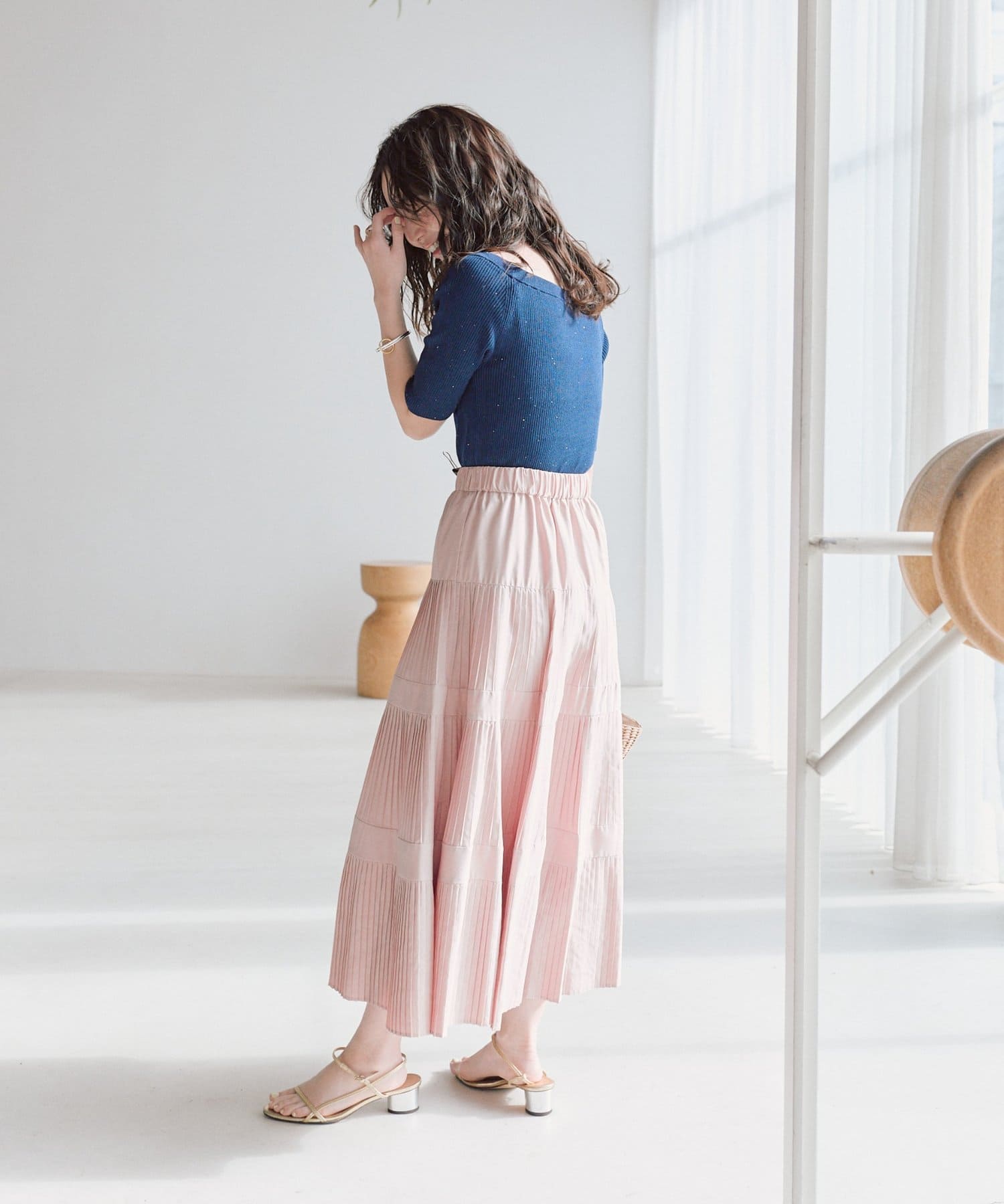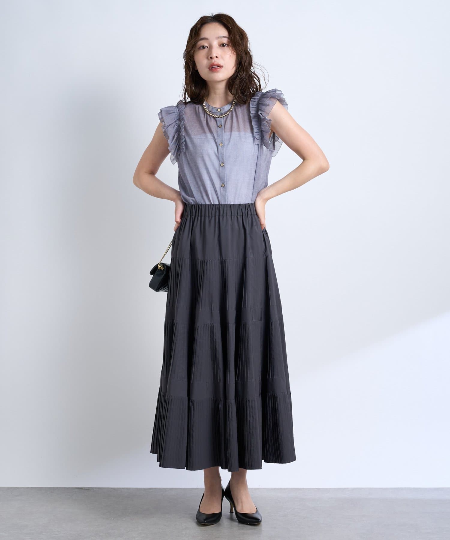品とフェミニンさを併せ持つプリーツ×ティアードデザインのスカート。