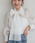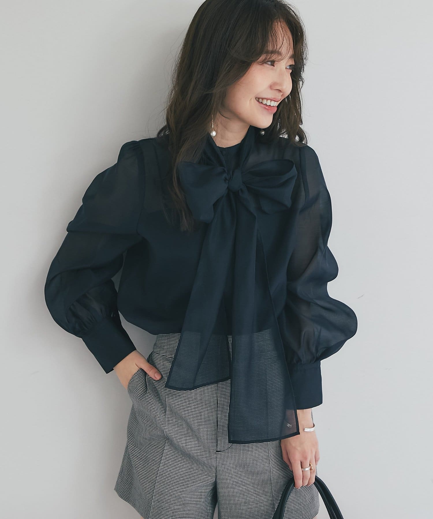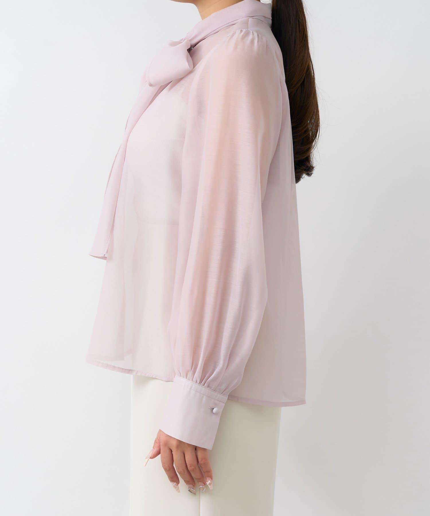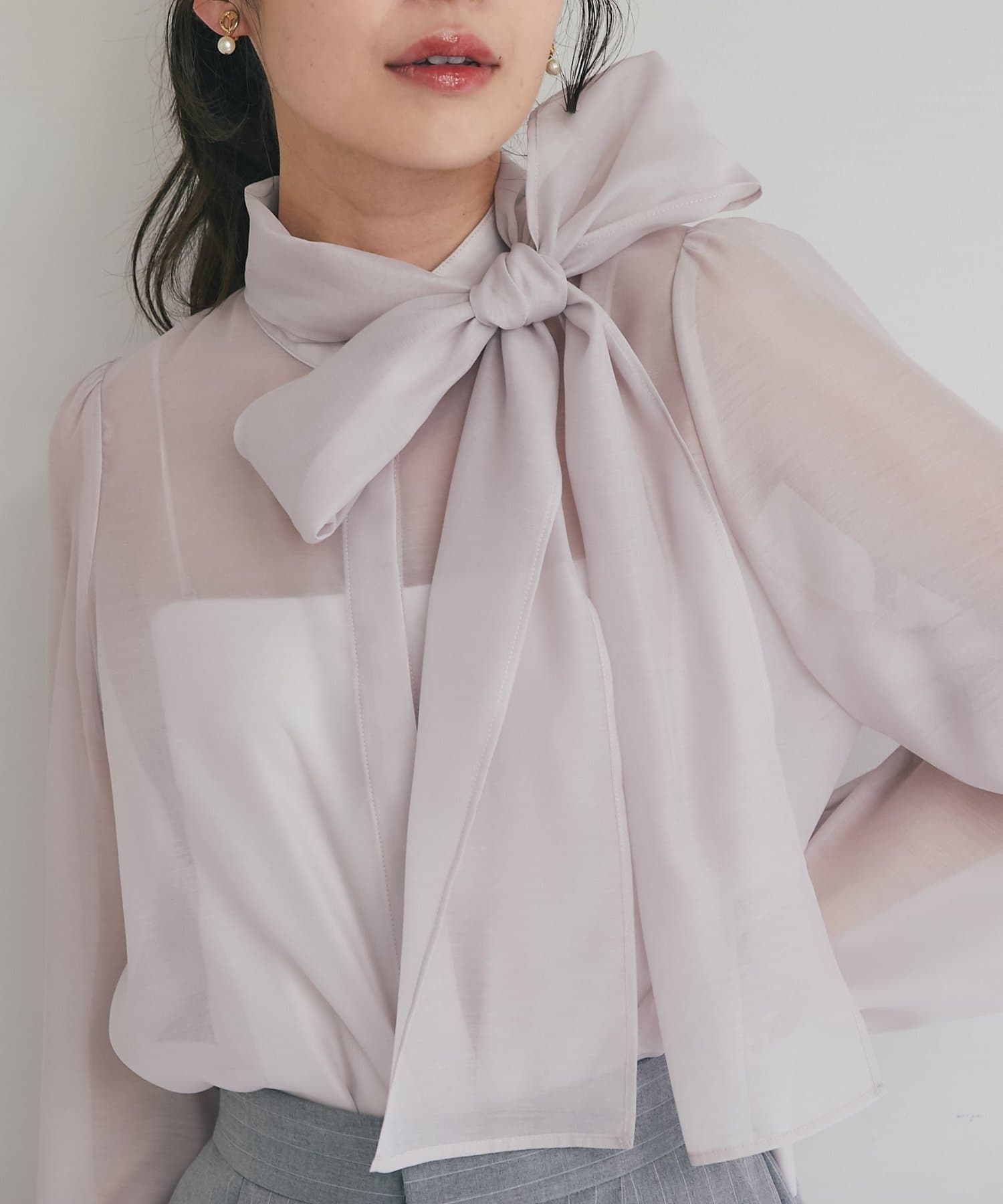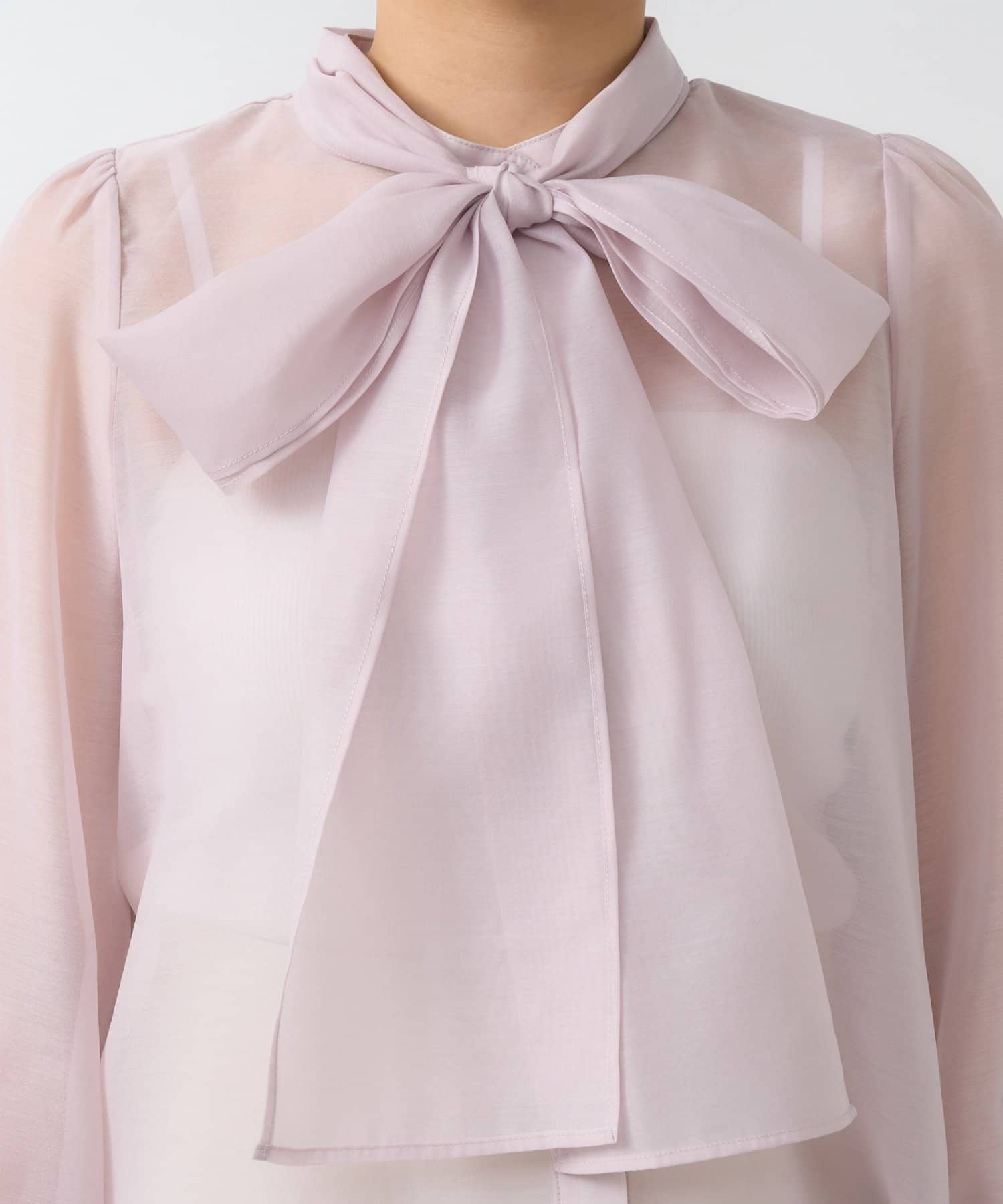 華やかさと上品さを兼ね備えた、ビッグボウタイデザインのシアーブラウス。