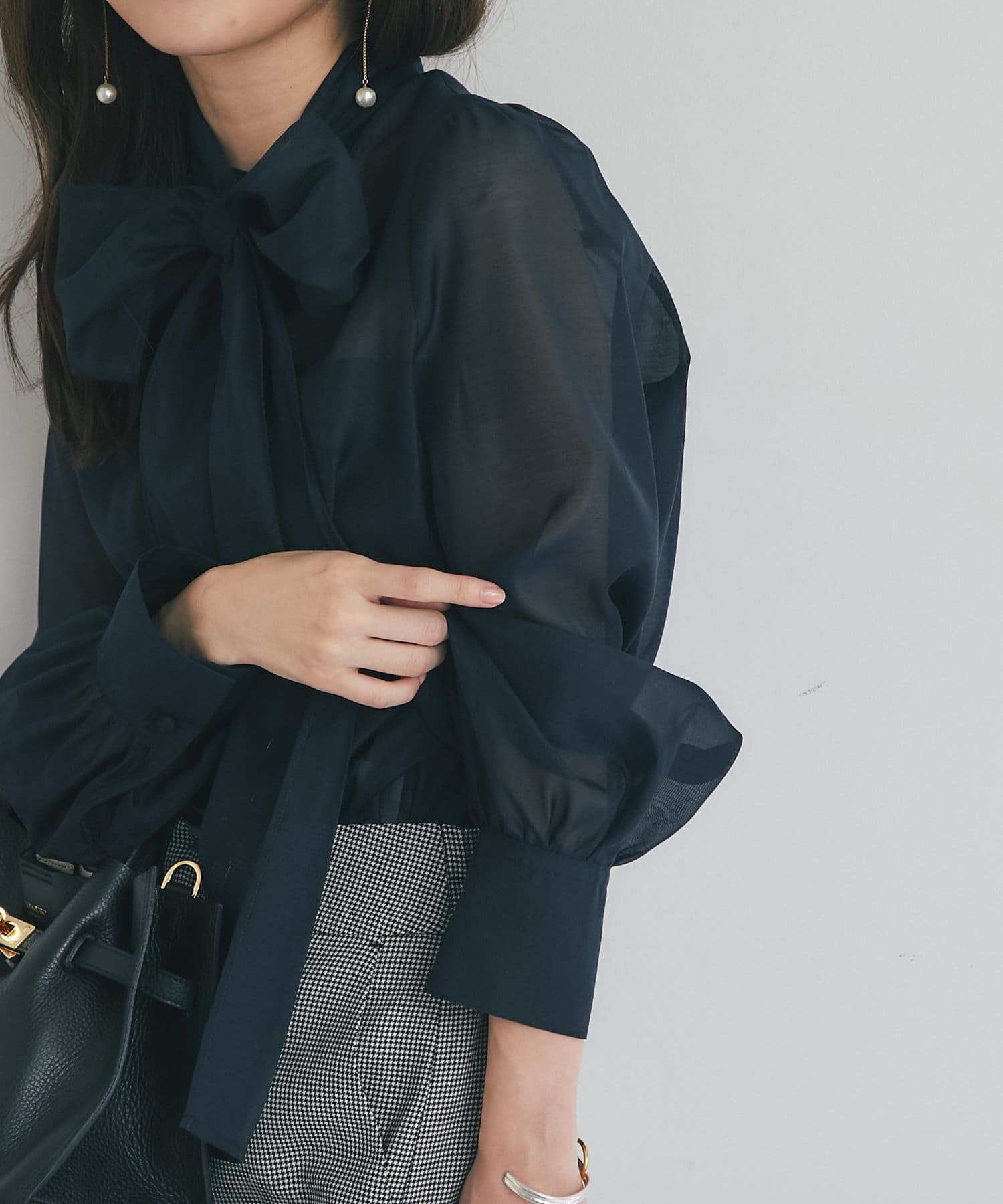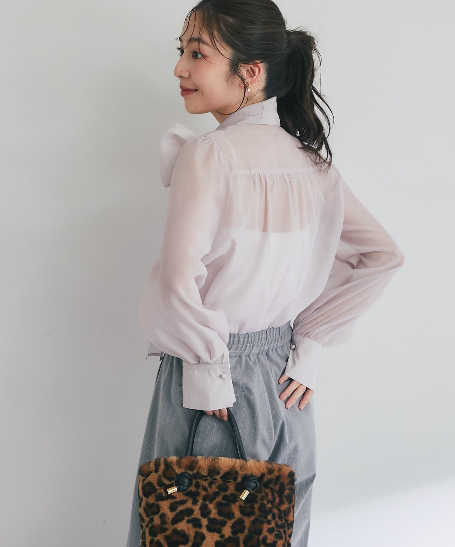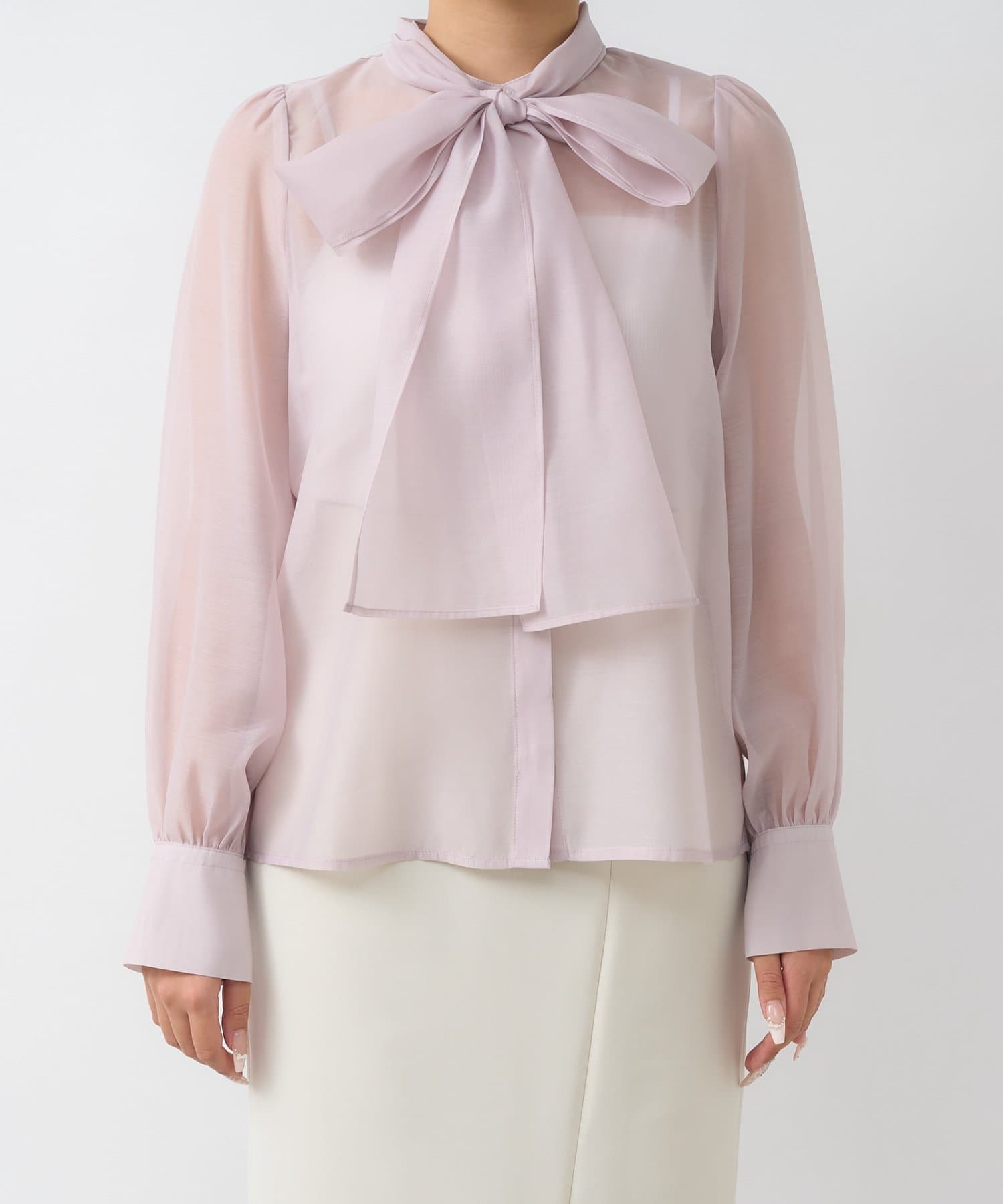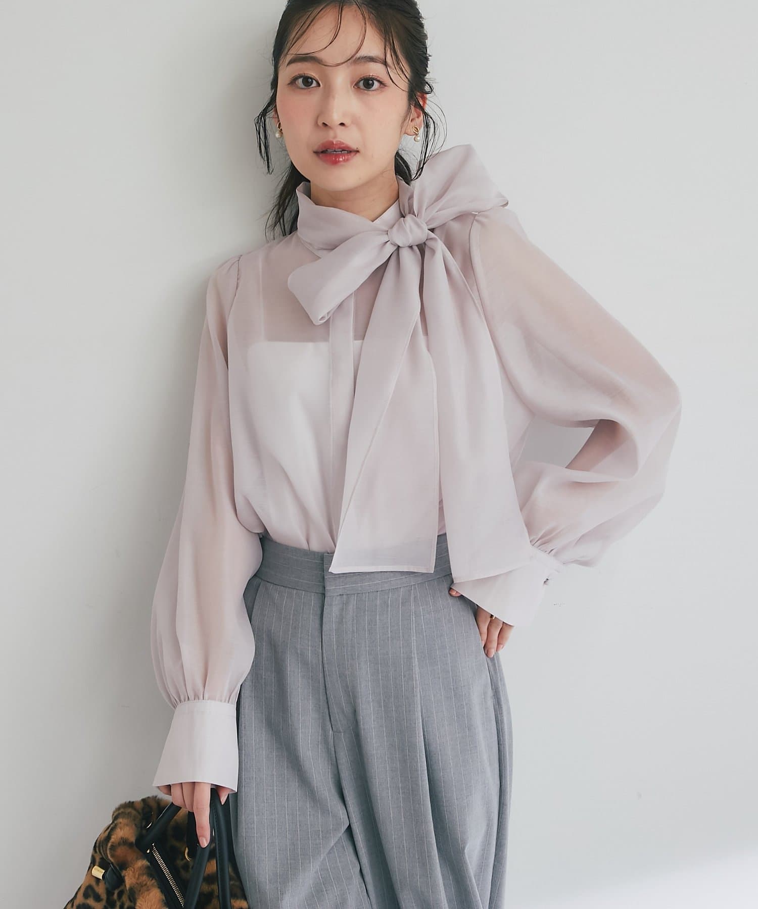 華やかさと上品さを兼ね備えた、ビッグボウタイデザインのシアーブラウス。