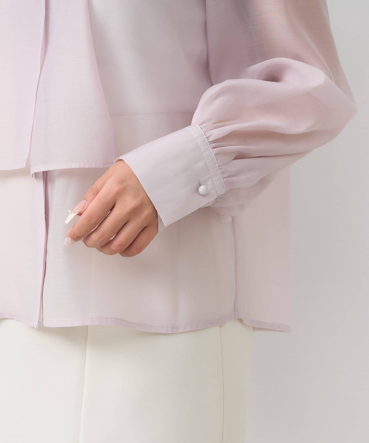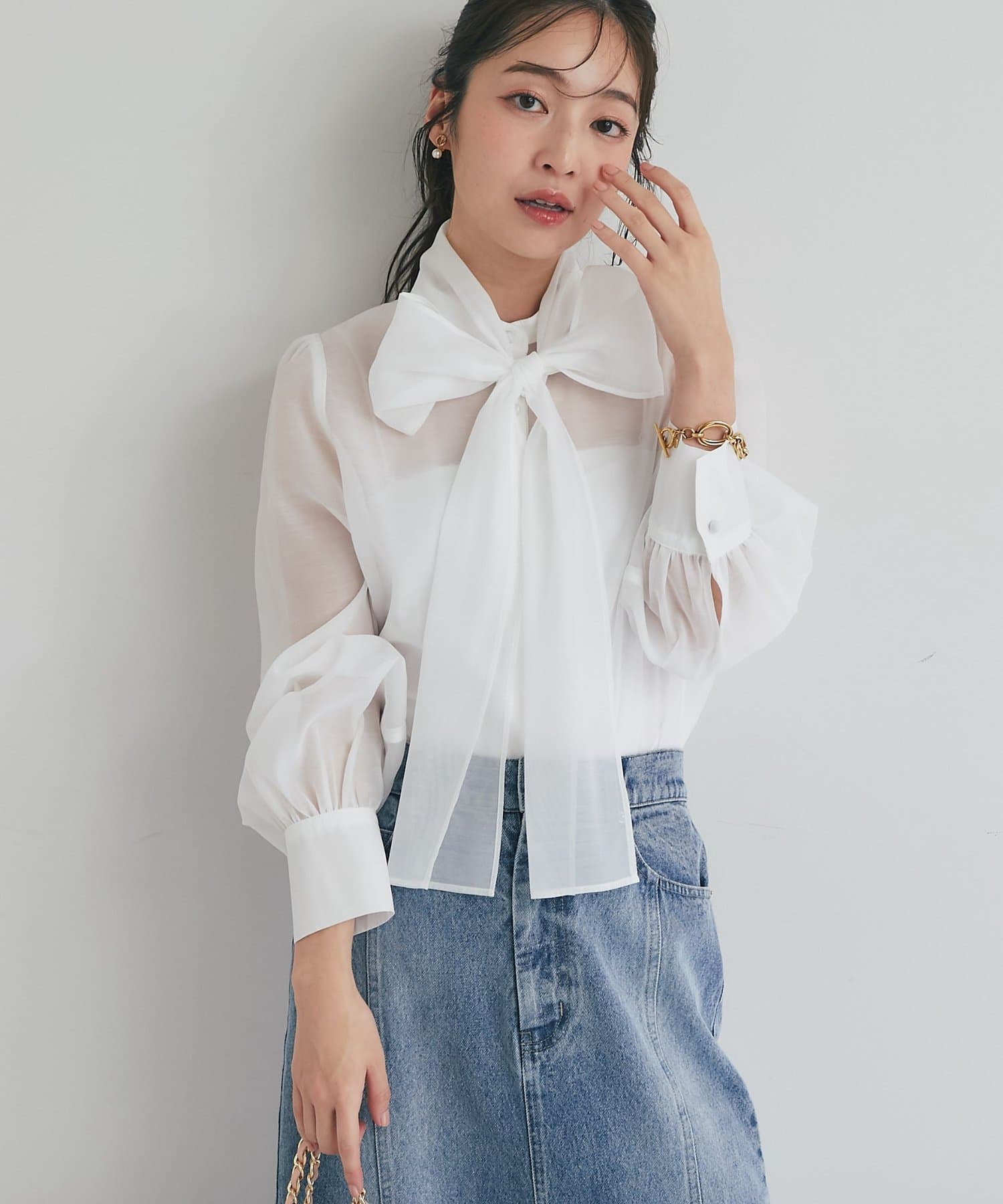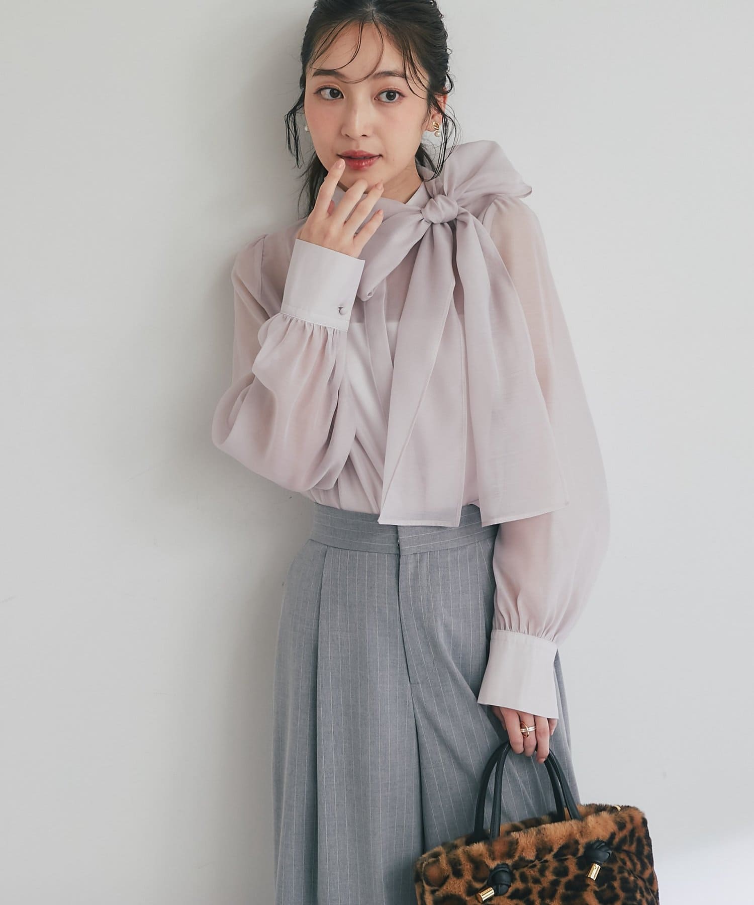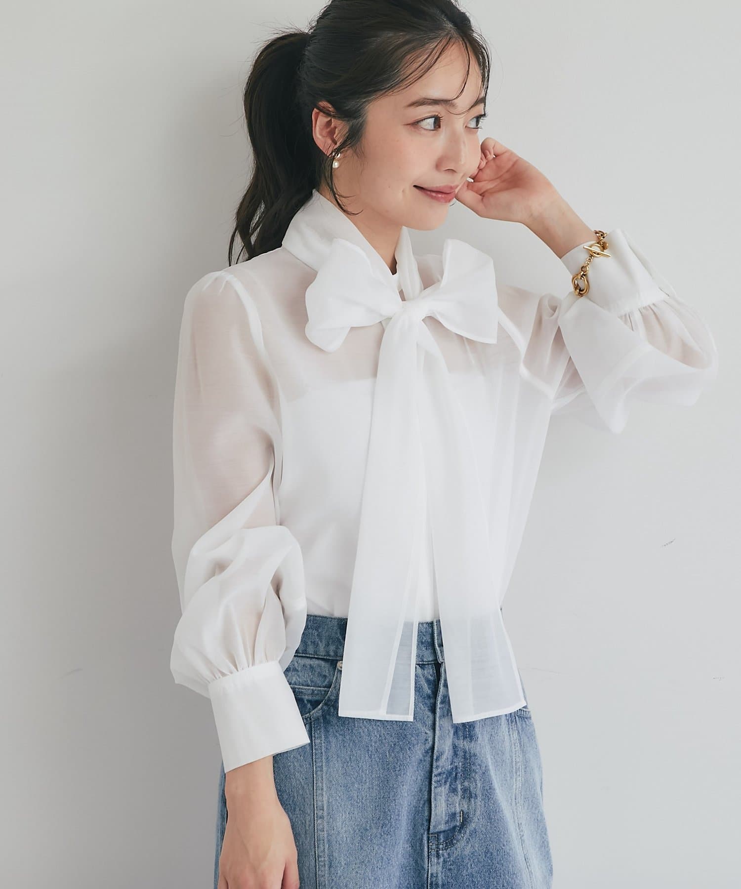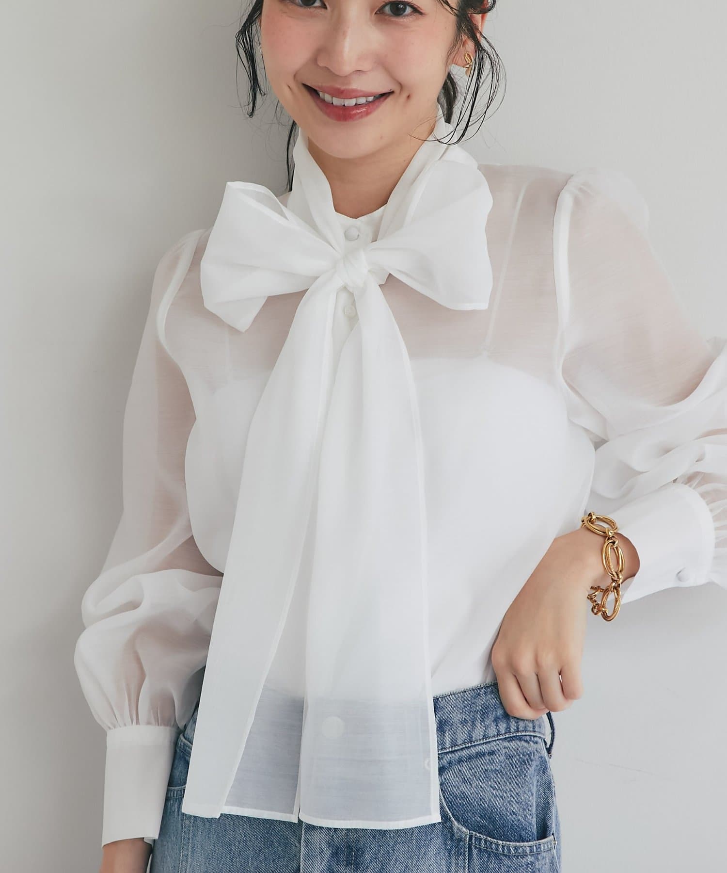 華やかさと上品さを兼ね備えた、ビッグボウタイデザインのシアーブラウス。