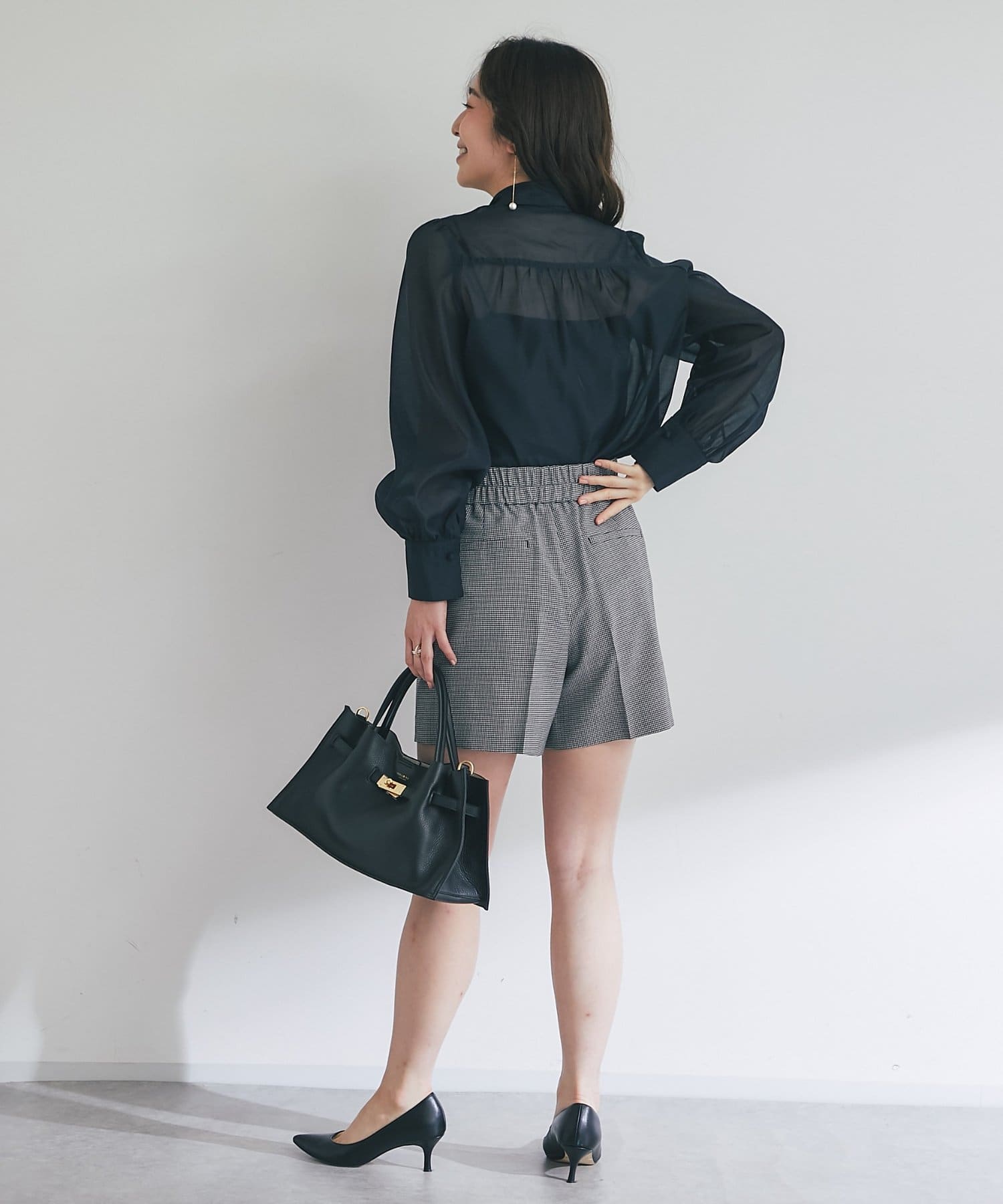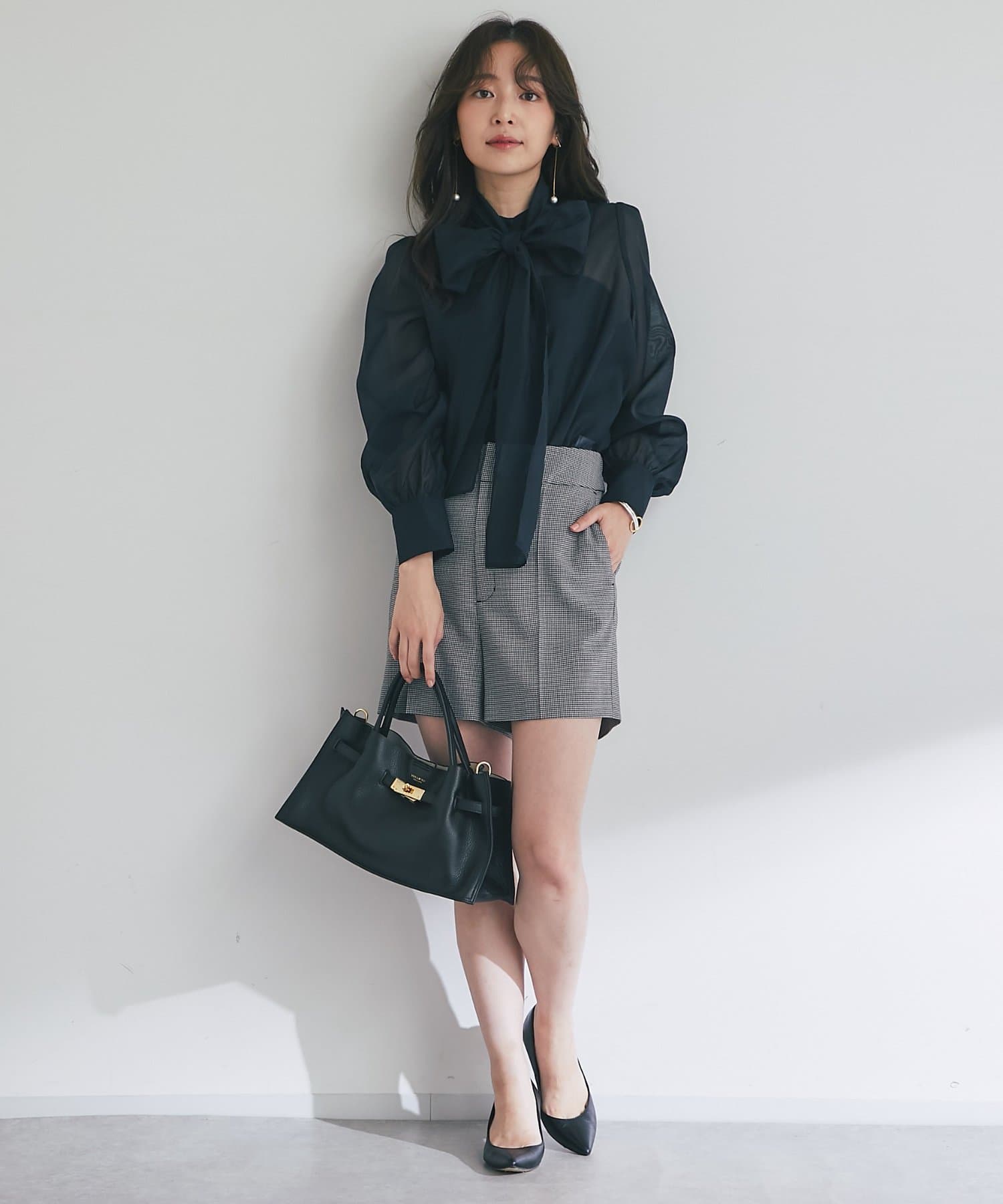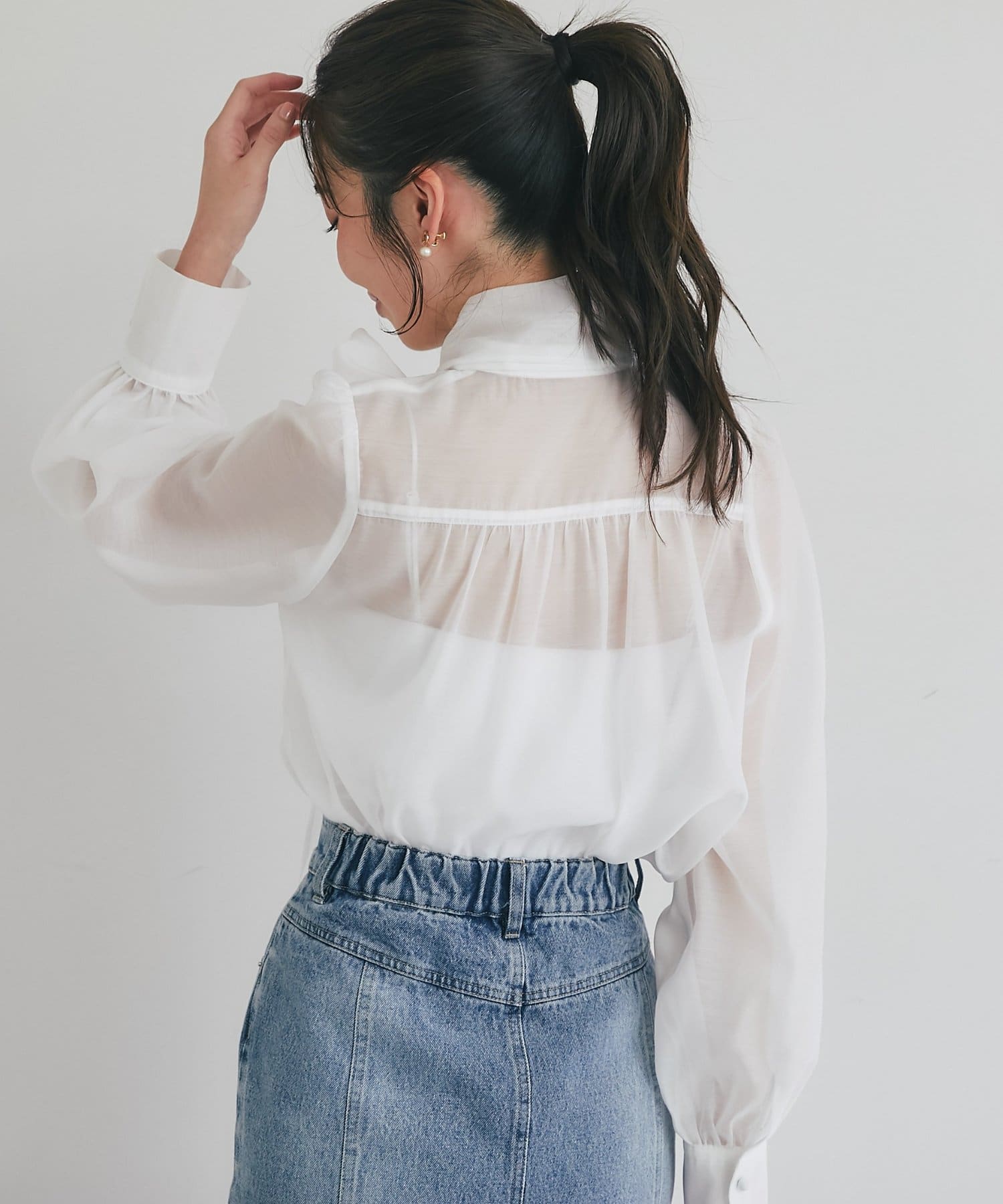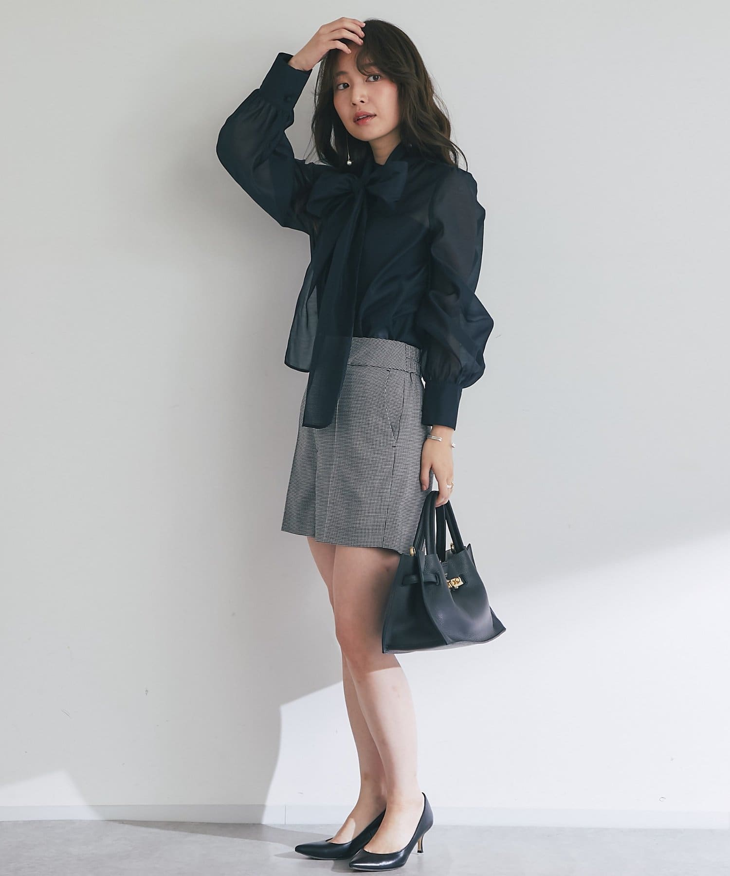 華やかさと上品さを兼ね備えた、ビッグボウタイデザインのシアーブラウス。