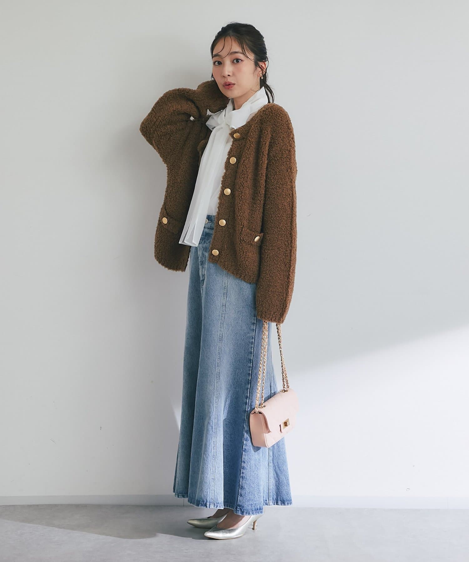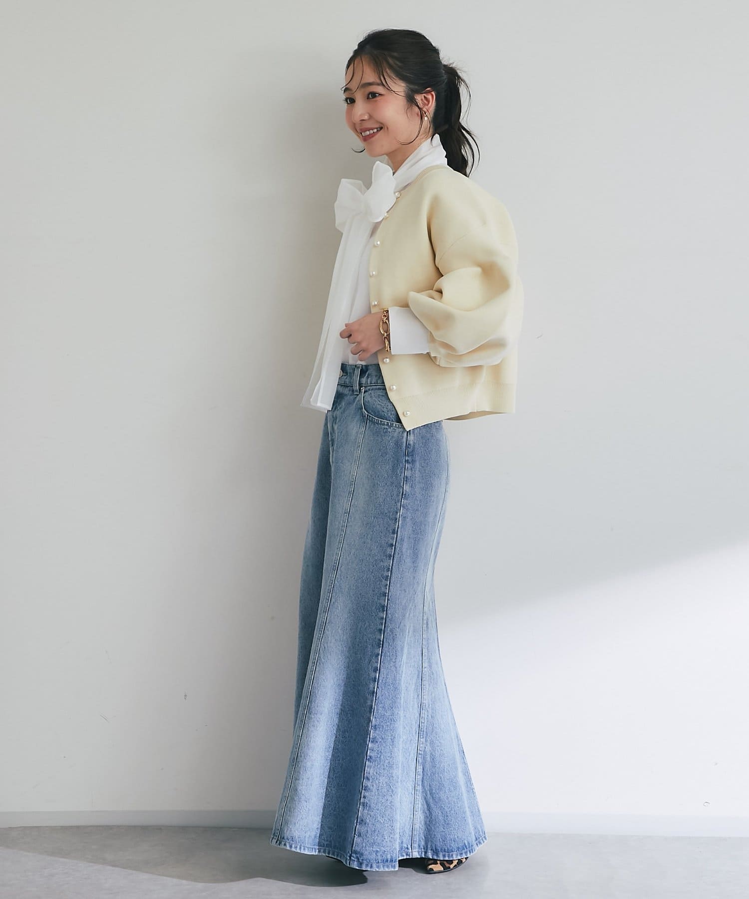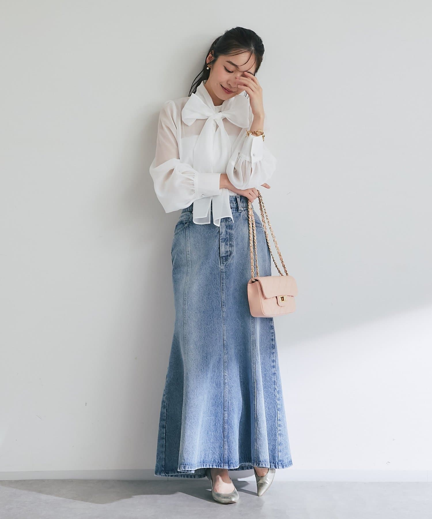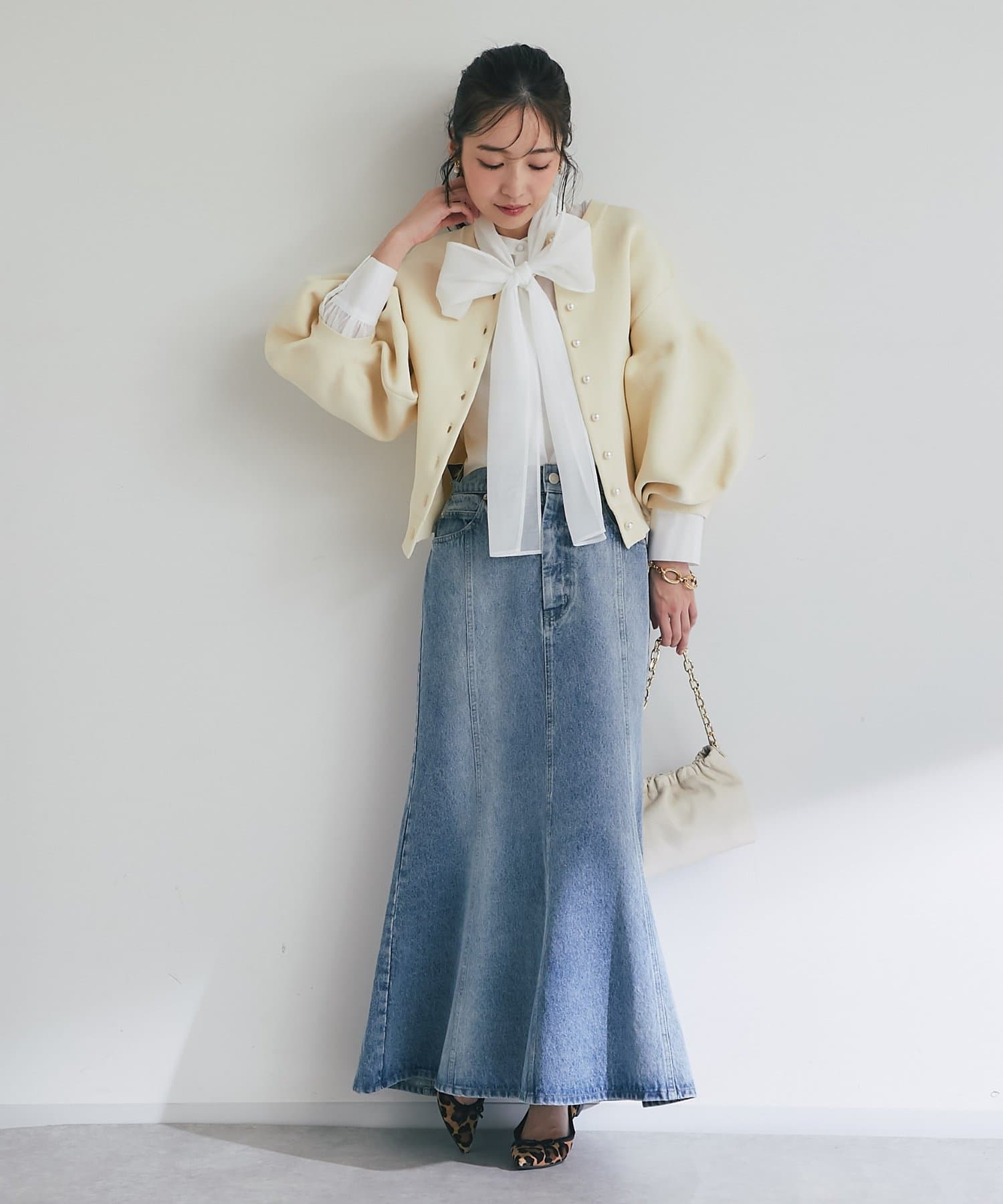 カジュアルなワイドデニムを合わせると、甘辛ミックスの旬なスタイルが楽しめます。