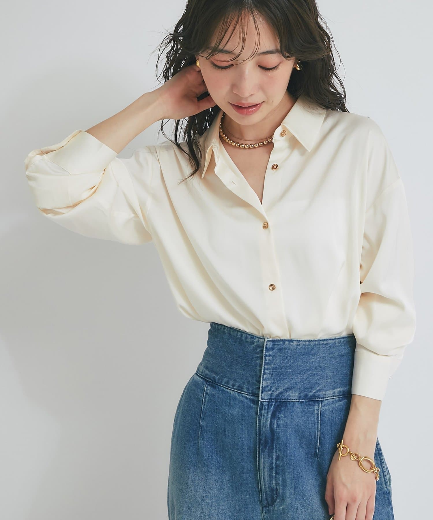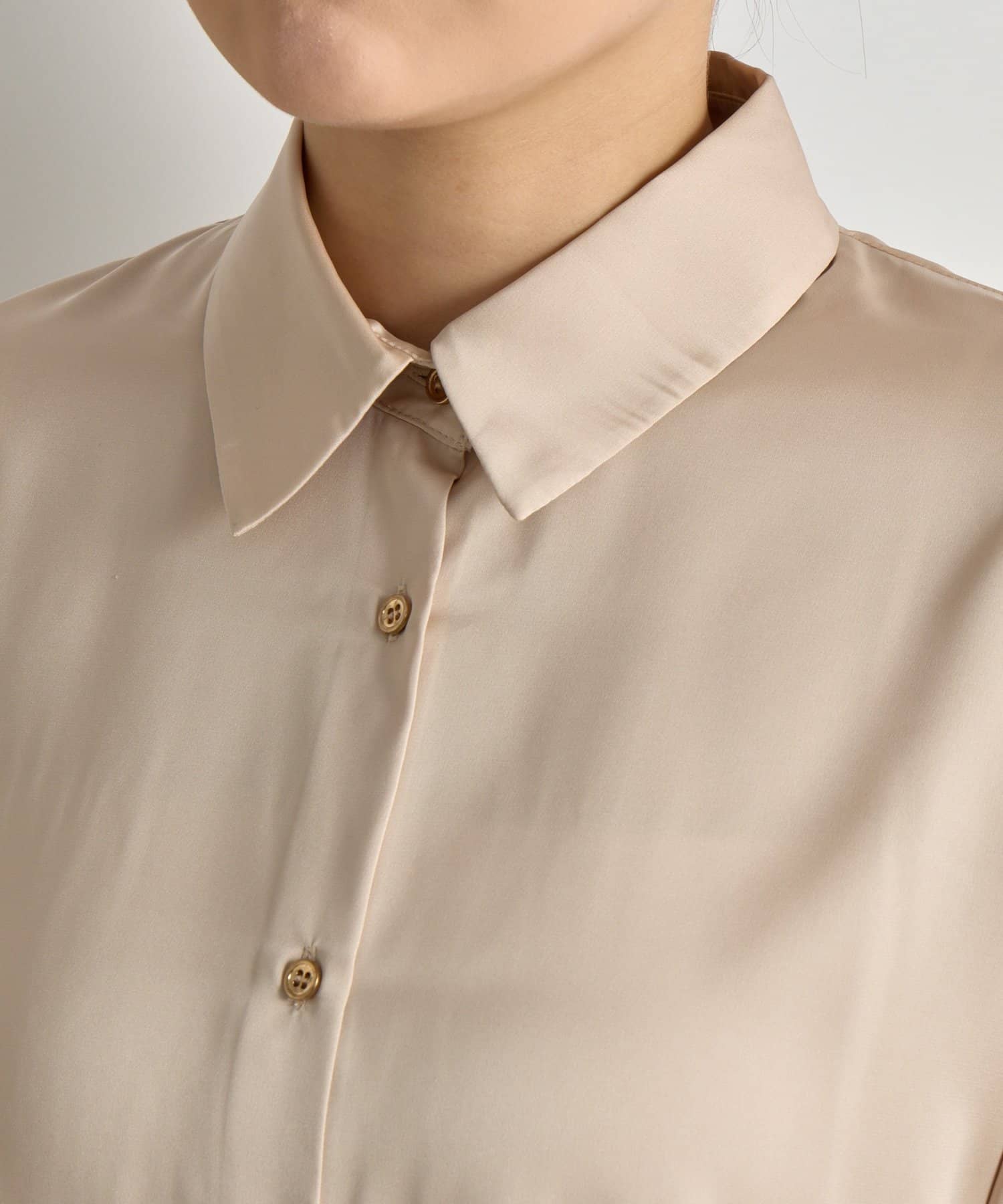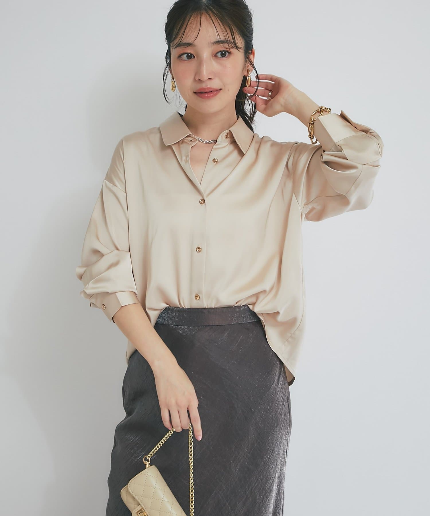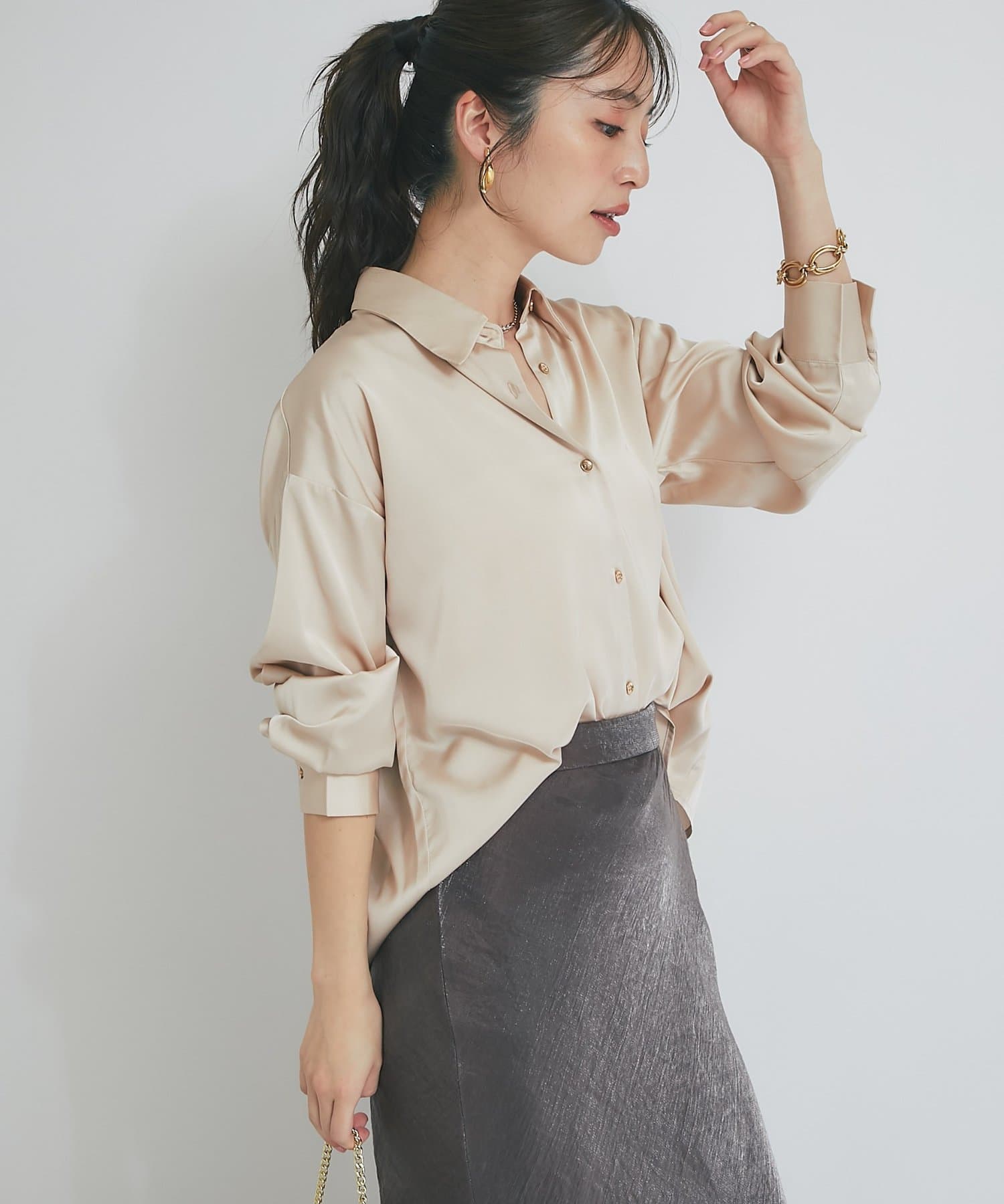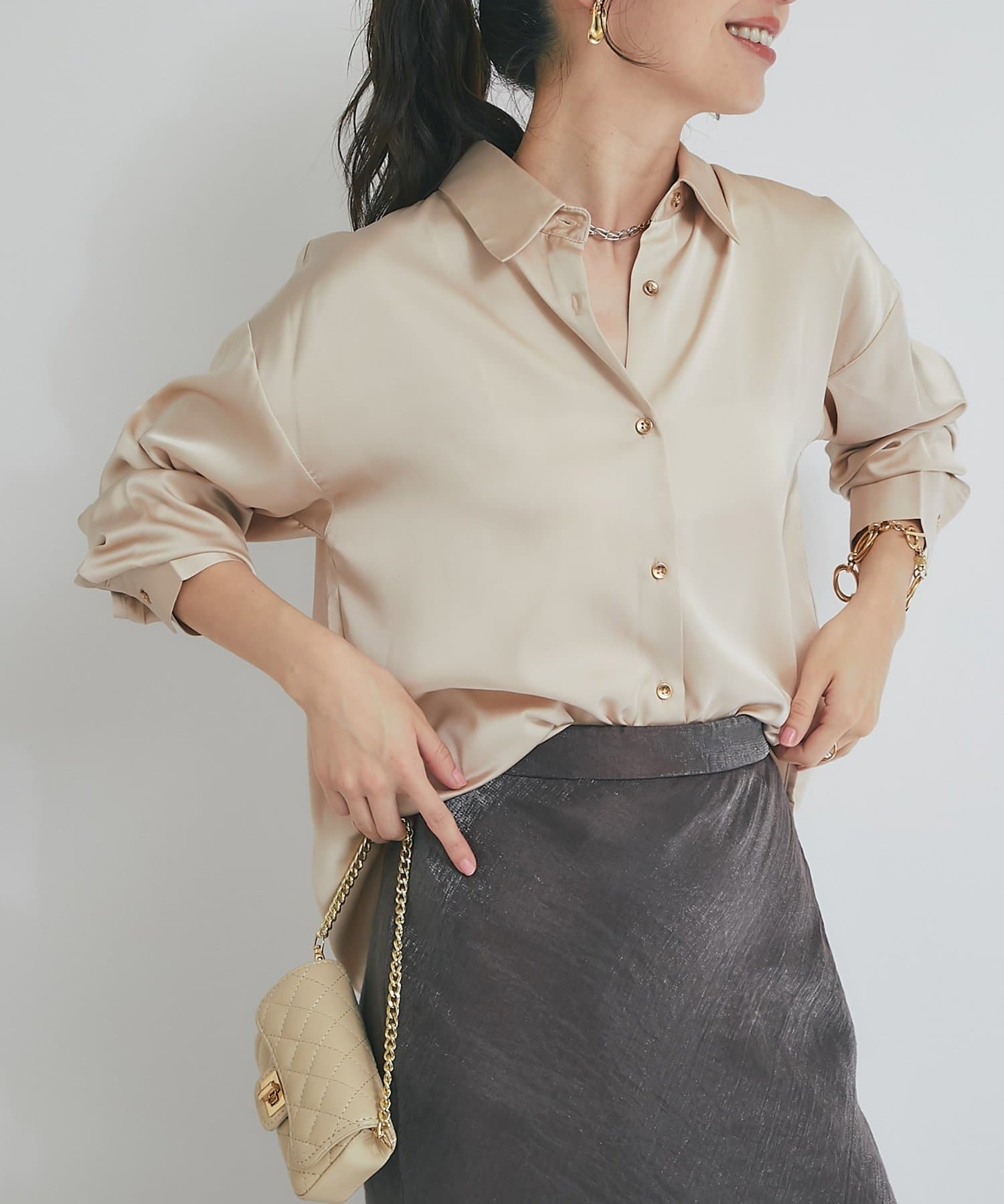 女性らしい艶感と落ち感が魅力の、上品見えするサテンシャツ。