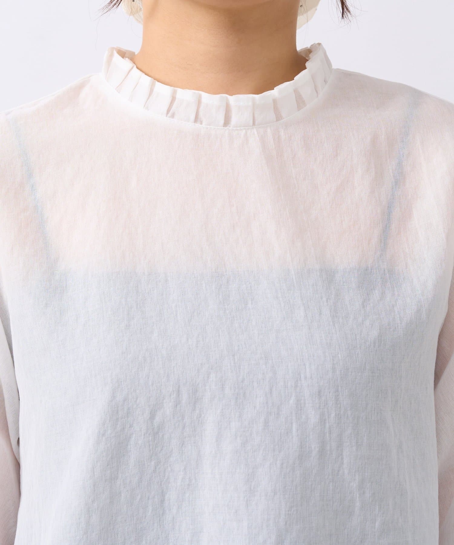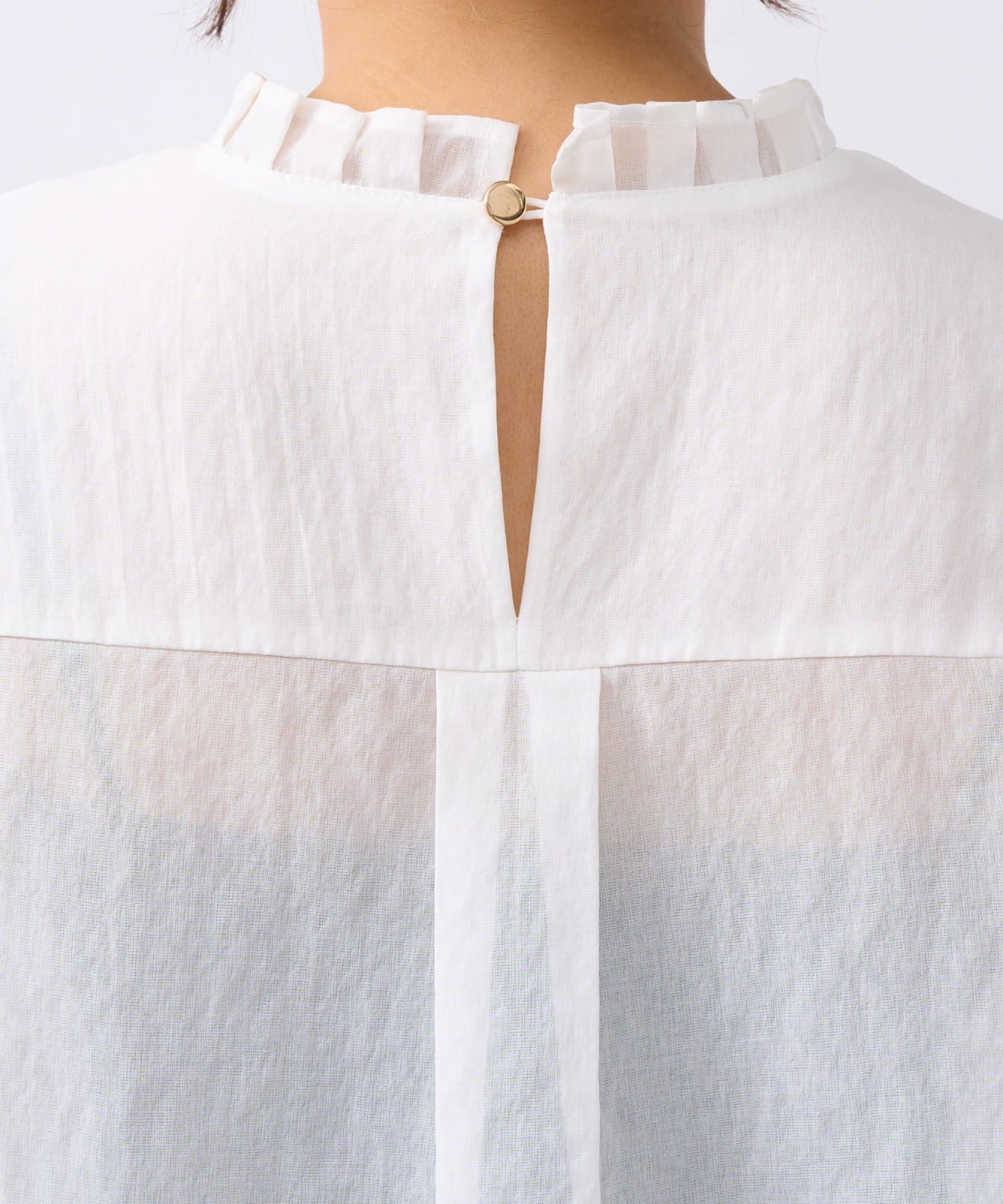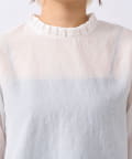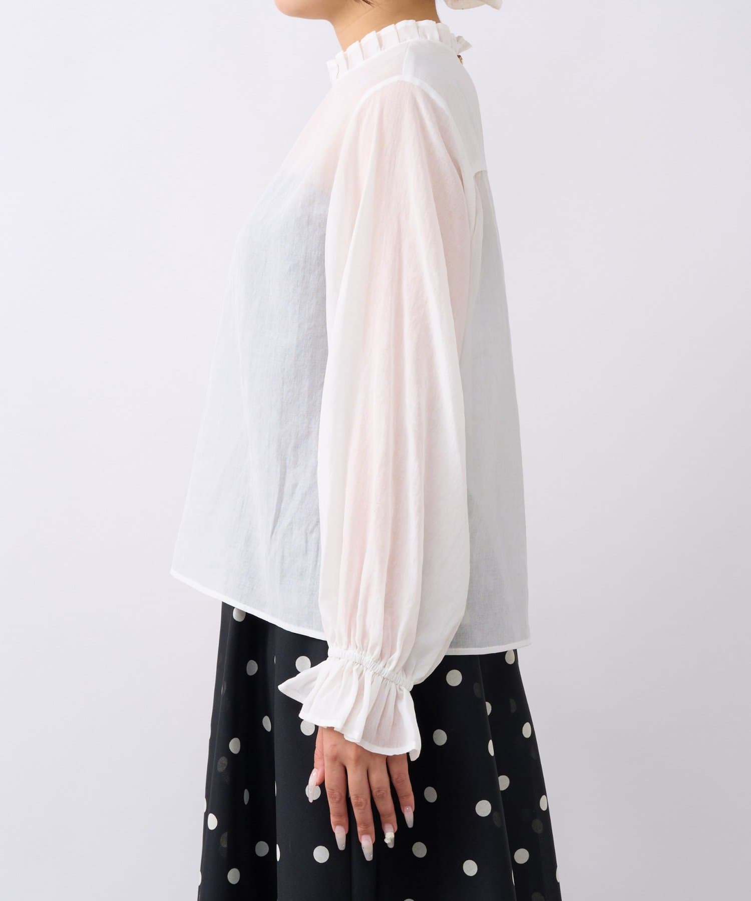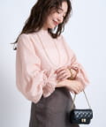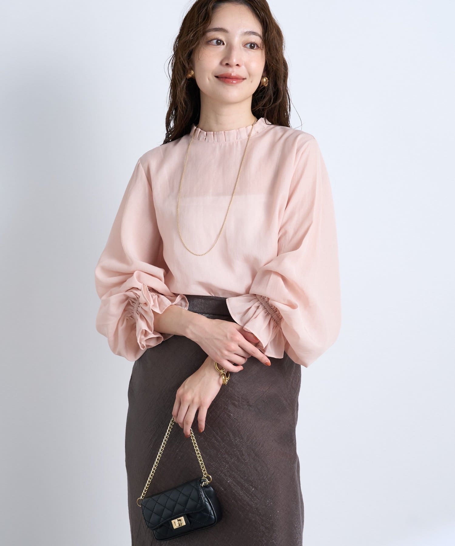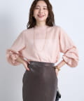 首元のギャザーが目を引く、1枚で着映えするフェミニンなブラウス。