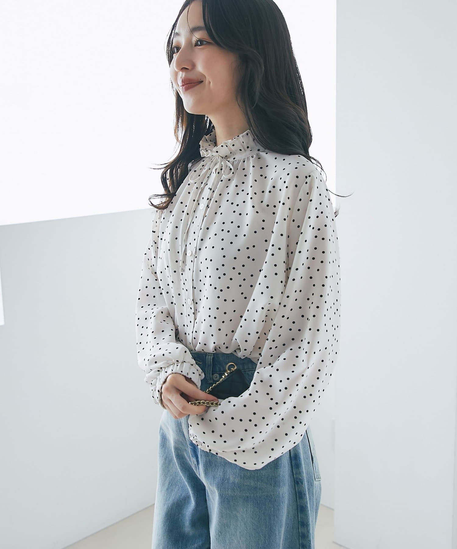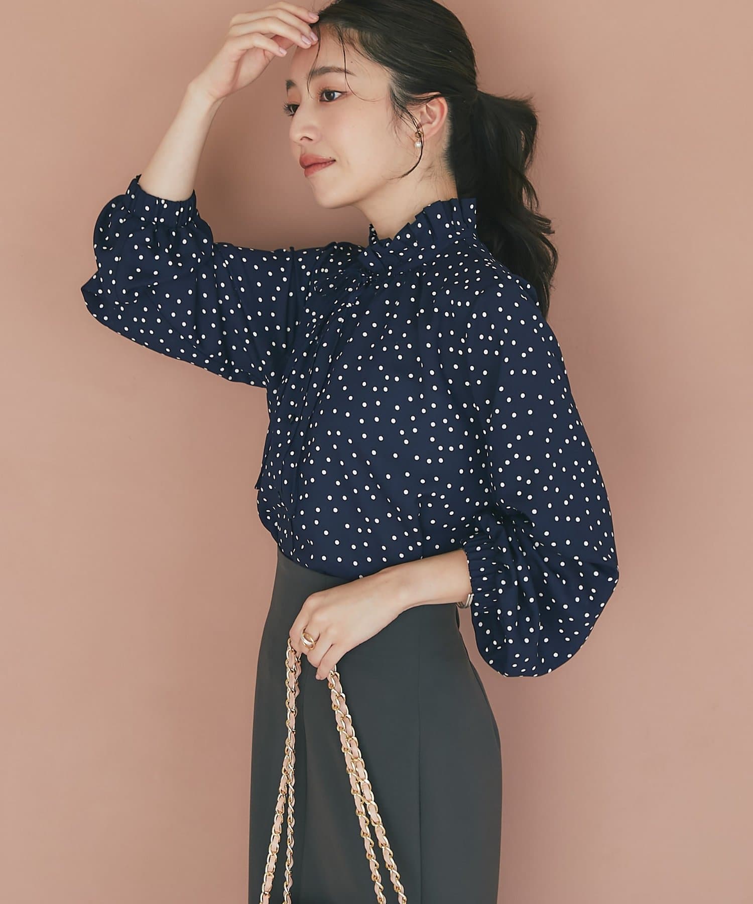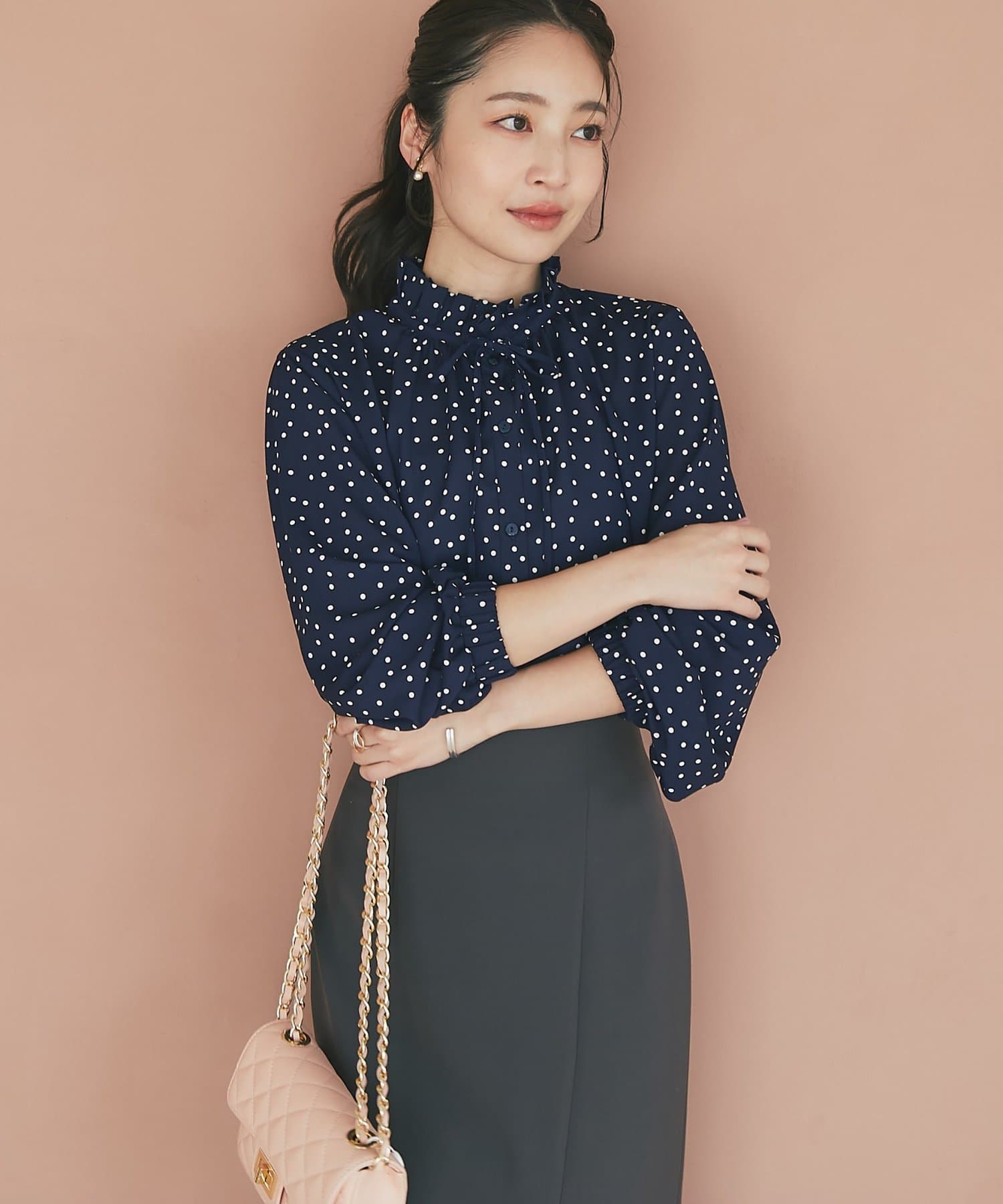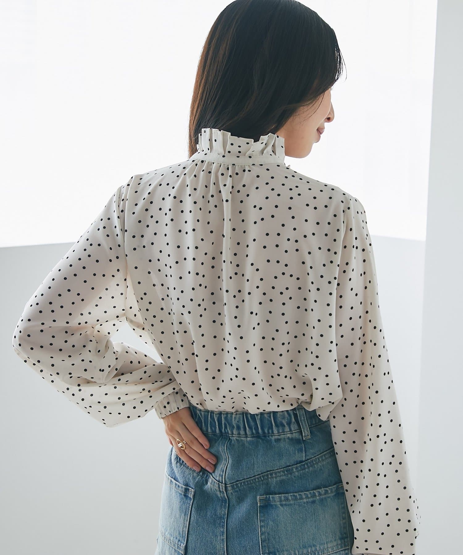 襟ぐりフリルと小さめドット柄がフェミニンな印象をプラスするブラウス。