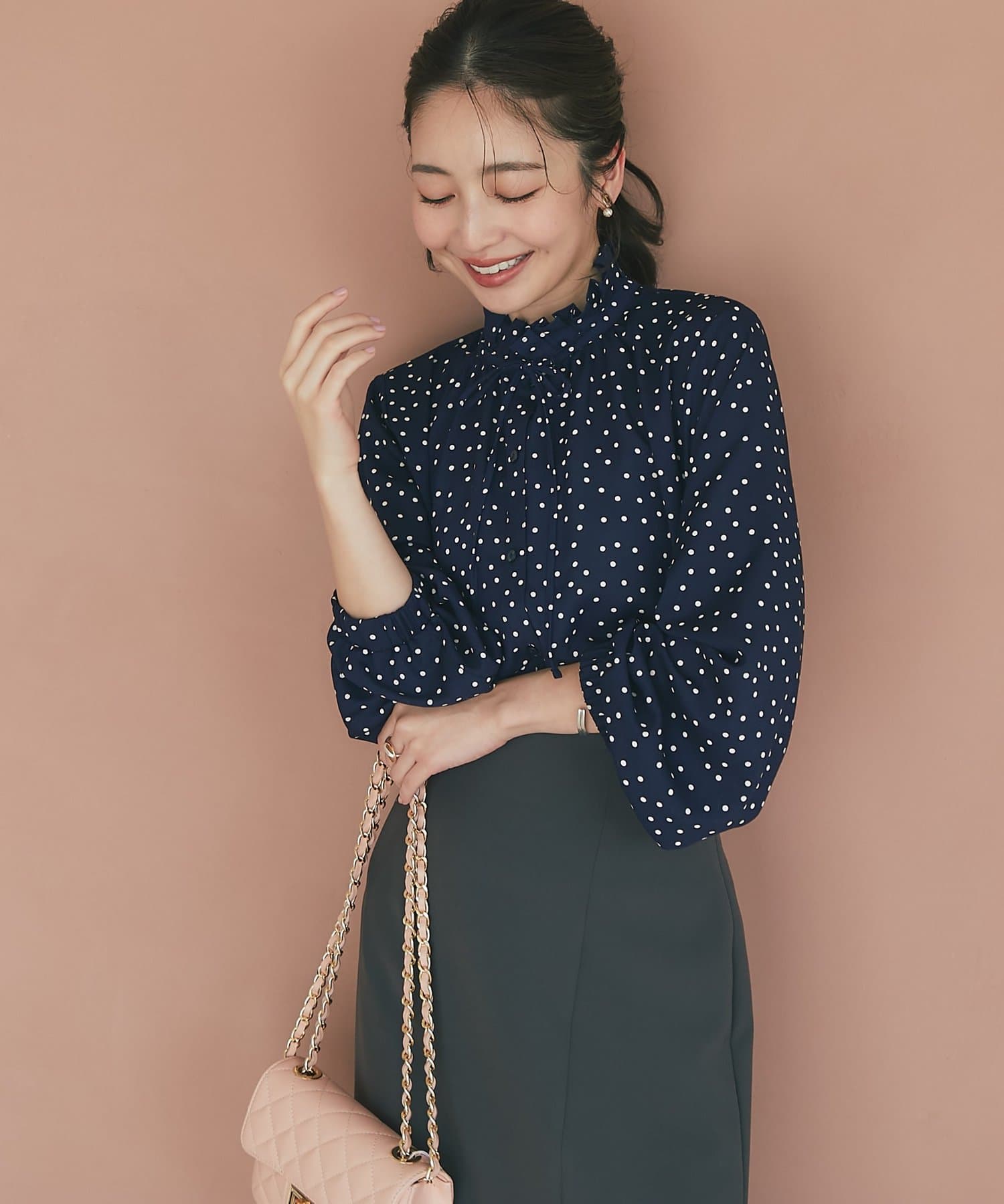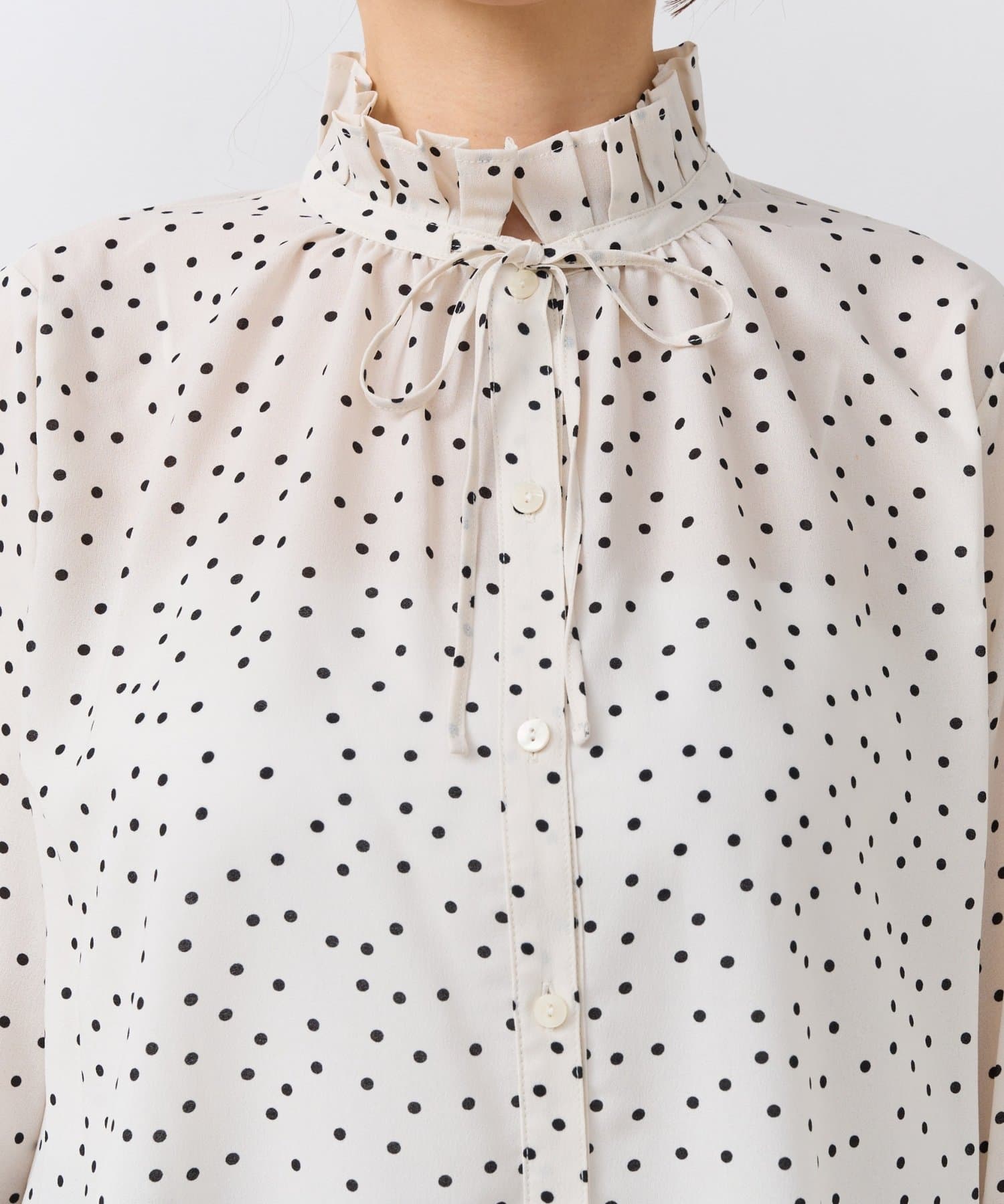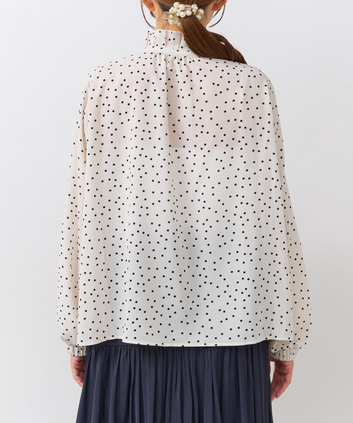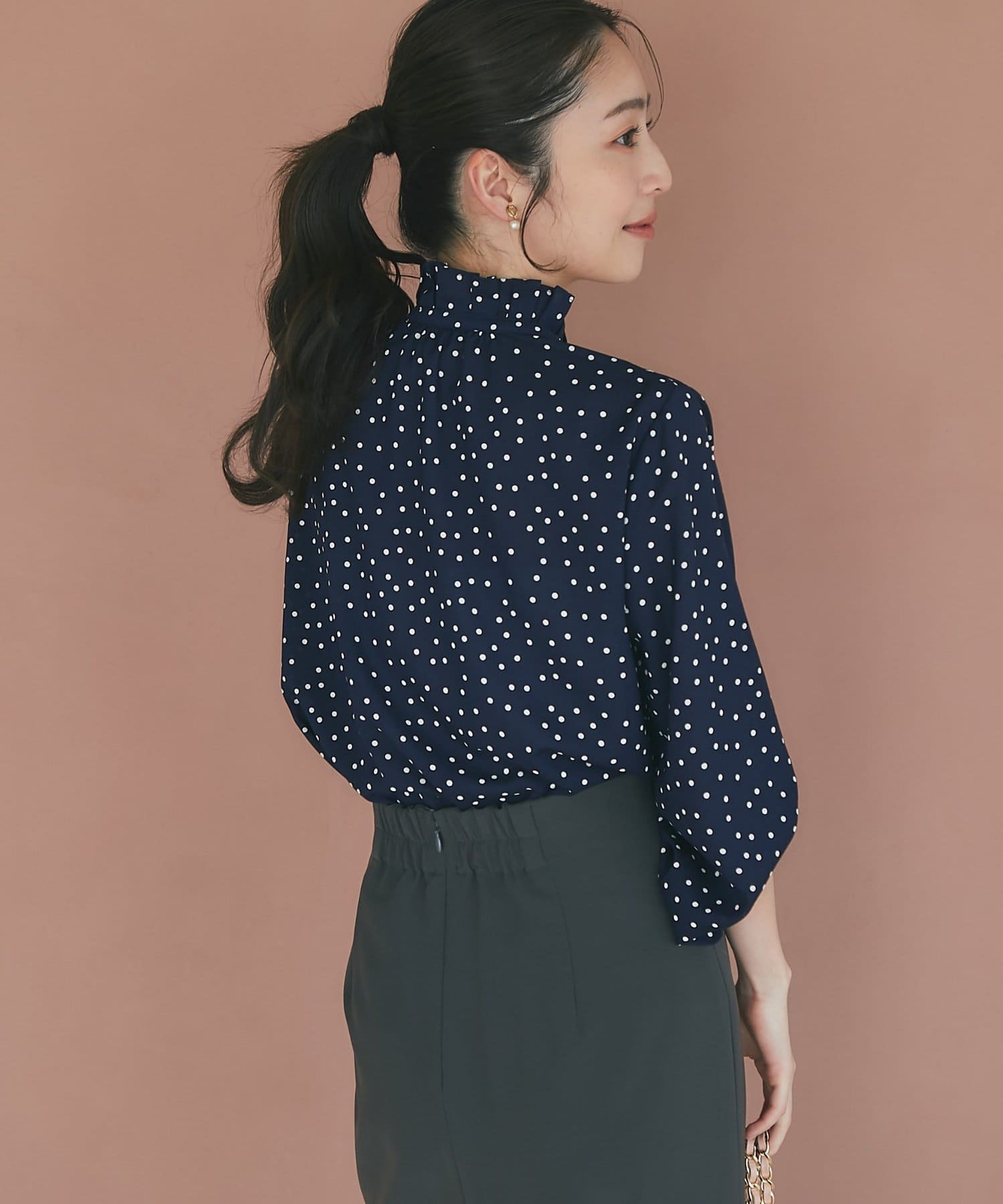 襟ぐりフリルと小さめドット柄がフェミニンな印象をプラスするブラウス。
