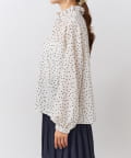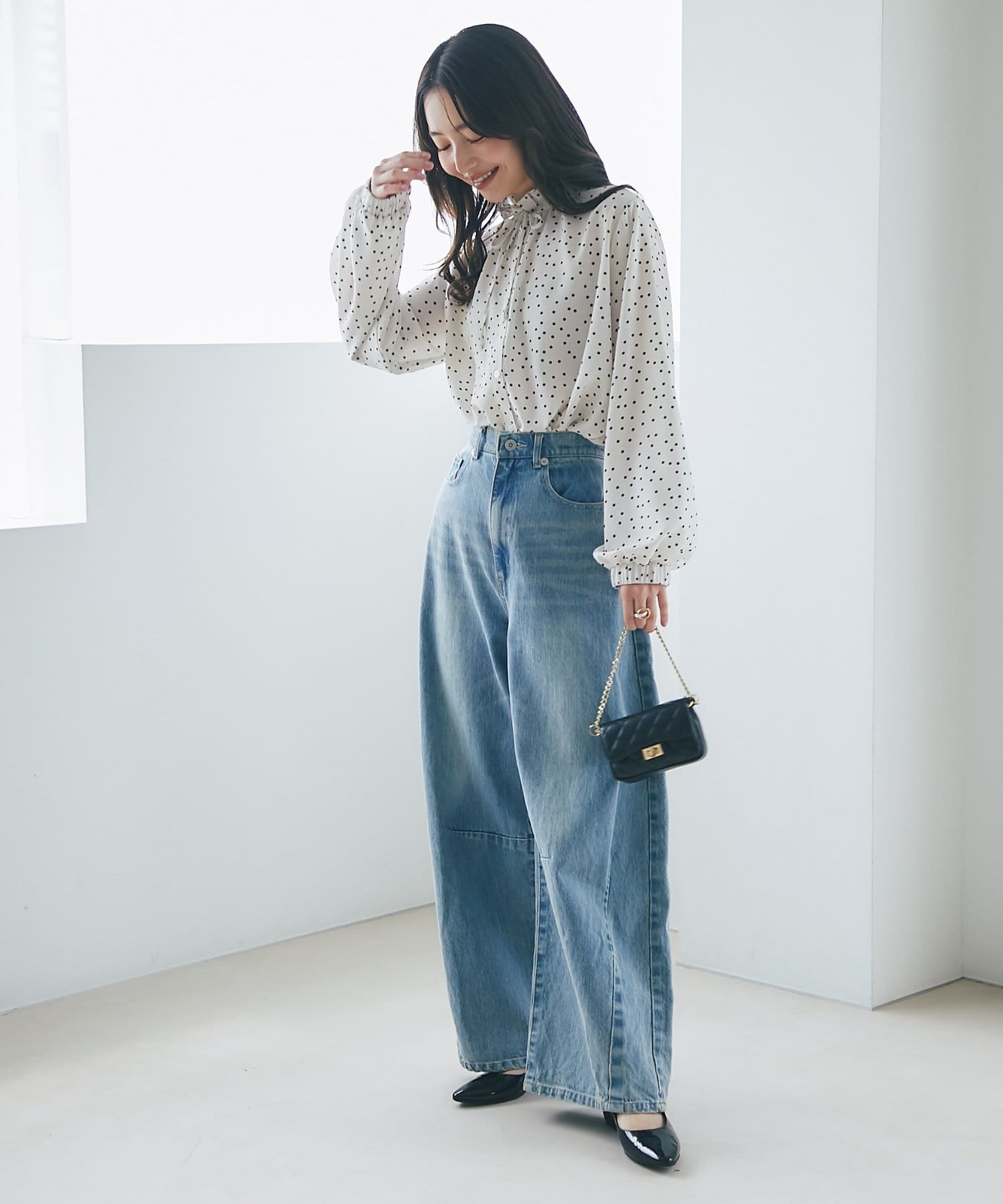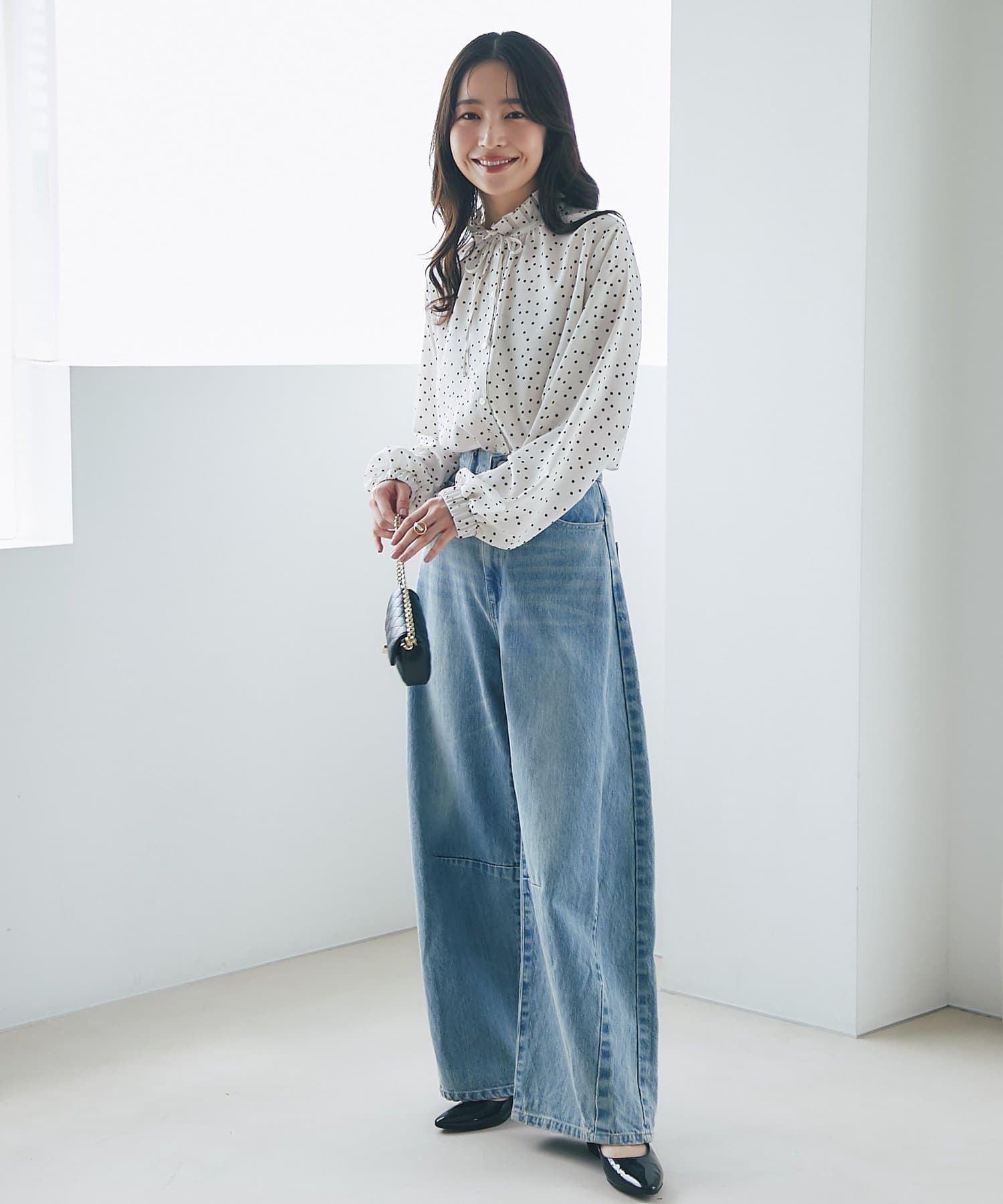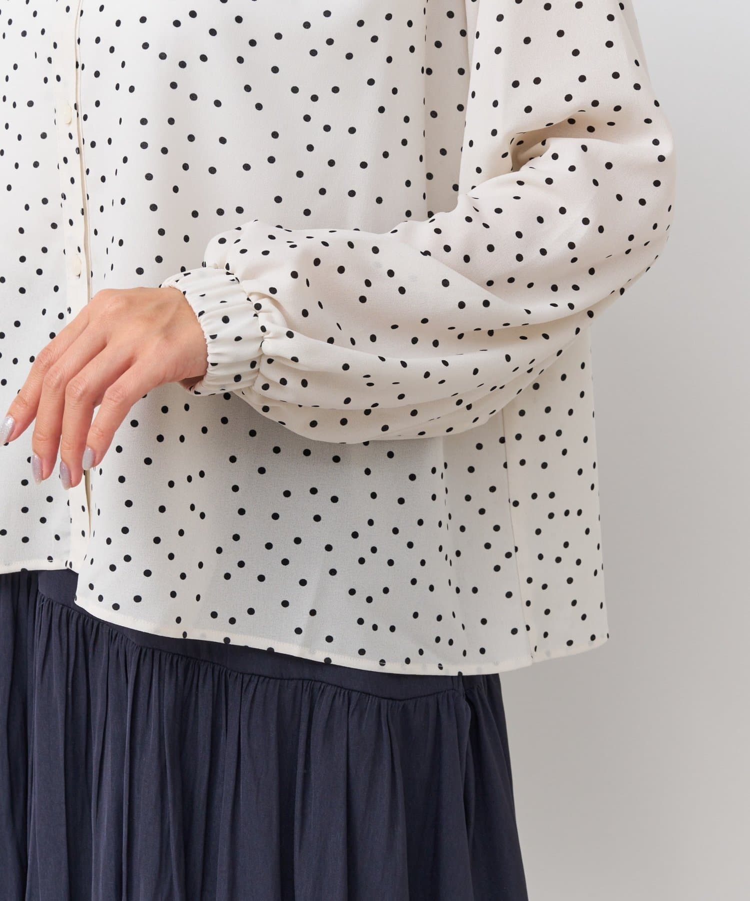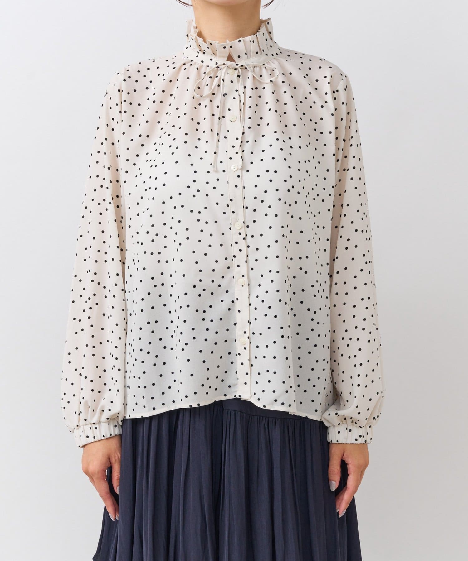 襟ぐりフリルと小さめドット柄がフェミニンな印象をプラスするブラウス。