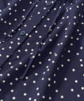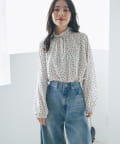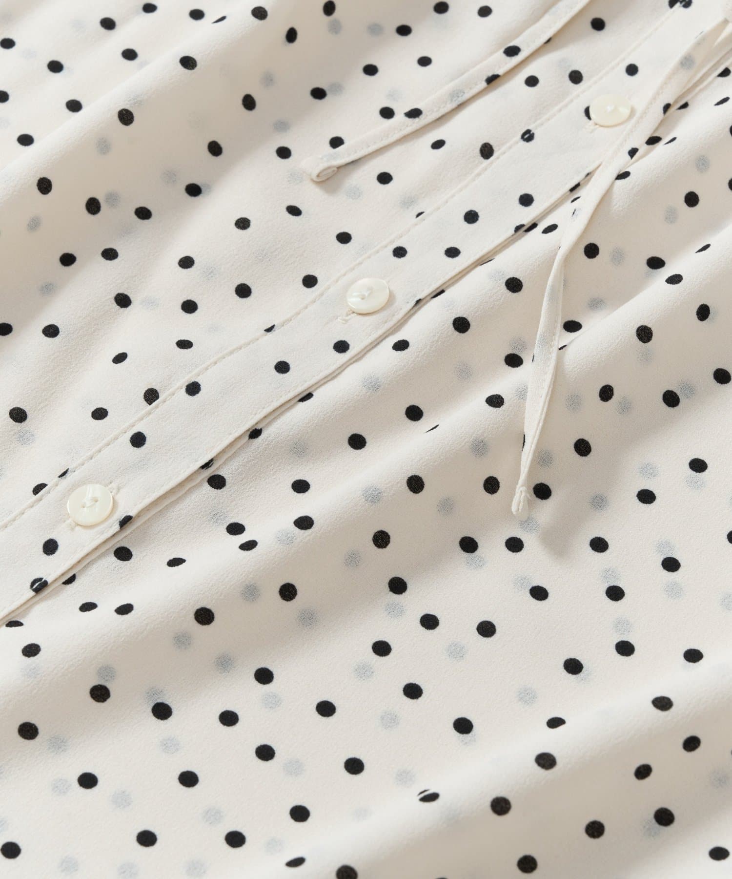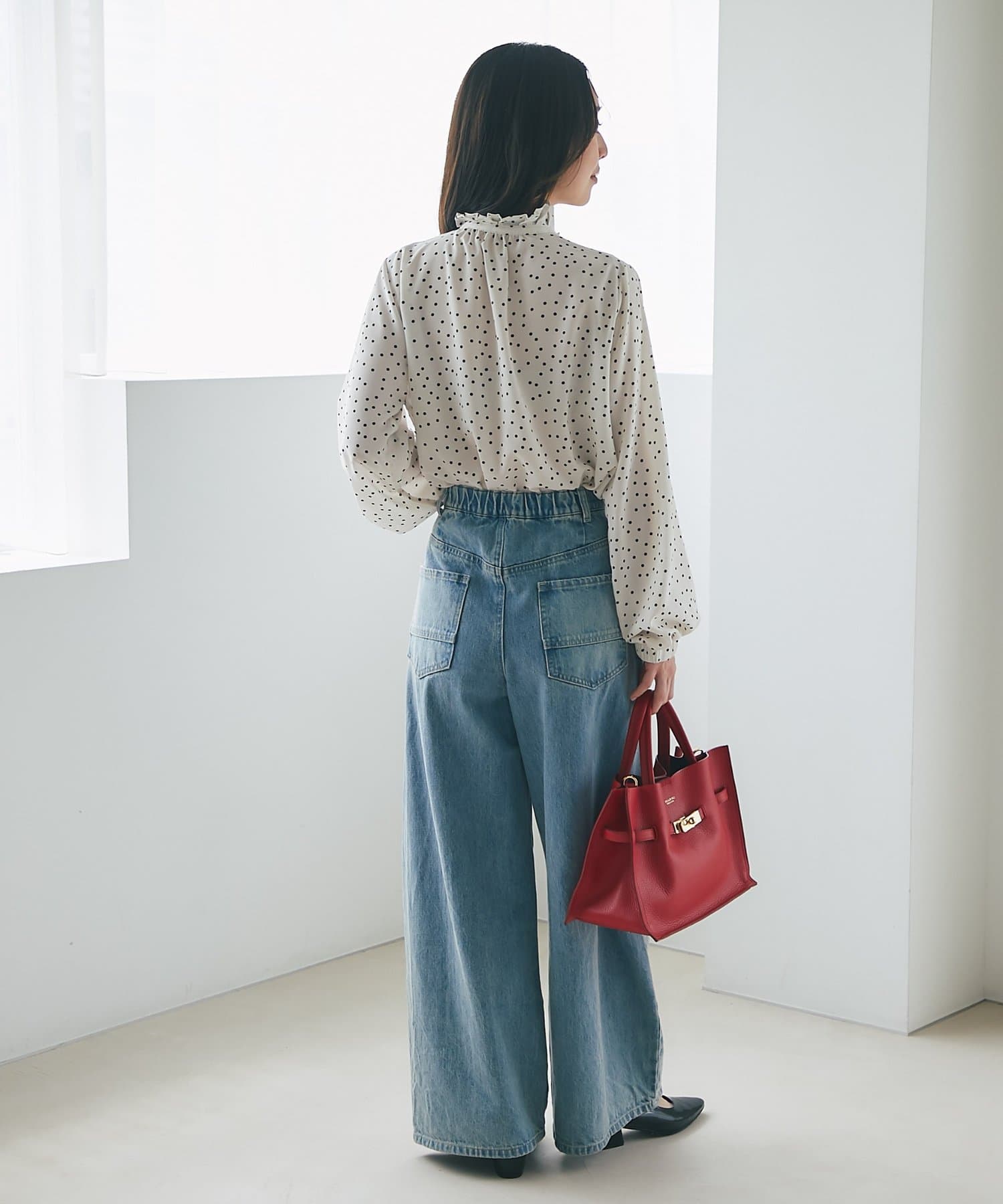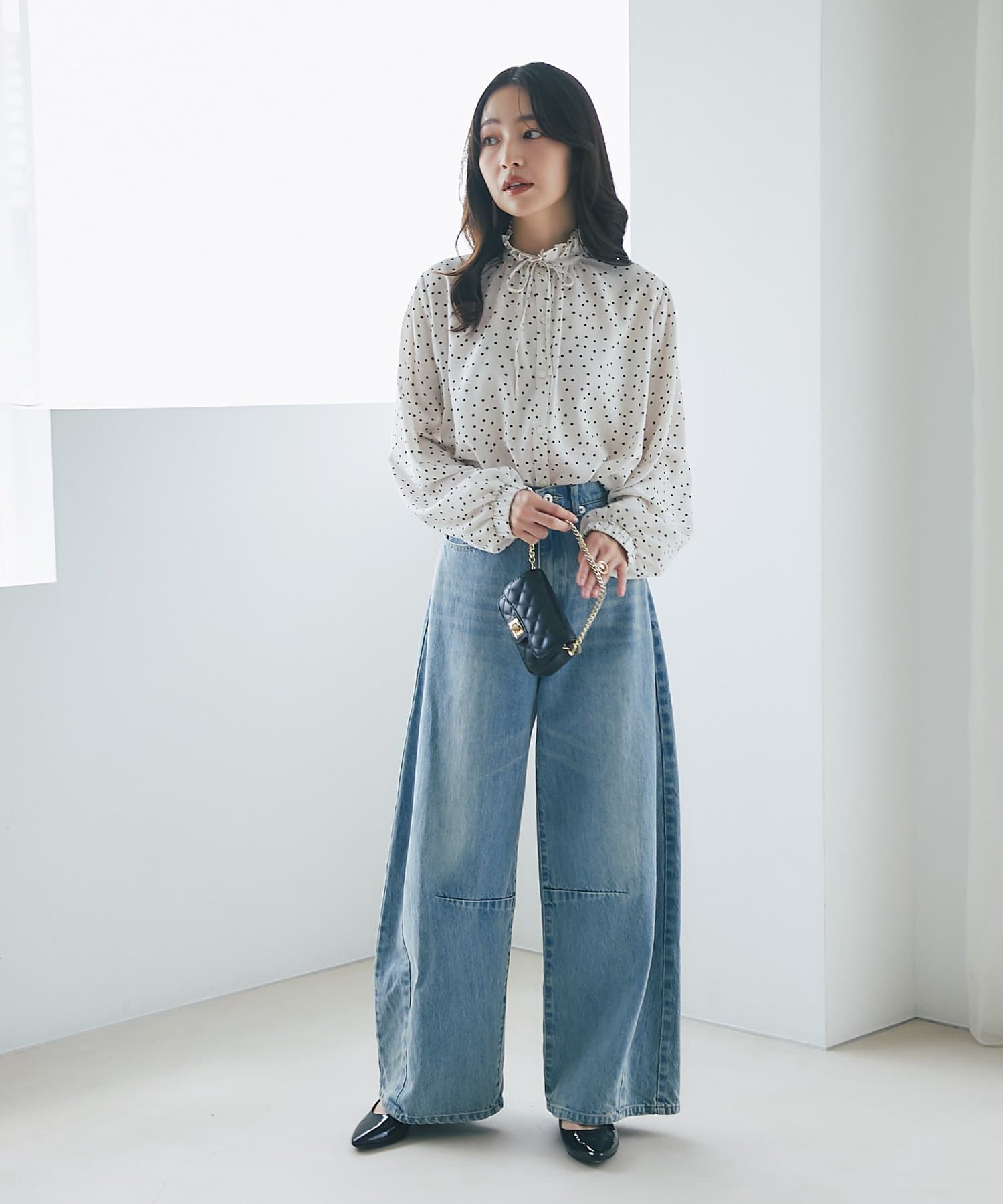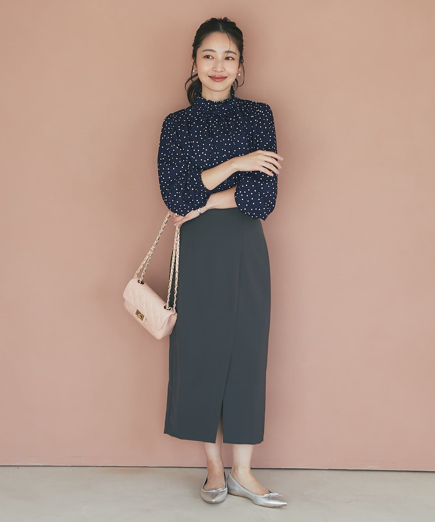 襟ぐりフリルと小さめドット柄がフェミニンな印象をプラスするブラウス。
