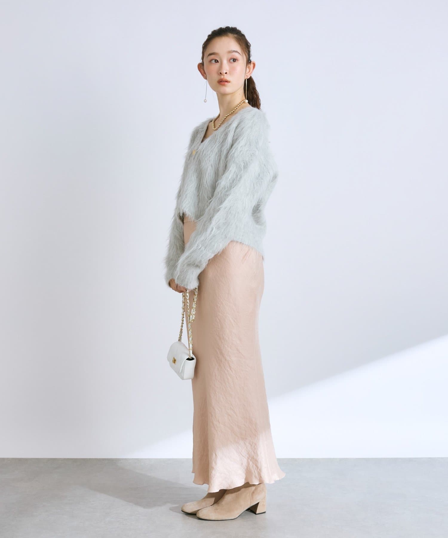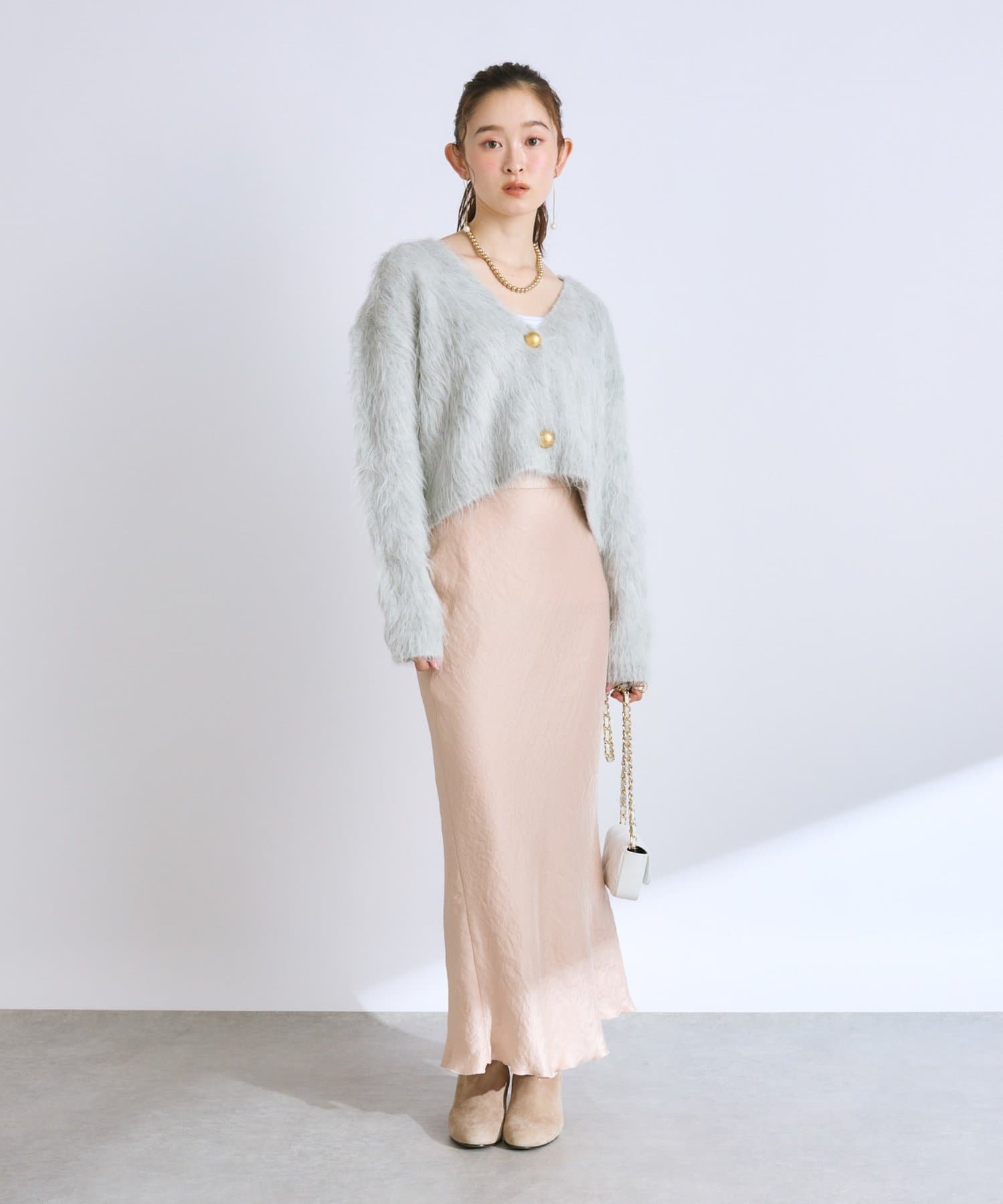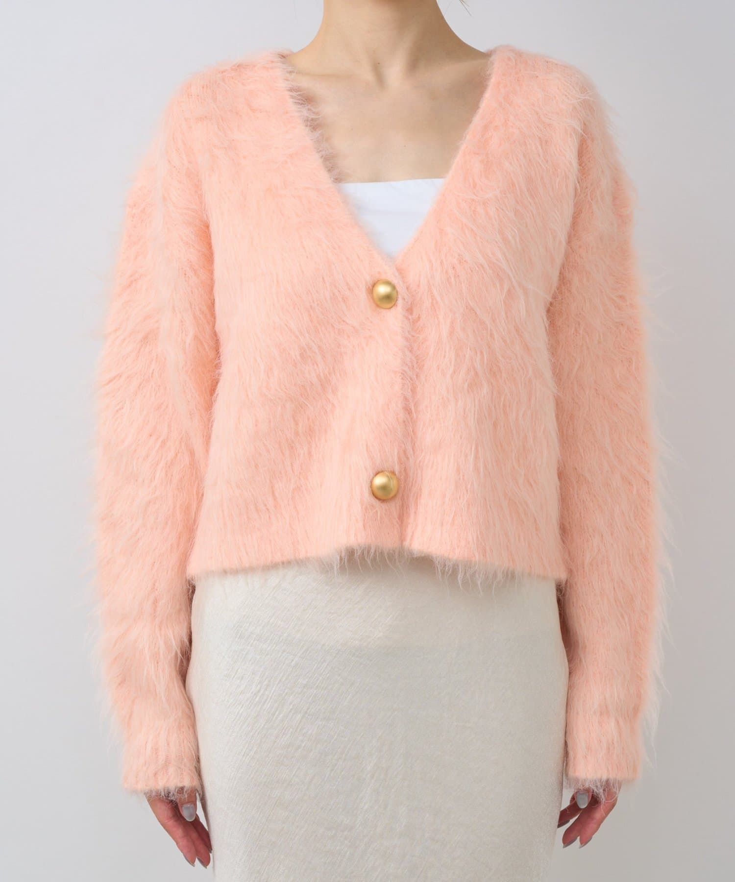 繊細でふわふわとした質感が魅力のロングフェザークロップドカーディガン。