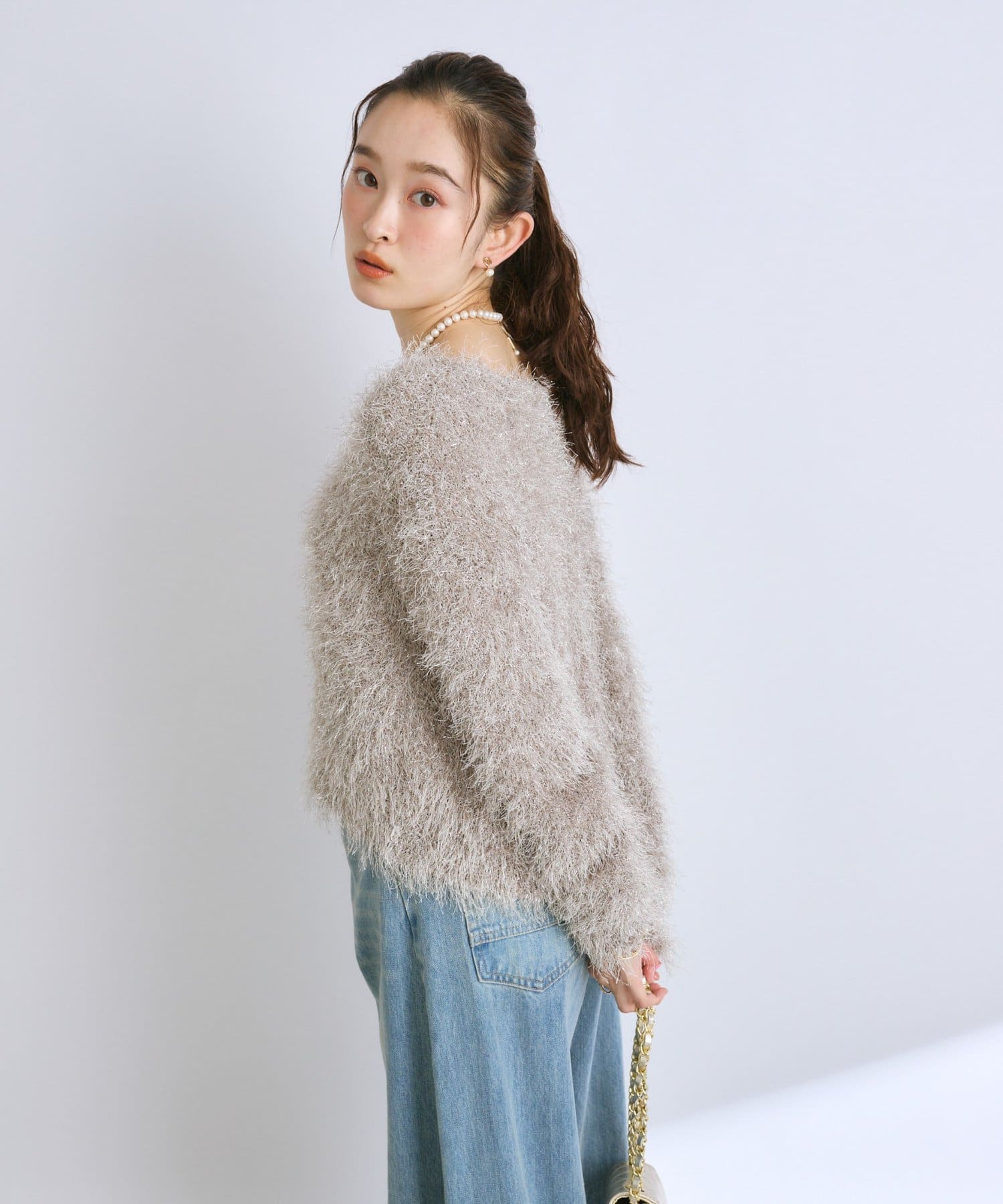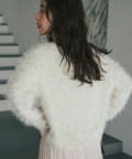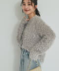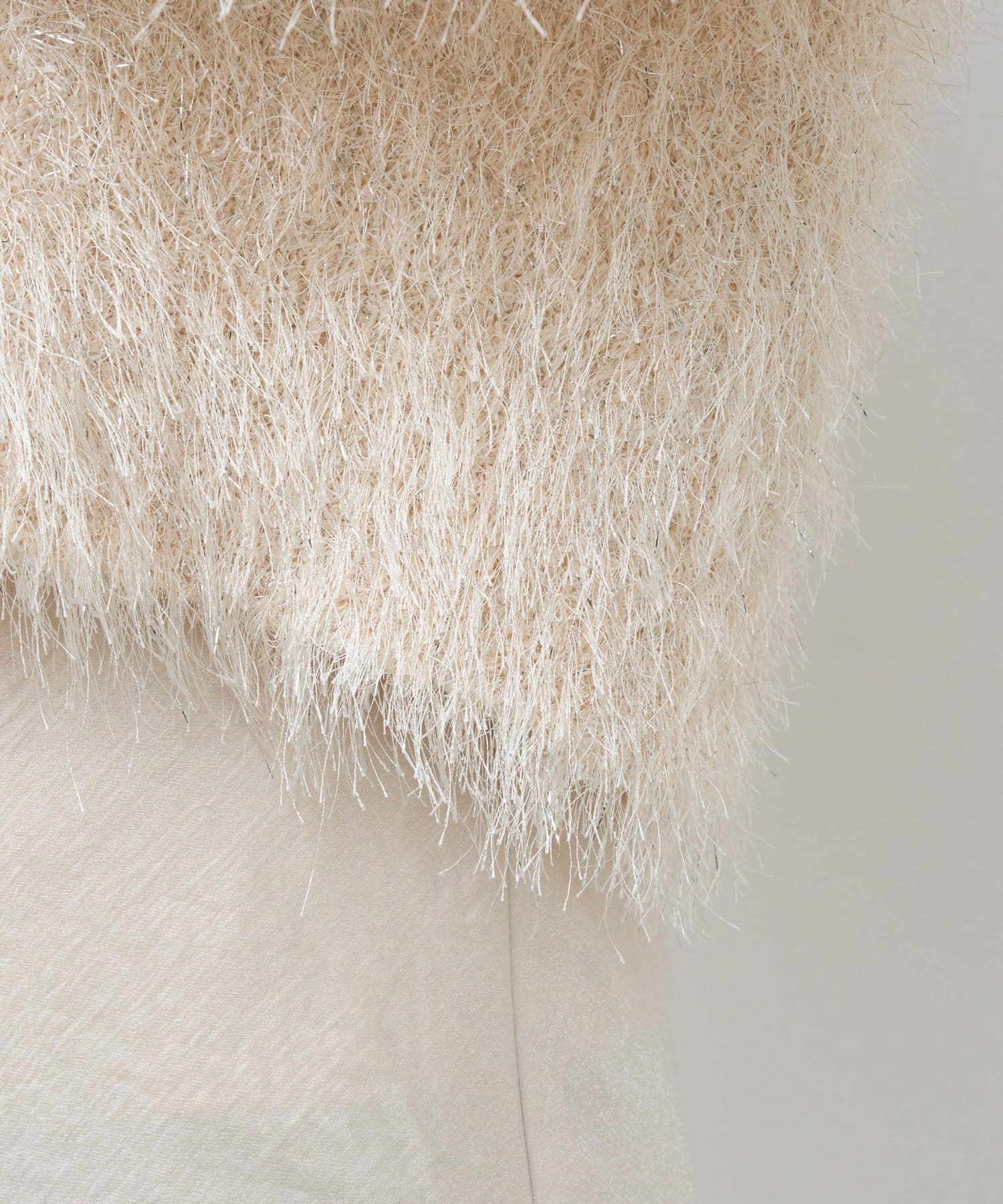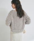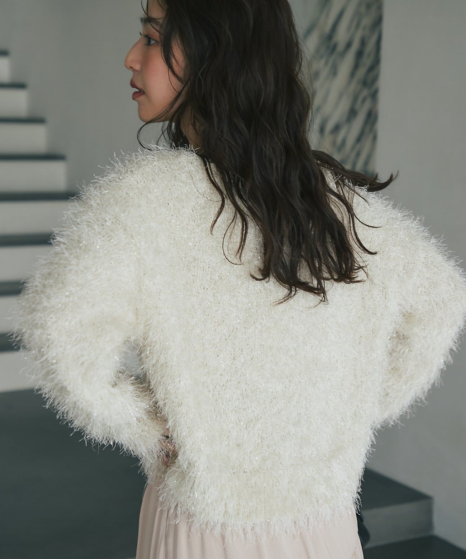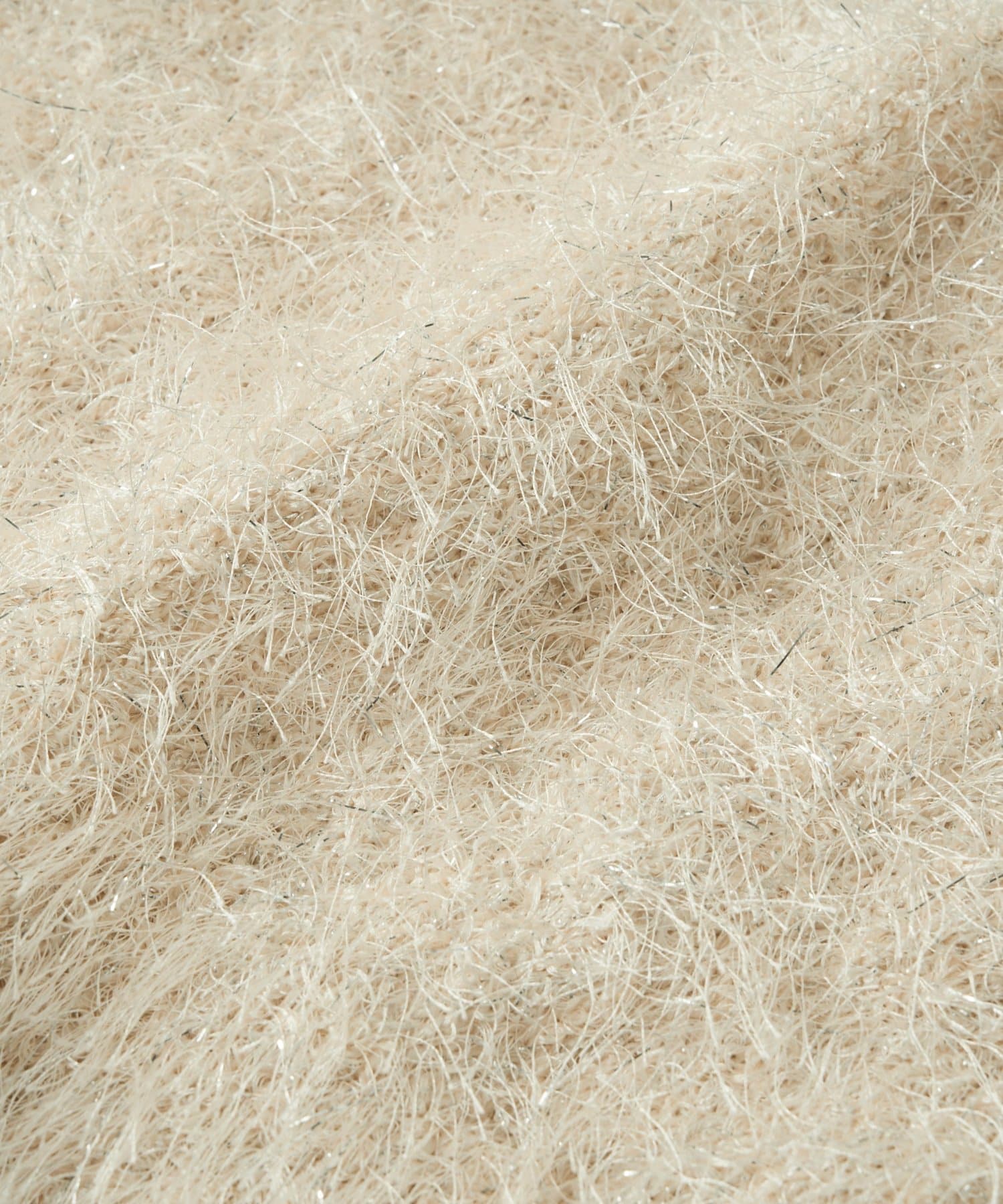 毛足のあるフェザーヤーンにラメを織り交ぜたスタイリングの主役になる一枚です。