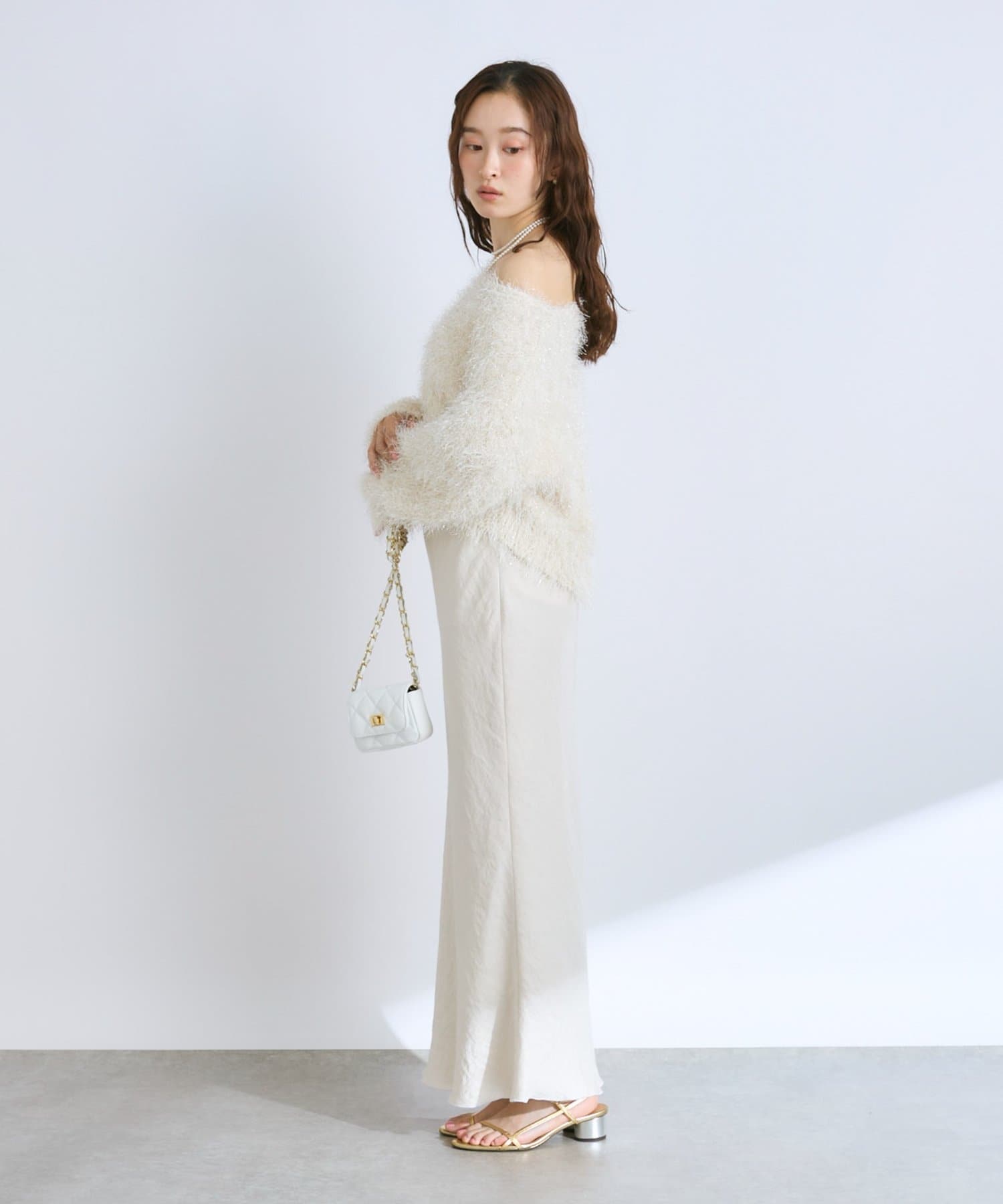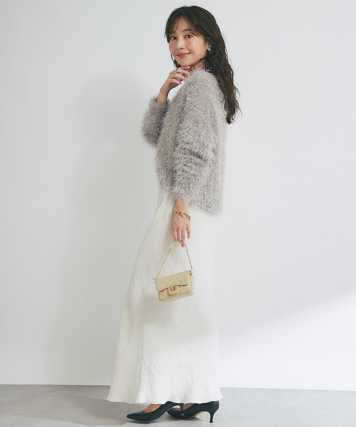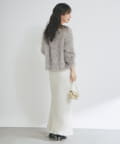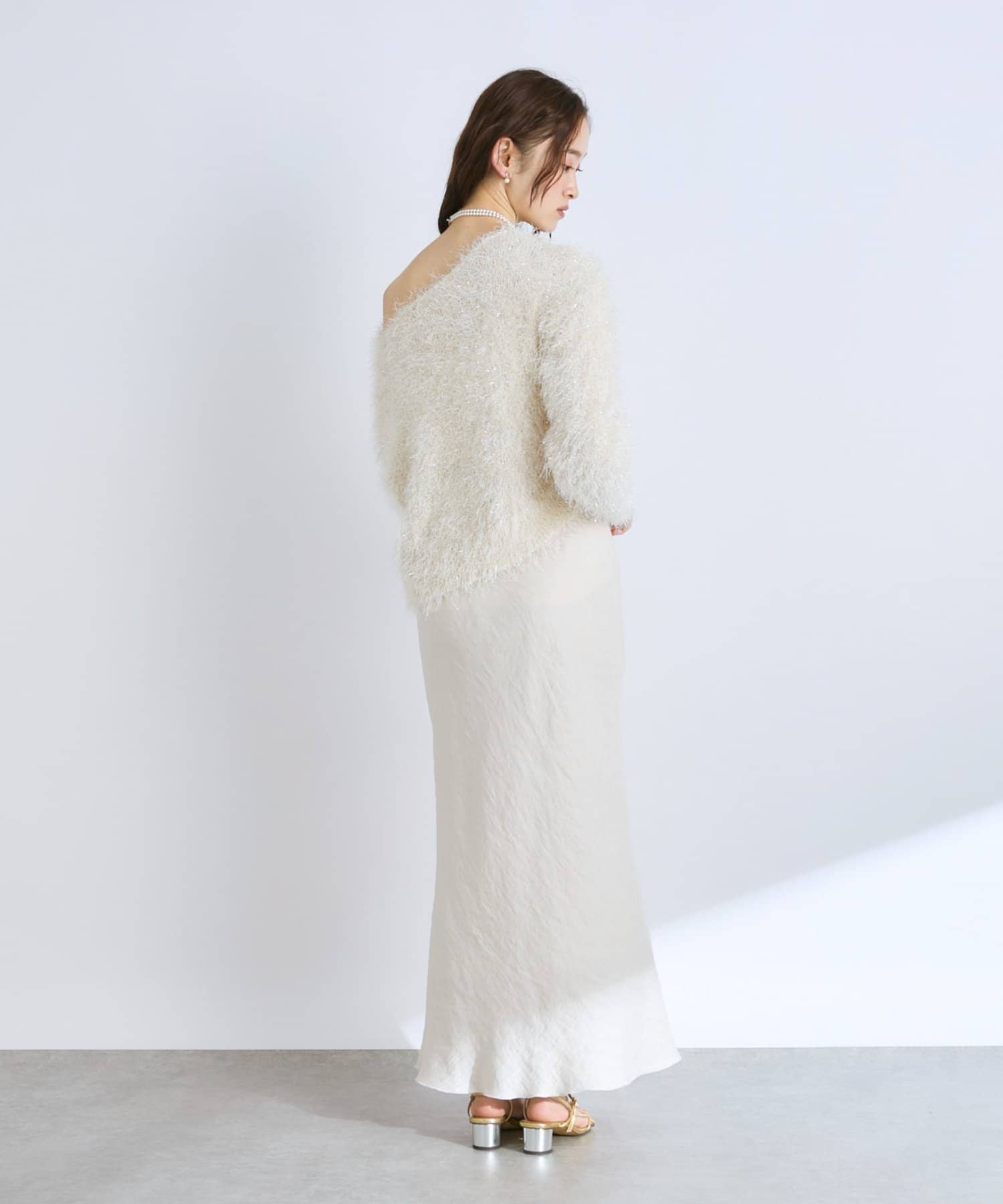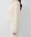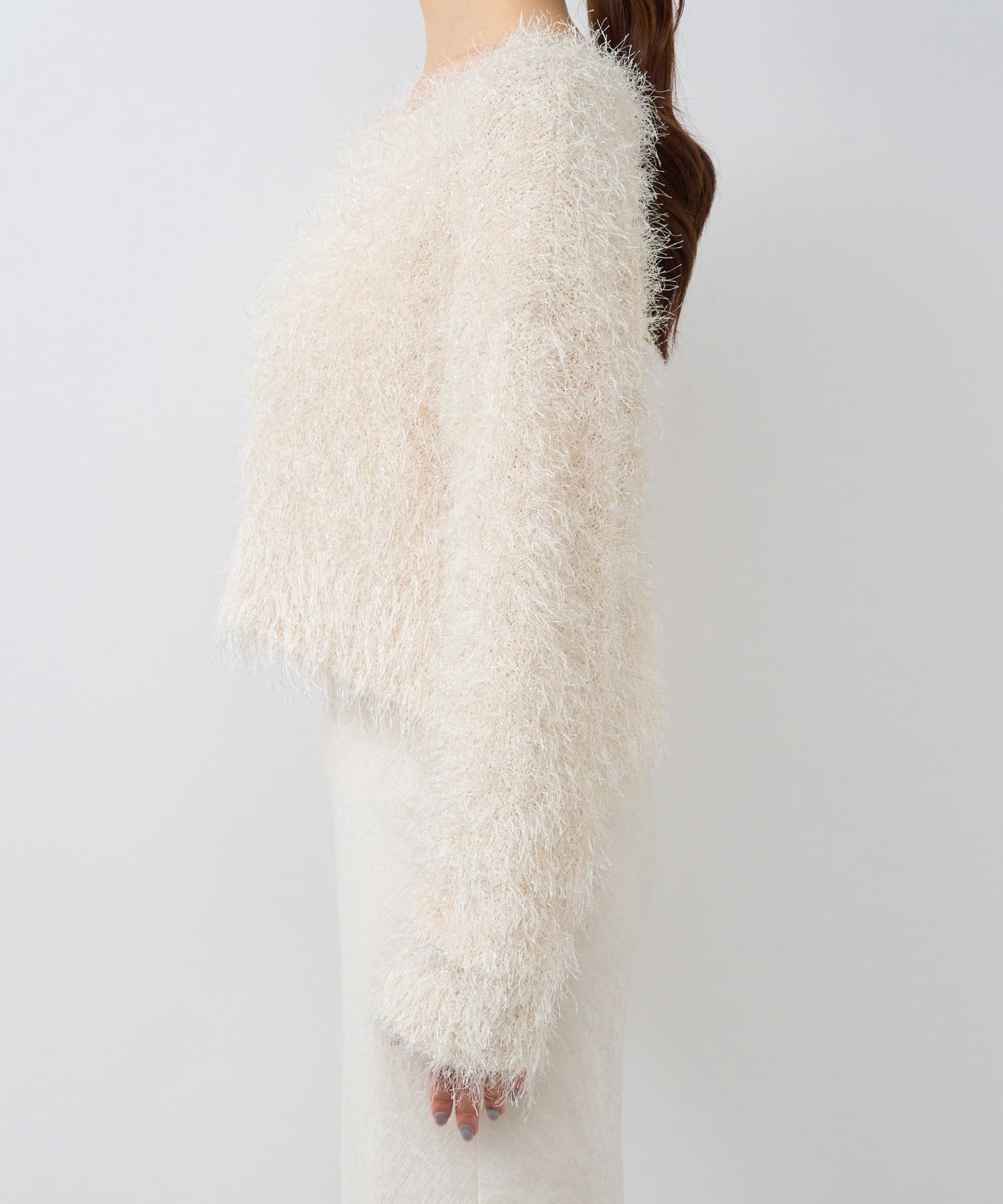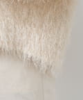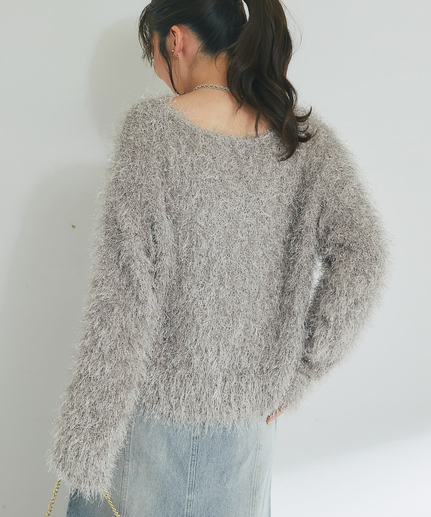 毛足のあるフェザーヤーンにラメを織り交ぜたスタイリングの主役になる一枚です。