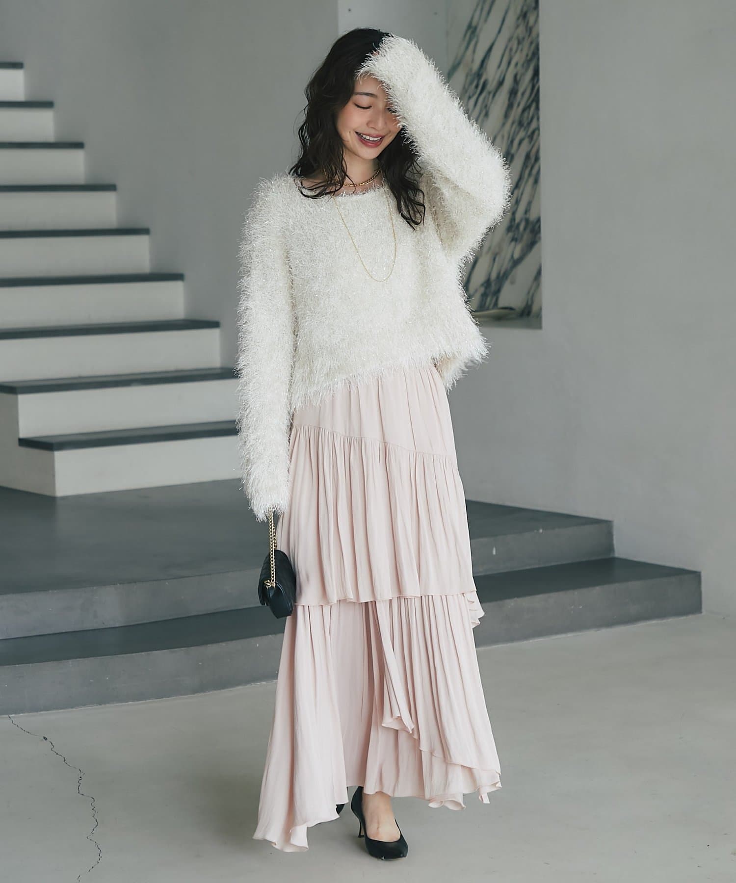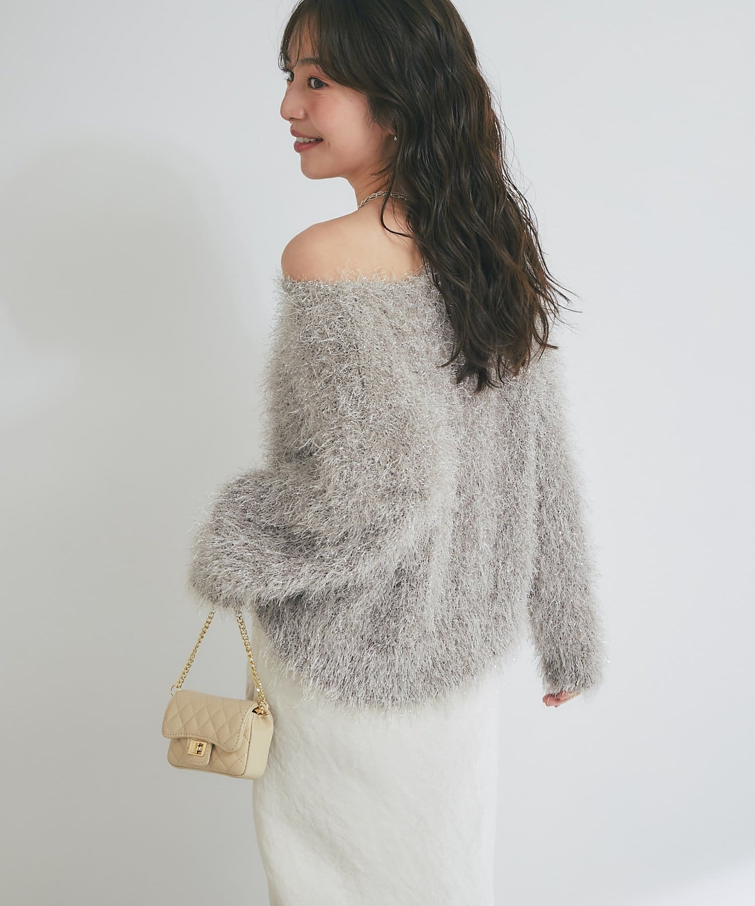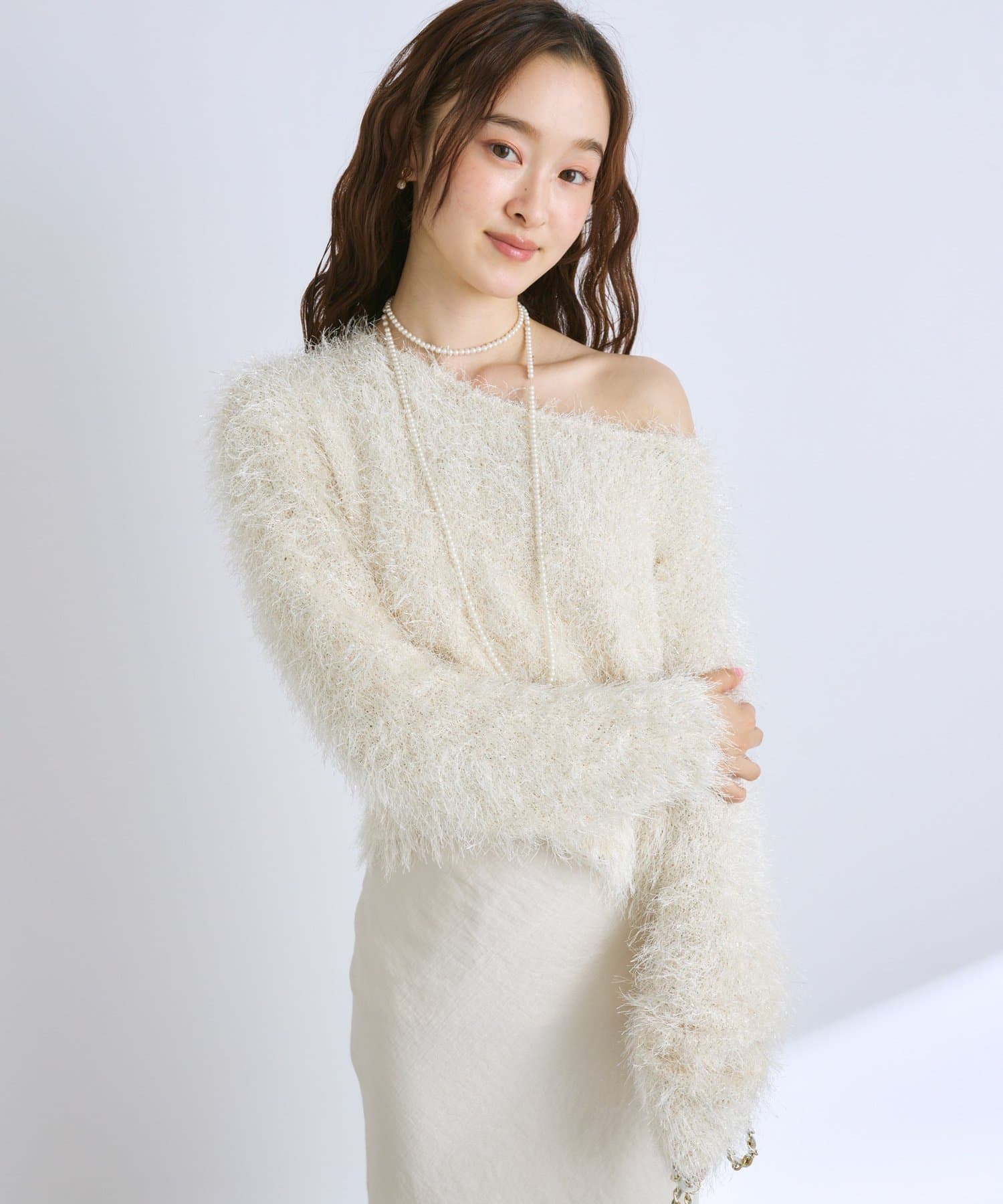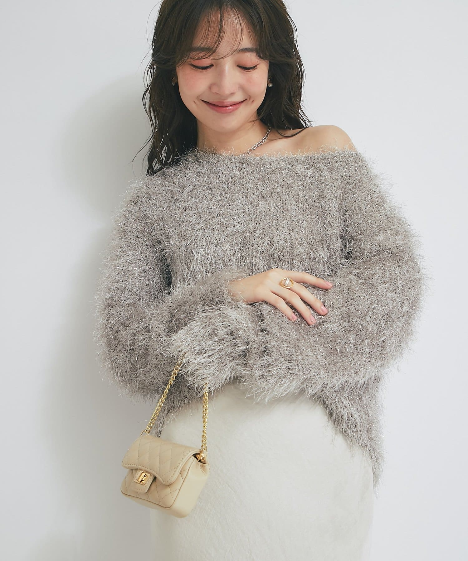 ラメが煌めく、ふわふわ素材の華やかニット。