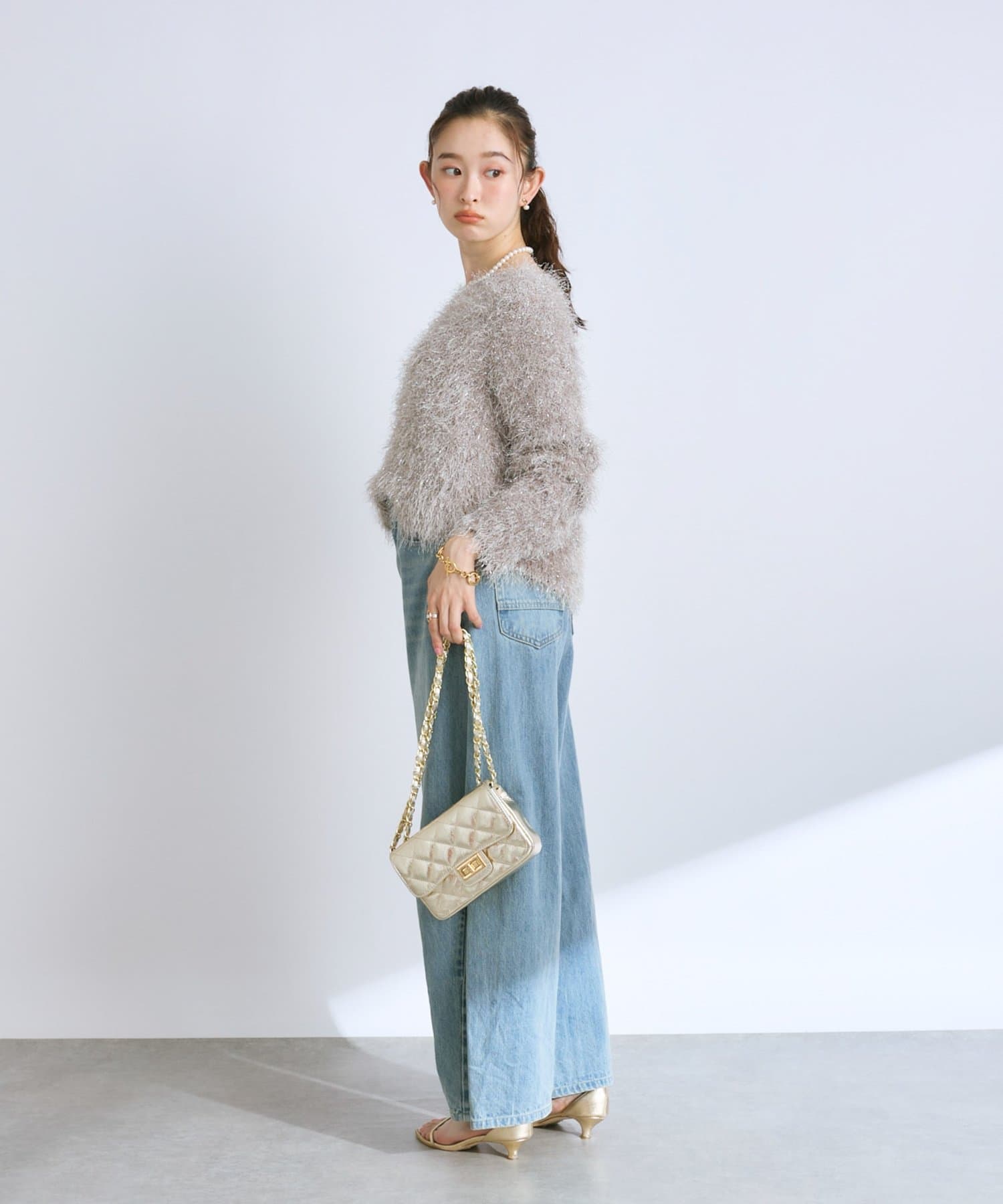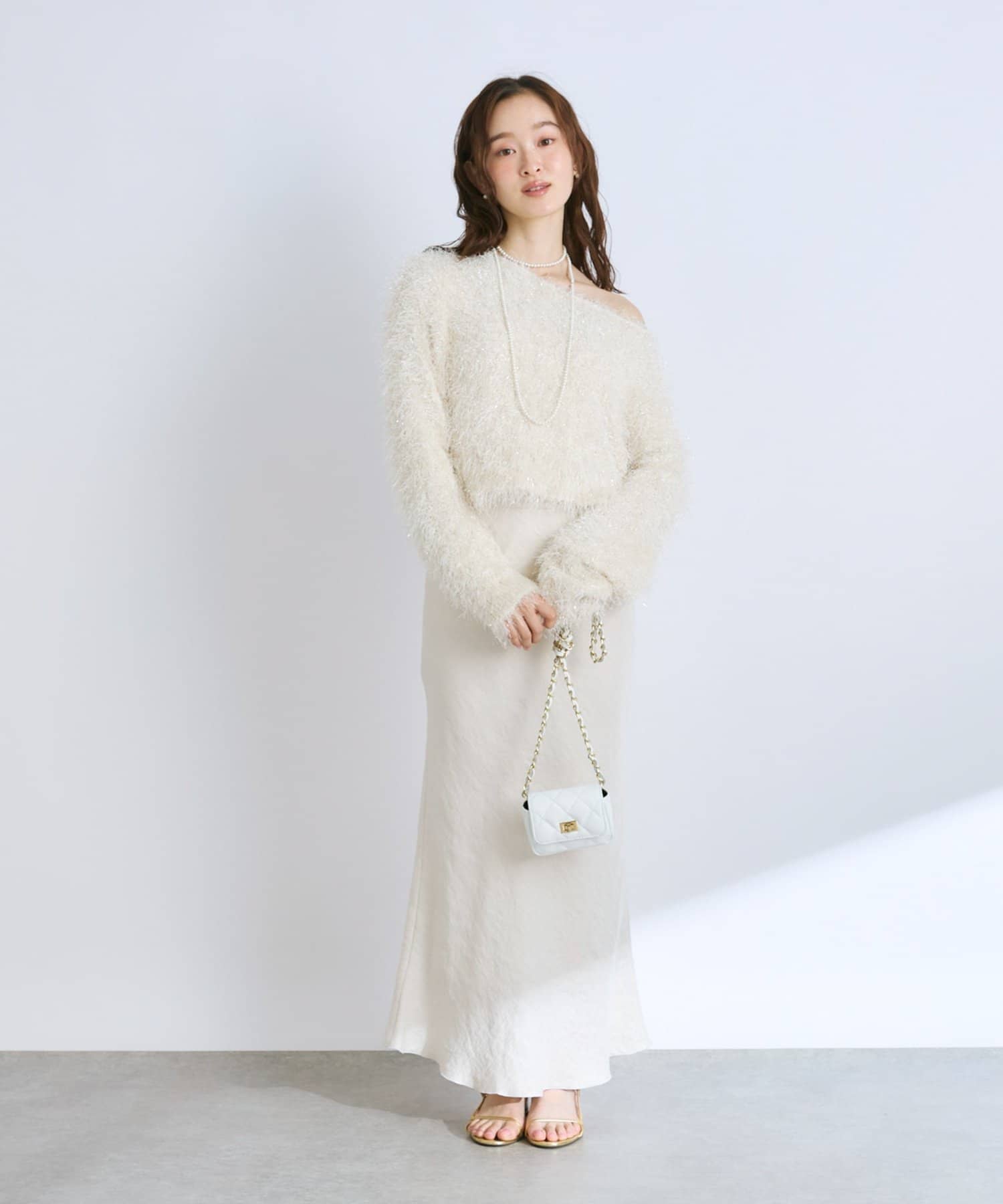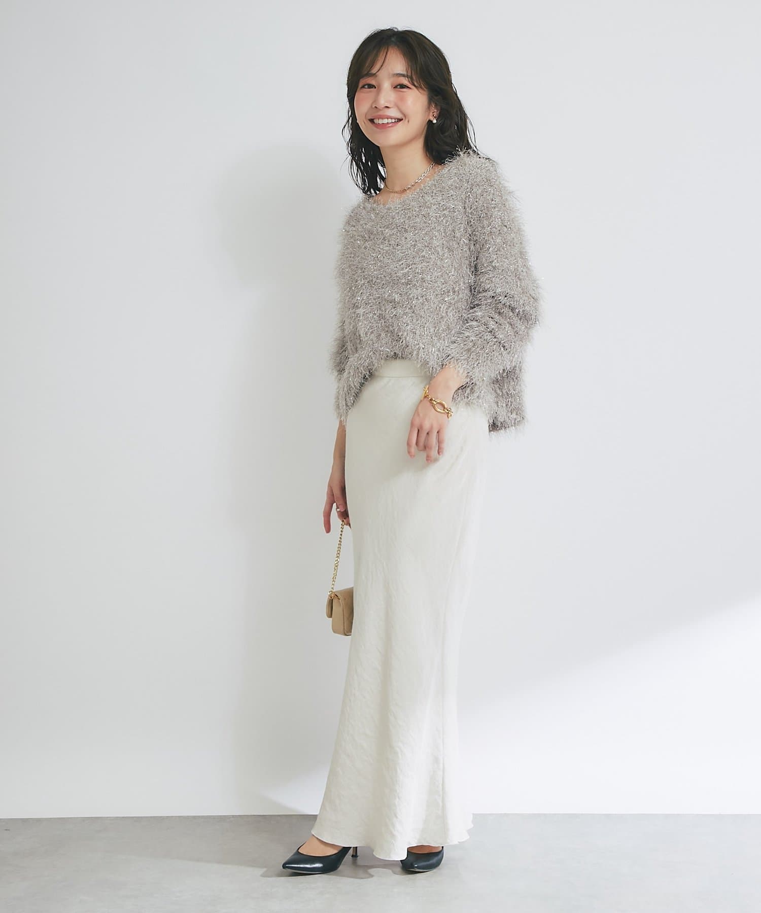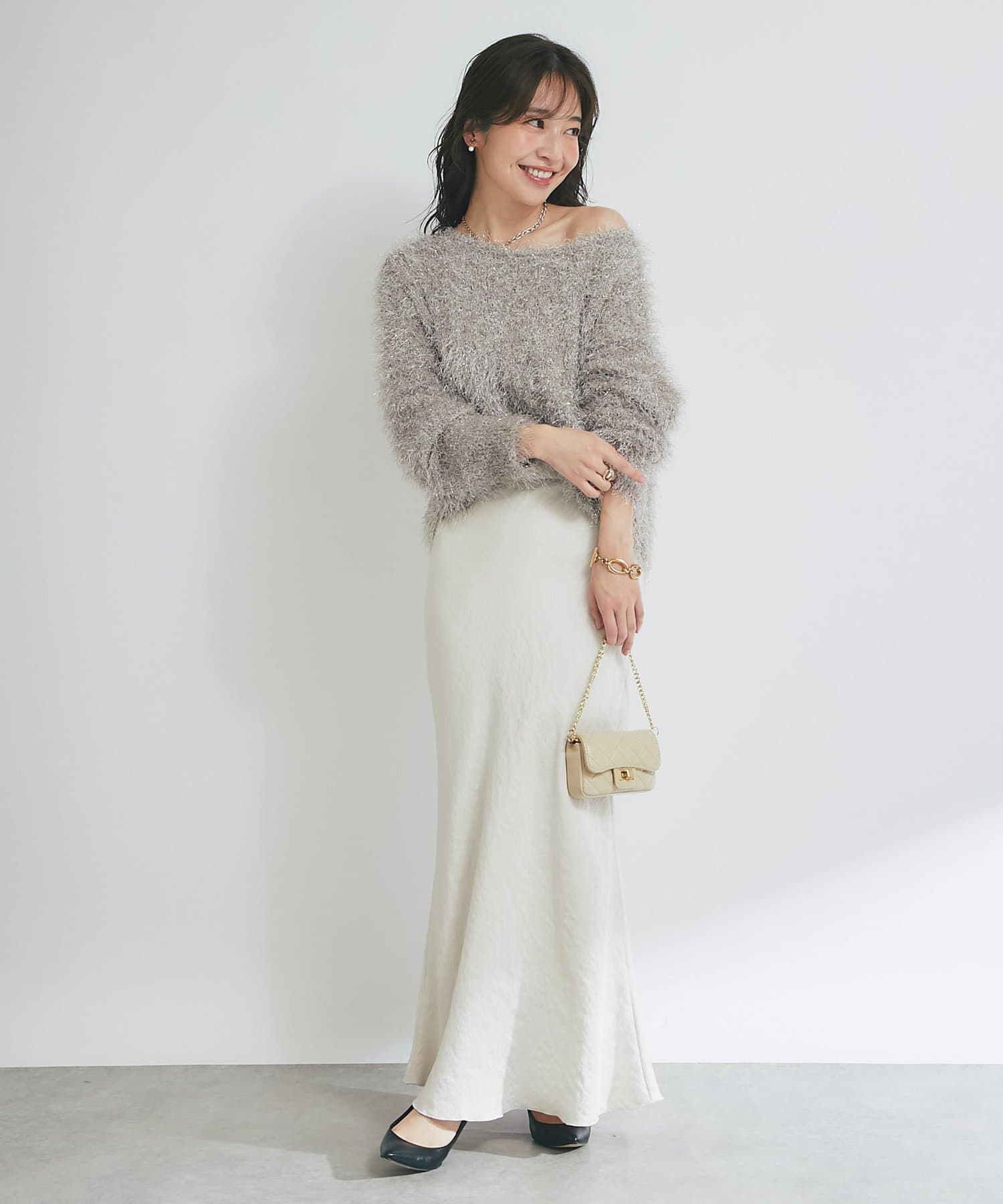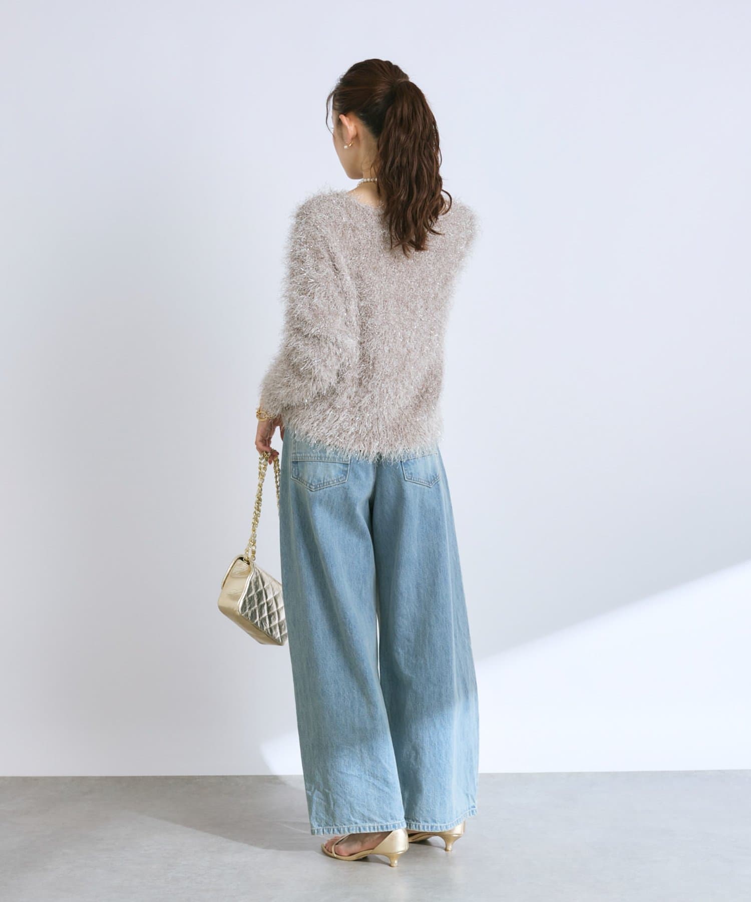 着るだけで華やかなラメニットなので、シンプルなボトムに合わせるだけでコーデが決まります。