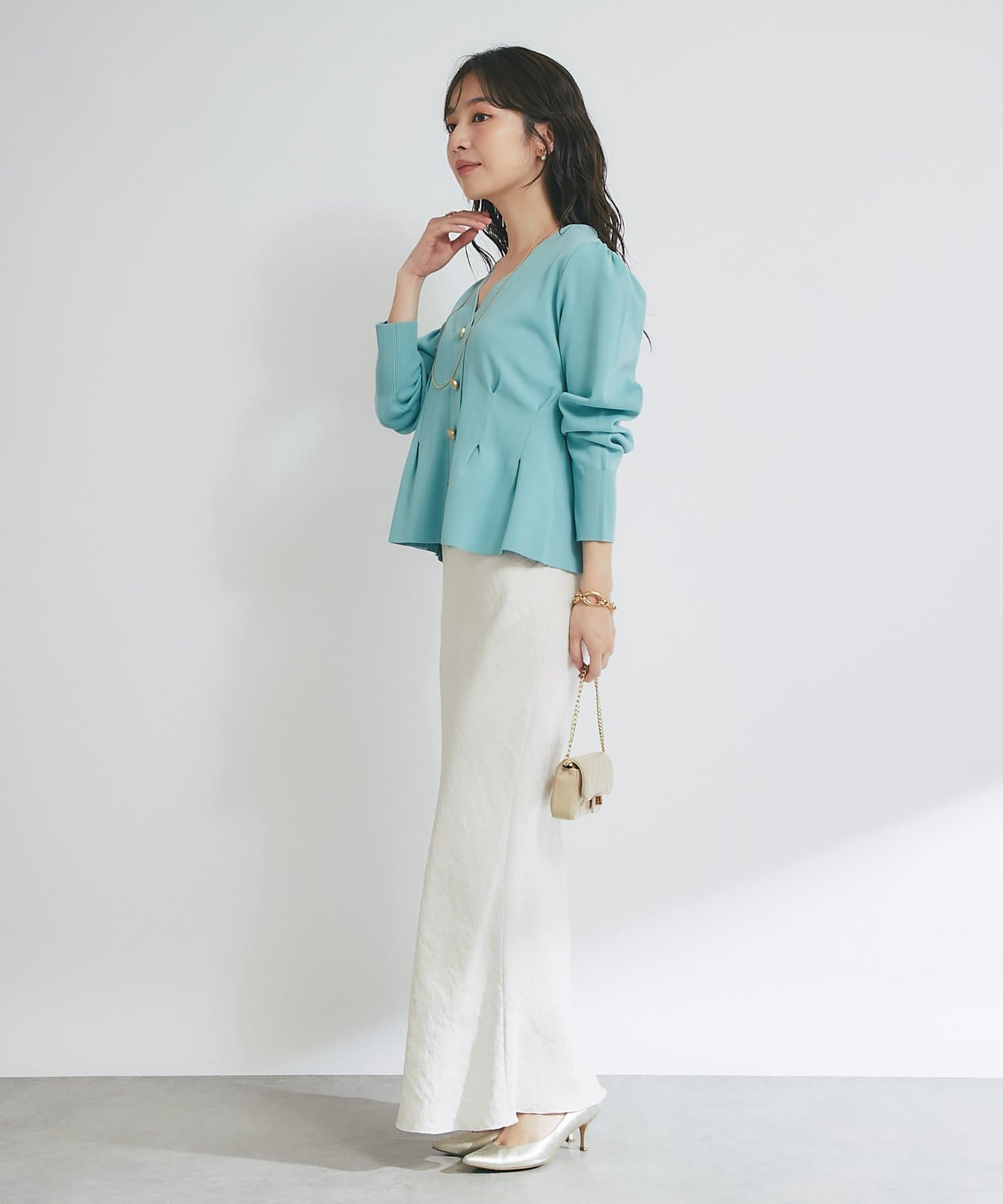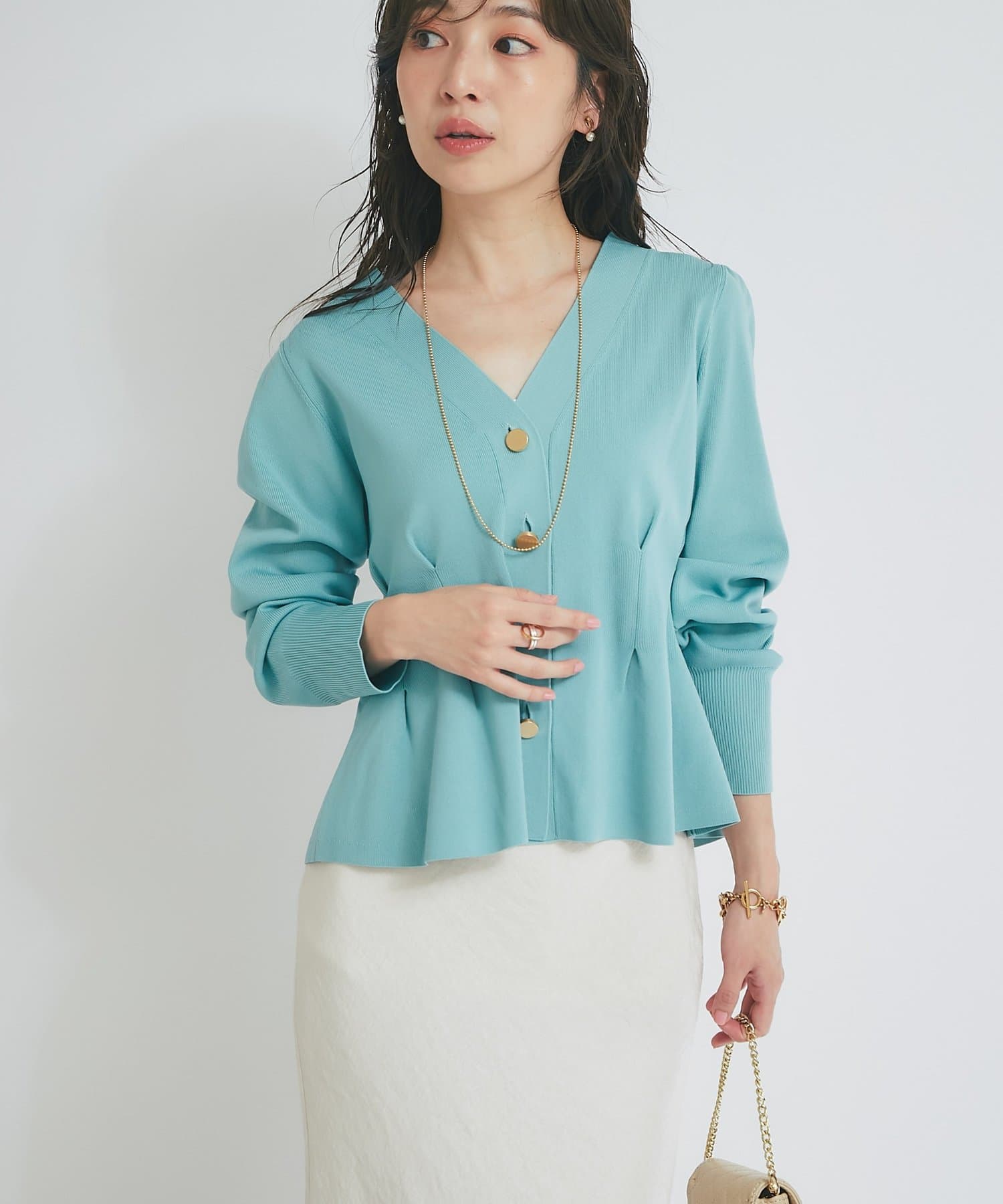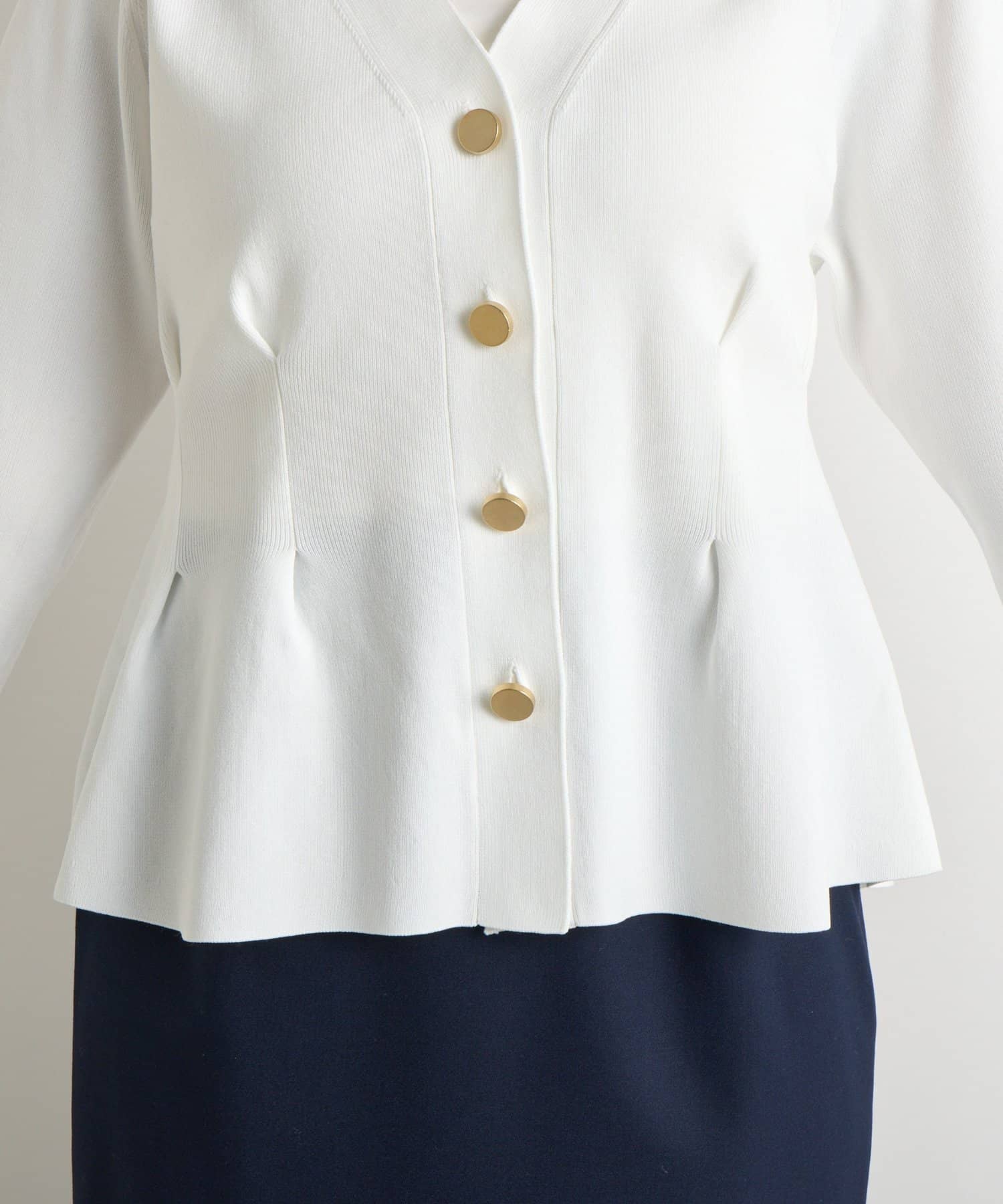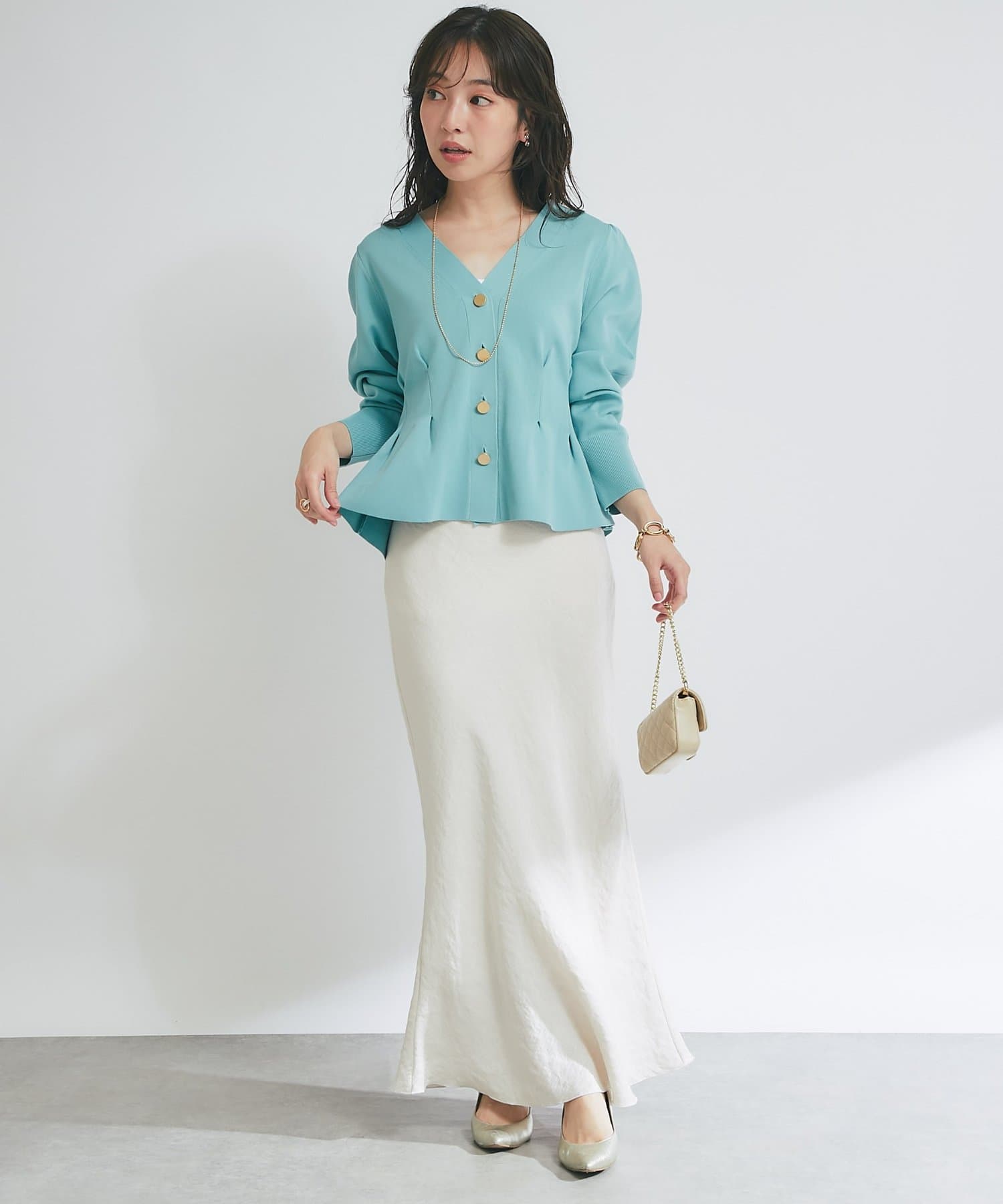 Vネックがデコルテを美しく見せ、ペプラムが女性らしいくびれを演出。