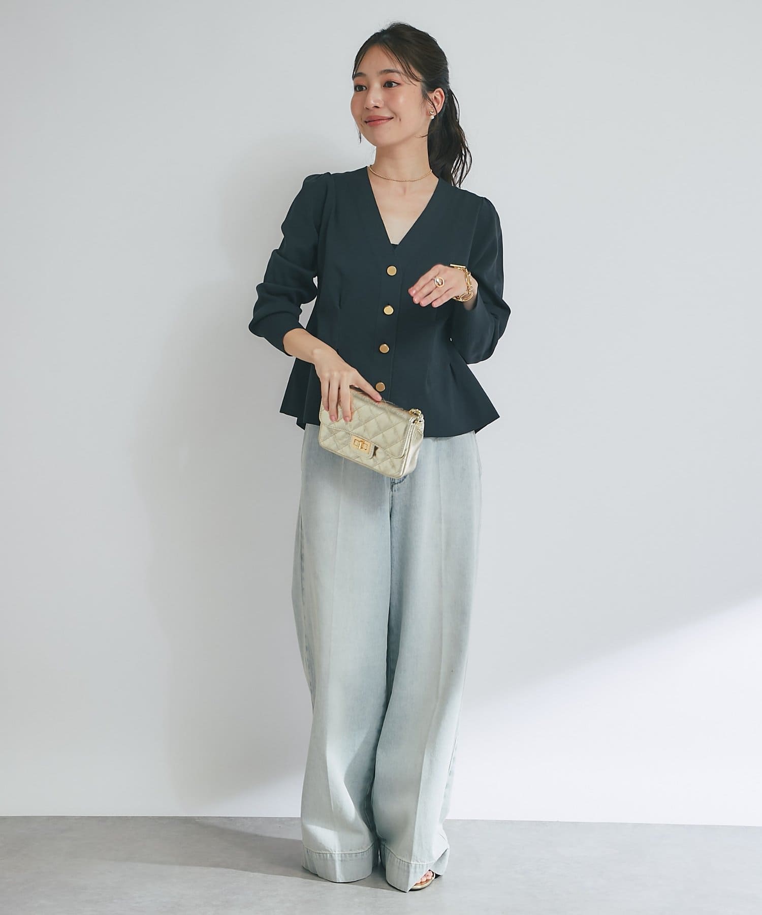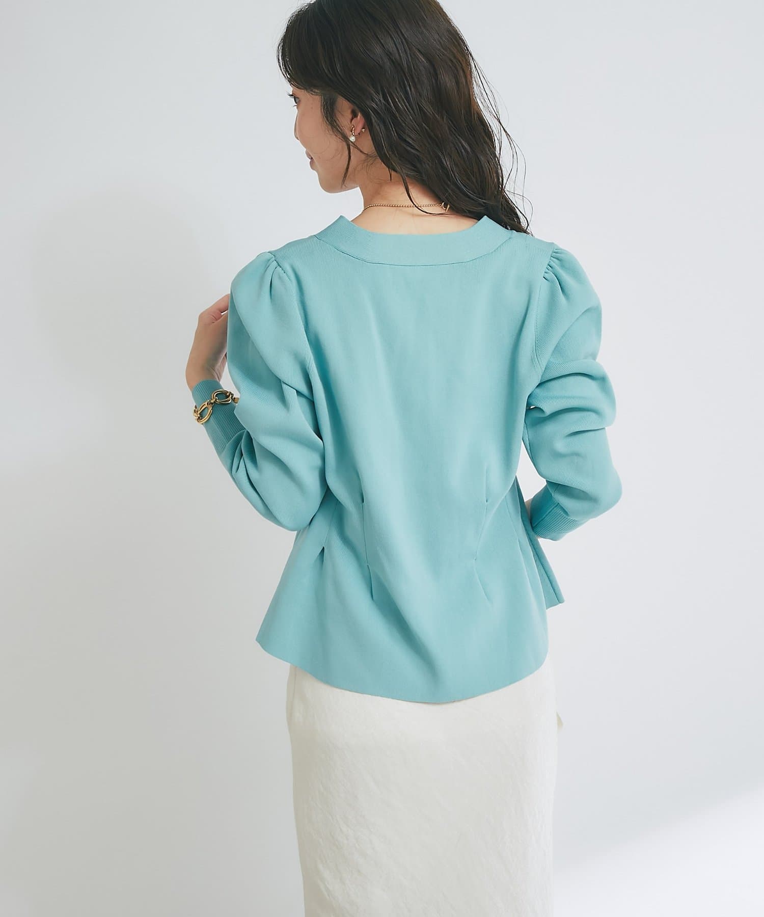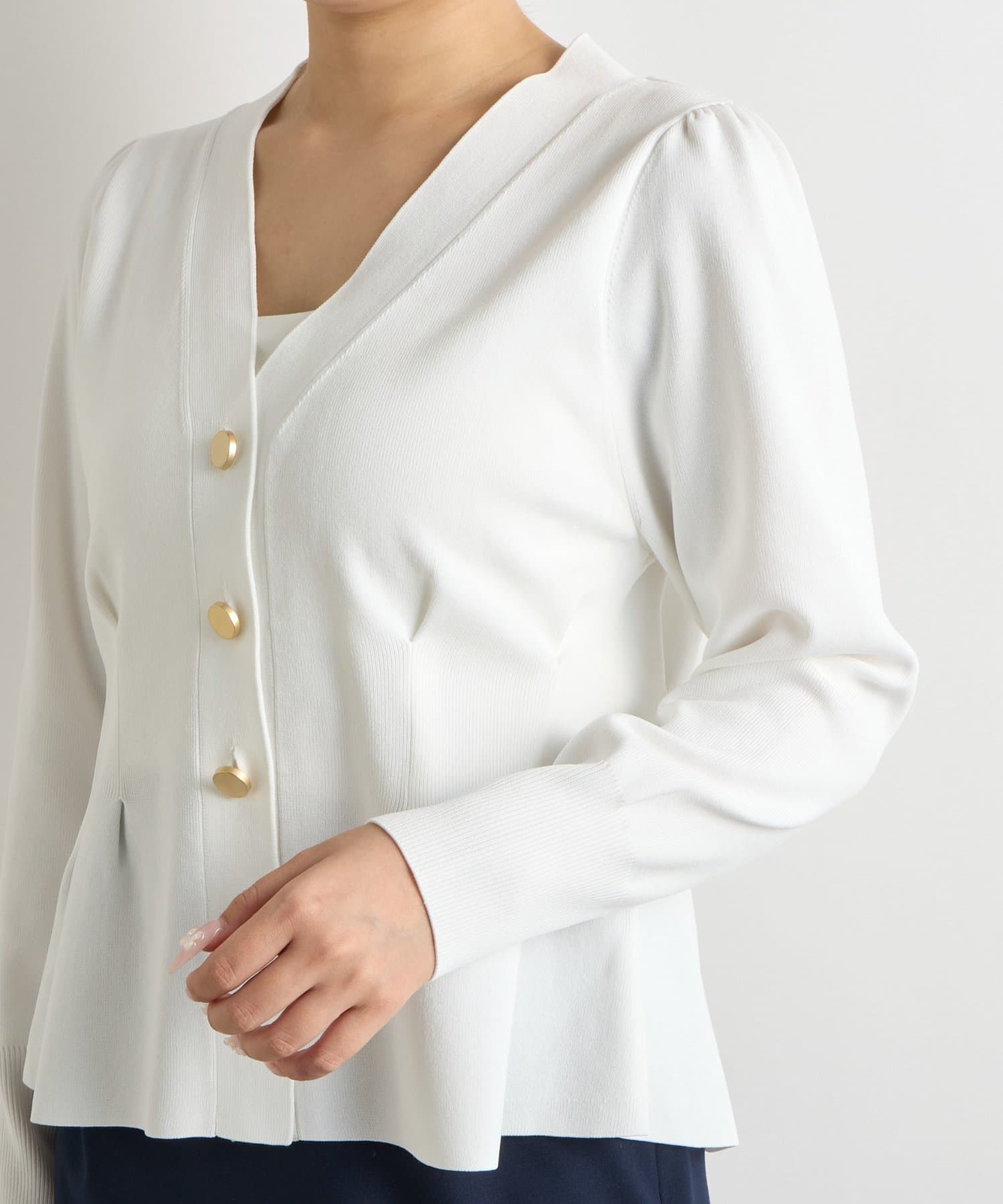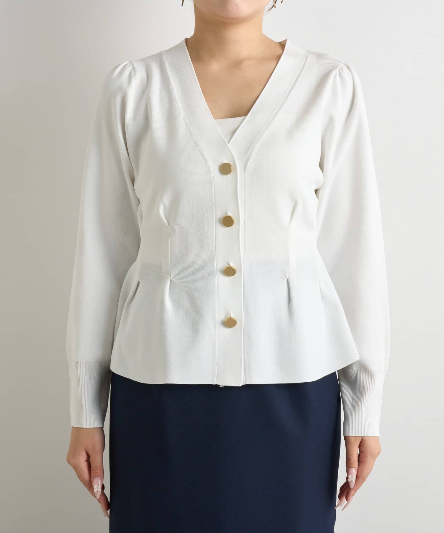 Vネックがデコルテを美しく見せ、ペプラムが女性らしいくびれを演出。