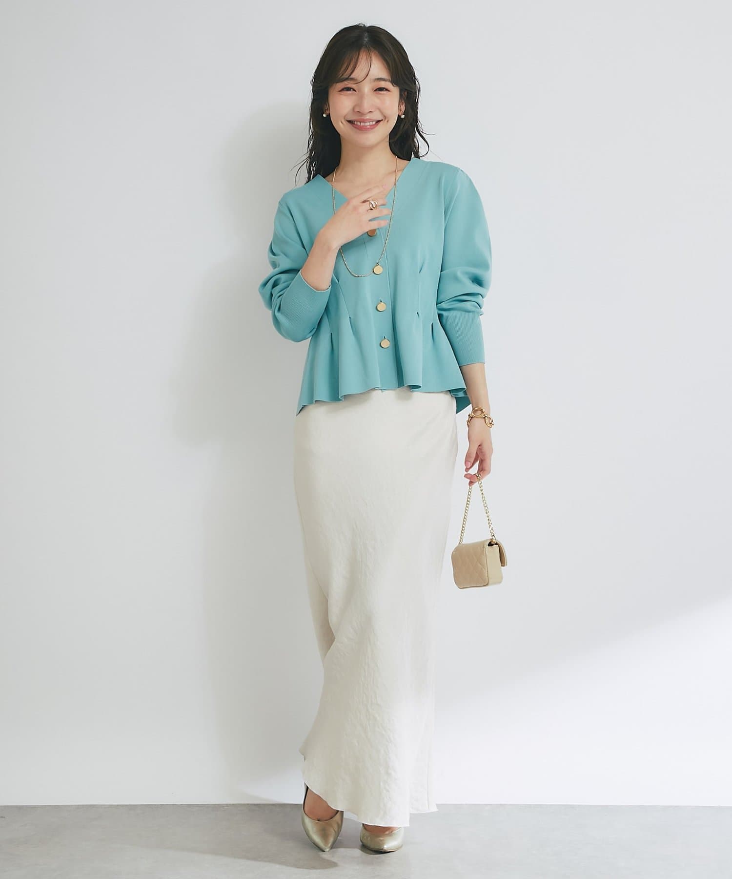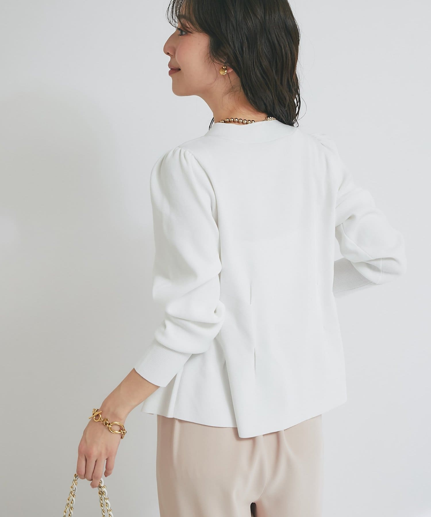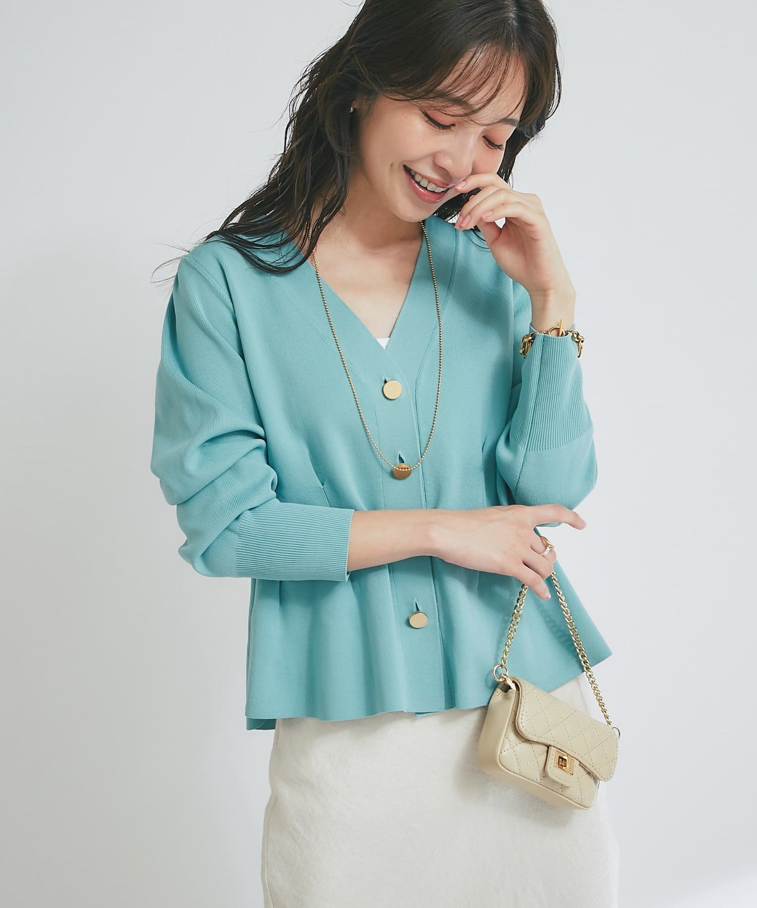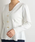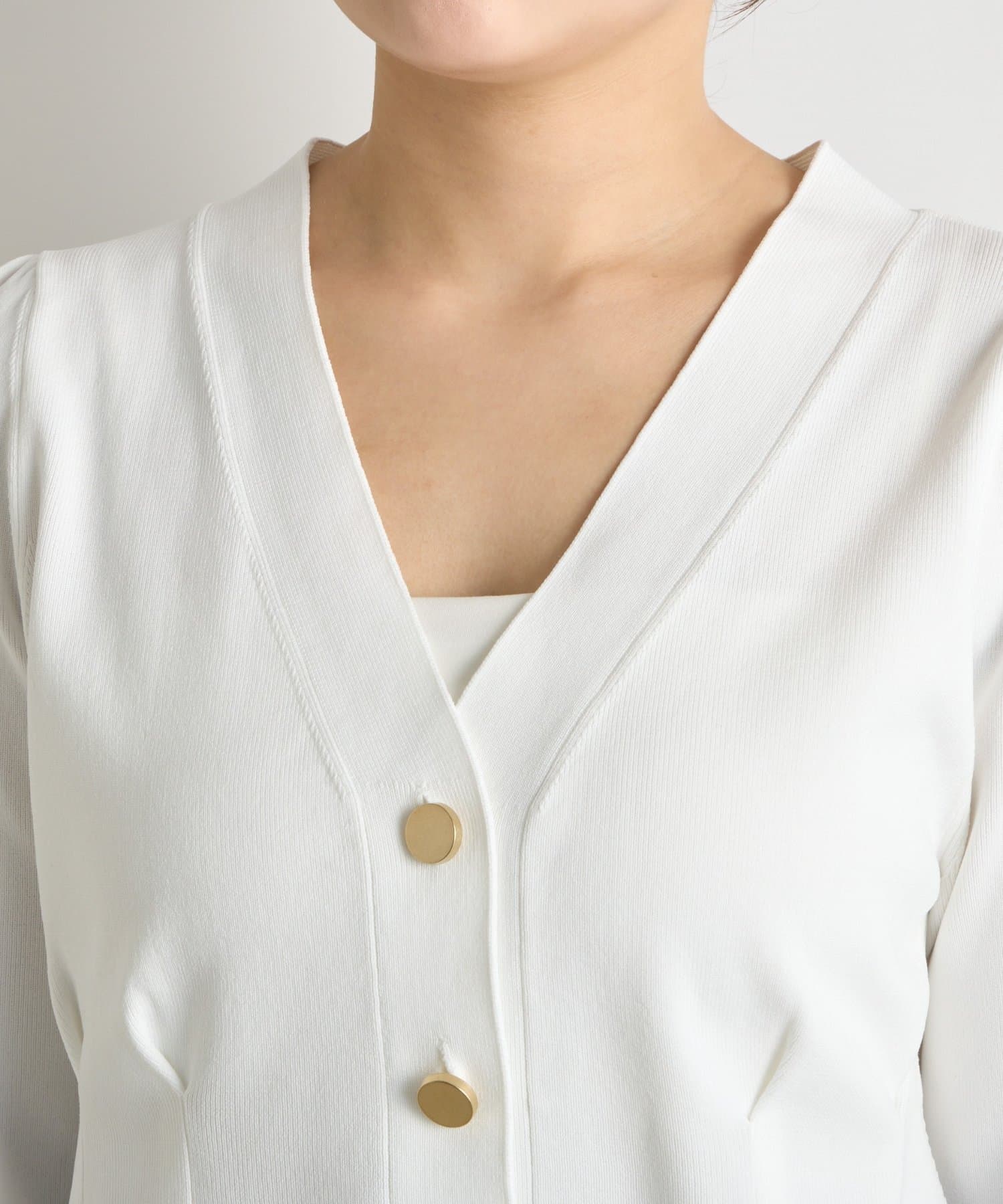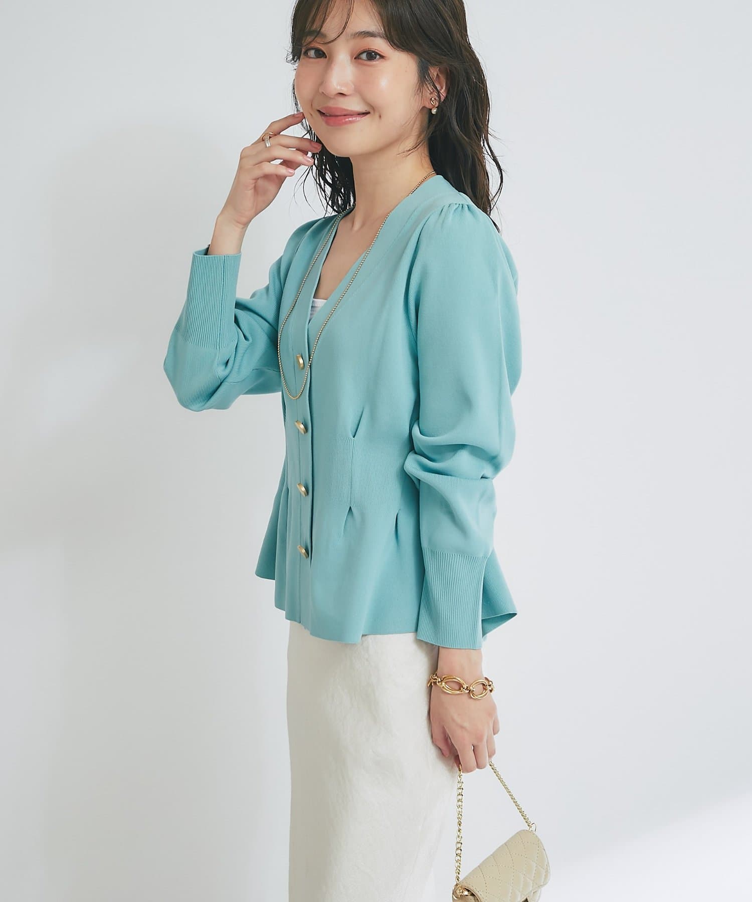 Vネックがデコルテを美しく見せ、ペプラムが女性らしいくびれを演出。