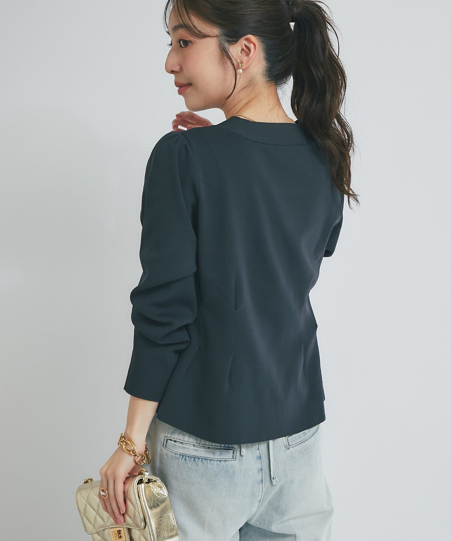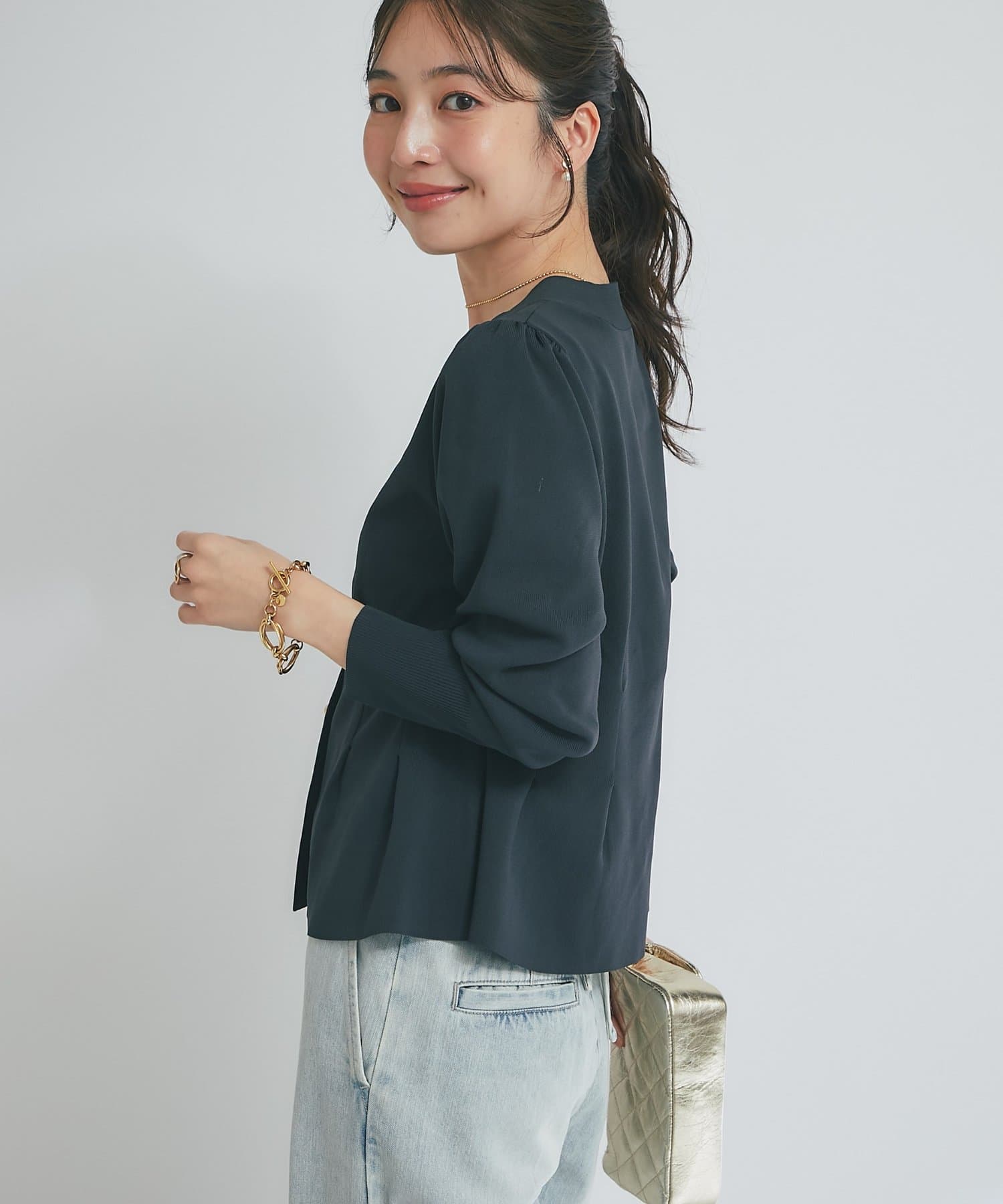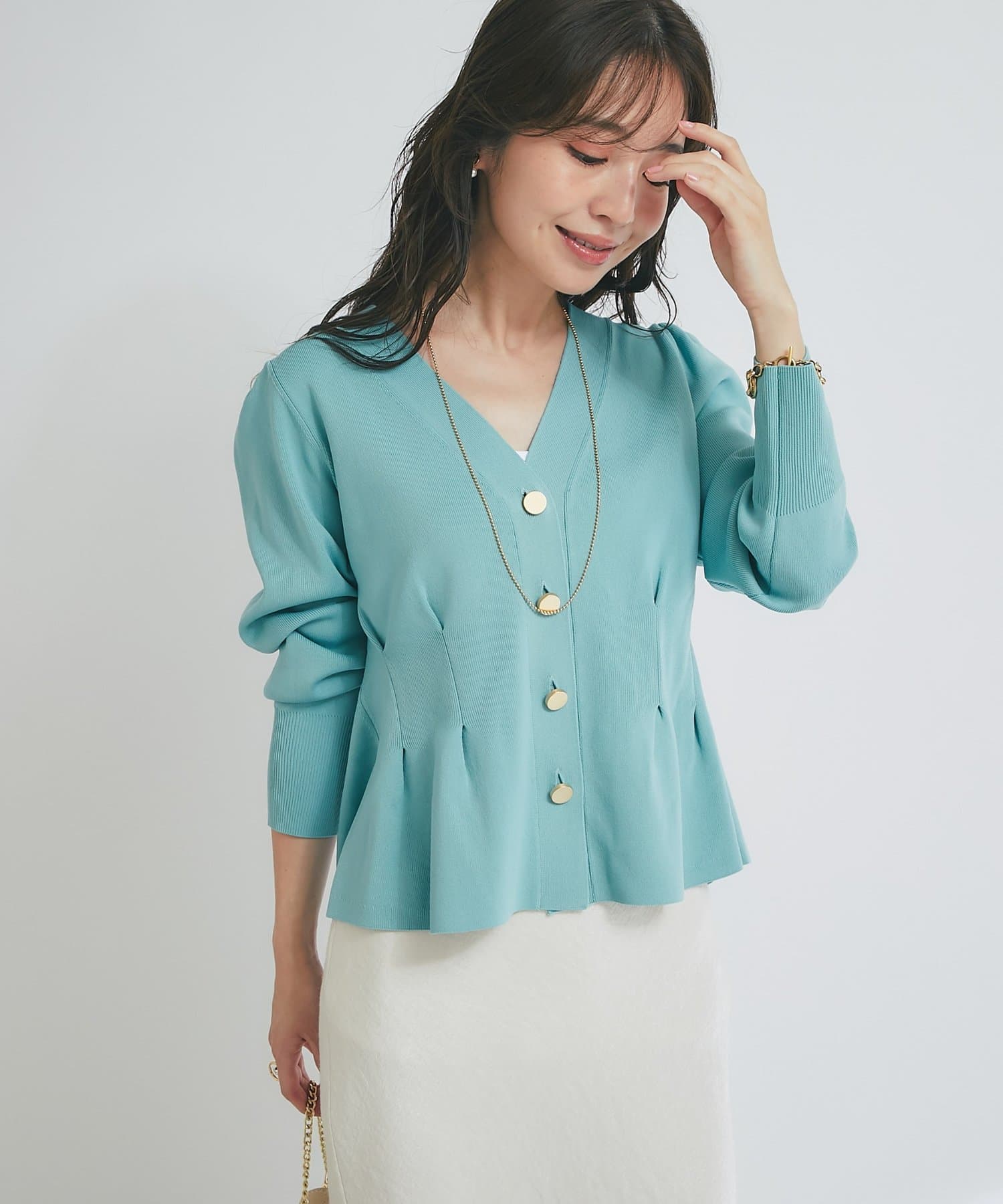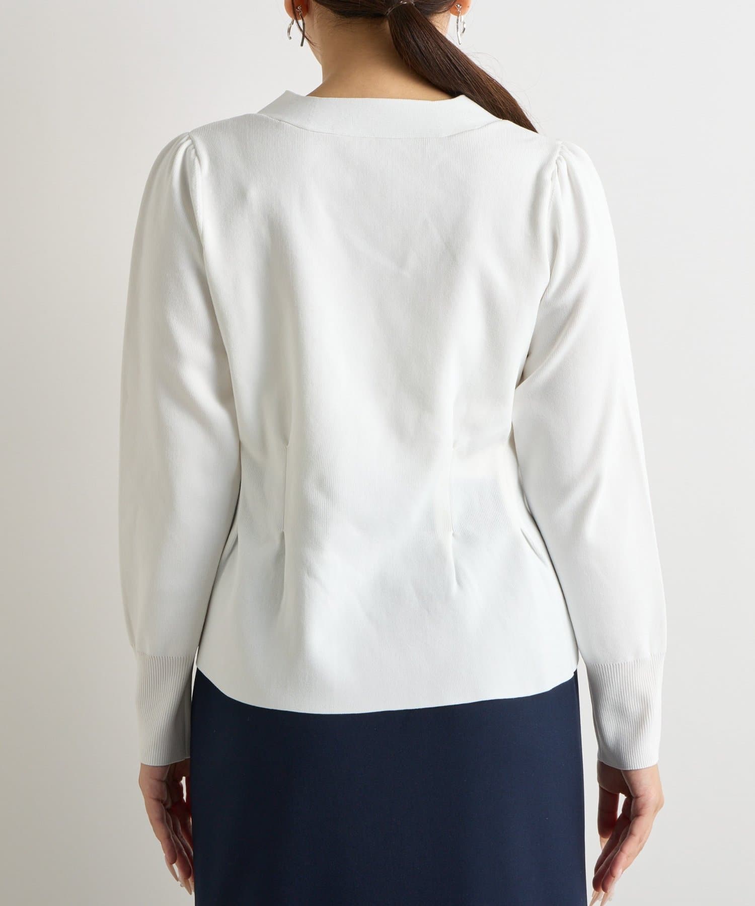 Vネックがデコルテを美しく見せ、ペプラムが女性らしいくびれを演出。
