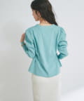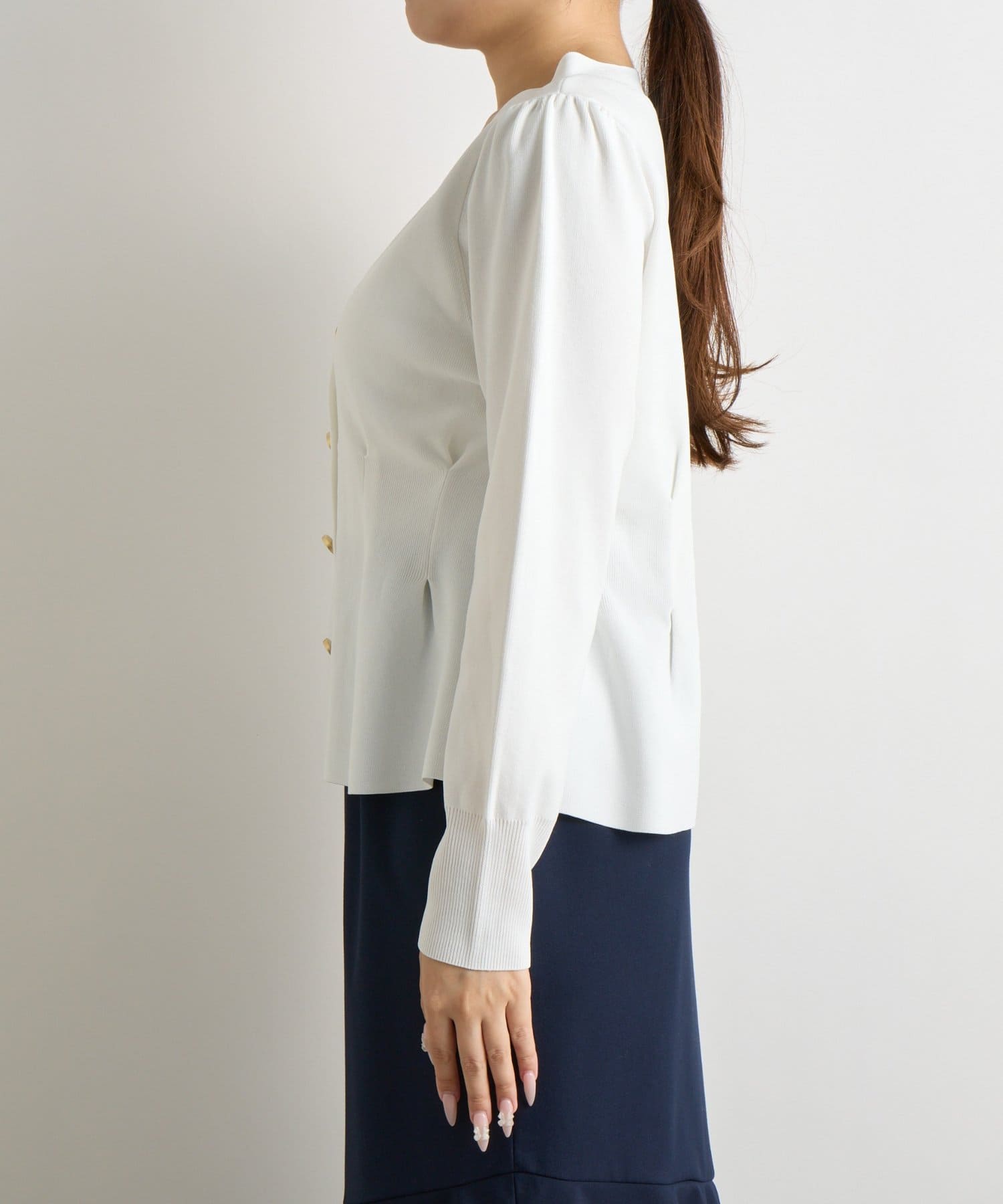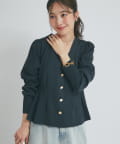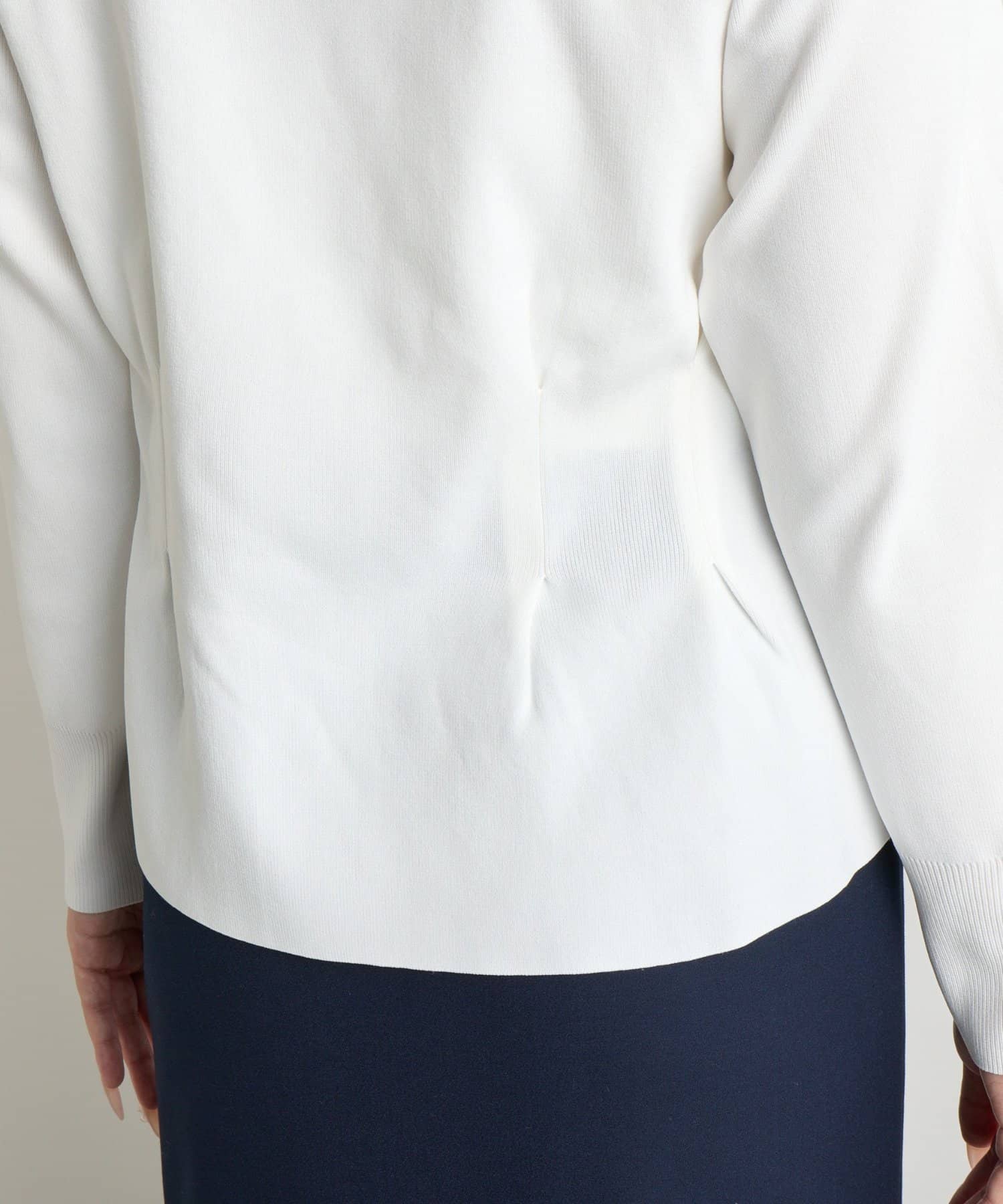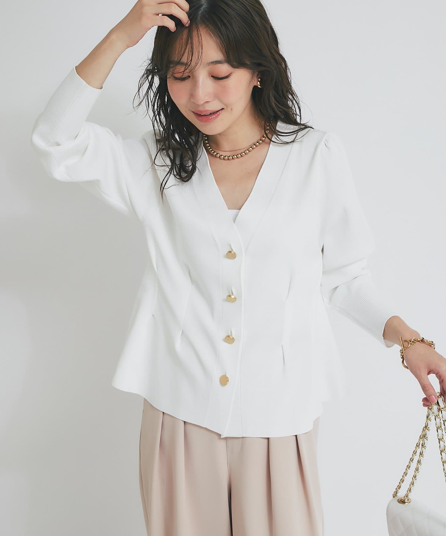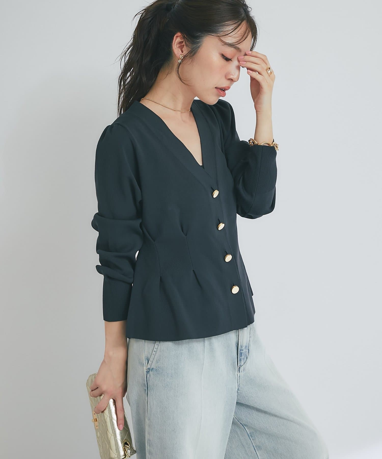 Vネックがデコルテを美しく見せ、ペプラムが女性らしいくびれを演出。