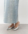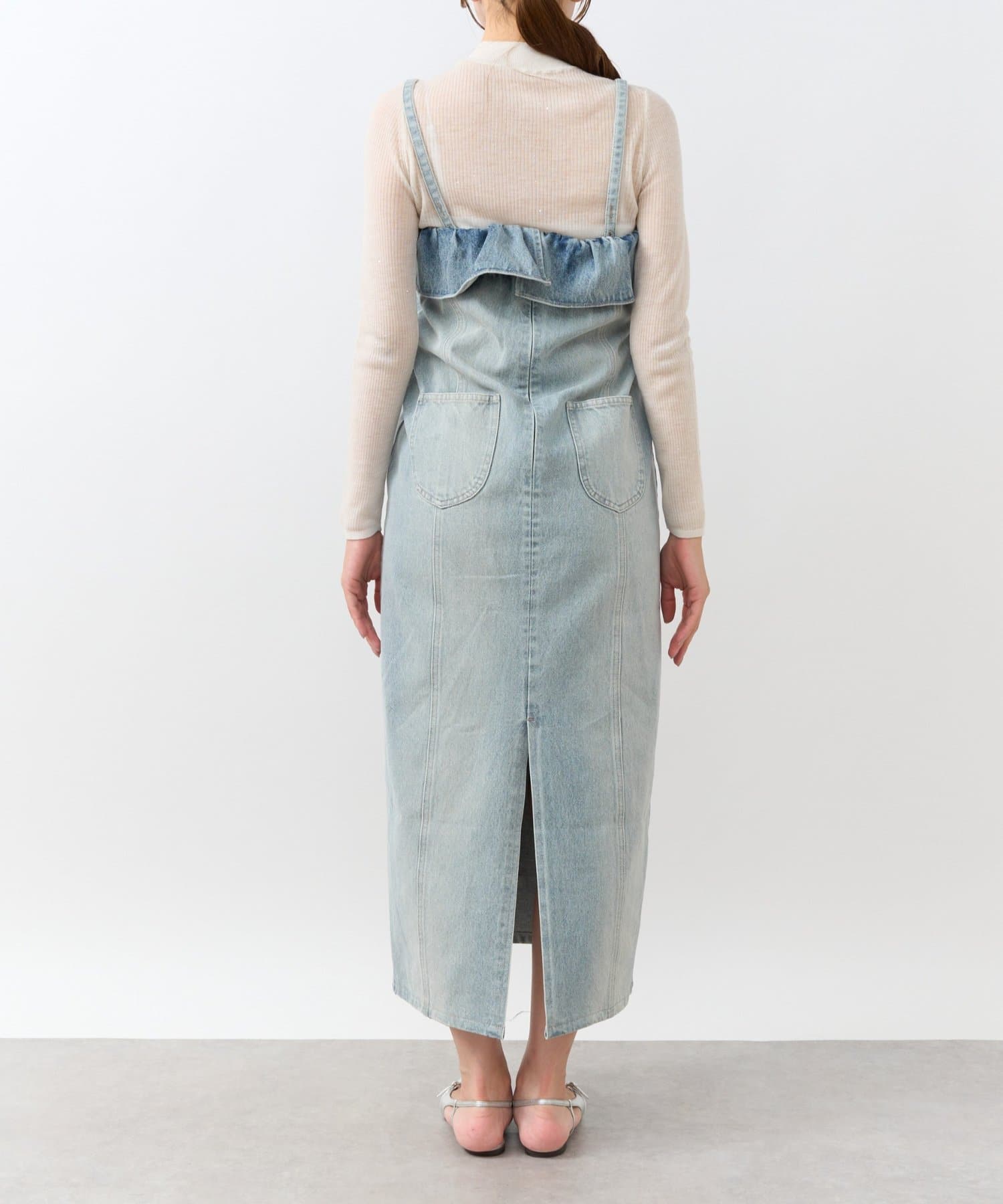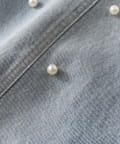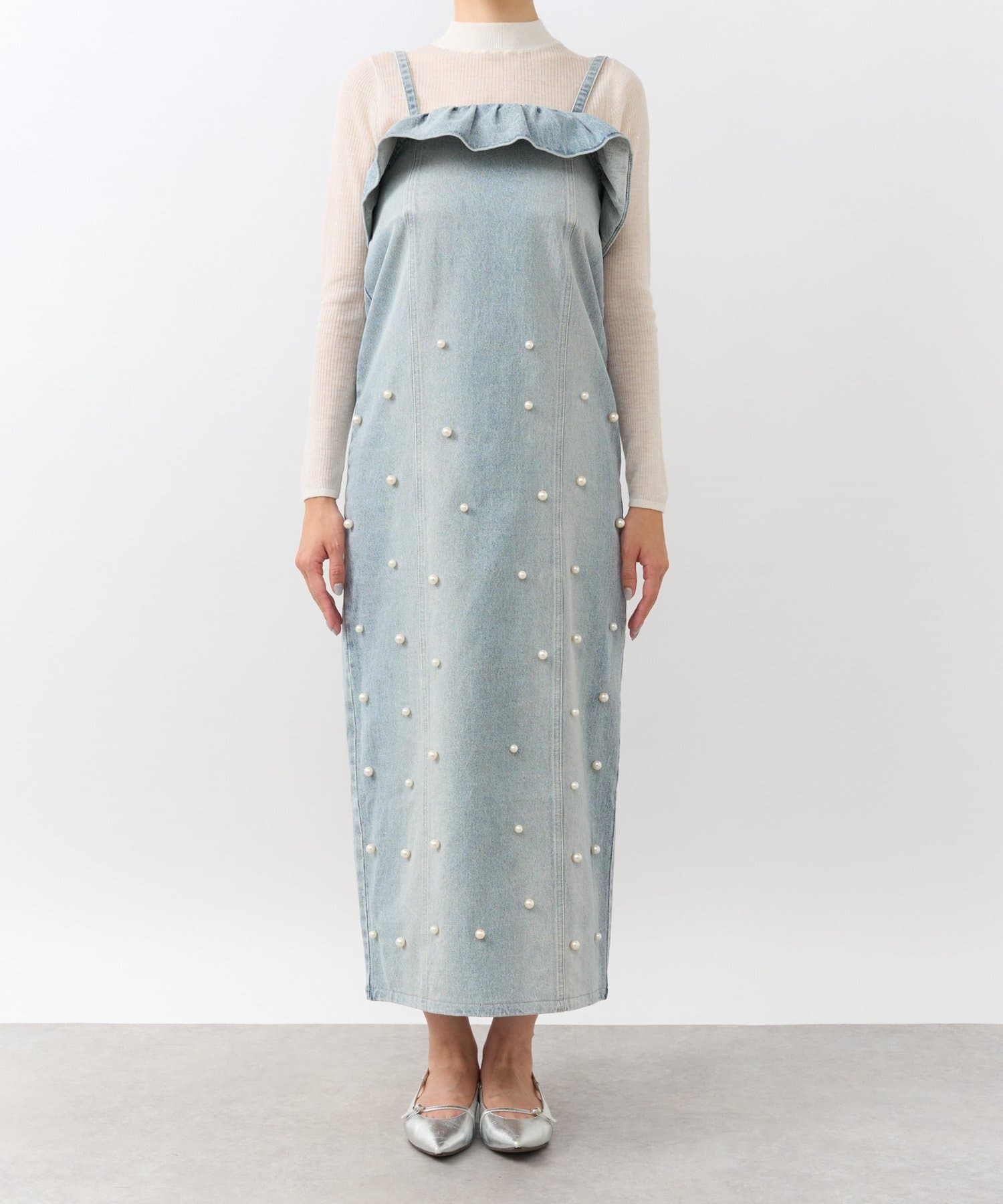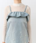 パールとフリルが華やぐ、細見えデニムキャミワンピース