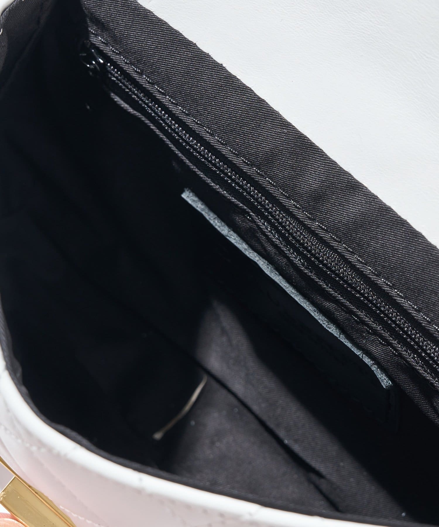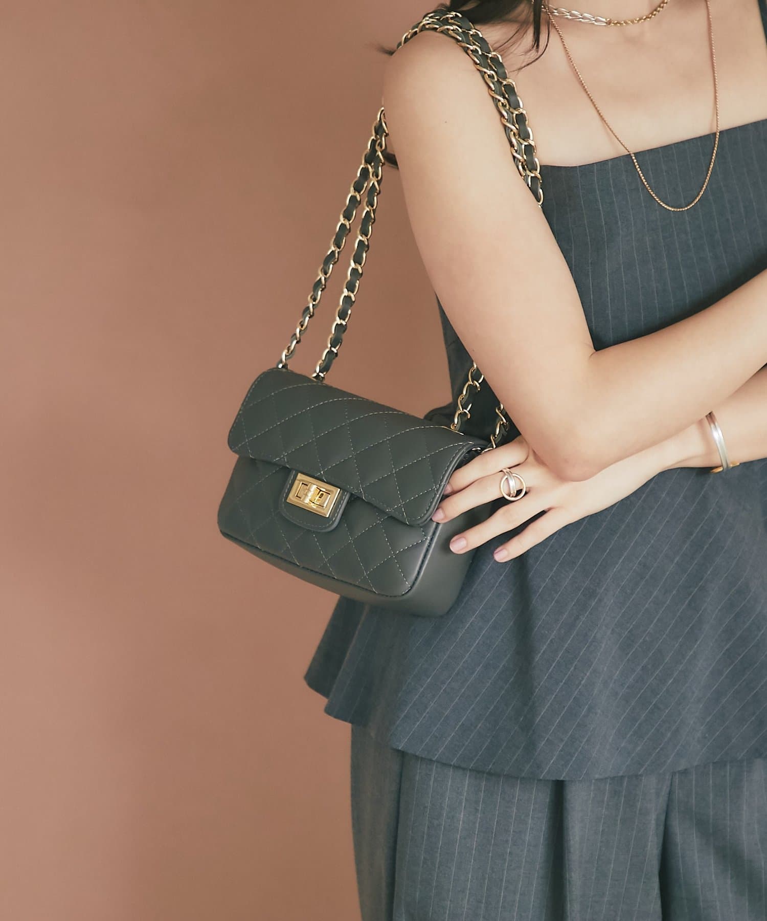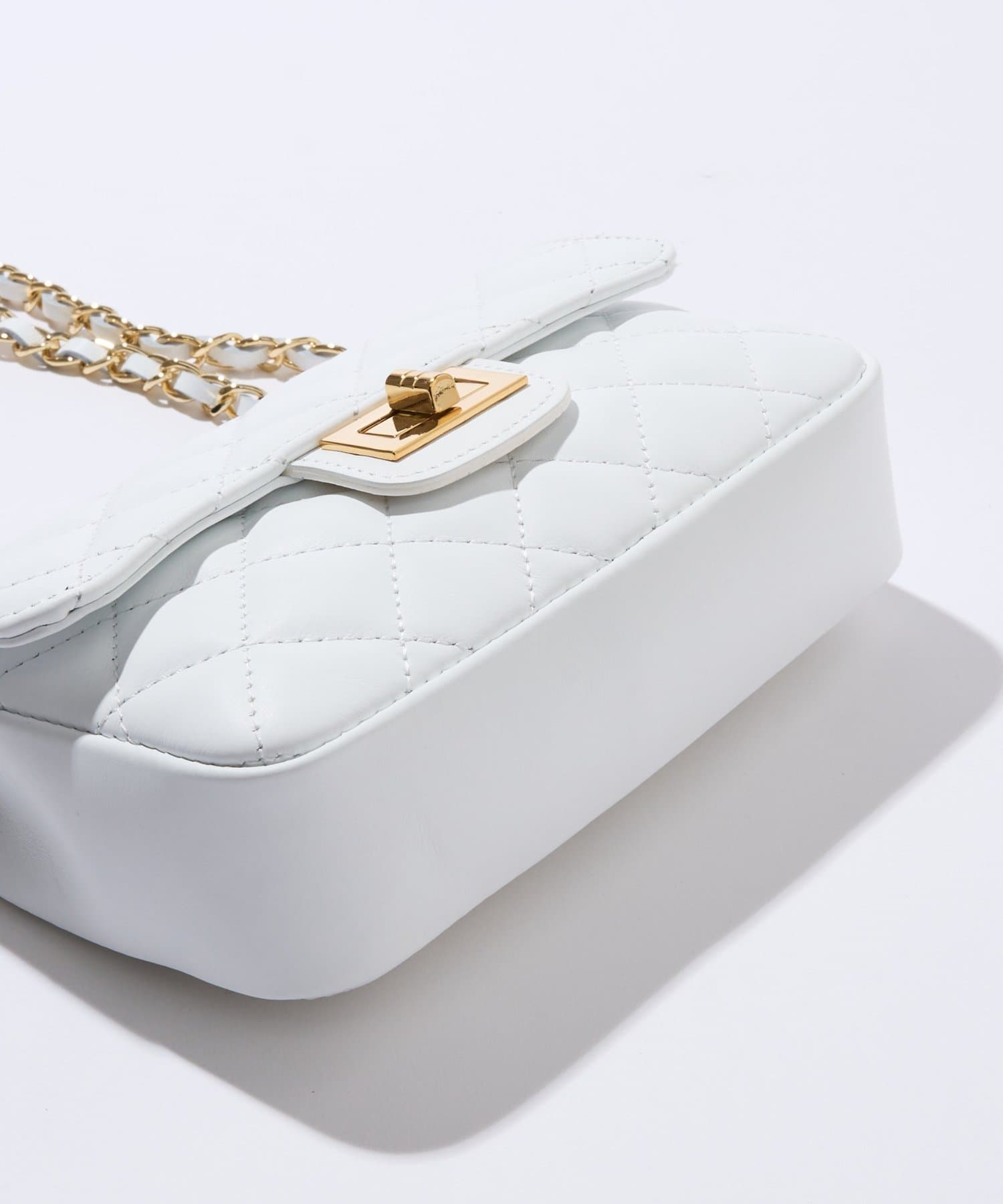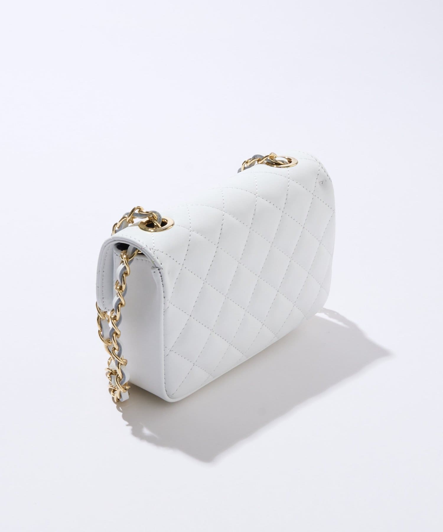 大きめステッチと金具使いがエレガントな雰囲気のキルティングチェーンバッグ。