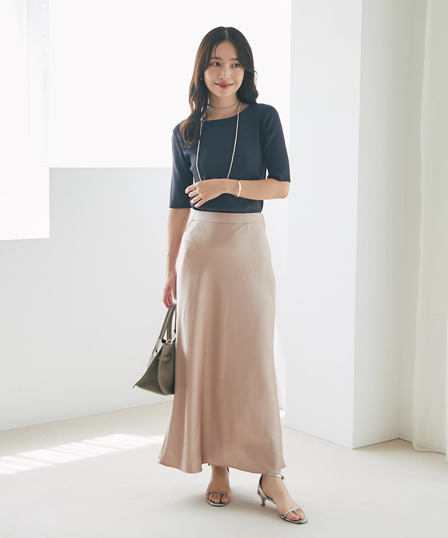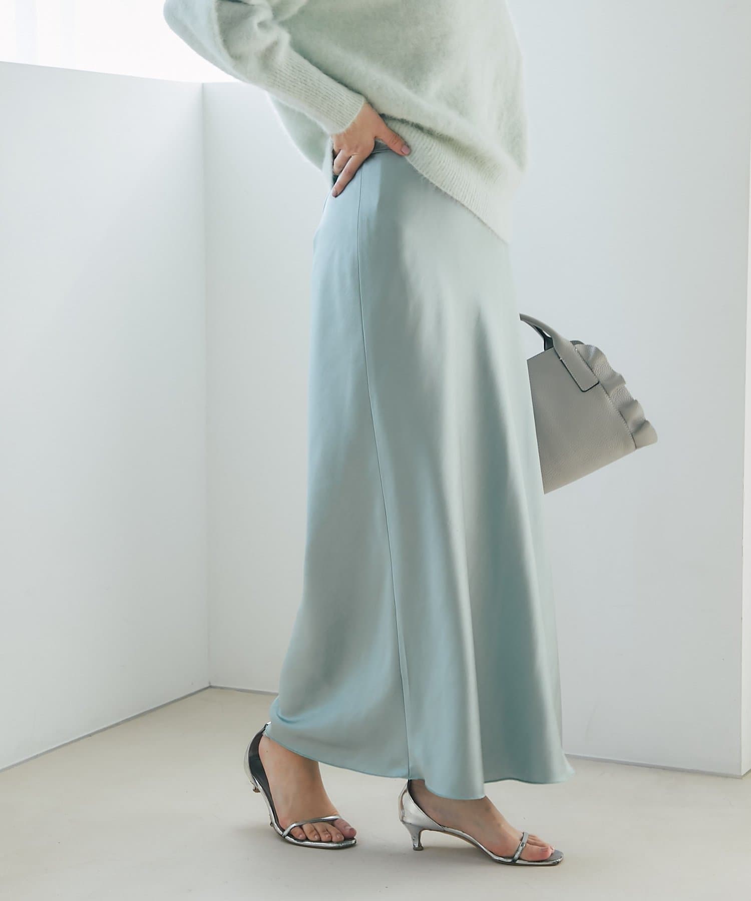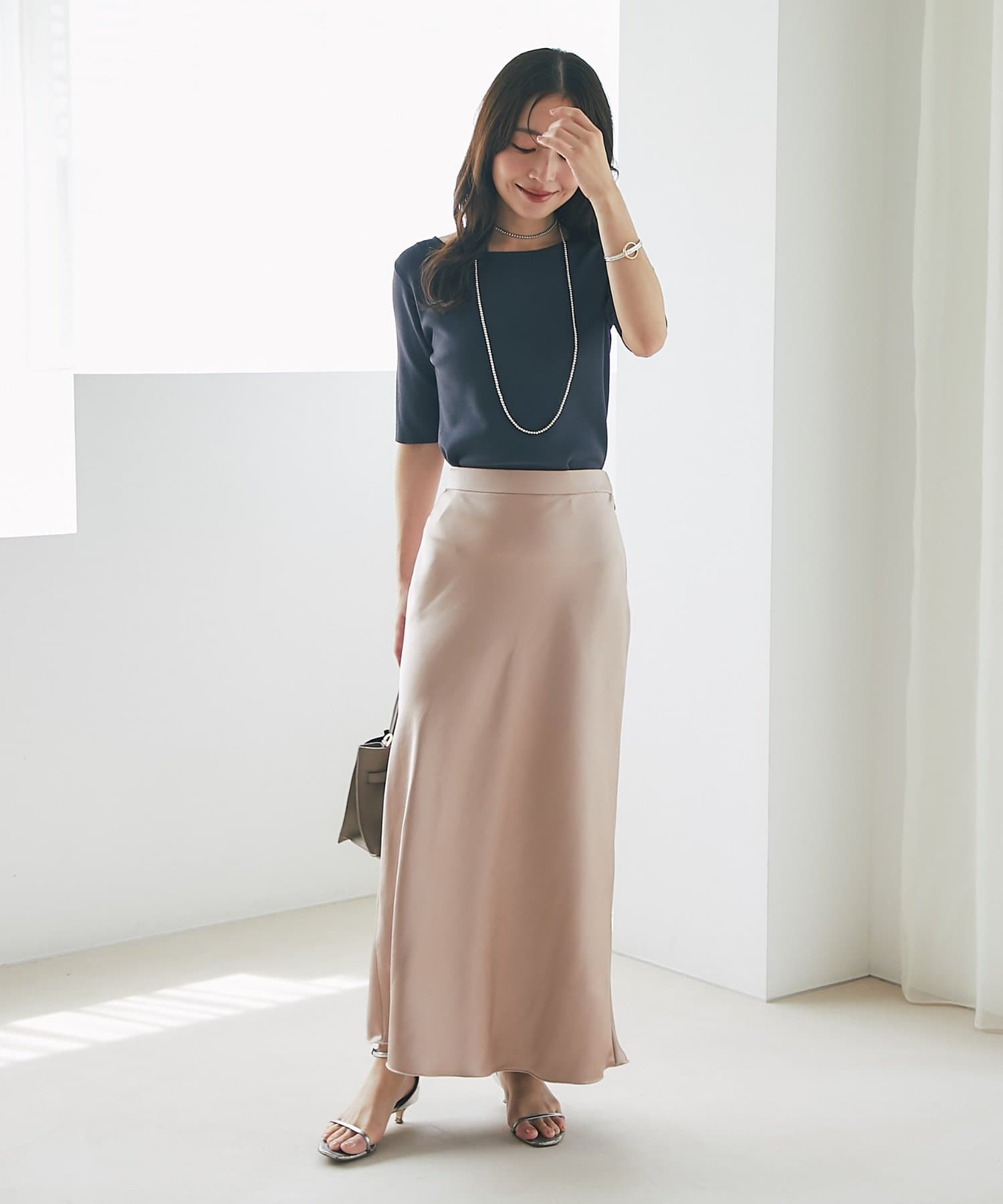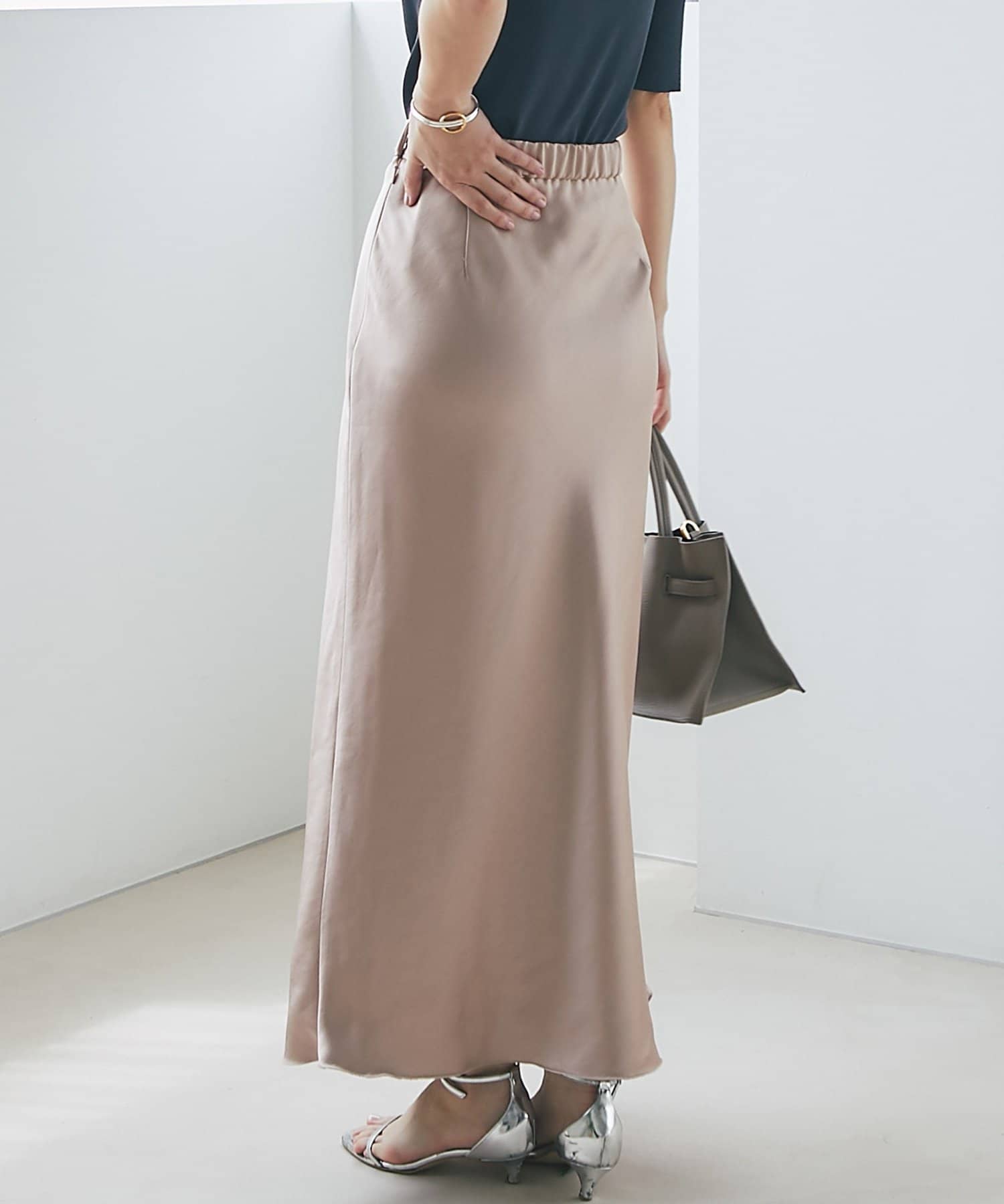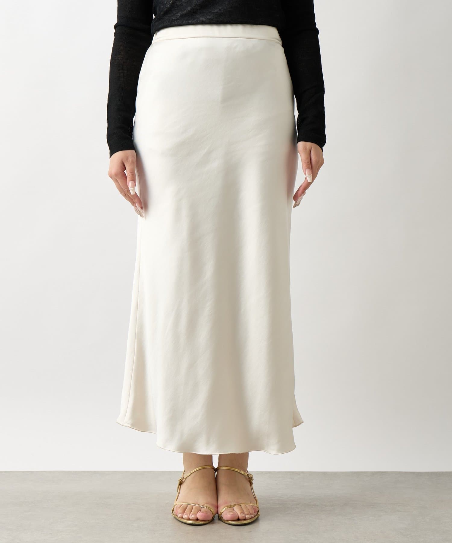 上品な光沢感とすっきりとしたしなやかなシルエットが魅力のサテンスカート。