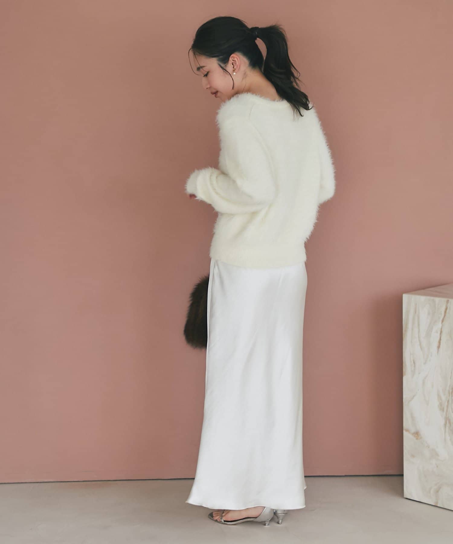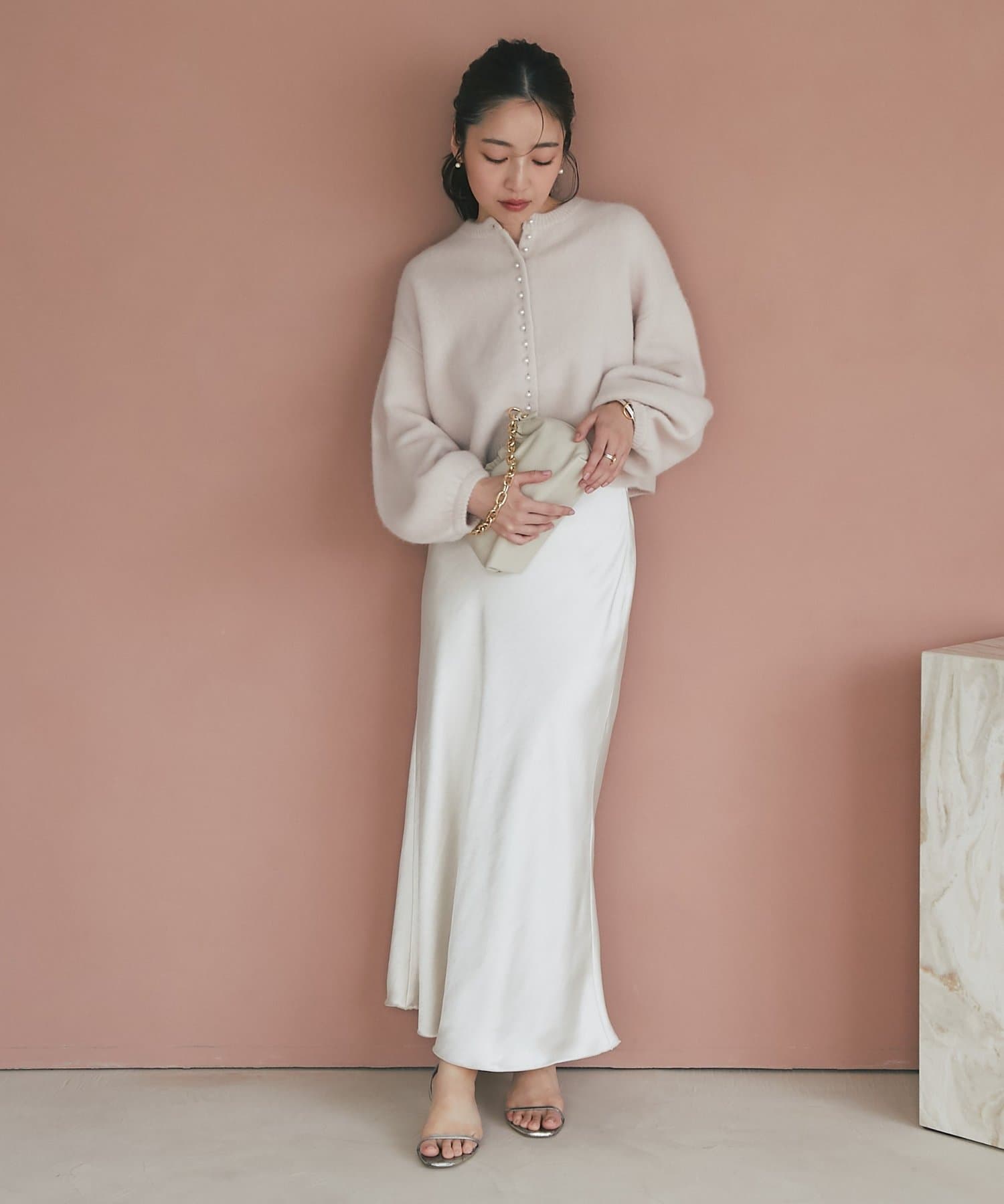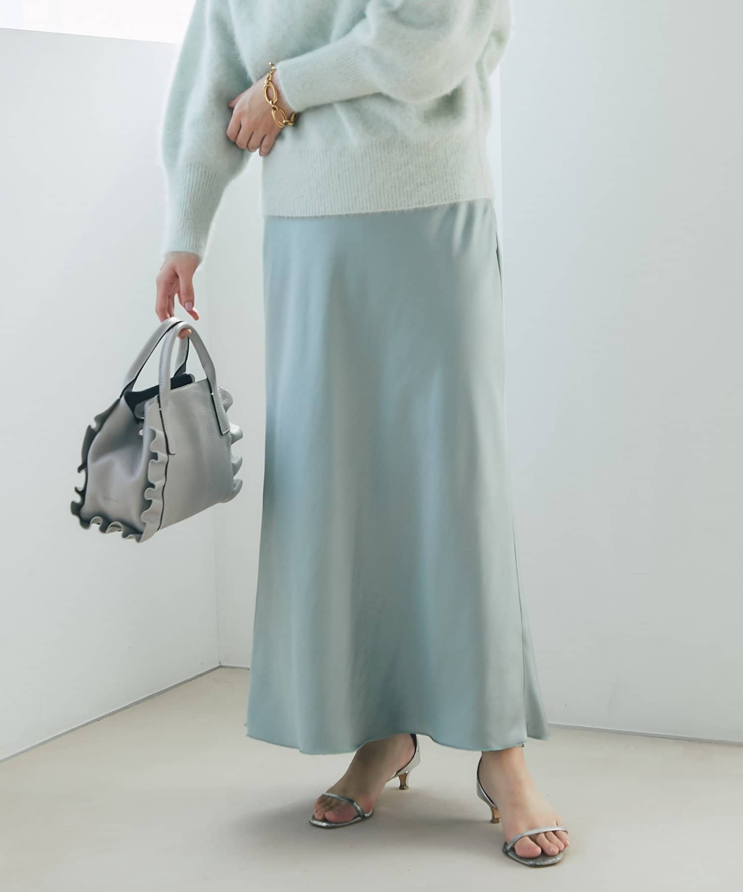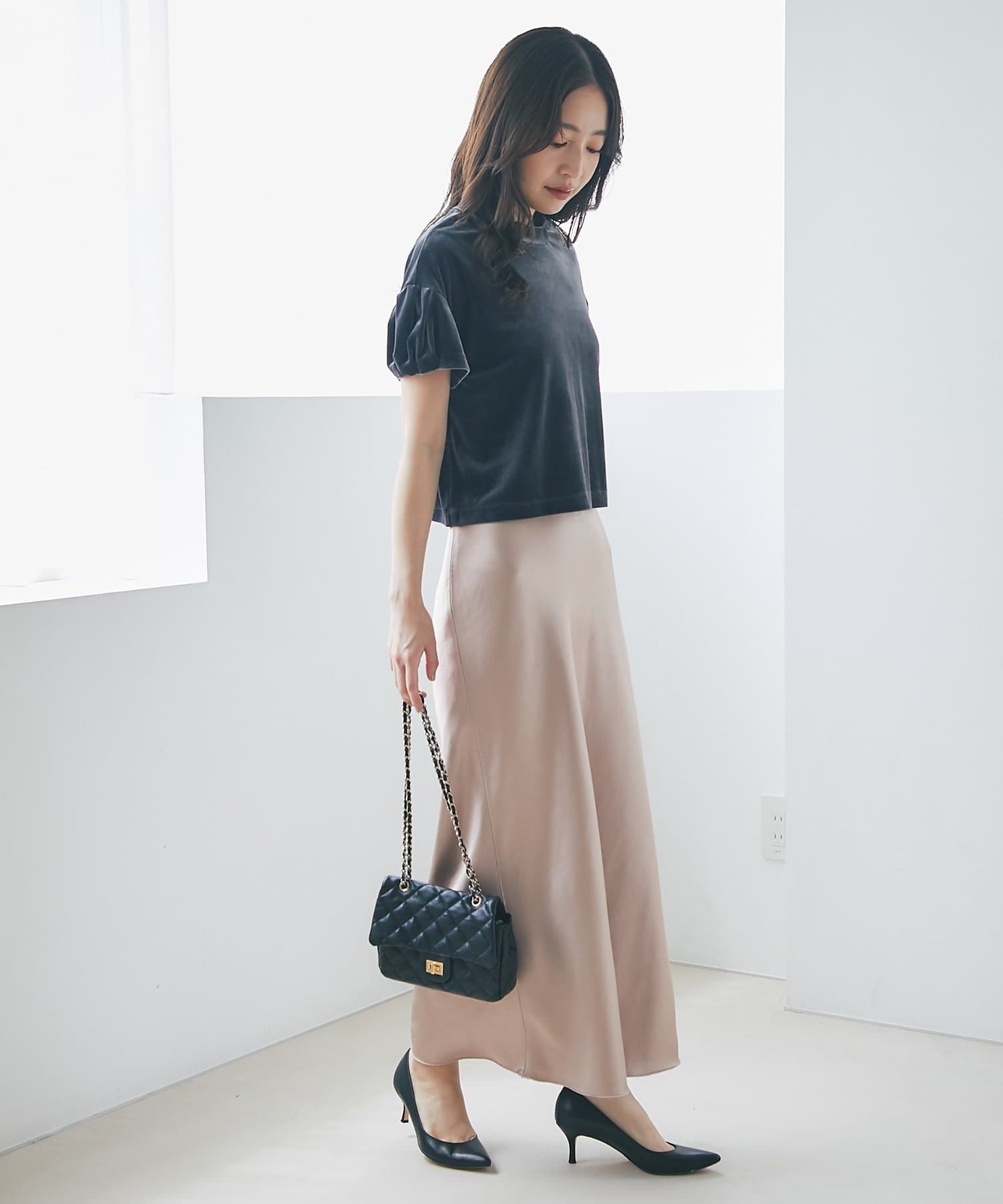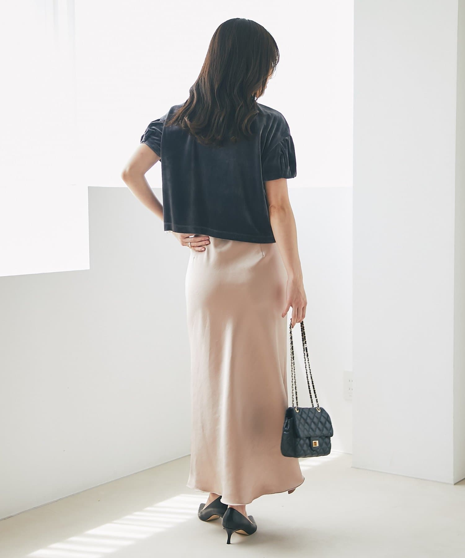 上品な光沢感とすっきりとしたしなやかなシルエットが魅力のサテンスカート。